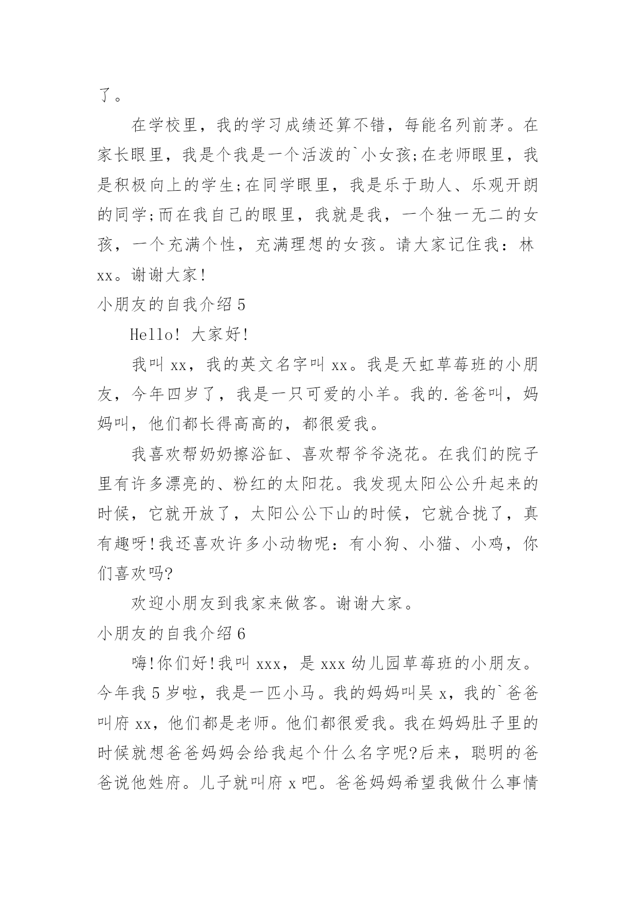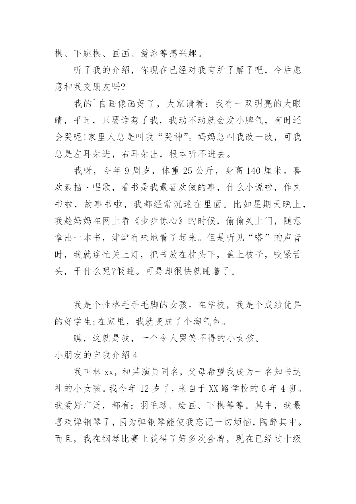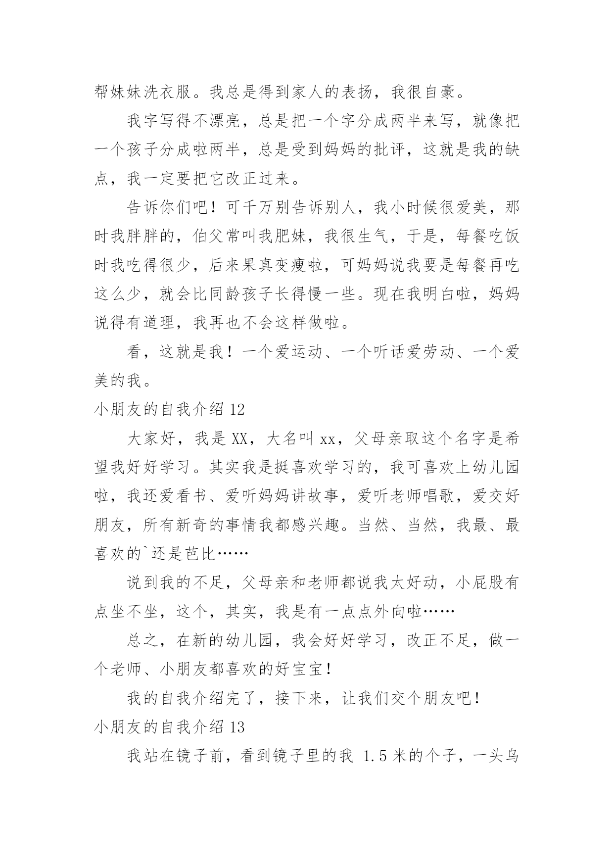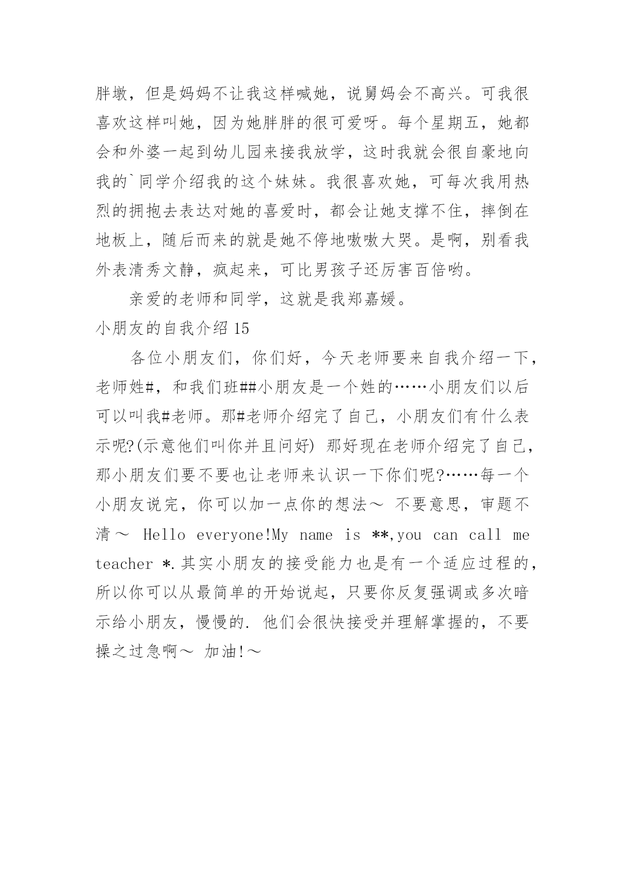 小朋友的自我介绍小朋友的自我介绍(精选15篇)当来到一个新环境时,我们通常会被要求作自我介绍,用自我介绍往往可以来展示自己。到底应如何写自我介绍呢?以下是小编帮大家整理的小朋友的自我介绍,仅供参考,大家一起来看看吧。小朋友的自我介绍1HI!大家好!我叫喻x,今年9岁了。我有一张瘦瘦的瓜子脸,脸上有两个大大的眼睛和一个小小的鼻子。哦,等等,我还有一张普普通通的`小嘴巴。我喜欢学习,我几乎和班上成绩好的同学都很要好,但是我偶尔也会帮助那些成绩落后的同学。我是个内向的孩子,别人课间谈话时嘴巴叽里呱啦讲个不停。而我呢?总是坐在座位上呆呆的望着窗外,看那像棉花糖一样的白云,看那在天空翱翔的小鸟。我的理想总是千变万化的,一会儿又想当老师,一会儿又想当明星,一会儿又想当会计师。总之,我永远都不知道自己想当什么。这就是一个普普通通的我,这样的我,你愿意和我做朋友吗?小朋友的自我介绍2大家好!我叫黄炜,今年八岁。我在鹤壁市第八小学上学,是二年级四班的学生,我是个阳光漂亮的女孩儿,留着可爱的`“蘑菇头”发型,我有着弯弯的柳叶眉和一双水灵灵的大眼睛,好似两颗亮晶晶的黑葡萄,小小的鼻子和嘴巴,并且我一笑起来就有两个小酒窝,真是可爱极!今天我穿一件粉红色的衣服,我来到辅导班上金笔作文课的时候,老师见我就夸我是个小美女。我喜欢运动,尤其喜欢跳绳。每次下课我都会拿着心爱的跳绳蹦上一阵子,而且每次放学后写完作业我都会去跳绳,跳的满头大汗,直到妈妈大声叫我:“炜炜别跳,赶紧吃饭。”我才会依依不舍的放下跳绳回去吃饭。我不但喜欢运动,而且学习还非常好。每次语文和数学老师都让我当小老师帮他们批改作业。爸爸妈妈还说我非常细心,可以当医生。我觉得医生是一位白衣天使,所以我的愿望就是长大后当一名医生。这就是我,一个平凡活泼又漂亮的我!小朋友的自我介绍3我喜爱拉小提琴,有些时候拉得太专心了,竟然能在优美的琴声中陶醉!记得有一次中午,我在房间拉小提琴,妈妈在厨房做饭,那个时候都已经靠近十二点钟了,可是爸爸还没有回来,妈妈大声叫我打电话给爸爸,我可能拉琴太专注了,当时一点也没听见。后来,妈妈又催了我好几次,我还是没听见,于是妈妈立马冲进房间,把我面前的琴谱拿掉,这时我才反应过来。其实,我的兴趣很广泛,除了喜爱来小提琴,还对下象棋、下跳棋、画画、游泳等感兴趣。听了我的介绍,你现在已经对我有所了解了吧,今后愿意和我交朋友吗?我的`自画像画好了,大家请看:我有一双明亮的大眼睛,平时,只要谁惹了我,我动不动就会发小脾气,有时还会哭呢!家里人总是叫我“哭神”。妈妈总叫我改一改,可我总是左耳朵进,右耳朵出,根本听不进去。我呀,今年9周岁,体重25公斤,身高140厘米。喜欢素描﹑唱歌,看书是我最喜欢做的事,什么小说啦,作文书啦,故事书啦,我都经常沉迷在里面。比如星期天晚上,我趁妈妈在网上看《步步惊心》的时候,偷偷关上门,随意拿出一本书,津津有味地看了起来。但是听见“嗒”的声音时,我就连忙关上灯,把书放在枕头下,盖上被子,咬紧舌头,干什么呢?假睡。可是却很快就睡着了。我是个性格毛手毛脚的女孩。在学校,我是个成绩优异的好学生;在家里,我就变成了个淘气包。瞧,这就是我,一个令人哭笑不得的小女孩。小朋友的自我介绍4我叫林xx,和某演员同名,父母希望我成为一名知书达礼的小女孩。我今年12岁了,来自于XX路学校的6年4班。我爱好广泛,都有:羽毛球、绘画、下棋等等。其中,我最喜欢弹钢琴了,因为弹钢琴能使我忘记一切烦恼,陶醉其中。而且,我在钢琴比赛上获得了好多次金牌,现在已经过十级了。在学校里,我的学习成绩还算不错,每能名列前茅。在家长眼里,我是个我是一个活泼的`小女孩;在老师眼里,我是积极向上的学生;在同学眼里,我是乐于助人、乐观开朗的同学;而在我自己的眼里,我就是我,一个独一无二的女孩,一个充满个性,充满理想的女孩。请大家记住我:林xx。谢谢大家!小朋友的自我介绍5Hello!大家好!我叫xx,我的英文名字叫xx。我是天虹草莓班的小朋友,今年四岁了,我是一只可爱的小羊。我的.爸爸叫,妈妈叫,他们都长得高高的,都很爱我。我喜欢帮奶奶擦浴缸、喜欢帮爷爷浇花。在我们的院子里有许多漂亮的、粉红的太阳花。我发现太阳公公升起来的时候,它就开放了,太阳公公下山的时候,它就合拢了,真有趣呀!我还喜欢许多小动物呢:有小狗、小猫、小鸡,你们喜欢吗?欢迎小朋友到我家来做客。谢谢大家。小朋友的自我介绍6嗨!你们好!我叫xxx,是xxx幼儿园草莓班的小朋友。今年我5岁啦,我是一匹小马。我的妈妈叫吴x,我的`爸爸叫府xx,他们都是老师。他们都很爱我。我在妈妈肚子里的时候就想爸爸妈妈会给我起个什么名字呢?后来,聪明的爸爸说他姓府。儿子就叫府x吧。爸爸妈妈希望我做什么事情都一步,我会加油的!告诉你们一个秘密:今年暑假里,爸爸还带我