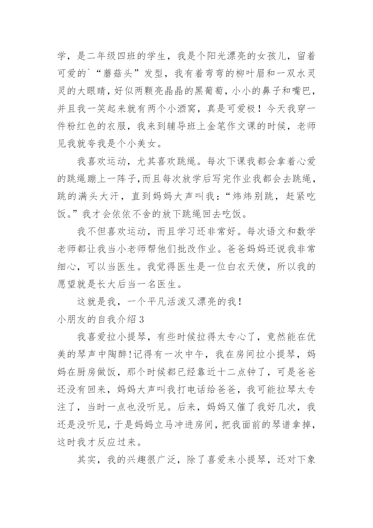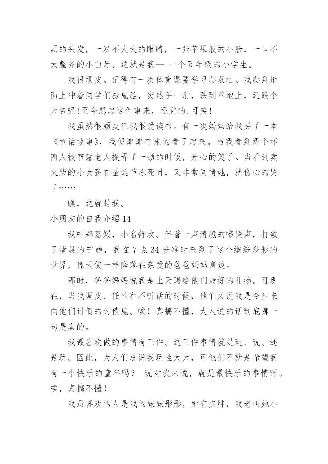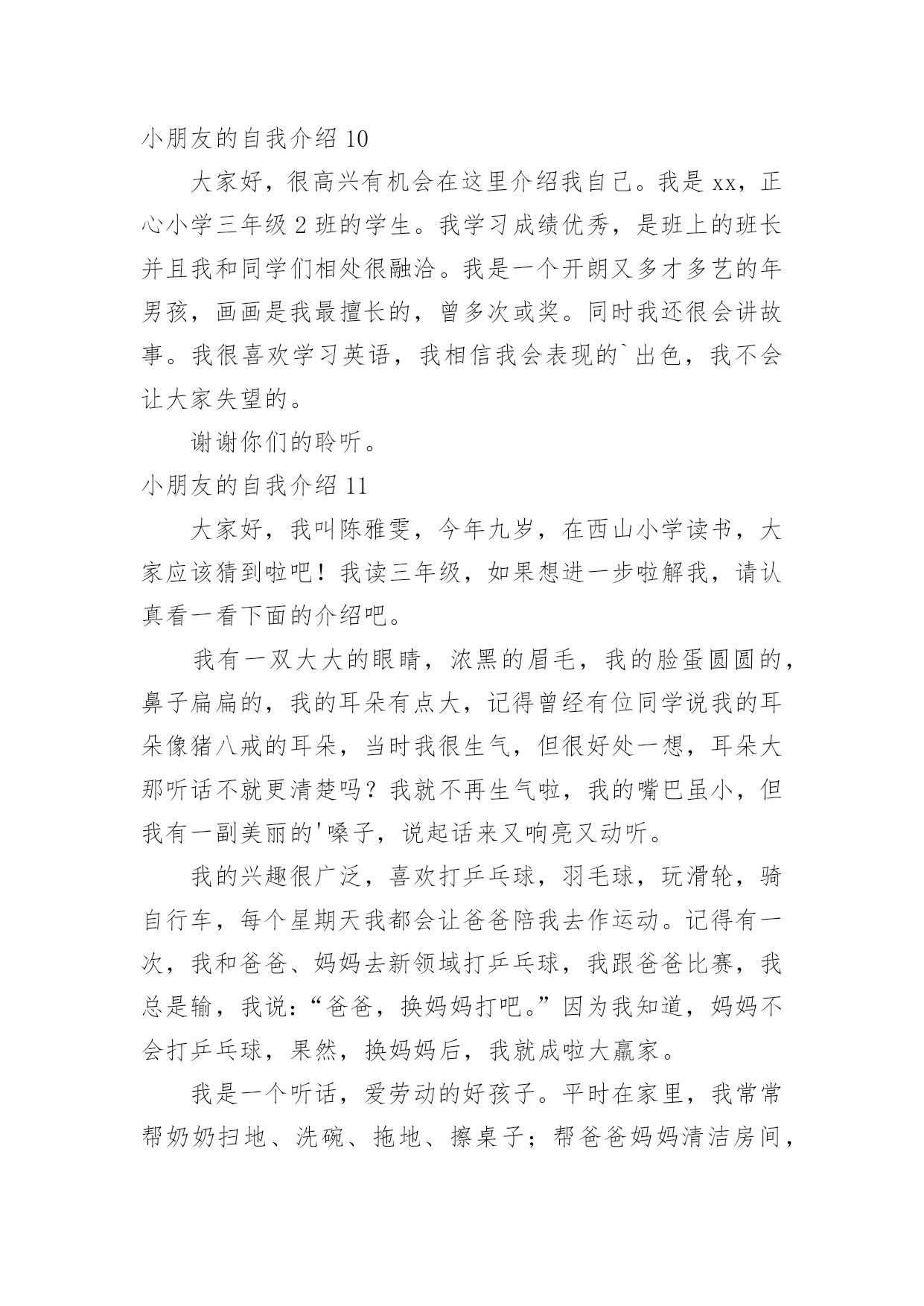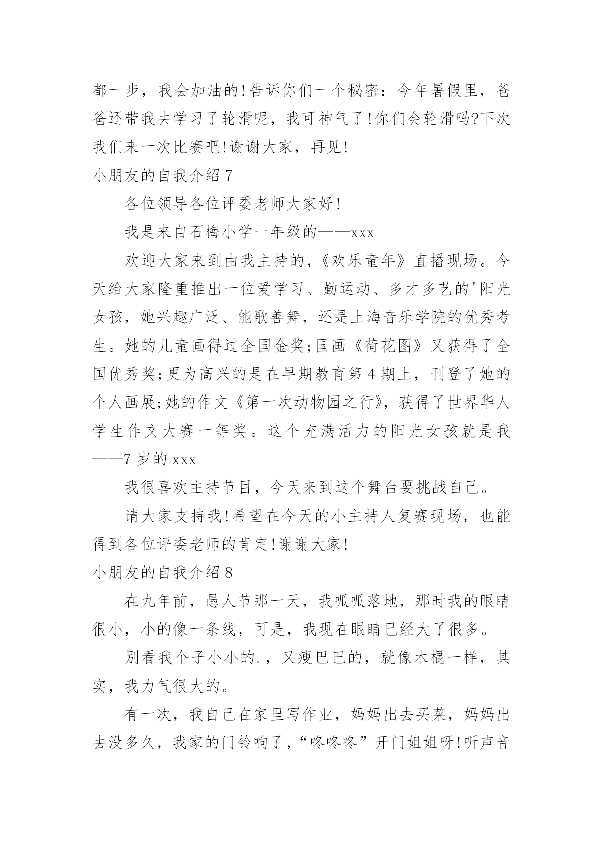 小朋友的自我介绍小朋友的自我介绍(精选15篇)当来到一个新环境时,我们通常会被要求作自我介绍,用自我介绍往往可以来展示自己。到底应如何写自我介绍呢?以下是小编帮大家整理的小朋友的自我介绍,仅供参考,大家一起来看看吧。小朋友的自我介绍1HI!大家好!我叫喻x,今年9岁了。我有一张瘦瘦的瓜子脸,脸上有两个大大的眼睛和一个小小的鼻子。哦,等等,我还有一张普普通通的`小嘴巴。我喜欢学习,我几乎和班上成绩好的同学都很要好,但是我偶尔也会帮助那些成绩落后的同学。我是个内向的孩子,别人课间谈话时嘴巴叽里呱啦讲个不停。而我呢?总是坐在座位上呆呆的望着窗外,看那像棉花糖一样的白云,看那在天空翱翔的小鸟。我的理想总是千变万化的,一会儿又想当老师,一会儿又想当明星,一会儿又想当会计师。总之,我永远都不知道自己想当什么。这就是一个普普通通的我,这样的我,你愿意和我做朋友吗?小朋友的自我介绍2大家好!我叫黄炜,今年八岁。我在鹤壁市第八小学上学,是二年级四班的学生,我是个阳光漂亮的女孩儿,留着可爱的`“蘑菇头”发型,我有着弯弯的柳叶眉和一双水灵灵的大眼睛,好似两颗亮晶晶的黑葡萄,小小的鼻子和嘴巴,并且我一笑起来就有两个小酒窝,真是可爱极!今天我穿一件粉红色的衣服,我来到辅导班上金笔作文课的时候,老师见我就夸我是个小美女。我喜欢运动,尤其喜欢跳绳。每次下课我都会拿着心爱的跳绳蹦上一阵子,而且每次放学后写完作业我都会去跳绳,跳的满头大汗,直到妈妈大声叫我:“炜炜别跳,赶紧吃饭。”我才会依依不舍的放下跳绳回去吃饭。我不但喜欢运动,而且学习还非常好。每次语文和数学老师都让我当小老师帮他们批改作业。爸爸妈妈还说我非常细心,可以当医生。我觉得医生是一位白衣天使,所以我的愿望就是长大后当一名医生。这就是我,一个平凡活泼又漂亮的我!小朋友的自我介绍3我喜爱拉小提琴,有些时候拉得太专心了,竟然能在优美的琴声中陶醉!记得有一次中午,我在房间拉小提琴,妈妈在厨房做饭,那个时候都已经靠近十二点钟了,可是爸爸还没有回来,妈妈大声叫我打电话给爸爸,我可能拉琴太专注了,当时一点也没听见。后来,妈妈又催了我好几次,我还是没听见,于是妈妈立马冲进房间,把我面前的琴谱拿掉,这时我才反应过来。其实,我的兴趣很广泛,除了喜爱来小提琴,还对下象棋、下跳棋、画画、游泳等感兴趣。听了我的介绍,你现在已经对我有所了解了吧,今后愿意和我交朋友吗?我的`自画像画好了,大家请看:我有一双明亮的大眼睛,平时,只要谁惹了我,我动不动就会发小脾气,有时还会哭呢!家里人总是叫我“哭神”。妈妈总叫我改一改,可我总是左耳朵进,右耳朵出,根本听不进去。我呀,今年9周岁,体重25公斤,身高140厘米。喜欢素描﹑唱歌,看书是我最喜欢做的事,什么小说啦,作文书啦,故事书啦,我都经常沉迷在里面。比如星期天晚上,我趁妈妈在网上看《步步惊心》的时候,偷偷关上门,随意拿出一本书,津津有味地看了起来。但是听见“嗒”的声音时,我就连忙关上灯,把书放在枕头下,盖上被子,咬紧舌头,干什么呢?假睡。可是却很快就睡着了。我是个性格毛手毛脚的女孩。在学校,我是个成绩优异的好学生;在家里,我就变成了个淘气包。瞧,这就是我,一个令人哭笑不得的小女孩。小朋友的自我介绍4我叫林xx,和某演员同名,父母希望我成为一名知书达礼的小女孩。我今年12岁了,来自于XX路学校的6年4班。我爱好广泛,都有:羽毛球、绘画、下棋等等。其中,我最喜欢弹钢琴了,因为弹钢琴能使我忘记一切烦恼,陶醉其中。而且,我在钢琴比赛上获得了好多次金牌,现在已经过十级了。在学校里,我的学习成绩还算不错,每能名列前茅。在家长眼里,我是个我是一个活泼的`小女孩;在老师眼里,我是积极向上的学生;在同学眼里,我是乐于助人、乐观开朗的同学;而在我自己的眼里,我就是我,一个独一无二的女孩,一个充满个性,充满理想的女孩。请大家记住我:林xx。谢谢大家!小朋友的自我介绍5Hello!大家好!我叫xx,我的英文名字叫xx。我是天虹草莓班的小朋友,今年四岁了,我是一只可爱的小羊。我的.爸爸叫,妈妈叫,他们都长得高高的,都很爱我。我喜欢帮奶奶擦浴缸、喜欢帮爷爷浇花。在我们的院子里有许多漂亮的、粉红的太阳花。我发现太阳公公升起来的时候,它就开放了,太阳公公下山的时候,它就合拢了,真有趣呀!我还喜欢许多小动物呢:有小狗、小猫、小鸡,你们喜欢吗?欢迎小朋友到我家来做客。谢谢大家。小朋友的自我介绍6嗨!你们好!我叫xxx,是xxx幼儿园草莓班的小朋友。今年我5岁啦,我是一匹小马。我的妈妈叫吴x,我的`爸爸叫府xx,他们都是老师。他们都很爱我。我在妈妈肚子里的时候就想爸爸妈妈会给我起个什么名字呢?后来,聪明的爸爸说他姓府。儿子就叫府x吧。爸爸妈妈希望我做什么事情都一步,我会加油的!告诉你们一个秘密:今年暑假里,爸爸还带我