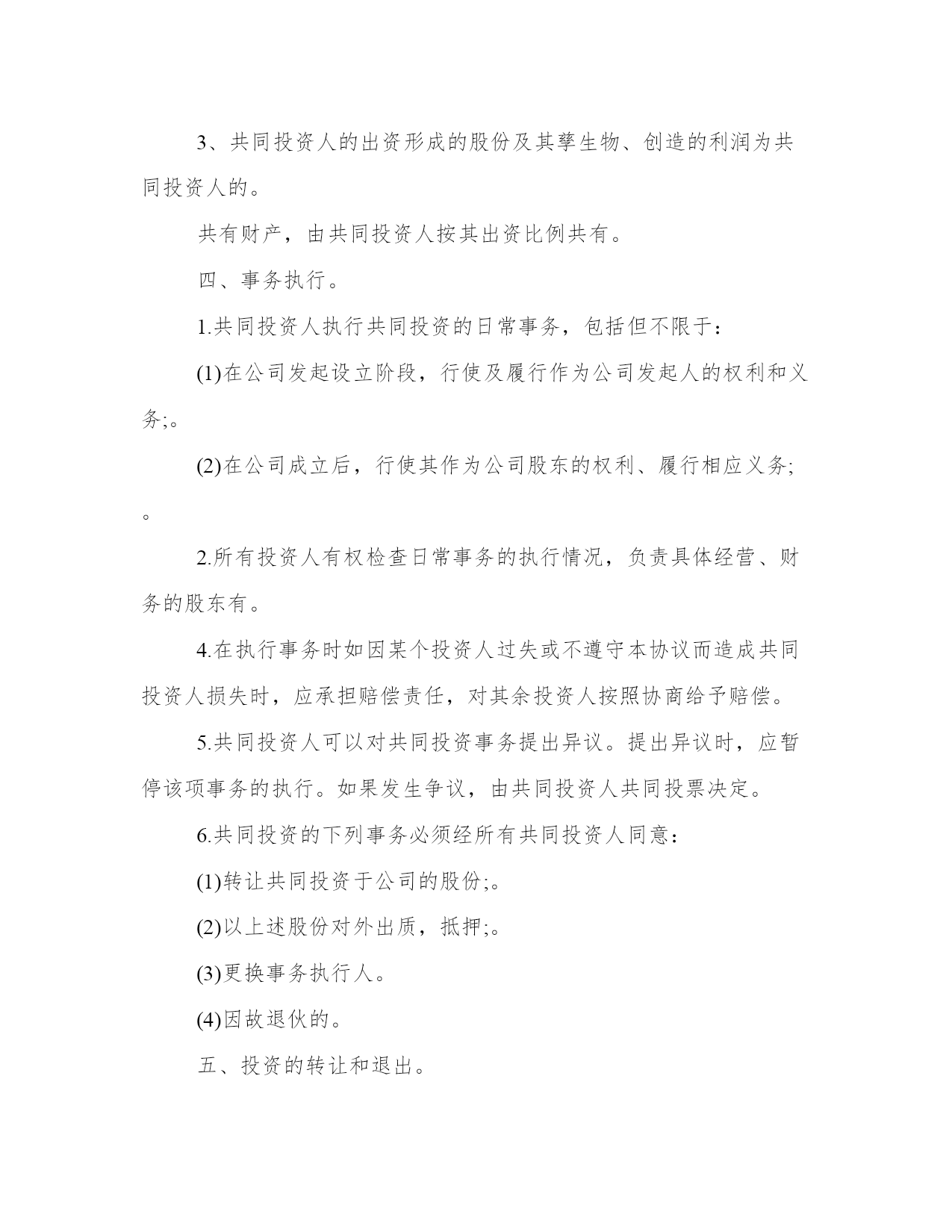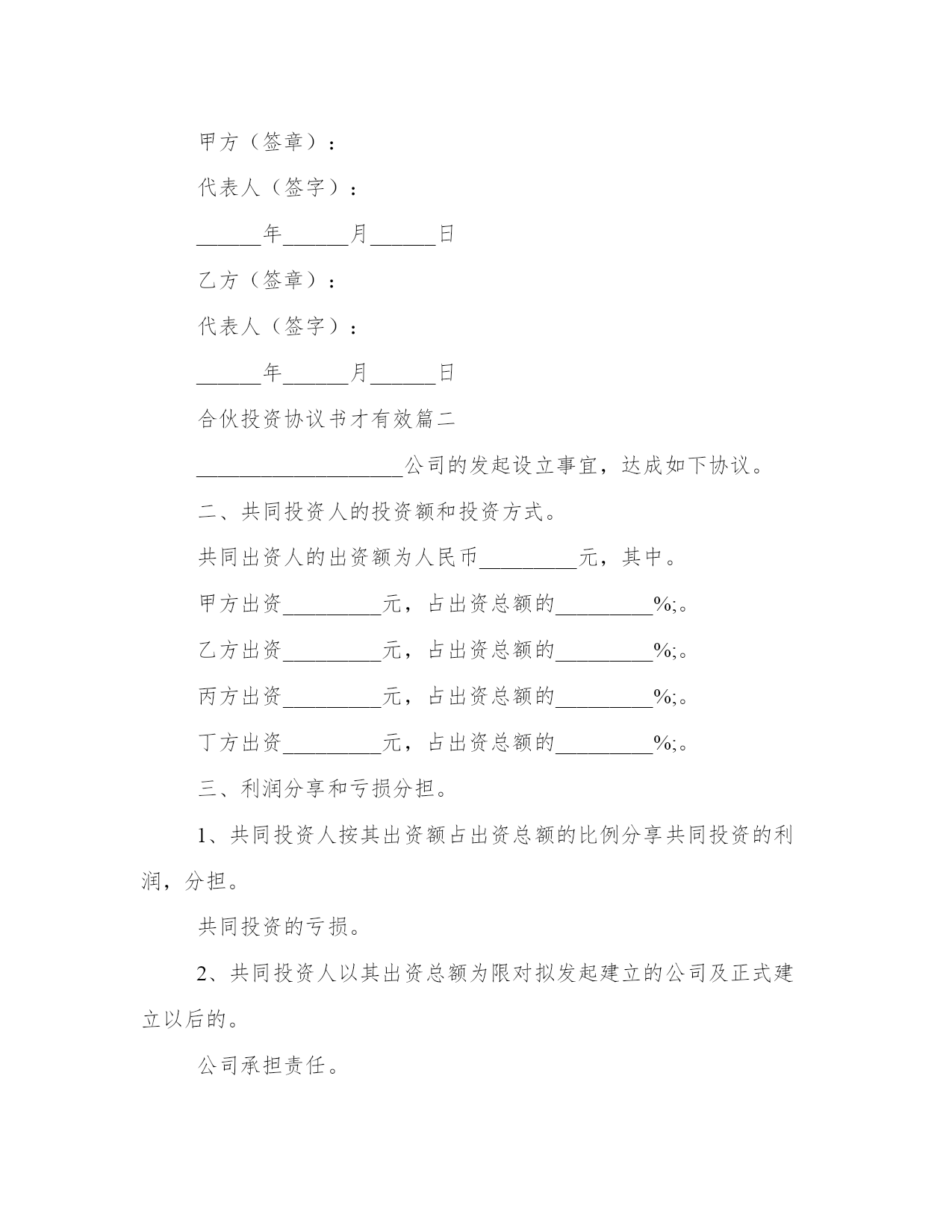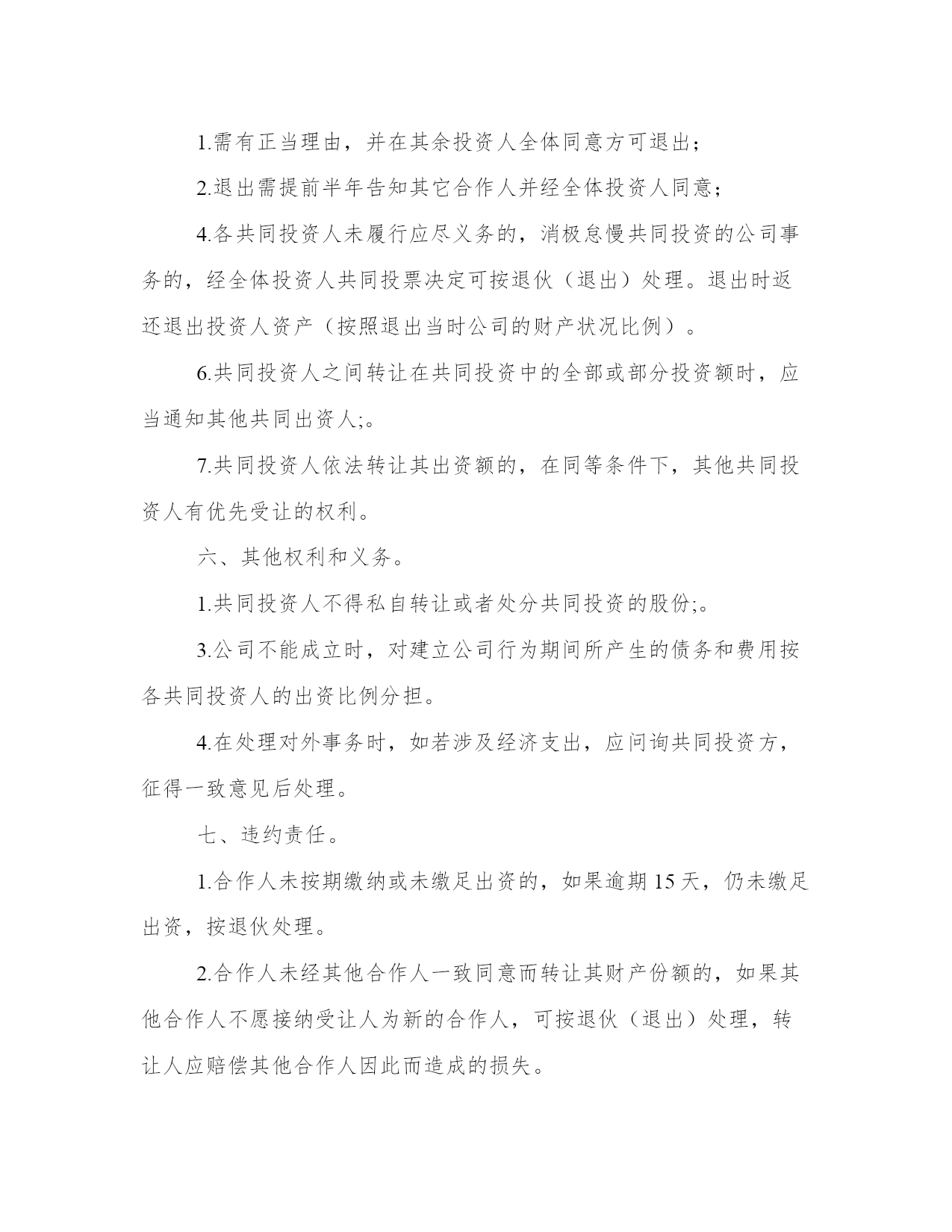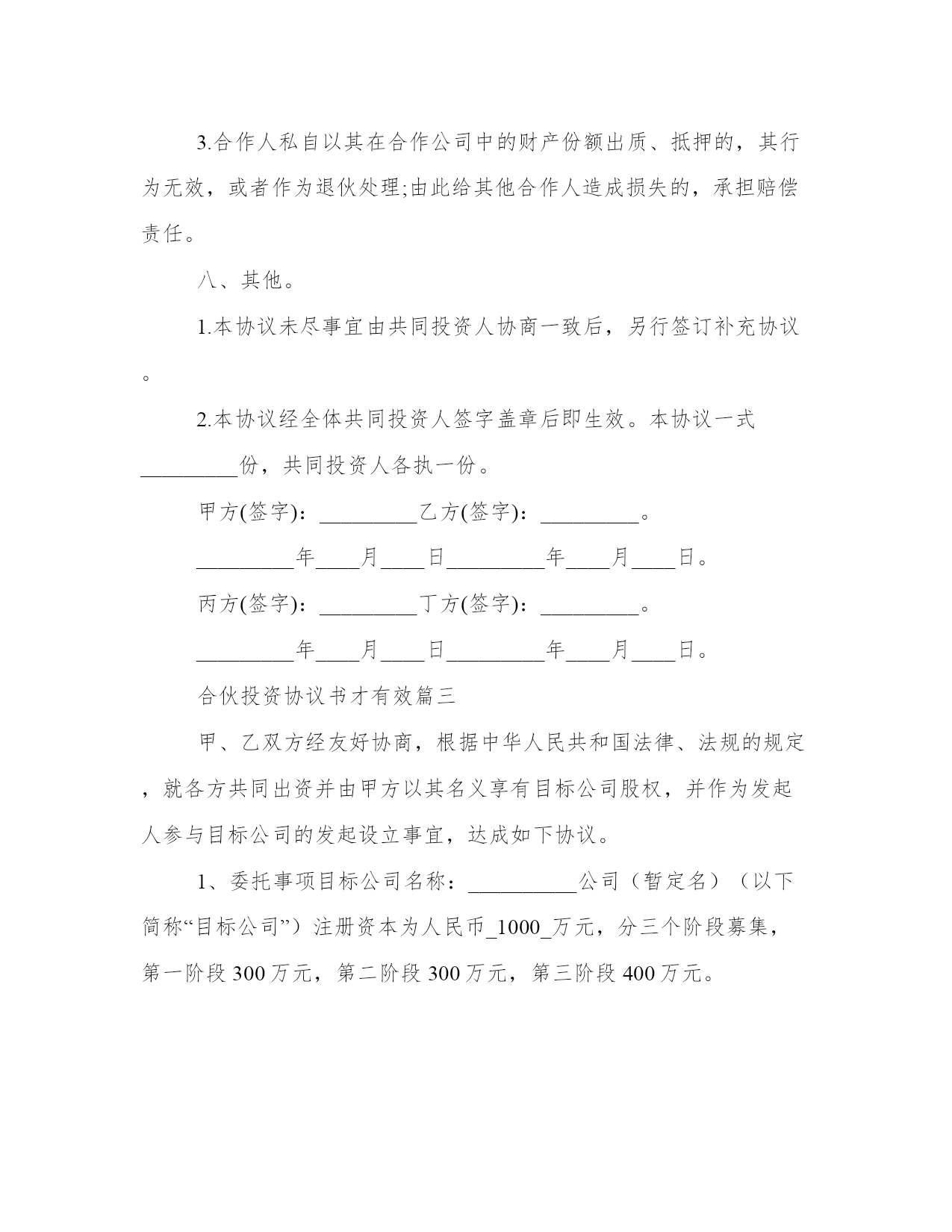 合伙投资协议书才有效(实用8篇)范文为教学中作为模范的文章,也常常用来指写作的模板。常常用于文秘写作的参考,也可以作为演讲材料编写前的参考。写范文的时候需要注意什么呢?有哪些格式需要注意呢?以下是小编为大家收集的优秀范文,欢迎大家分享阅读。合伙投资协议书才有效篇一甲方:代表:地址:电话:乙方:代表:地址:电话:甲乙双方本着平等自愿、互惠互利、共同发展的精神,按合同法有关条款规定,经双方友好协商,就甲方向乙方供应装饰装修材料(以下简称材料),合作经营事宜达成一致意见,并签订如下合作协议:甲乙双方共同合作的材料为:______。合作期限为______年,自______年______月______日起至______年______月______日止。1、甲、乙双方总部直接签署合作协议,建立合作关系。2、甲方授权装饰公司会员店与乙方指定分部签署相关合作协议。1、甲方向乙方提供材料的价格为装饰公司统一供货价、材料现行市场最低限价及市场标价。2、乙方必须严格执行甲方的价格制度,不得低于甲方材料现行市场最低限价销售,否则视为无效合同,因此而造成的后果,由乙方自负。3、甲方保留对向乙方供应材料价格的调整权,并在调整价格前以书面形式通知乙方,同时将该材料的最新价格提供给乙方。主材款由甲方直接与终端用户按实际发生材料量和终端用户订单价格结算,而后甲方及时将结算情况回执乙方,并向乙方提供终端用户验收签字的安装确认单,以便进一步办理相关手续。1、对于乙方违反甲方价格政策及结算制度的行为,甲方有权向乙方提出警告,直至终止协议。2、对于乙方擅自违约的行为,甲方有权扣除部分利润作为对甲方的补偿。3、对于乙方蓄意扰乱甲方销售市场的行为,甲方有权向乙方提出索赔。4、对于乙方攻击、贬低甲方产品,损坏甲方品牌形象的行为,甲方有权要求乙方做出合理解释,情形严重的,终止合作协议。造成甲方损失的,甲方有权追究乙方的法律责任。5、如因乙方在合作有效期内对甲方产品的技术、价格以及合作的其它机密发生泄漏以致给甲方造成损失,甲方有权追究乙方的法律责任。6、甲方应向乙方提供营业执照复印件、产品目录、产品说明书、技术标准、检验检测报告、价格表等文件、资料。7、甲方向乙方提供产品须符合国家相关标准。8、甲方在产品装卸、运输及安装过程中,应遵守双方约定的要求,并遵守乙方作业环境的要求。9、甲方应对所供产品的安装承担保修义务,保修期为一年,自安装之日起算,甲方在其所供产品保修期内出现质量问题,由甲方向终端用户履行保修责任及义务。1、乙方可以指定下属分公司(分店)与甲方指定的专卖店进行合作。2、乙方对甲方提供的不符合国家规定标准产品,有权向甲方提出索赔。3、乙方对甲方不能按合同及时安装的可以按合同法的约定,提出赔偿。4、乙方积极向终端用户介绍、推荐甲方的产品。5、乙方积极协调甲方与终端用户的主材供需事宜。6、乙方按终端用户需求,应提前______天向甲方或甲方授权装饰公司会员店订购所需产品,按甲方制定的标准文本进行填写,注明所订产品的名称、规格、数量、交货时间、地点、联系电话及收取的订金金额(订金金额不得高于______元人民币)等。7、乙方有义务对甲方产品的技术、价格及合作的其它机密给予保密。1、本协议规定终止之日前______日,双方协商续约事宜。2、本协议规定终止之日后没有续签的,本协议自动解除。3、本协议有效期内,经甲乙双方协商同意解除,本协议自动解除。4、因不可抗力如战争、严重自然灾害、国家政策或法规等因素使本协议不能正常执行,本协议自动解除。乙方和甲方均有义务履行保密义务,未经对方同意,不得向任何第三方披露或透露有关本协议内容项目下的任何信息。1、本协议未尽事宜,双方可协商解决,签署补充协议作为附件。补充协议经双方签字、盖章后与本协议具有同等法律效力。2、凡因执行本协议过程中发生的争议,友好协商解决。如经协商不能解决时,可提交______区人民法院,采取法律诉讼解决。3、本合同一式______份,甲乙双方各执______份,甲乙双方授权代表签字盖章后正式生效。甲方(签章):代表人(签字):______年______月______日乙方(签章):代表人(签字):______年______月______日合伙投资协议书才有效篇二___________________公司的发起设立事宜,达成如下协议。二、共同投资人的投资额和投资方式。共同出资人的出资额为人民币_________元,其中。甲方出资_________元,占出资总额的_________%;。乙方出资_________元,占出资总额的_________%;。丙方出资_________元,占出资总额的________