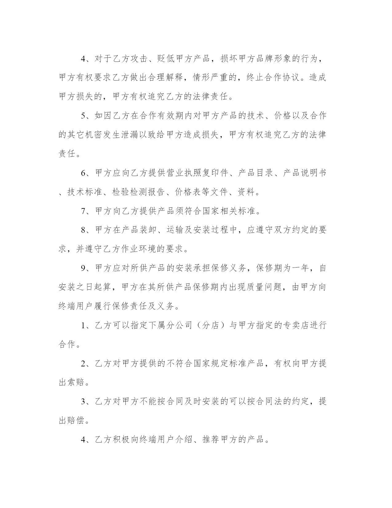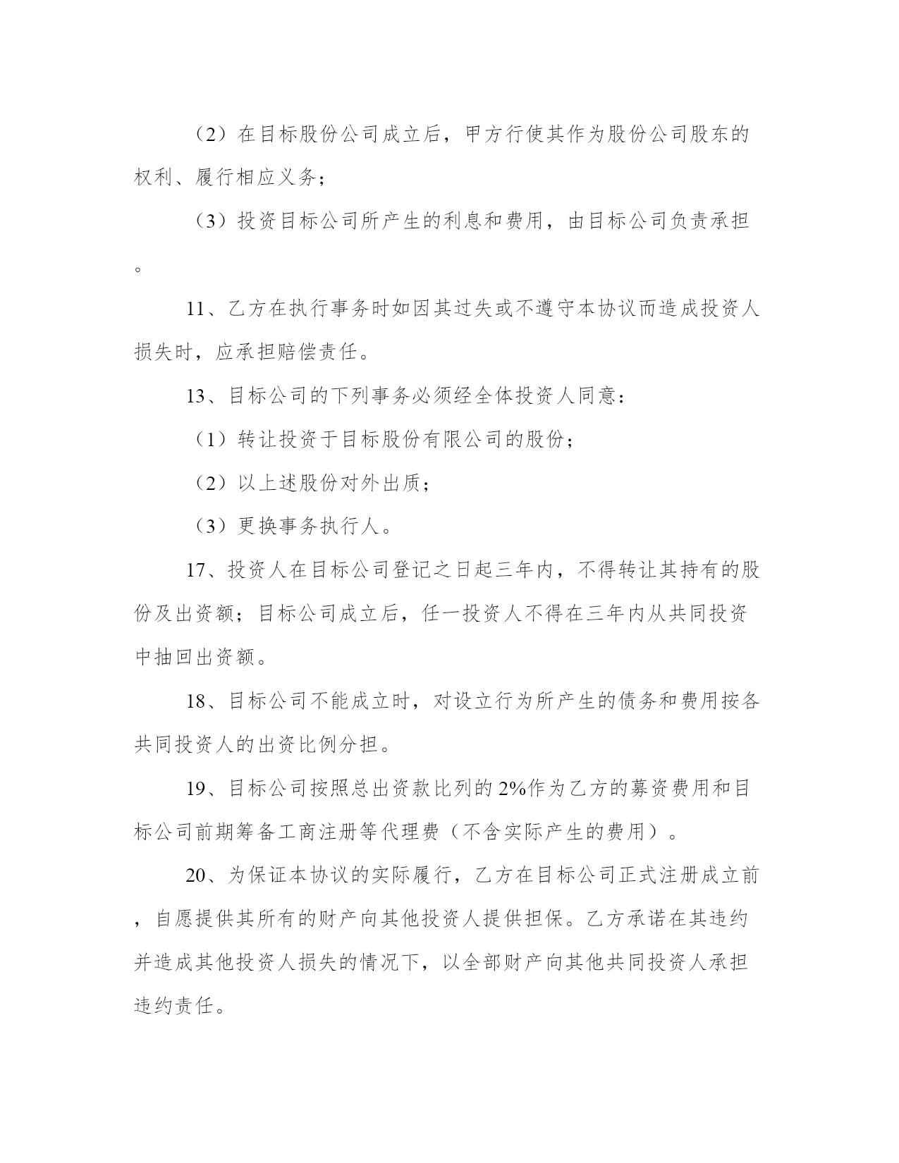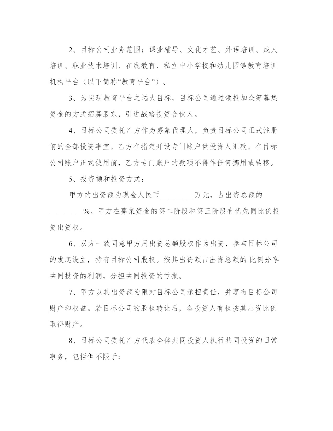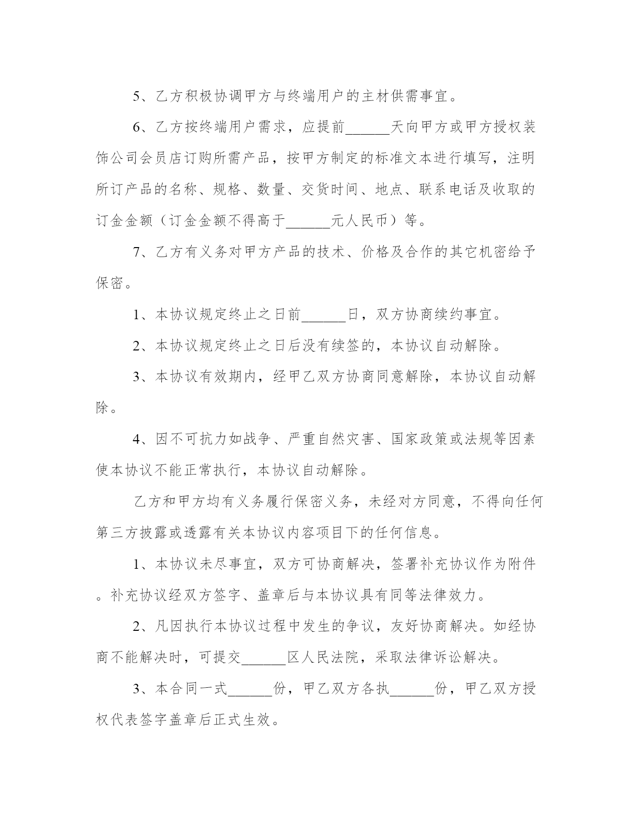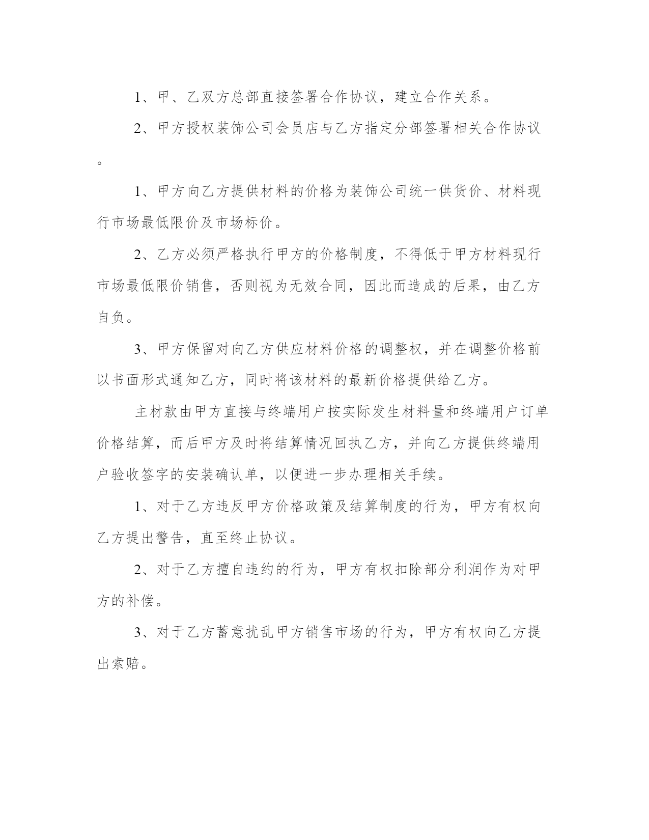 合伙投资协议书才有效(实用8篇)范文为教学中作为模范的文章,也常常用来指写作的模板。常常用于文秘写作的参考,也可以作为演讲材料编写前的参考。写范文的时候需要注意什么呢?有哪些格式需要注意呢?以下是小编为大家收集的优秀范文,欢迎大家分享阅读。合伙投资协议书才有效篇一甲方:代表:地址:电话:乙方:代表:地址:电话:甲乙双方本着平等自愿、互惠互利、共同发展的精神,按合同法有关条款规定,经双方友好协商,就甲方向乙方供应装饰装修材料(以下简称材料),合作经营事宜达成一致意见,并签订如下合作协议:甲乙双方共同合作的材料为:______。合作期限为______年,自______年______月______日起至______年______月______日止。1、甲、乙双方总部直接签署合作协议,建立合作关系。2、甲方授权装饰公司会员店与乙方指定分部签署相关合作协议。1、甲方向乙方提供材料的价格为装饰公司统一供货价、材料现行市场最低限价及市场标价。2、乙方必须严格执行甲方的价格制度,不得低于甲方材料现行市场最低限价销售,否则视为无效合同,因此而造成的后果,由乙方自负。3、甲方保留对向乙方供应材料价格的调整权,并在调整价格前以书面形式通知乙方,同时将该材料的最新价格提供给乙方。主材款由甲方直接与终端用户按实际发生材料量和终端用户订单价格结算,而后甲方及时将结算情况回执乙方,并向乙方提供终端用户验收签字的安装确认单,以便进一步办理相关手续。1、对于乙方违反甲方价格政策及结算制度的行为,甲方有权向乙方提出警告,直至终止协议。2、对于乙方擅自违约的行为,甲方有权扣除部分利润作为对甲方的补偿。3、对于乙方蓄意扰乱甲方销售市场的行为,甲方有权向乙方提出索赔。4、对于乙方攻击、贬低甲方产品,损坏甲方品牌形象的行为,甲方有权要求乙方做出合理解释,情形严重的,终止合作协议。造成甲方损失的,甲方有权追究乙方的法律责任。5、如因乙方在合作有效期内对甲方产品的技术、价格以及合作的其它机密发生泄漏以致给甲方造成损失,甲方有权追究乙方的法律责任。6、甲方应向乙方提供营业执照复印件、产品目录、产品说明书、技术标准、检验检测报告、价格表等文件、资料。7、甲方向乙方提供产品须符合国家相关标准。8、甲方在产品装卸、运输及安装过程中,应遵守双方约定的要求,并遵守乙方作业环境的要求。9、甲方应对所供产品的安装承担保修义务,保修期为一年,自安装之日起算,甲方在其所供产品保修期内出现质量问题,由甲方向终端用户履行保修责任及义务。1、乙方可以指定下属分公司(分店)与甲方指定的专卖店进行合作。2、乙方对甲方提供的不符合国家规定标准产品,有权向甲方提出索赔。3、乙方对甲方不能按合同及时安装的可以按合同法的约定,提出赔偿。4、乙方积极向终端用户介绍、推荐甲方的产品。5、乙方积极协调甲方与终端用户的主材供需事宜。6、乙方按终端用户需求,应提前______天向甲方或甲方授权装饰公司会员店订购所需产品,按甲方制定的标准文本进行填写,注明所订产品的名称、规格、数量、交货时间、地点、联系电话及收取的订金金额(订金金额不得高于______元人民币)等。7、乙方有义务对甲方产品的技术、价格及合作的其它机密给予保密。1、本协议规定终止之日前______日,双方协商续约事宜。2、本协议规定终止之日后没有续签的,本协议自动解除。3、本协议有效期内,经甲乙双方协商同意解除,本协议自动解除。4、因不可抗力如战争、严重自然灾害、国家政策或法规等因素使本协议不能正常执行,本协议自动解除。乙方和甲方均有义务履行保密义务,未经对方同意,不得向任何第三方披露或透露有关本协议内容项目下的任何信息。1、本协议未尽事宜,双方可协商解决,签署补充协议作为附件。补充协议经双方签字、盖章后与本协议具有同等法律效力。2、凡因执行本协议过程中发生的争议,友好协商解决。如经协商不能解决时,可提交______区人民法院,采取法律诉讼解决。3、本合同一式______份,甲乙双方各执______份,甲乙双方授权代表签字盖章后正式生效。甲方(签章):代表人(签字):______年______月______日乙方(签章):代表人(签字):______年______月______日合伙投资协议书才有效篇二___________________公司的发起设立事宜,达成如下协议。二、共同投资人的投资额和投资方式。共同出资人的出资额为人民币_________元,其中。甲方出资_________元,占出资总额的_________%;。乙方出资_________元,占出资总额的_________%;。丙方出资_________元,占出资总额的________