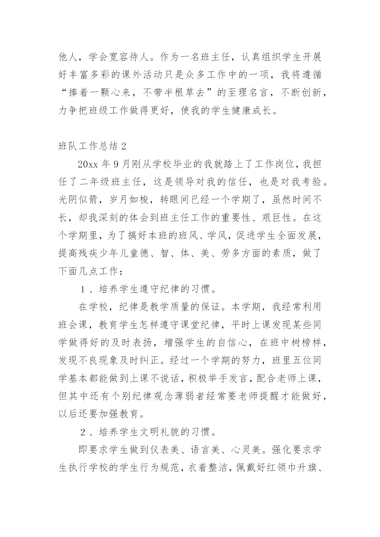 班队工作总结总结是在一段时间内对学习和工作生活等表现加以总结和概括的一种书面材料,它可以帮助我们总结以往思想,发扬成绩,是时候写一份总结了。总结怎么写才不会流于形式呢?以下是小编帮大家整理的班队工作总结,欢迎大家分享。班队工作总结1本学期来,我班根据学校工作指导思想,建设优良的班风,创造有利于每个学生个性发展,潜能开发的空间和舞台,科学健全各项管理制度,开展丰富多彩纷的活动。一学期以来我坚持做到以下几点:一、建立良好的班风加强组织纪律性,逐步形成良好班风。班级是学生学习集体,必须具有严密的组织性、纪律性。在入学之后即抓紧组织纪律性则为以后教育任务的完成打下良好的基础。从思想教育、行政措施、规章制度等多方面入手,使自己的班级从一开始就有严密的纪律性,并在此基础上培养学生的优良学风。通过学习目的性、治学态度、集体主义等多方面的教育,树立榜样,形成正确舆论,从而使更多的学生形成优良学风。当大多数学生形成尊师爱友、勤奋学习、关心集体、遵守纪律、艰苦朴素、热爱劳动、讲究卫生、积极锻炼的优良学风时,一个良好的班风也开始形成,这种良好的班风,反映了大多数学生的精神面貌,表明班级的特点。良好的班风是逐渐形成的,班主任有意识的培养、指导是至关重要的。应该讲清道理、树立榜样、严格要求、反复实践、持之以恒。从理解开始进行行为训练,形成习惯,进一步形成良好的班风。二、做好班干部的工作在班级管理中,对班队干部的配备与引导是极为重要的。班队干部是班主任开展工作不可缺少的小助手。但更为重要的是班队干部的岗位是培养、提高学生综合素质、促进学生全面发展的课堂,它应该面向每一个学生。班干部轮岗,就是让全班所有学生轮流担任班干部。我的做法是:先定岗,而后学生竞选上岗,组成第一轮班委。下一轮则由个人自愿申报,再根据申报人员构成情况及班级工作需要,师生讨论确定新一轮班委,轮换周期为一个学期。工作轮岗制为每个学生提供了充分展示自己的舞台。由于主客观多方面的因素,班主任常常有意无意地忽视一些较为内向的学生,注意不到他们的长处,这些学生优秀的品质与某方面的特长又常常是隐含着的;某些较为调皮的学生又常因表面的淘气而淹没了他们的勇敢、正直、热心等闪光点。这两类学生一旦拥有了施展才华、展示自我的机会,往往比别人更珍惜,更努力。三、发挥班级文化的功能,形成学生的优良品质班级文化具有指向性和推动作用的功能。指向是指班级文化的构建方向和目标;推动是使班级文化向着指定方向和目标前进的内驱力和外在因素。因此,发挥班级文化的功能,形成学生的优良品质也是现代班级文化建设的首要任务。班级文化的物质载体分为显形文化和隐性文化。显形文化有:板报、条幅等,隐性文化则表现为班风、学风等。在显形文化方面,创设良好的环境,能对学生进行潜移默化的熏陶和感染。苏霍姆林斯基说的“使学校的墙壁也说话”就强调了环境育人的重要性。例如:在教室的墙壁布置学生书写的哲理名言,使学生敛容深思;张贴的地图、风景画能激起学生对大自然的.向往、对祖国的热爱;在“成长的足迹中”,把学生取得的点滴成绩公布出来,可引导学生积极向上。此种做法能激发学生的内驱力,推动班级文化向着良好的方向发展,也使学生在班级文化的共同影响下,形成良好的品质。在隐性文化方面,可以《小学生日常行为规范》为准则,经常了解学生的思想,定期进行品德评定,评价每个学生的行为表现,表扬先进,帮助后进。在良好的班风的促进下,使每一个学生形成良好的品质。四、让学生在活动中成长积极开展各项活动,活动的教育意义要能巧妙自然地渗透在其中。当受教育者在教育活动开始之前就明白地知道“我在受教育”,这样的教育先就失去了一半成功的机会。如今的学生大都是独生子女,在家是“小皇帝”“小公主”,事事顺心,唯我独尊,这样的孩子都是比较自私、冷漠、缺乏爱心。学生经常在一些小事上表现出较强的个人主义,凡事斤斤计较,犯了错误总把责任推给别人。为此,我设计了以“爱的奉献”为主题的一个系列活动,让他们从身边的同学身上学会关心他人,学会宽容待人。作为一名班主任,认真组织学生开展好丰富多彩的课外活动只是众多工作中的一项,我将遵循“捧着一颗心来,不带半根草去”的至理名言,不断创新,力争把班级工作做得更好,使我的学生健康成长。班队工作总结220xx年9月刚从学校毕业的我就踏上了工作岗位,我担任了二年级班主任,这是领导对我的信任,也是对我考验。光阴似箭,岁月如梭,转眼间已经一个学期了,虽然时间不长,却我深刻的体会到班主任工作的重要性、艰巨性。在这个学期里,为了搞好本班的班风、学风,促进学生全面发展,提高残疾少年儿童德、智、体、美、劳多方面的素质,做了下面几点工作:1、培养学生遵守纪律的习惯。在学校,纪律是教学质量的保证。本学期,我经常利用班会课,教育学生怎样遵守课堂纪律,平时上课发现某些同学做得好的及时表扬,增