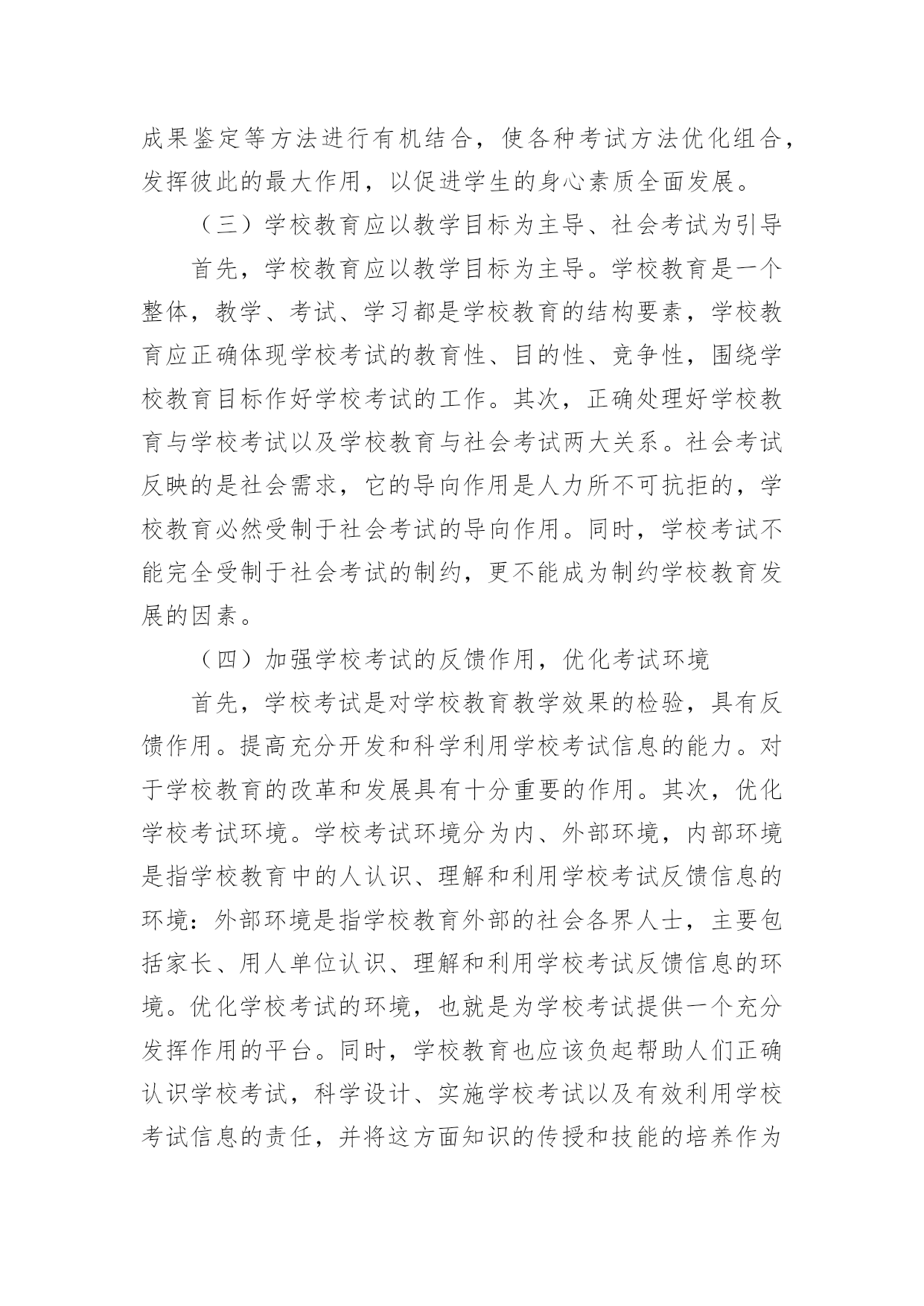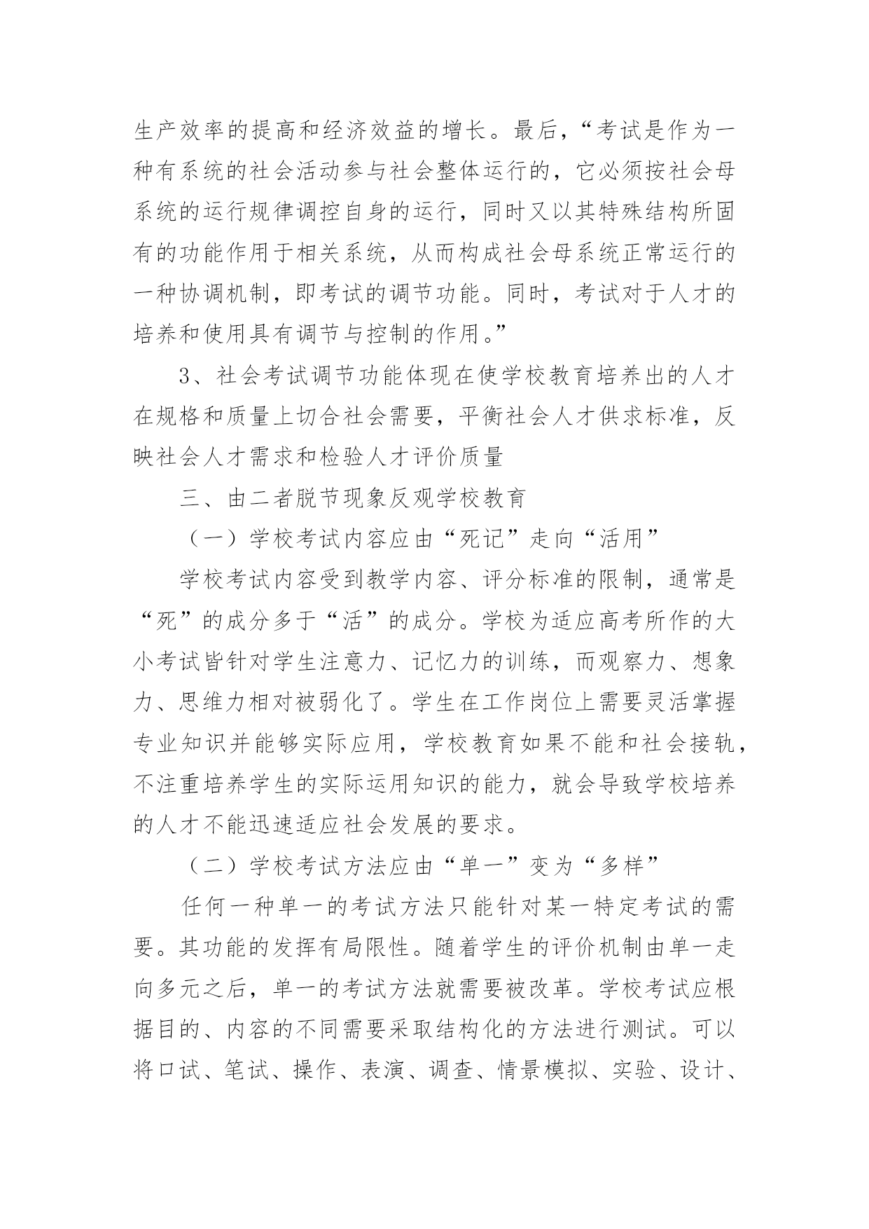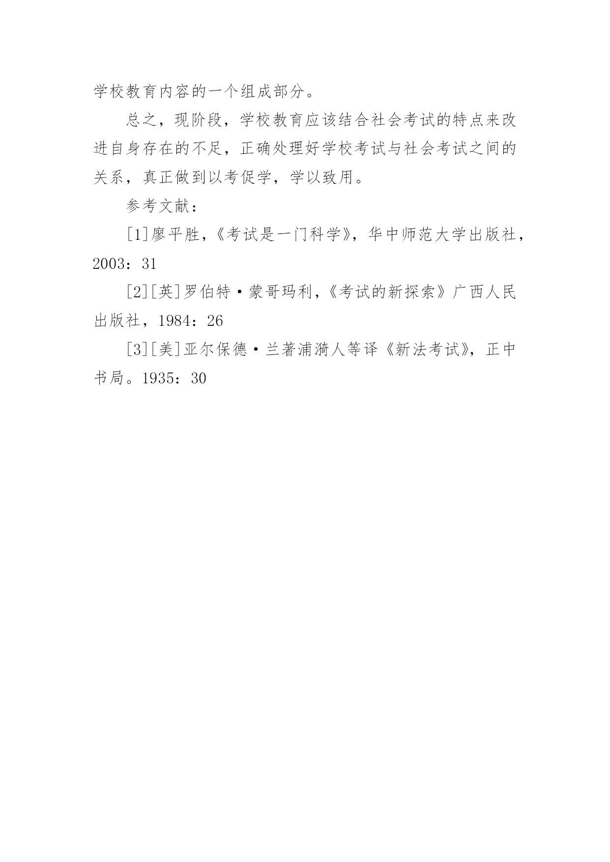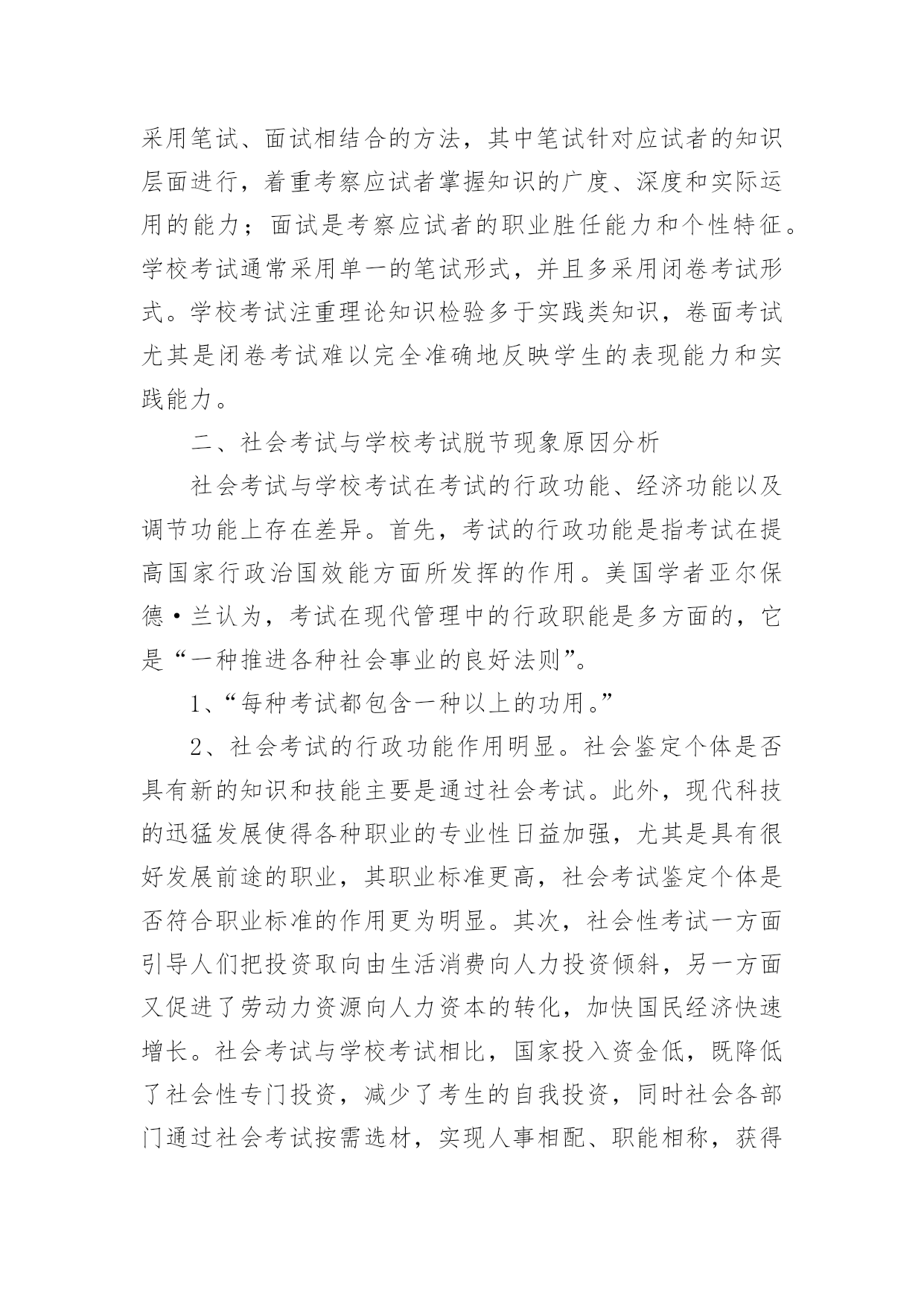 由社会考试与学校考试脱节现象反观学校教育的教育理论论文论文关键词:社会考试学校考试学校教育论文摘要:社会考试是一种以技能考核、水平测试和资格认定为主要标志的非学历考试,近年来受到社会的广泛关注。本文通过比较社会考试和学校考试在内容和方法上的脱节现象,分析了造成两者脱节的原因是由于所从属的考试目标和功能的差异造成的。近年来我国非学历教育发展迅猛,社会考试因其周期短、见效快,考试形式灵活、开放,已日渐成为与学校考试并行的重要考试类型。但社会考试与学校考试在内容、方法上存在某种脱节现象,对学校教育的教育教学效果产生一定影响。如何协调社会考试与学校考试之间的关系,发挥社会考试对学校教育的补充作用是值得我们思考的问题。一、社会考试与学校考试的脱节现象(一)社会考试与学校考试内容的脱节。社会考试内容具有高度的应用性和时效性,它根据社会发展不断调整考试内容,推出新的有针对性的认证考试。如计算机等级考试、20XX年教育部考试中心推出的“调查分析师证书考试”、“劳动与社会保障职业资格考试”等,都是适应当今社会发展需要的考试项目。(二)社会考试与学校考试方法的脱节社会考试方法多样,学校考试方法较为单一。社会考试采用笔试、面试相结合的方法,其中笔试针对应试者的知识层面进行,着重考察应试者掌握知识的广度、深度和实际运用的能力;面试是考察应试者的职业胜任能力和个性特征。学校考试通常采用单一的笔试形式,并且多采用闭卷考试形式。学校考试注重理论知识检验多于实践类知识,卷面考试尤其是闭卷考试难以完全准确地反映学生的表现能力和实践能力。二、社会考试与学校考试脱节现象原因分析社会考试与学校考试在考试的行政功能、经济功能以及调节功能上存在差异。首先,考试的行政功能是指考试在提高国家行政治国效能方面所发挥的作用。美国学者亚尔保德·兰认为,考试在现代管理中的行政职能是多方面的,它是“一种推进各种社会事业的良好法则”。1、“每种考试都包含一种以上的功用。”2、社会考试的行政功能作用明显。社会鉴定个体是否具有新的知识和技能主要是通过社会考试。此外,现代科技的迅猛发展使得各种职业的专业性日益加强,尤其是具有很好发展前途的职业,其职业标准更高,社会考试鉴定个体是否符合职业标准的作用更为明显。其次,社会性考试一方面引导人们把投资取向由生活消费向人力投资倾斜,另一方面又促进了劳动力资源向人力资本的转化,加快国民经济快速增长。社会考试与学校考试相比,国家投入资金低,既降低了社会性专门投资,减少了考生的自我投资,同时社会各部门通过社会考试按需选材,实现人事相配、职能相称,获得生产效率的提高和经济效益的增长。最后,“考试是作为一种有系统的社会活动参与社会整体运行的,它必须按社会母系统的运行规律调控自身的运行,同时又以其特殊结构所固有的功能作用于相关系统,从而构成社会母系统正常运行的一种协调机制,即考试的调节功能。同时,考试对于人才的培养和使用具有调节与控制的作用。”3、社会考试调节功能体现在使学校教育培养出的人才在规格和质量上切合社会需要,平衡社会人才供求标准,反映社会人才需求和检验人才评价质量三、由二者脱节现象反观学校教育(一)学校考试内容应由“死记”走向“活用”学校考试内容受到教学内容、评分标准的限制,通常是“死”的成分多于“活”的成分。学校为适应高考所作的大小考试皆针对学生注意力、记忆力的训练,而观察力、想象力、思维力相对被弱化了。学生在工作岗位上需要灵活掌握专业知识并能够实际应用,学校教育如果不能和社会接轨,不注重培养学生的实际运用知识的能力,就会导致学校培养的人才不能迅速适应社会发展的要求。(二)学校考试方法应由“单一”变为“多样”任何一种单一的考试方法只能针对某一特定考试的需要。其功能的发挥有局限性。随着学生的评价机制由单一走向多元之后,单一的考试方法就需要被改革。学校考试应根据目的、内容的不同需要采取结构化的方法进行测试。可以将口试、笔试、操作、表演、调查、情景模拟、实验、设计、成果鉴定等方法进行有机结合,使各种考试方法优化组合,发挥彼此的最大作用,以促进学生的身心素质全面发展。(三)学校教育应以教学目标为主导、社会考试为引导首先,学校教育应以教学目标为主导。学校教育是一个整体,教学、考试、学习都是学校教育的结构要素,学校教育应正确体现学校考试的教育性、目的性、竞争性,围绕学校教育目标作好学校考试的工作。其次,正确处理好学校教育与学校考试以及学校教育与社会考试两大关系。社会考试反映的是社会需求,它的导向作用是人力所不可抗拒的,学校教育必然受制于社会考试的导向作用。同时,学校考试不能完全受制于社会考试的制约,更不能成为制约学校教育发展的因素。(四)加强学校考试的反馈作用,优化考试环境首先,学校考试是对学校教育教学效果的检验,具有反馈作用。提高充分开发和科学利用学校考试信