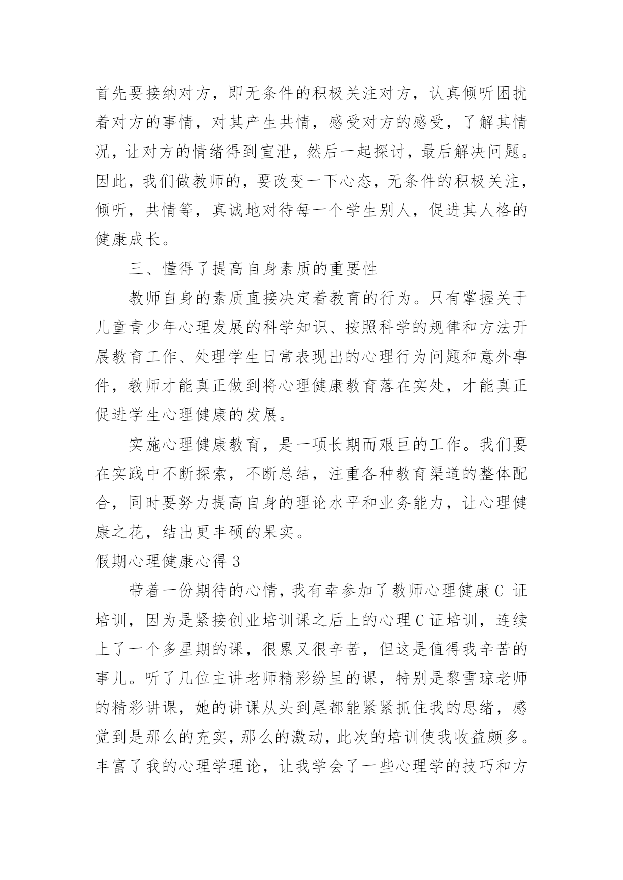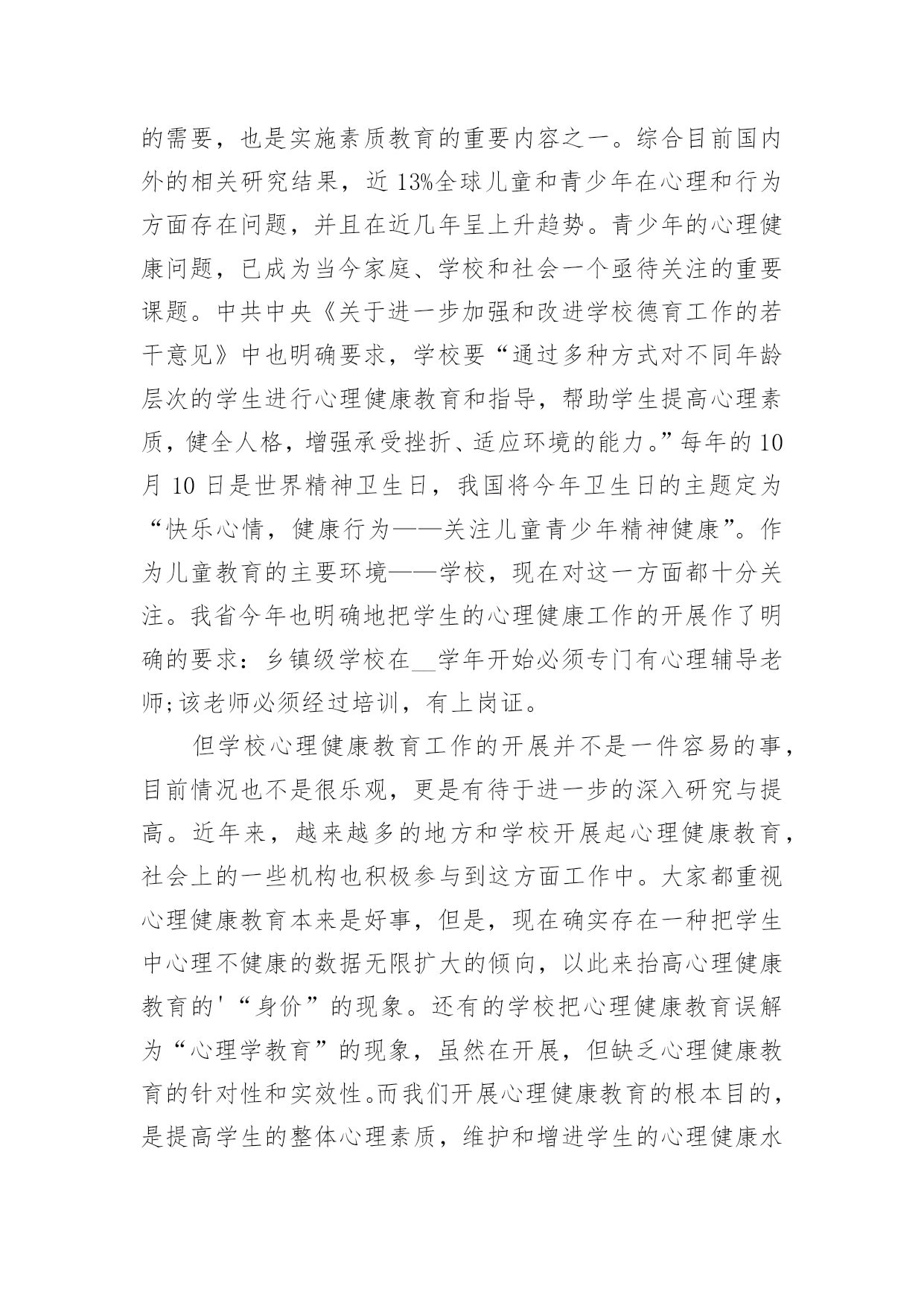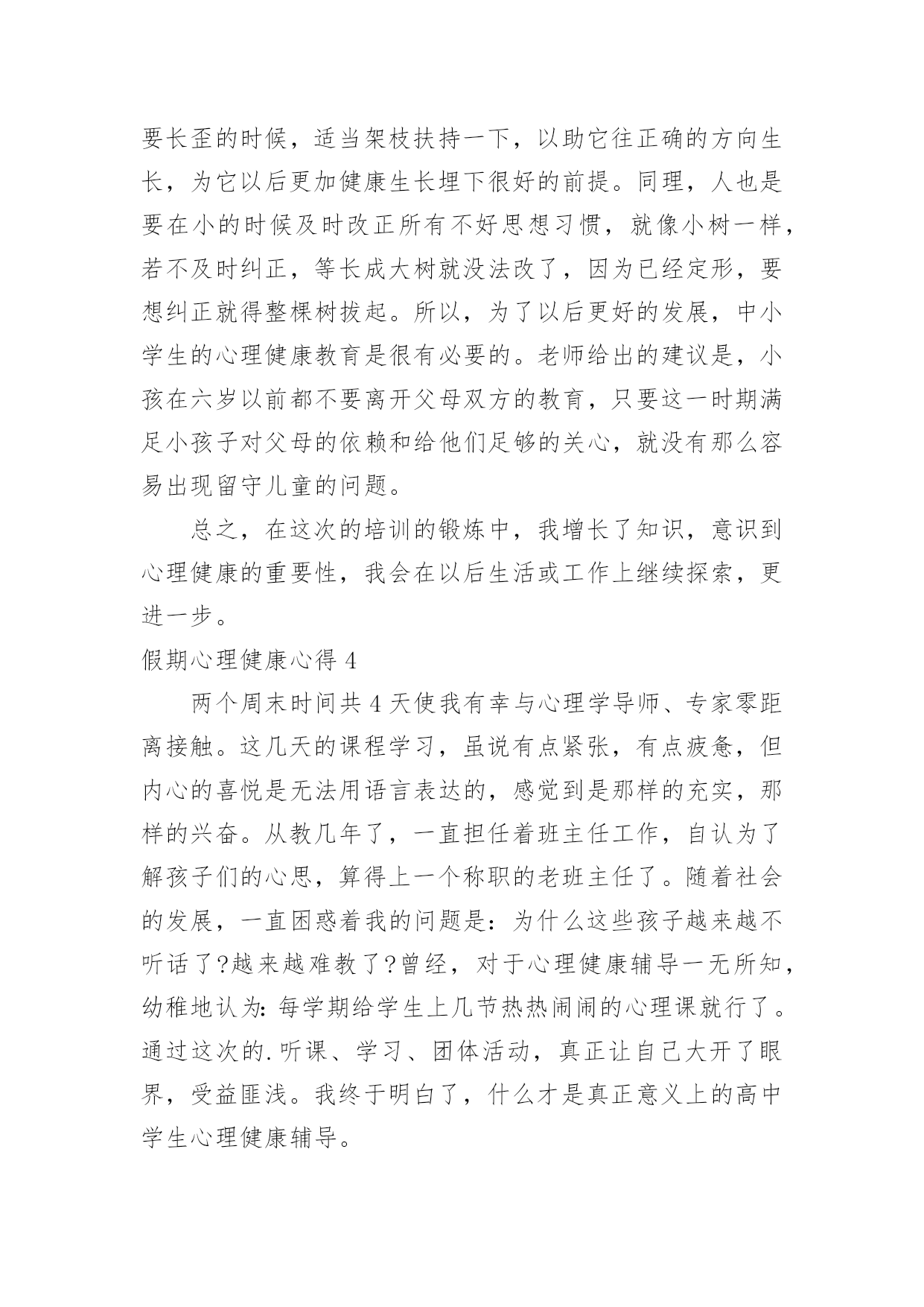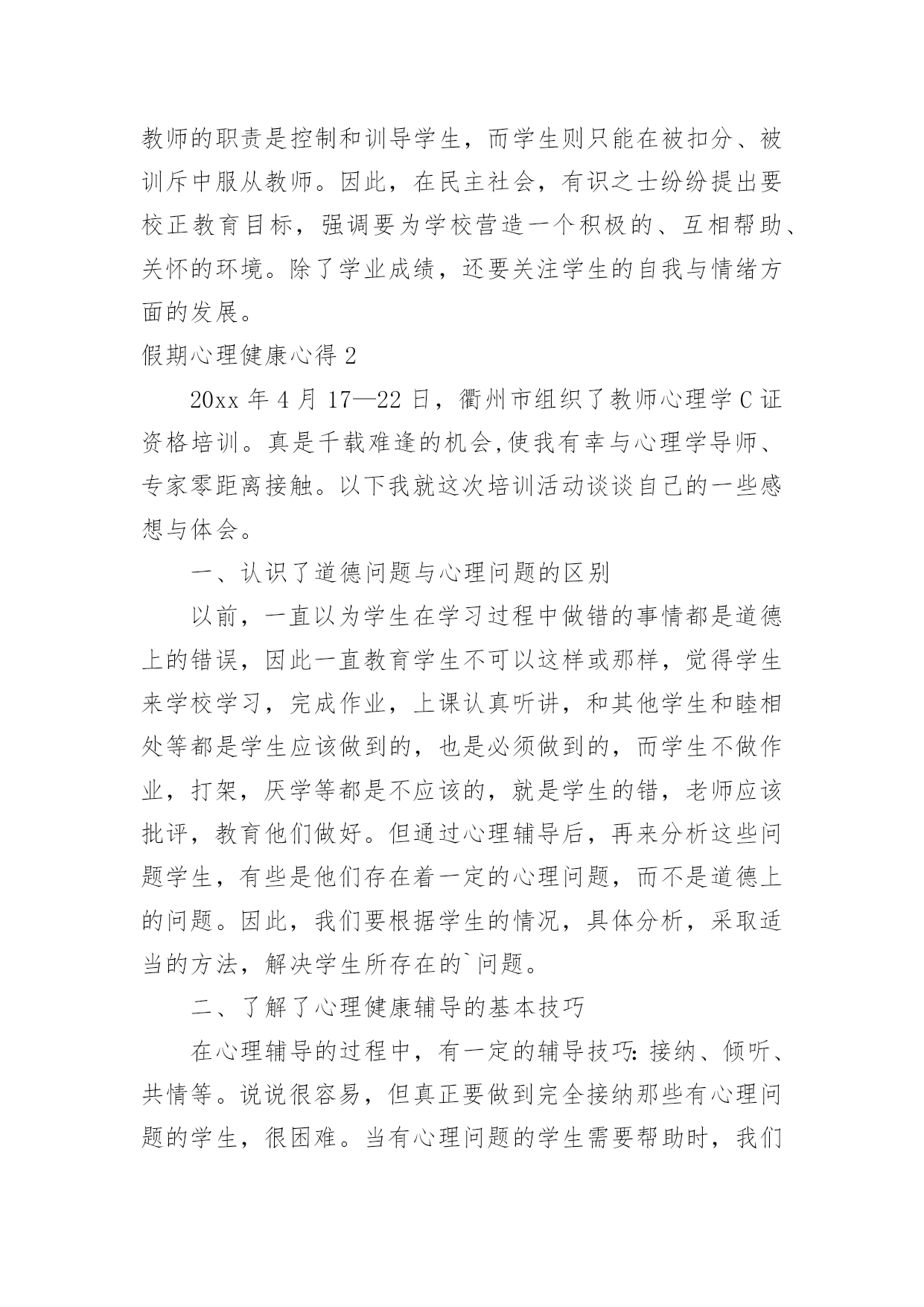 假期心理健康心得假期心理健康心得当我们备受启迪时,可以寻思将其写进心得体会中,这样可以帮助我们总结以往思想、工作和学习。你想好怎么写心得体会了吗?下面是小编帮大家整理的假期心理健康心得,欢迎阅读,希望大家能够喜欢。假期心理健康心得1今天上午,我们锦华小学和古寨小学共同举行了依次健康教育研讨活动。参加本次活动的的有来自两所学校的教师10多人,同时参会的还有教科所的主任和心理健康负责人。活动中听取了县小学心理健康负责老师,对于目前他们学校有关心理辅导活动的开展的一些情况与做法,并且听取了三节心理辅导课听课之后,与会的代表就有关学校心理健康教育的问题展开了讨论,教科所主任还转达了区教育委员会的有关精神和要求。由此可见,我们小学心理健康教育工作的开展无疑是先行了一大步,通过学习,感慨颇多,让人感到沉重与责任重大。下面谈几点我对心理健康有了新的认识体会:一、学校有必要开展学生心理健康教育工作,但要慎重,要正确对待,有效实施。心理健康是学生心理发展的需要,是培养21世纪人才的需要,也是实施素质教育的重要内容之一。综合目前国内外的相关研究结果,近13%全球儿童和青少年在心理和行为方面存在问题,并且在近几年呈上升趋势。青少年的心理健康问题,已成为当今家庭、学校和社会一个亟待关注的重要课题。中共中央《关于进一步加强和改进学校德育工作的若干意见》中也明确要求,学校要“通过多种方式对不同年龄层次的学生进行心理健康教育和指导,帮助学生提高心理素质,健全人格,增强承受挫折、适应环境的能力。”每年的10月10日是世界精神卫生日,我国将今年卫生日的主题定为“快乐心情,健康行为——关注儿童青少年精神健康”。作为儿童教育的主要环境——学校,现在对这一方面都十分关注。我省今年也明确地把学生的心理健康工作的开展作了明确的要求:乡镇级学校在__学年开始必须专门有心理辅导老师;该老师必须经过培训,有上岗证。但学校心理健康教育工作的开展并不是一件容易的事,目前情况也不是很乐观,更是有待于进一步的深入研究与提高。近年来,越来越多的地方和学校开展起心理健康教育,社会上的一些机构也积极参与到这方面工作中。大家都重视心理健康教育本来是好事,但是,现在确实存在一种把学生中心理不健康的数据无限扩大的倾向,以此来抬高心理健康教育的'“身价”的现象。还有的学校把心理健康教育误解为“心理学教育”的现象,虽然在开展,但缺乏心理健康教育的针对性和实效性。而我们开展心理健康教育的根本目的,是提高学生的整体心理素质,维护和增进学生的心理健康水平。因此,学校心理健康教育的展开以及形式等都要慎重,要注重实效性,要根据不同情况体现多样性。在小学,应以游戏和活动为主。二、学校学生心理健康教育工作的开展的几点思考:1、要把重视学生心理健康教育作为转变教育观念的重要内容。随着社会经济的发展,教育必须加速改革,迅速由应试教育向素质教育转轨,由学科系统型教育向职业能力型转轨。首先是思想观念的转变。素质教育以转变思想、提高德育素质为灵魂,只有良好的心理才会产生高尚的道德行为。学校教育和学生管理必须建立在学生思想健康的基础上,提高教育的针对性,才会收到预期效果。所以,学校应健全心理健康教育机构,开设心理健康教育课程,开展心理咨询,把心理教育纳入教育计划。我们学校目前虽然没有正式的心理健康教育机构和专门的教育课程,但学校领导和学生处经常督促教师要注重学生健全人格的养成教育。任课教师在自己的学科教学中都重视渗透德育(特别是学生的情感体验)教育,班主任老师更是走在前头,他们利用多种多样的方法和手段,像开展丰富多样的班队活动课和有益于学生健康成长的各种课外活动、义务劳动,举办一些知识讲座,个别谈心,给以关爱和帮助等有效的手段和方法来教育感化本班学生,尽力使学生快乐健康地成长。我们学校的教师事实上都已重视了对学生的心理健康教育,目前缺乏的是有专业的人来指导,还不能把学校的心理健康教育工作提到一定的专业与理论水平上来。2、努力提高教师心理学知识和对学生心理健康教育的水平。教师是人类灵魂的工程师,其含义应该是教师以健康的心灵感染学生,以良好的心态影响学生,以渊博知识和规范的行为教育学生。每一个学生身上都有教师这些方面的烙印,所以,对教师的心灵和职业道德要求格外高。教师必须有健康的心理外,还要具备了解学生的心理,掌握学生心态,帮助学生心理健康和克服心理障碍,有效铸造人类灵魂的能力,因此,必须加强心理学知识的学习。尤其是非师范毕业的教师应补好心理学这一课。学校还应定期组织对教师进行心理学的继续学习,定期交流应用心理学知识、管理教育学生的经验。3、提高教育管理的针对性。以往我们存在着用同种方法、同种手段教育所有的学生,少数人犯错,大家挨批,少数人有提高全班都光荣的现象,不重视个性教育。在教育上,所有“一个羊是放,一群羊也是放”的说