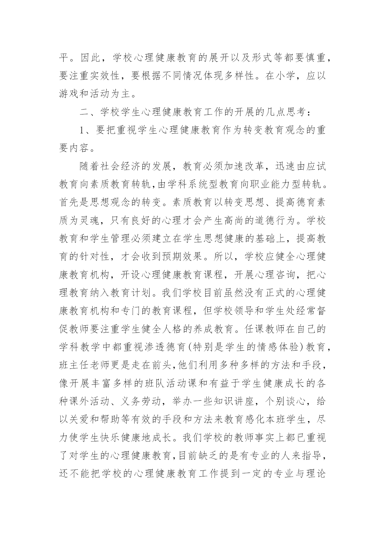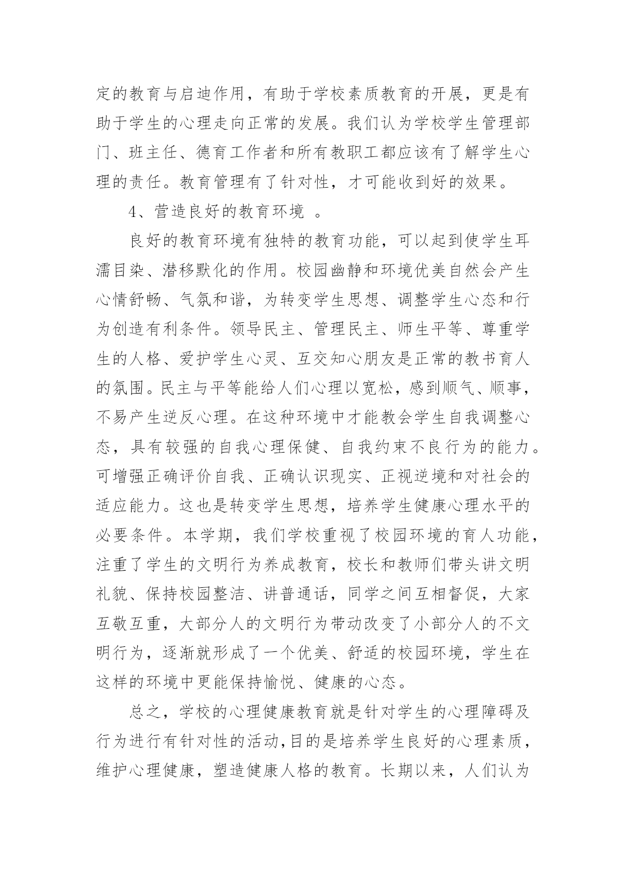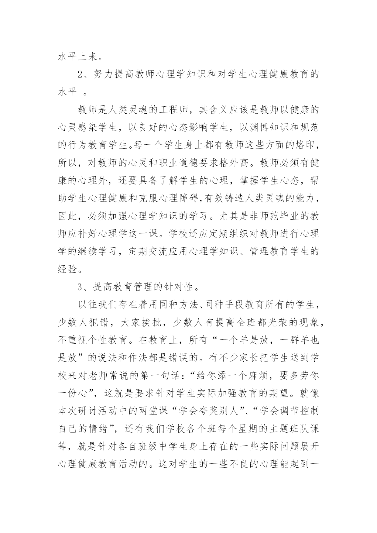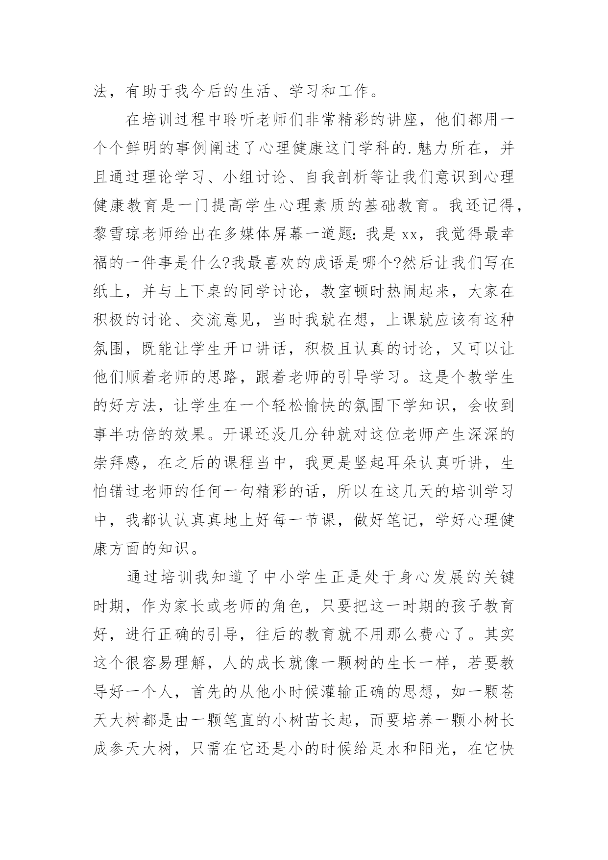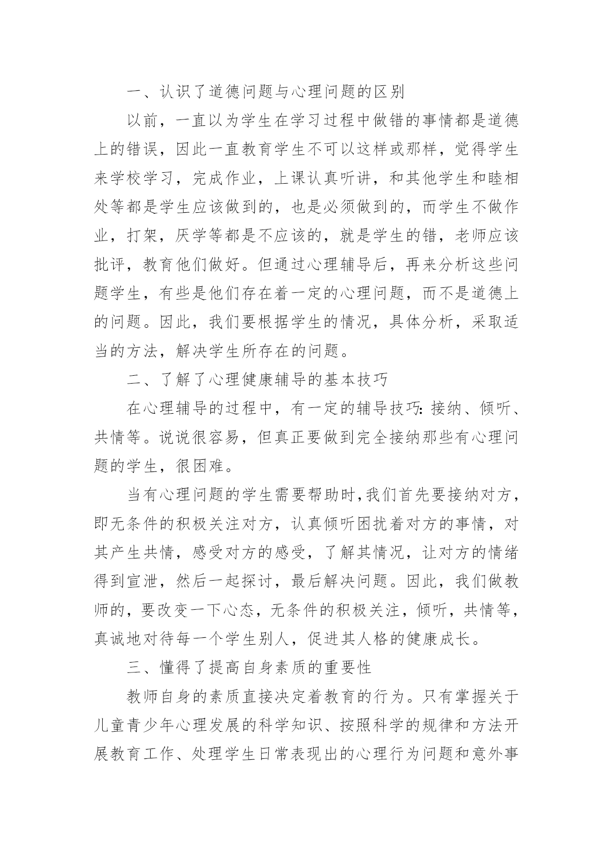 假期心理健康心得假期心理健康心得当我们备受启迪时,可以寻思将其写进心得体会中,这样可以帮助我们总结以往思想、工作和学习。你想好怎么写心得体会了吗?下面是小编帮大家整理的假期心理健康心得,欢迎阅读,希望大家能够喜欢。假期心理健康心得1今天上午,我们锦华小学和古寨小学共同举行了依次健康教育研讨活动。参加本次活动的的有来自两所学校的教师10多人,同时参会的还有教科所的主任和心理健康负责人。活动中听取了县小学心理健康负责老师,对于目前他们学校有关心理辅导活动的开展的一些情况与做法,并且听取了三节心理辅导课听课之后,与会的代表就有关学校心理健康教育的问题展开了讨论,教科所主任还转达了区教育委员会的有关精神和要求。由此可见,我们小学心理健康教育工作的开展无疑是先行了一大步,通过学习,感慨颇多,让人感到沉重与责任重大。下面谈几点我对心理健康有了新的认识体会:一、学校有必要开展学生心理健康教育工作,但要慎重,要正确对待,有效实施。心理健康是学生心理发展的需要,是培养21世纪人才的需要,也是实施素质教育的重要内容之一。综合目前国内外的相关研究结果,近13%全球儿童和青少年在心理和行为方面存在问题,并且在近几年呈上升趋势。青少年的心理健康问题,已成为当今家庭、学校和社会一个亟待关注的重要课题。中共中央《关于进一步加强和改进学校德育工作的若干意见》中也明确要求,学校要“通过多种方式对不同年龄层次的学生进行心理健康教育和指导,帮助学生提高心理素质,健全人格,增强承受挫折、适应环境的能力。”每年的10月10日是世界精神卫生日,我国将今年卫生日的主题定为“快乐心情,健康行为——关注儿童青少年精神健康”。作为儿童教育的主要环境——学校,现在对这一方面都十分关注。我省今年也明确地把学生的心理健康工作的开展作了明确的要求:乡镇级学校在__学年开始必须专门有心理辅导老师;该老师必须经过培训,有上岗证。但学校心理健康教育工作的开展并不是一件容易的事,目前情况也不是很乐观,更是有待于进一步的深入研究与提高。近年来,越来越多的地方和学校开展起心理健康教育,社会上的一些机构也积极参与到这方面工作中。大家都重视心理健康教育本来是好事,但是,现在确实存在一种把学生中心理不健康的数据无限扩大的倾向,以此来抬高心理健康教育的'“身价”的现象。还有的学校把心理健康教育误解为“心理学教育”的现象,虽然在开展,但缺乏心理健康教育的针对性和实效性。而我们开展心理健康教育的根本目的,是提高学生的整体心理素质,维护和增进学生的心理健康水平。因此,学校心理健康教育的展开以及形式等都要慎重,要注重实效性,要根据不同情况体现多样性。在小学,应以游戏和活动为主。二、学校学生心理健康教育工作的开展的几点思考:1、要把重视学生心理健康教育作为转变教育观念的重要内容。随着社会经济的发展,教育必须加速改革,迅速由应试教育向素质教育转轨,由学科系统型教育向职业能力型转轨。首先是思想观念的转变。素质教育以转变思想、提高德育素质为灵魂,只有良好的心理才会产生高尚的道德行为。学校教育和学生管理必须建立在学生思想健康的基础上,提高教育的针对性,才会收到预期效果。所以,学校应健全心理健康教育机构,开设心理健康教育课程,开展心理咨询,把心理教育纳入教育计划。我们学校目前虽然没有正式的心理健康教育机构和专门的教育课程,但学校领导和学生处经常督促教师要注重学生健全人格的养成教育。任课教师在自己的学科教学中都重视渗透德育(特别是学生的情感体验)教育,班主任老师更是走在前头,他们利用多种多样的方法和手段,像开展丰富多样的班队活动课和有益于学生健康成长的各种课外活动、义务劳动,举办一些知识讲座,个别谈心,给以关爱和帮助等有效的手段和方法来教育感化本班学生,尽力使学生快乐健康地成长。我们学校的教师事实上都已重视了对学生的心理健康教育,目前缺乏的是有专业的人来指导,还不能把学校的心理健康教育工作提到一定的专业与理论水平上来。2、努力提高教师心理学知识和对学生心理健康教育的水平。教师是人类灵魂的工程师,其含义应该是教师以健康的心灵感染学生,以良好的心态影响学生,以渊博知识和规范的行为教育学生。每一个学生身上都有教师这些方面的烙印,所以,对教师的心灵和职业道德要求格外高。教师必须有健康的心理外,还要具备了解学生的心理,掌握学生心态,帮助学生心理健康和克服心理障碍,有效铸造人类灵魂的能力,因此,必须加强心理学知识的学习。尤其是非师范毕业的教师应补好心理学这一课。学校还应定期组织对教师进行心理学的继续学习,定期交流应用心理学知识、管理教育学生的经验。3、提高教育管理的针对性。以往我们存在着用同种方法、同种手段教育所有的学生,少数人犯错,大家挨批,少数人有提高全班都光荣的现象,不重视个性教育。在教育上,所有“一个羊是放,一群羊也是放”的说