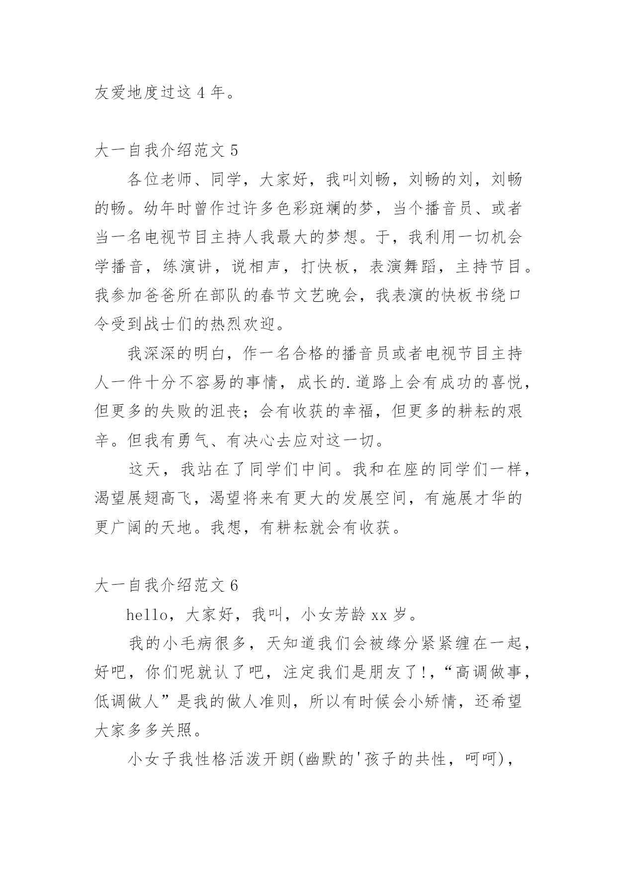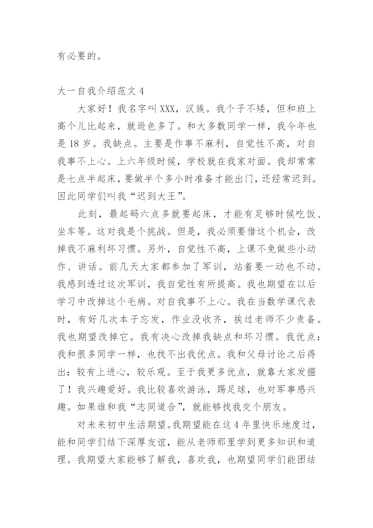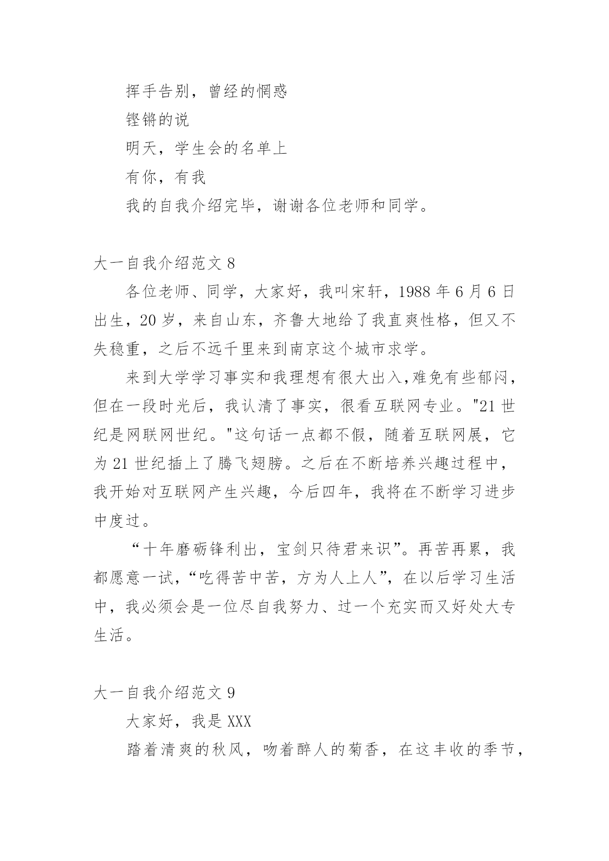 大一自我介绍大一自我介绍范文当进入一个新环境,需要我们进行自我介绍,自我介绍是一种认识自我的手段。如何编写一段个性的自我介绍?以下是小编为大家收集的大一自我介绍范文,欢迎大家分享。大一自我介绍范文1大家好!我的名字叫XXX,汉族。我的个子不矮,但和班上的高个儿比起来,就逊色多了。和大多数同学一样,我今年也18岁。我的缺点。主要作事不麻利,自觉性不高,对自我的事不上心。上六年级的时候,学校就在我家对面。我却常常七点半起床,要做半个多小时的准备才能出门,还经常迟到。因此同学们叫我“迟到大王”。此刻,最起码六点多就要起床,才能有足够的时候吃饭、坐车等。这对我个挑战。但,我必须要借这个机会,改掉我不麻利的坏习惯。另外,自觉性不高,上课不免做些小动作、讲话。前几天大家都参加了军训,站着要一动也不动。我感到透过这次军训,我的自觉性有所提高。我也期望在以后的'学习中改掉这个毛病。对自我的事不上心。我在当数学课代表时,有好几次本子忘发,作业没收齐,挨过老师不少责备。我也期望改掉它。我有决心改掉我的缺点和坏习惯。我的优点:我和很多同学一样,也找不出我的优点。我和父母讨论之后得出:较有上进心,较乐观。至于我更多的优点,就靠大家的发掘了!我的兴趣爱好。我比较喜欢游泳,踢足球,也对军事感兴趣。如果谁和我“志同道合”,就能够找我交个朋友。对未来初中生活的期望。我期望能在这4年里快乐地度过,能和同学们结下深厚的友谊,能从老师那里学到更多的知识和道理。我期望大家能够了解我,喜欢我,也期望同学们能团结友爱地度过这4年。大一自我介绍范文2怎么说呢,我是一个不太勤快的男孩,有些猫咪的慵懒。常常是把一大堆衣服积攒到一起洗,一个人的时候不会去做饭,总是找些替代的食物,虽然我做饭非常好吃。这对于一个男孩来说,算是一个比较大的缺点吧。不勤快代表着不上进,得过且过,我想没有女孩子会喜欢这样的男孩。毕竟大家还是要提高生活质量的。其实我觉得自己也算是蛮有品位的,只是兜里的钱少点儿。否则我也会选择高质量的生活,但无奈经济萧条。不过就算我有了钱也留不住,对我来说,它们留着没意义,花出去才有价值。再说了,那么多人摸过的纸,想想就恶心。所以,不买东西,坚决不装钱。我是一个非常情绪化的男孩,常常莫名其妙地喜欢某些事物。或是人,或是非人类,或是某人的某个动作、某个表情,都是会突然非常喜欢的。有时会生气,却不会去憎恨。只是敏感得像个女孩子,这样的男孩是非常容易让女孩子厌倦的'。我想自己以后的妻子一定是个“治愈系”的高手,不然是没办法与我相处的。虽然我也是个治愈系的高手,但对自己还是比较放纵。其实也不算是放纵,不过是率性而为罢了。既没有影响他人,也没有拖累社会,只是我自己有些小小的固执而已。一定要先刷牙后洗脸。房间要么不整理,要么就把所有的东西部收拾一遍。会一直喜欢一个女孩非常久非常久。会一个人没理由地去到自己喜欢的地方,尽管什么也不做。大一自我介绍范文3一般进学校几天后班主任会召开第一次班会,在会上叫我们到讲台上口头介绍一下自己,大概3分钟左右(看情况来定)。大家以后都是朋友,所以不要紧张,至于你想介绍什么,要看你的口才怎么样,如果你要简单点,就说你是哪儿的人,介绍下家乡的特产,欢迎大家到你家乡去玩,初中高中的经历,特长爱好等等;如果你要凸显个性,以求获得美女或是帅哥的青睐,就来点创意,唱首歌之类,总之就是好朋友在一起样随便聊,一般这种机会是在军训的时候哦!说实话自我介绍的时候没几个人听你的,所以你不必太在意这个。要想人家记住看你以后。。另外竞选的.事情首先要看你的口才,和人缘。刚开始的时候多和同学相处是很有必要的。大一自我介绍范文4大家好!我名字叫XXX,汉族。我个子不矮,但和班上高个儿比起来,就逊色多了。和大多数同学一样,我今年也是18岁。我缺点。主要是作事不麻利,自觉性不高,对自我事不上心。上六年级时候,学校就在我家对面。我却常常是七点半起床,要做半个多小时准备才能出门,还经常迟到。因此同学们叫我“迟到大王”。此刻,最起码六点多就要起床,才能有足够时候吃饭、坐车等。这对我是个挑战。但是,我必须要借这个机会,改掉我不麻利坏习惯。另外,自觉性不高,上课不免做些小动作、讲话。前几天大家都参加了军训,站着要一动也不动。我感到透过这次军训,我自觉性有所提高。我也期望在以后学习中改掉这个毛病。对自我事不上心。我在当数学课代表时,有好几次本子忘发,作业没收齐,挨过老师不少责备。我也期望改掉它。我有决心改掉我缺点和坏习惯。我优点:我和很多同学一样,也找不出我优点。我和父母讨论之后得出:较有上进心,较乐观。至于我更多优点,就靠大家发掘了!我兴趣爱好。我比较喜欢游泳,踢足球,也对军事感兴趣。如果谁和我“志同道合”,就能够找我交个朋友。对未来初中生活期望。我期望能在这4年里快乐地度过,能和同学们结下深