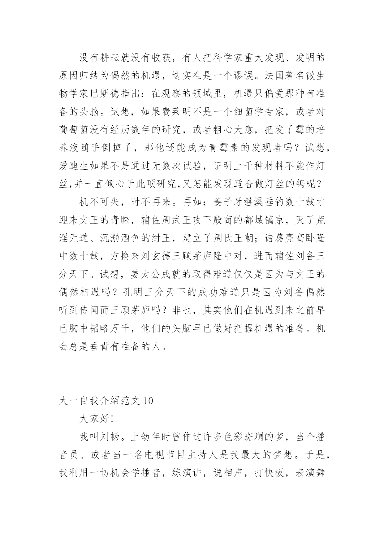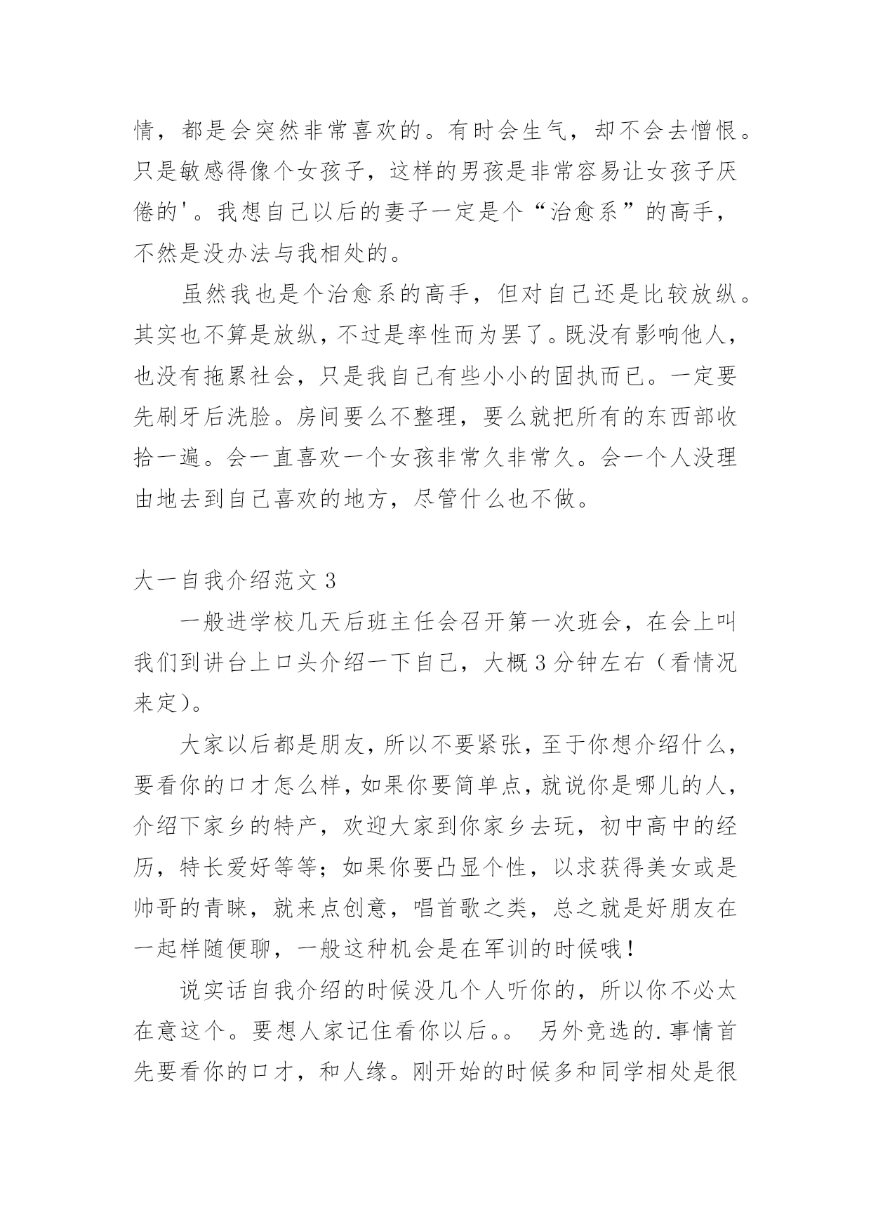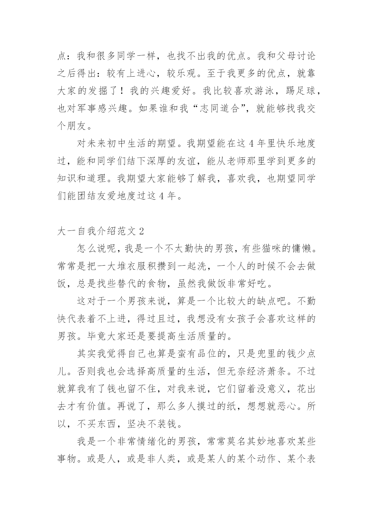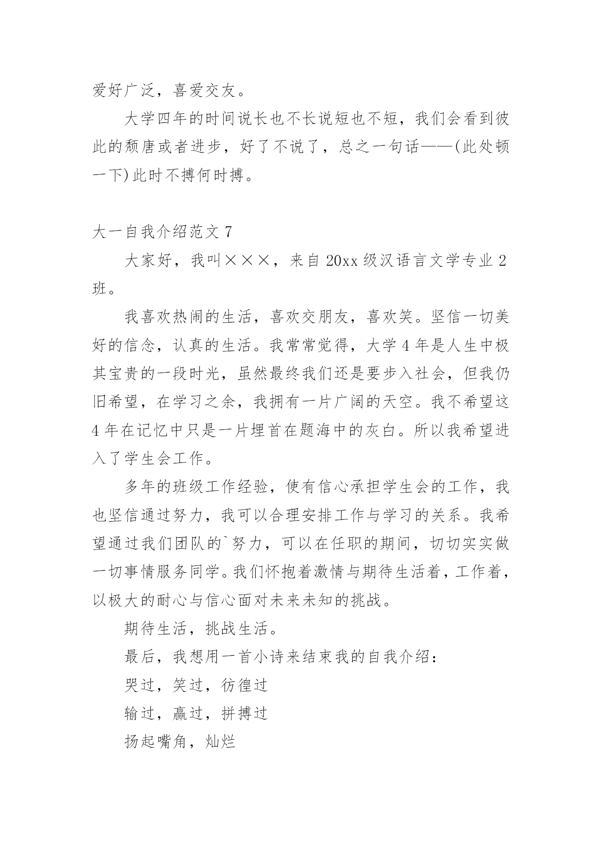 大一自我介绍大一自我介绍范文当进入一个新环境,需要我们进行自我介绍,自我介绍是一种认识自我的手段。如何编写一段个性的自我介绍?以下是小编为大家收集的大一自我介绍范文,欢迎大家分享。大一自我介绍范文1大家好!我的名字叫XXX,汉族。我的个子不矮,但和班上的高个儿比起来,就逊色多了。和大多数同学一样,我今年也18岁。我的缺点。主要作事不麻利,自觉性不高,对自我的事不上心。上六年级的时候,学校就在我家对面。我却常常七点半起床,要做半个多小时的准备才能出门,还经常迟到。因此同学们叫我“迟到大王”。此刻,最起码六点多就要起床,才能有足够的时候吃饭、坐车等。这对我个挑战。但,我必须要借这个机会,改掉我不麻利的坏习惯。另外,自觉性不高,上课不免做些小动作、讲话。前几天大家都参加了军训,站着要一动也不动。我感到透过这次军训,我的自觉性有所提高。我也期望在以后的'学习中改掉这个毛病。对自我的事不上心。我在当数学课代表时,有好几次本子忘发,作业没收齐,挨过老师不少责备。我也期望改掉它。我有决心改掉我的缺点和坏习惯。我的优点:我和很多同学一样,也找不出我的优点。我和父母讨论之后得出:较有上进心,较乐观。至于我更多的优点,就靠大家的发掘了!我的兴趣爱好。我比较喜欢游泳,踢足球,也对军事感兴趣。如果谁和我“志同道合”,就能够找我交个朋友。对未来初中生活的期望。我期望能在这4年里快乐地度过,能和同学们结下深厚的友谊,能从老师那里学到更多的知识和道理。我期望大家能够了解我,喜欢我,也期望同学们能团结友爱地度过这4年。大一自我介绍范文2怎么说呢,我是一个不太勤快的男孩,有些猫咪的慵懒。常常是把一大堆衣服积攒到一起洗,一个人的时候不会去做饭,总是找些替代的食物,虽然我做饭非常好吃。这对于一个男孩来说,算是一个比较大的缺点吧。不勤快代表着不上进,得过且过,我想没有女孩子会喜欢这样的男孩。毕竟大家还是要提高生活质量的。其实我觉得自己也算是蛮有品位的,只是兜里的钱少点儿。否则我也会选择高质量的生活,但无奈经济萧条。不过就算我有了钱也留不住,对我来说,它们留着没意义,花出去才有价值。再说了,那么多人摸过的纸,想想就恶心。所以,不买东西,坚决不装钱。我是一个非常情绪化的男孩,常常莫名其妙地喜欢某些事物。或是人,或是非人类,或是某人的某个动作、某个表情,都是会突然非常喜欢的。有时会生气,却不会去憎恨。只是敏感得像个女孩子,这样的男孩是非常容易让女孩子厌倦的'。我想自己以后的妻子一定是个“治愈系”的高手,不然是没办法与我相处的。虽然我也是个治愈系的高手,但对自己还是比较放纵。其实也不算是放纵,不过是率性而为罢了。既没有影响他人,也没有拖累社会,只是我自己有些小小的固执而已。一定要先刷牙后洗脸。房间要么不整理,要么就把所有的东西部收拾一遍。会一直喜欢一个女孩非常久非常久。会一个人没理由地去到自己喜欢的地方,尽管什么也不做。大一自我介绍范文3一般进学校几天后班主任会召开第一次班会,在会上叫我们到讲台上口头介绍一下自己,大概3分钟左右(看情况来定)。大家以后都是朋友,所以不要紧张,至于你想介绍什么,要看你的口才怎么样,如果你要简单点,就说你是哪儿的人,介绍下家乡的特产,欢迎大家到你家乡去玩,初中高中的经历,特长爱好等等;如果你要凸显个性,以求获得美女或是帅哥的青睐,就来点创意,唱首歌之类,总之就是好朋友在一起样随便聊,一般这种机会是在军训的时候哦!说实话自我介绍的时候没几个人听你的,所以你不必太在意这个。要想人家记住看你以后。。另外竞选的.事情首先要看你的口才,和人缘。刚开始的时候多和同学相处是很有必要的。大一自我介绍范文4大家好!我名字叫XXX,汉族。我个子不矮,但和班上高个儿比起来,就逊色多了。和大多数同学一样,我今年也是18岁。我缺点。主要是作事不麻利,自觉性不高,对自我事不上心。上六年级时候,学校就在我家对面。我却常常是七点半起床,要做半个多小时准备才能出门,还经常迟到。因此同学们叫我“迟到大王”。此刻,最起码六点多就要起床,才能有足够时候吃饭、坐车等。这对我是个挑战。但是,我必须要借这个机会,改掉我不麻利坏习惯。另外,自觉性不高,上课不免做些小动作、讲话。前几天大家都参加了军训,站着要一动也不动。我感到透过这次军训,我自觉性有所提高。我也期望在以后学习中改掉这个毛病。对自我事不上心。我在当数学课代表时,有好几次本子忘发,作业没收齐,挨过老师不少责备。我也期望改掉它。我有决心改掉我缺点和坏习惯。我优点:我和很多同学一样,也找不出我优点。我和父母讨论之后得出:较有上进心,较乐观。至于我更多优点,就靠大家发掘了!我兴趣爱好。我比较喜欢游泳,踢足球,也对军事感兴趣。如果谁和我“志同道合”,就能够找我交个朋友。对未来初中生活期望。我期望能在这4年里快乐地度过,能和同学们结下深