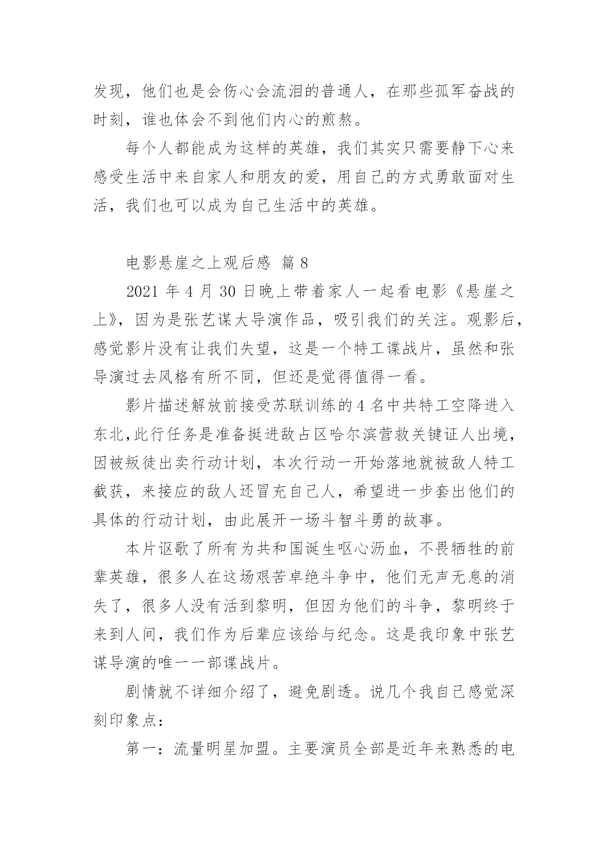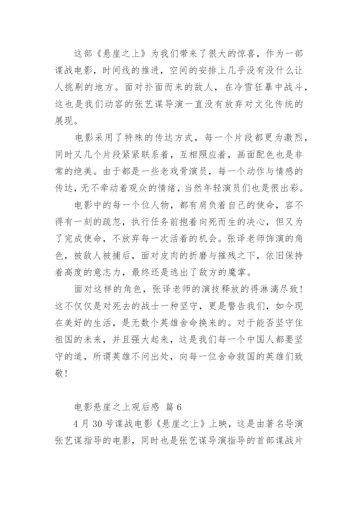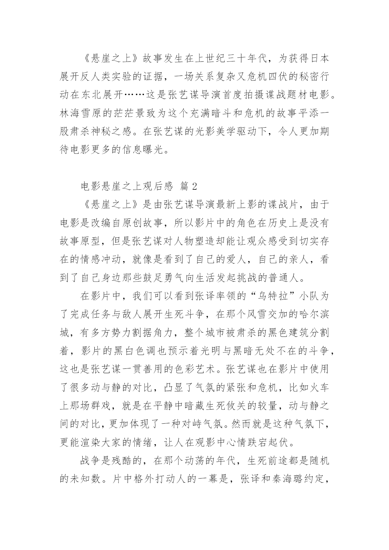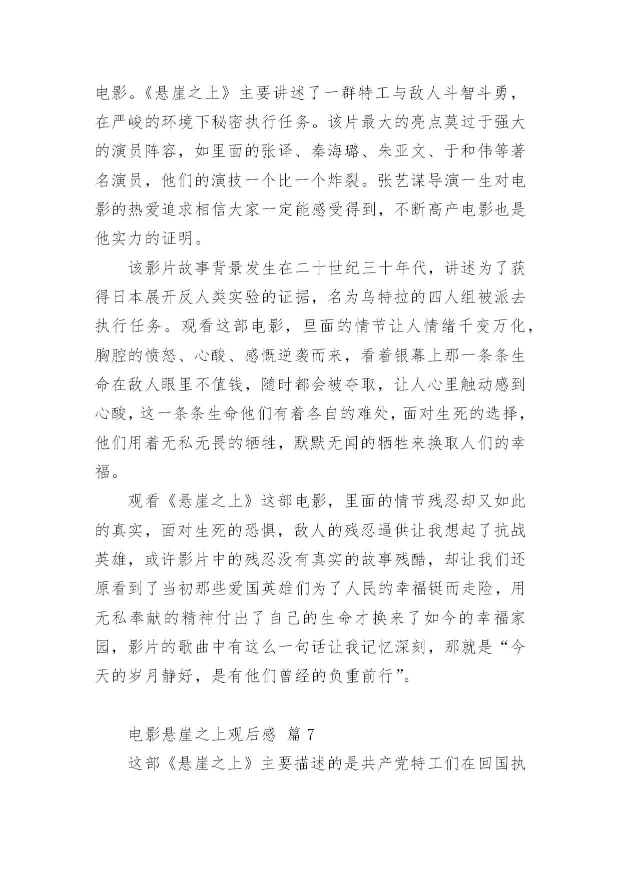 电影悬崖之上观后感电影悬崖之上观后感(精选21篇)在看完一部作品以后,大家一定收获不少吧,现在就让我们写一篇走心的观后感吧。想必许多人都在为如何写好观后感而烦恼吧,以下是小编为大家整理的电影悬崖之上观后感,希望对大家有所帮助。电影悬崖之上观后感篇1《悬崖之上》是全勇先和导演张艺谋的首次合作,电影在东北雪乡官宣开机之时,网友便对电影的故事产生了极大好奇。作为一名“资深谍战片编剧”,全勇先此前已有许多优秀作品面世,此次现身金爵论坛,让人格外期待他的“爆料”。谈到谍战类型,全勇先表示“我写谍战戏最关注的是人,人物是最有魅力的。”全勇先常常把人物关系放在谍战氛围里去表现,他特别提到,把人写好才能更好地打动观众:“如果观众对这个人物建立了兴趣,建立了情感,这个人物的一举一动,一言一行所有行为都会牵动观众的情绪。这对我来说是一个法宝。”《悬崖之上》对人物的描绘是电影的一大看点,也是创作的难点。全勇先提到,《悬崖之上》和普通的谍战片还有一些区别,除了敌我阵营的明暗交锋,电影对人的复杂性、人在极端情况下的反应、绝境之中的遭遇等都有较深的刻画。而且电影中人物较多,这也无疑为剧本创作增加了难度。《悬崖之上》故事发生在上世纪三十年代,为获得日本展开反人类实验的证据,一场关系复杂又危机四伏的秘密行动在东北展开……这是张艺谋导演首度拍摄谍战题材电影。林海雪原的茫茫景致为这个充满暗斗和危机的故事平添一股肃杀神秘之感。在张艺谋的光影美学驱动下,令人更加期待电影更多的信息曝光。电影悬崖之上观后感篇2《悬崖之上》是由张艺谋导演最新上影的谍战片,由于电影是改编自原创故事,所以影片中的角色在历史上是没有故事原型,但是张艺谋对人物塑造却能让观众感受到切实存在的情感冲动,就像是看到了自己的爱人,自己的亲人,看到了自己身边那些鼓足勇气向生活发起挑战的普通人。在影片中,我们可以看到张译率领的“乌特拉”小队为了完成任务与敌人展开生死斗争,在那个风雪交加的哈尔滨城,有多方势力割据角力,整个城市被肃杀的黑色建筑分割着,影片的黑白色调也预示着光明与黑暗无处不在的斗争,这也是张艺谋一贯善用的色彩艺术。张艺谋也在影片中使用了很多动与静的对比,凸显了气氛的紧张和危机,比如火车上那场群戏,就是在平静中暗藏生死攸关的较量,动与静之间的对比,更加体现了一种对峙气氛。然而就是这种气氛下,更能渲染大家的情绪,让人在观影中心情跌宕起伏。战争是残酷的,在那个动荡的年代,生死前途都是随机的未知数。片中格外打动人的一幕是,张译和秦海璐约定,“活下来的去找孩子”。父母对孩子的牵挂体现出真实到让人心痛的悲情,虽然经过苏联特训的间谍,他们会压抑住本能的情感,秦海璐直到最后一刻才爆发出的眼泪,让我突然发现,他们也是会伤心会流泪的普通人,在那些孤军奋战的时刻,谁也体会不到他们内心的煎熬。《悬崖之上》与其他谍战片的区别在于,张艺谋把角色的心理揣度到了极致,看向孩子的眼神,躲在厕所里无声的哭泣,走向敌人时的决绝,是那个年代真实的情感,是残酷的事实。每个年代都有这样的无名英雄,我们其实只需要静下心来感受生活中来自家人和朋友的爱,用自己的方式勇敢面对生活,我们也可以成为自己生活中的英雄。电影悬崖之上观后感篇3自从电影的出现,人们枯燥的生活变得丰富多彩,好看的电影总能给观众留下非常深刻的印象。除此之外,有意义的电影更是能让人懂得反省以及思考,而这也是电影最有价值的展现。近期上映了一部电影,名为《悬崖之上》,光听名字相信已经吸引了不少人的眼球,这部影片确实也是一部有价值的电影。在观看了该部电影后,让我内心深有感触,从而感慨良多。《悬崖之上》,这部谍战大片其实就是华语电影的年度期待,定档与五一。该片是由张艺谋执导,张译、于和伟、秦海璐、朱亚文、刘浩存、倪大红、李乃文领衔主演,余皑磊、飞凡主演,雷佳音、沙溢特邀主演的谍战电影。其主要讲述的特工们在严峻考验下与敌人斗智斗勇,执行秘密行动的故事。剧情惊心动魄,观众们看的过程亦是胆战心惊,但又很刺激,整部影片给我们呈现出来的是暗流涌动、善恶分界等的理念,让人思索颇深及感慨万千,此部电影的意义非同一般,很有观赏的体验价值。《悬崖之上》电影里面的角色众多,观看的过程中,细心的我们会发现,张艺谋依然尽量充实着人物的弧光,细节真实,情感真实,逻辑真实。除此之外,电影中的每一幕都是揪心的,每一个人物身上都肩负着自己的使命,容不得有一刻的疏忽,执行任务前抱着必死的决心,但为了完成使命不放弃每个可以活下去的希望。所以在观看完整部电影后,我们也都会有一番深思和感触,这部电影不仅有商业片的魅力,同时影片的立意也绝对适合每一位中国人,让我们感叹和平来之不易,因而我们要珍惜和感恩,不能忘记为我们抛头颅洒过热血的前辈们,向他们致敬,好好珍惜当下,努力向上,向榜样前辈学习,做有价值的人,这样我们的人生也才会