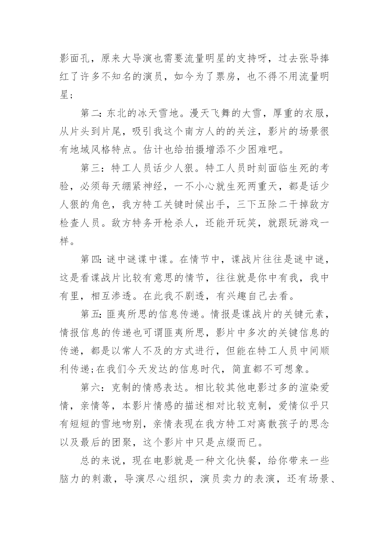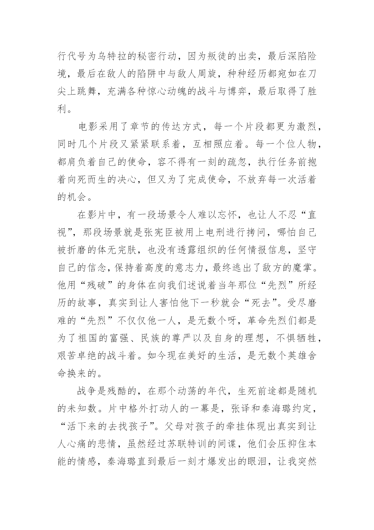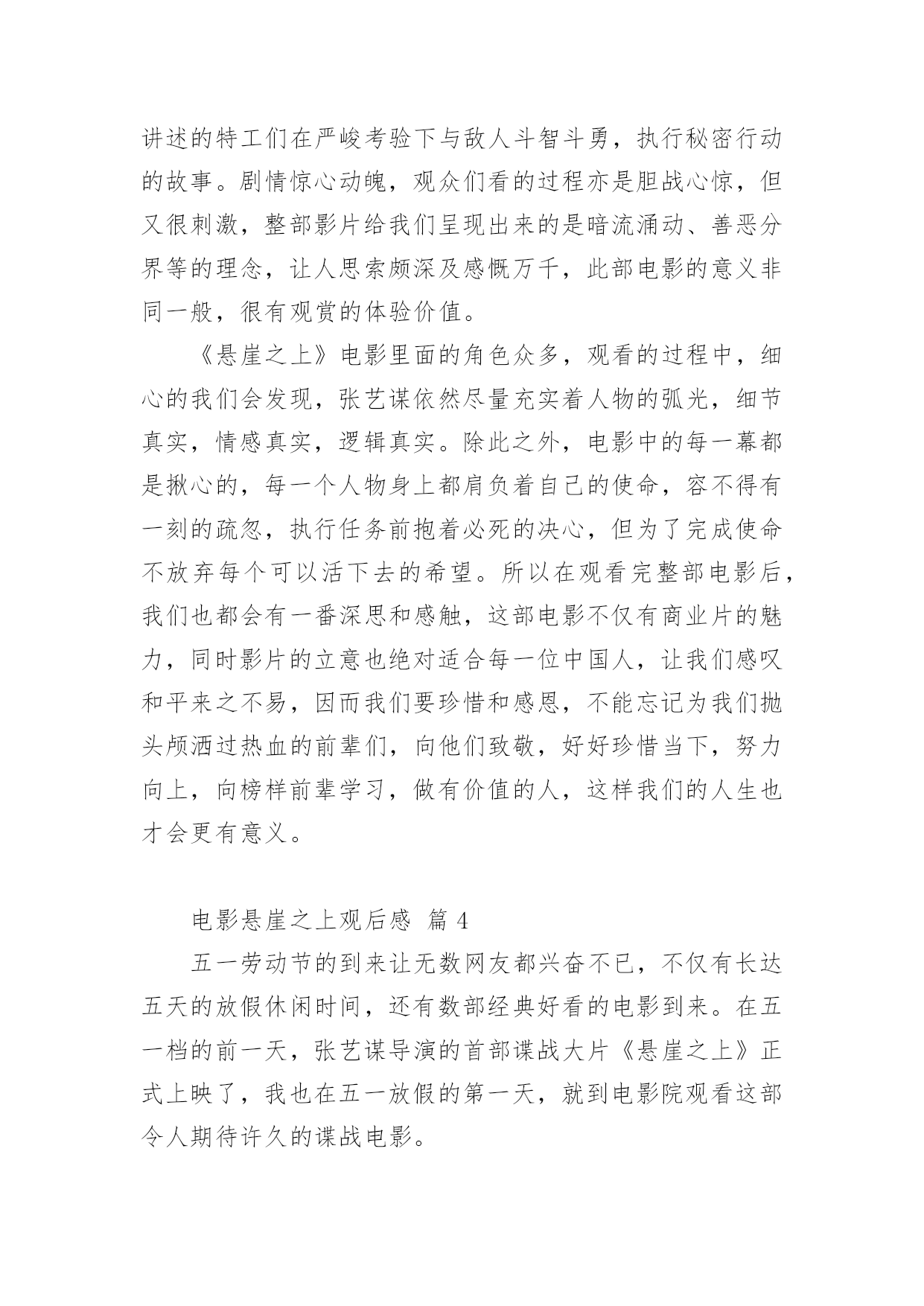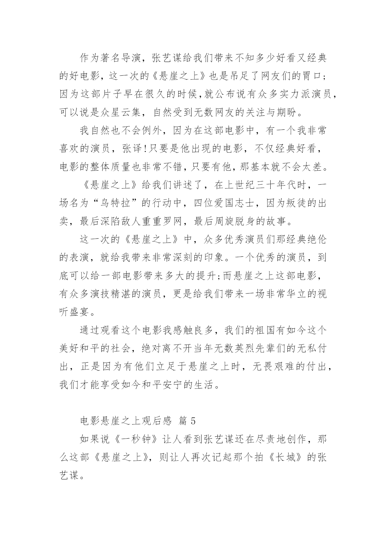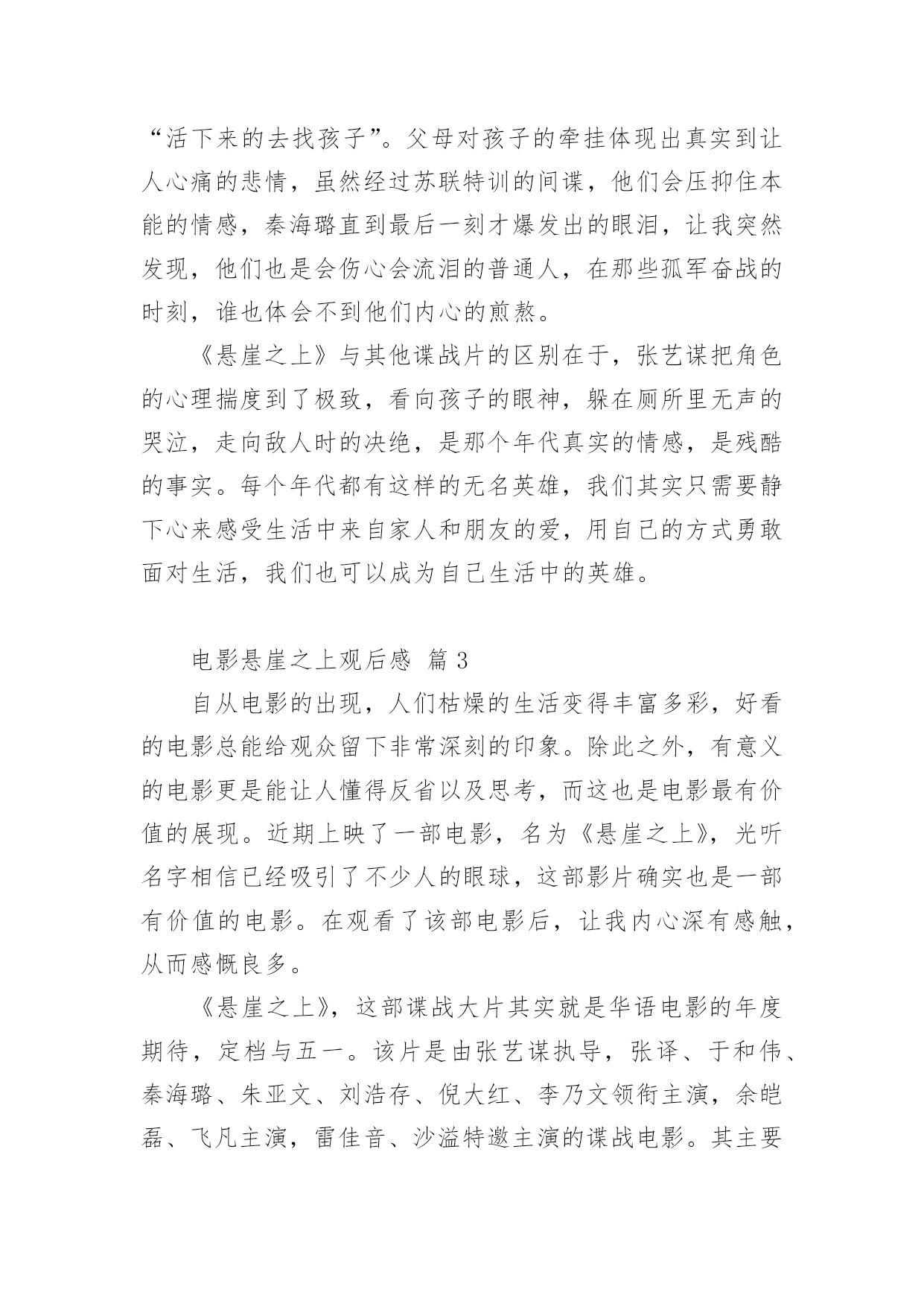 电影悬崖之上观后感电影悬崖之上观后感(精选21篇)在看完一部作品以后,大家一定收获不少吧,现在就让我们写一篇走心的观后感吧。想必许多人都在为如何写好观后感而烦恼吧,以下是小编为大家整理的电影悬崖之上观后感,希望对大家有所帮助。电影悬崖之上观后感篇1《悬崖之上》是全勇先和导演张艺谋的首次合作,电影在东北雪乡官宣开机之时,网友便对电影的故事产生了极大好奇。作为一名“资深谍战片编剧”,全勇先此前已有许多优秀作品面世,此次现身金爵论坛,让人格外期待他的“爆料”。谈到谍战类型,全勇先表示“我写谍战戏最关注的是人,人物是最有魅力的。”全勇先常常把人物关系放在谍战氛围里去表现,他特别提到,把人写好才能更好地打动观众:“如果观众对这个人物建立了兴趣,建立了情感,这个人物的一举一动,一言一行所有行为都会牵动观众的情绪。这对我来说是一个法宝。”《悬崖之上》对人物的描绘是电影的一大看点,也是创作的难点。全勇先提到,《悬崖之上》和普通的谍战片还有一些区别,除了敌我阵营的明暗交锋,电影对人的复杂性、人在极端情况下的反应、绝境之中的遭遇等都有较深的刻画。而且电影中人物较多,这也无疑为剧本创作增加了难度。《悬崖之上》故事发生在上世纪三十年代,为获得日本展开反人类实验的证据,一场关系复杂又危机四伏的秘密行动在东北展开……这是张艺谋导演首度拍摄谍战题材电影。林海雪原的茫茫景致为这个充满暗斗和危机的故事平添一股肃杀神秘之感。在张艺谋的光影美学驱动下,令人更加期待电影更多的信息曝光。电影悬崖之上观后感篇2《悬崖之上》是由张艺谋导演最新上影的谍战片,由于电影是改编自原创故事,所以影片中的角色在历史上是没有故事原型,但是张艺谋对人物塑造却能让观众感受到切实存在的情感冲动,就像是看到了自己的爱人,自己的亲人,看到了自己身边那些鼓足勇气向生活发起挑战的普通人。在影片中,我们可以看到张译率领的“乌特拉”小队为了完成任务与敌人展开生死斗争,在那个风雪交加的哈尔滨城,有多方势力割据角力,整个城市被肃杀的黑色建筑分割着,影片的黑白色调也预示着光明与黑暗无处不在的斗争,这也是张艺谋一贯善用的色彩艺术。张艺谋也在影片中使用了很多动与静的对比,凸显了气氛的紧张和危机,比如火车上那场群戏,就是在平静中暗藏生死攸关的较量,动与静之间的对比,更加体现了一种对峙气氛。然而就是这种气氛下,更能渲染大家的情绪,让人在观影中心情跌宕起伏。战争是残酷的,在那个动荡的年代,生死前途都是随机的未知数。片中格外打动人的一幕是,张译和秦海璐约定,“活下来的去找孩子”。父母对孩子的牵挂体现出真实到让人心痛的悲情,虽然经过苏联特训的间谍,他们会压抑住本能的情感,秦海璐直到最后一刻才爆发出的眼泪,让我突然发现,他们也是会伤心会流泪的普通人,在那些孤军奋战的时刻,谁也体会不到他们内心的煎熬。《悬崖之上》与其他谍战片的区别在于,张艺谋把角色的心理揣度到了极致,看向孩子的眼神,躲在厕所里无声的哭泣,走向敌人时的决绝,是那个年代真实的情感,是残酷的事实。每个年代都有这样的无名英雄,我们其实只需要静下心来感受生活中来自家人和朋友的爱,用自己的方式勇敢面对生活,我们也可以成为自己生活中的英雄。电影悬崖之上观后感篇3自从电影的出现,人们枯燥的生活变得丰富多彩,好看的电影总能给观众留下非常深刻的印象。除此之外,有意义的电影更是能让人懂得反省以及思考,而这也是电影最有价值的展现。近期上映了一部电影,名为《悬崖之上》,光听名字相信已经吸引了不少人的眼球,这部影片确实也是一部有价值的电影。在观看了该部电影后,让我内心深有感触,从而感慨良多。《悬崖之上》,这部谍战大片其实就是华语电影的年度期待,定档与五一。该片是由张艺谋执导,张译、于和伟、秦海璐、朱亚文、刘浩存、倪大红、李乃文领衔主演,余皑磊、飞凡主演,雷佳音、沙溢特邀主演的谍战电影。其主要讲述的特工们在严峻考验下与敌人斗智斗勇,执行秘密行动的故事。剧情惊心动魄,观众们看的过程亦是胆战心惊,但又很刺激,整部影片给我们呈现出来的是暗流涌动、善恶分界等的理念,让人思索颇深及感慨万千,此部电影的意义非同一般,很有观赏的体验价值。《悬崖之上》电影里面的角色众多,观看的过程中,细心的我们会发现,张艺谋依然尽量充实着人物的弧光,细节真实,情感真实,逻辑真实。除此之外,电影中的每一幕都是揪心的,每一个人物身上都肩负着自己的使命,容不得有一刻的疏忽,执行任务前抱着必死的决心,但为了完成使命不放弃每个可以活下去的希望。所以在观看完整部电影后,我们也都会有一番深思和感触,这部电影不仅有商业片的魅力,同时影片的立意也绝对适合每一位中国人,让我们感叹和平来之不易,因而我们要珍惜和感恩,不能忘记为我们抛头颅洒过热血的前辈们,向他们致敬,好好珍惜当下,努力向上,向榜样前辈学习,做有价值的人,这样我们的人生也才会