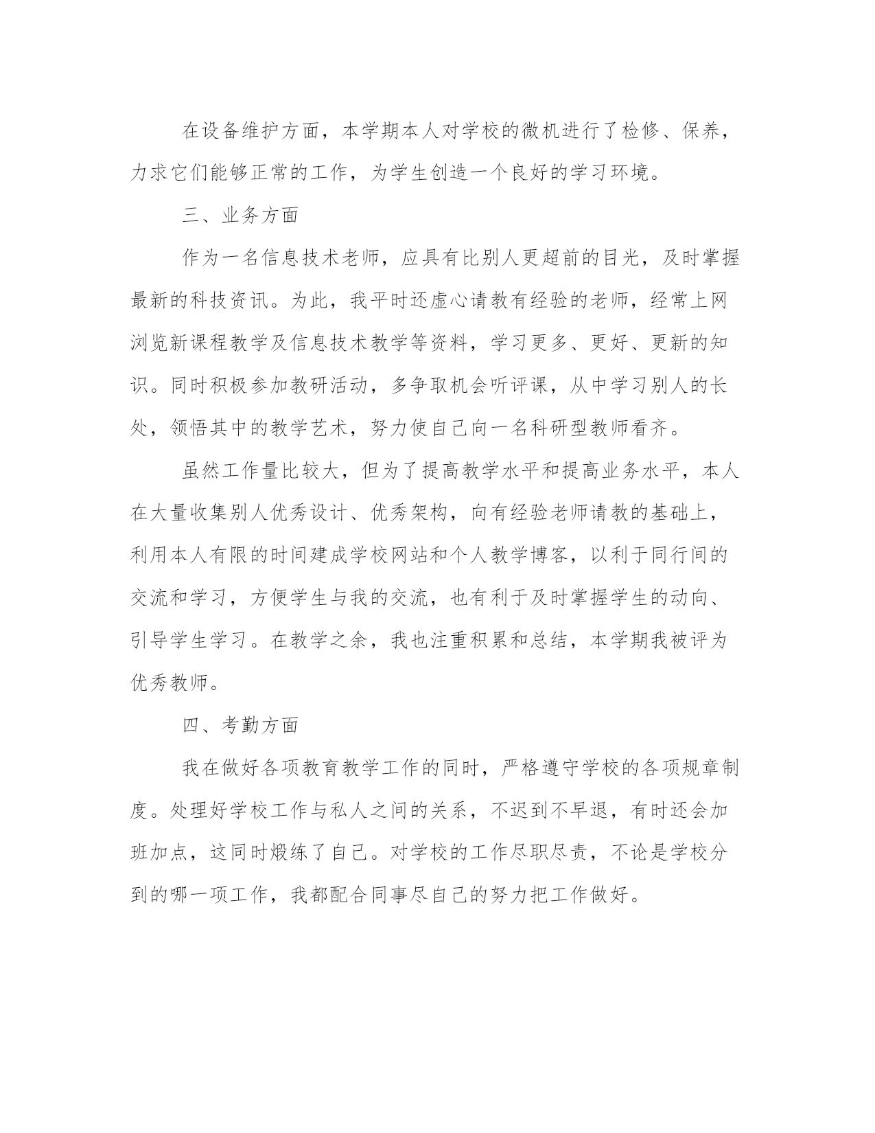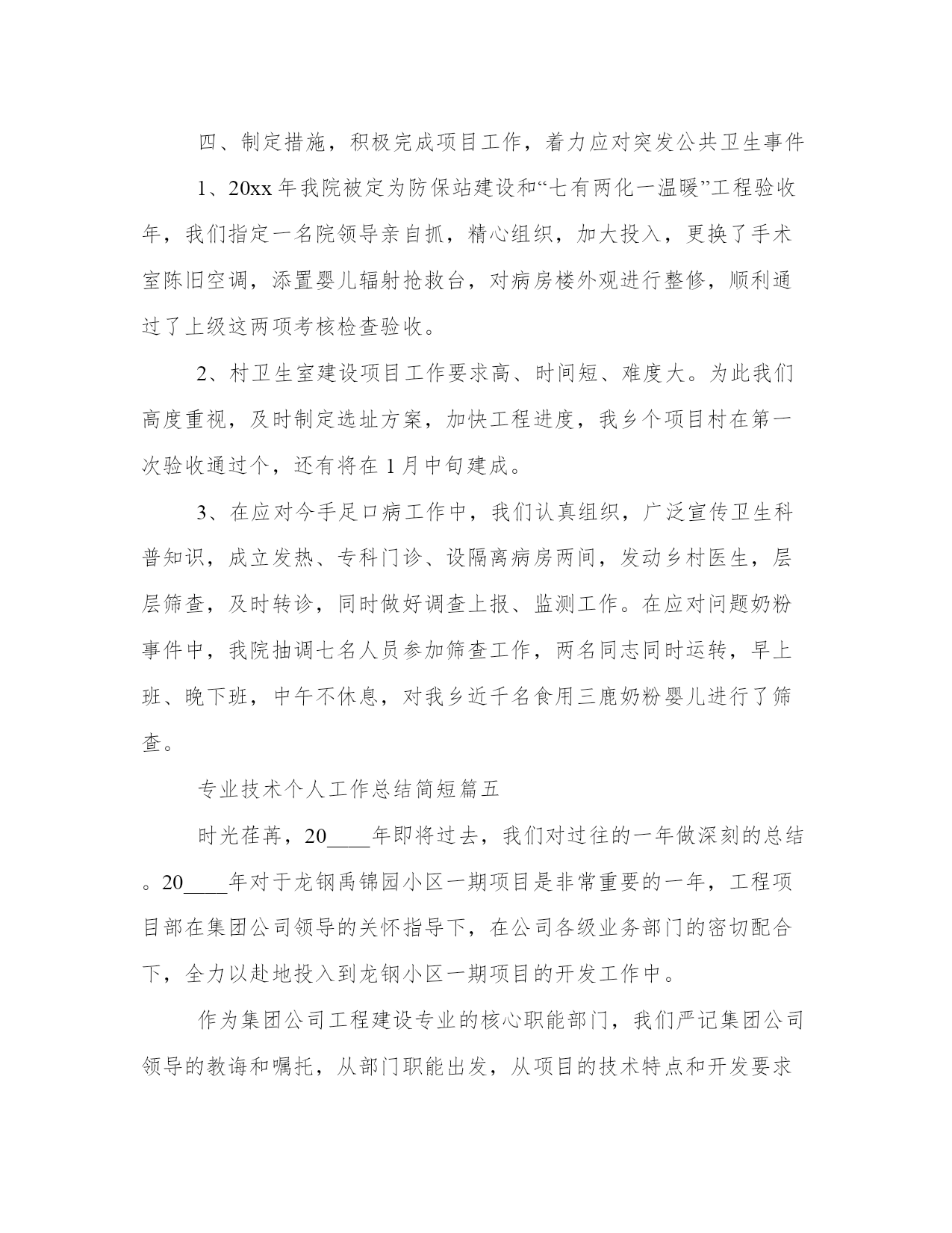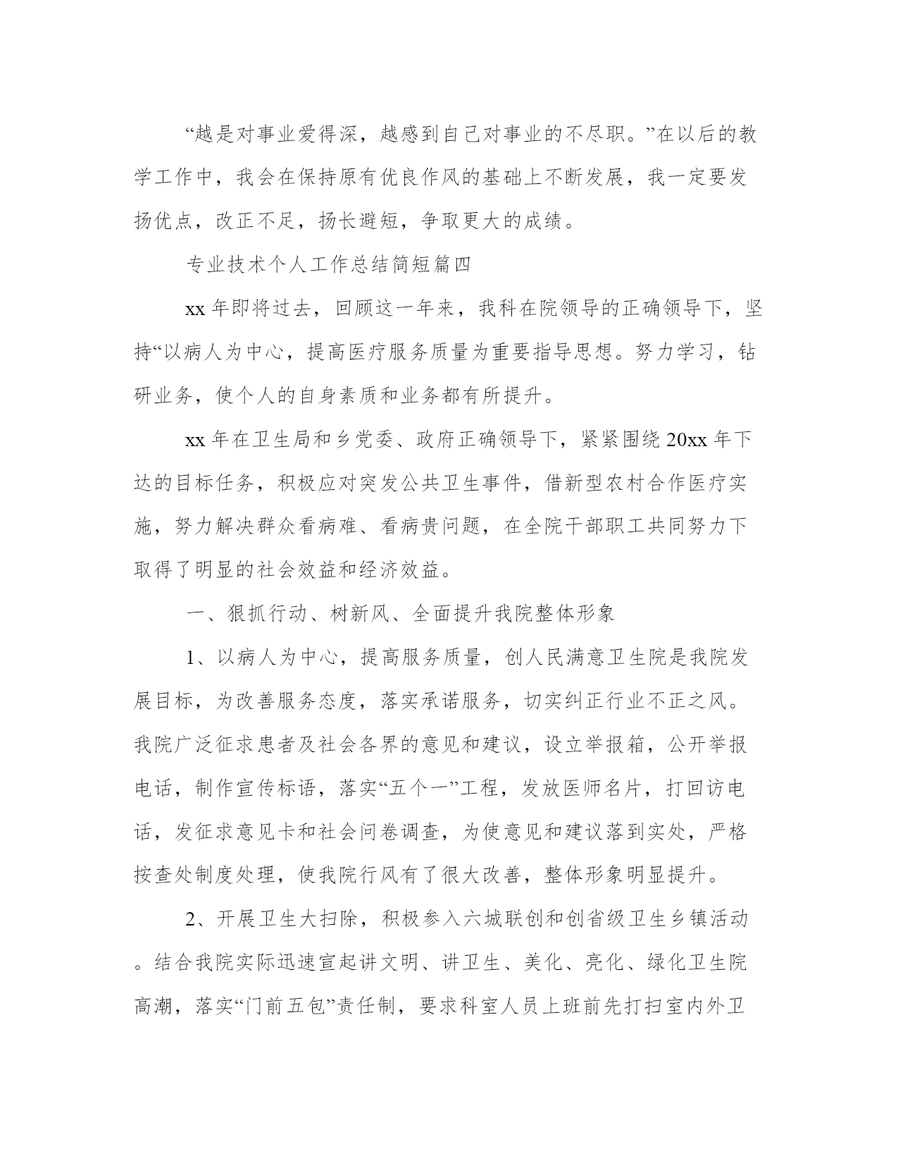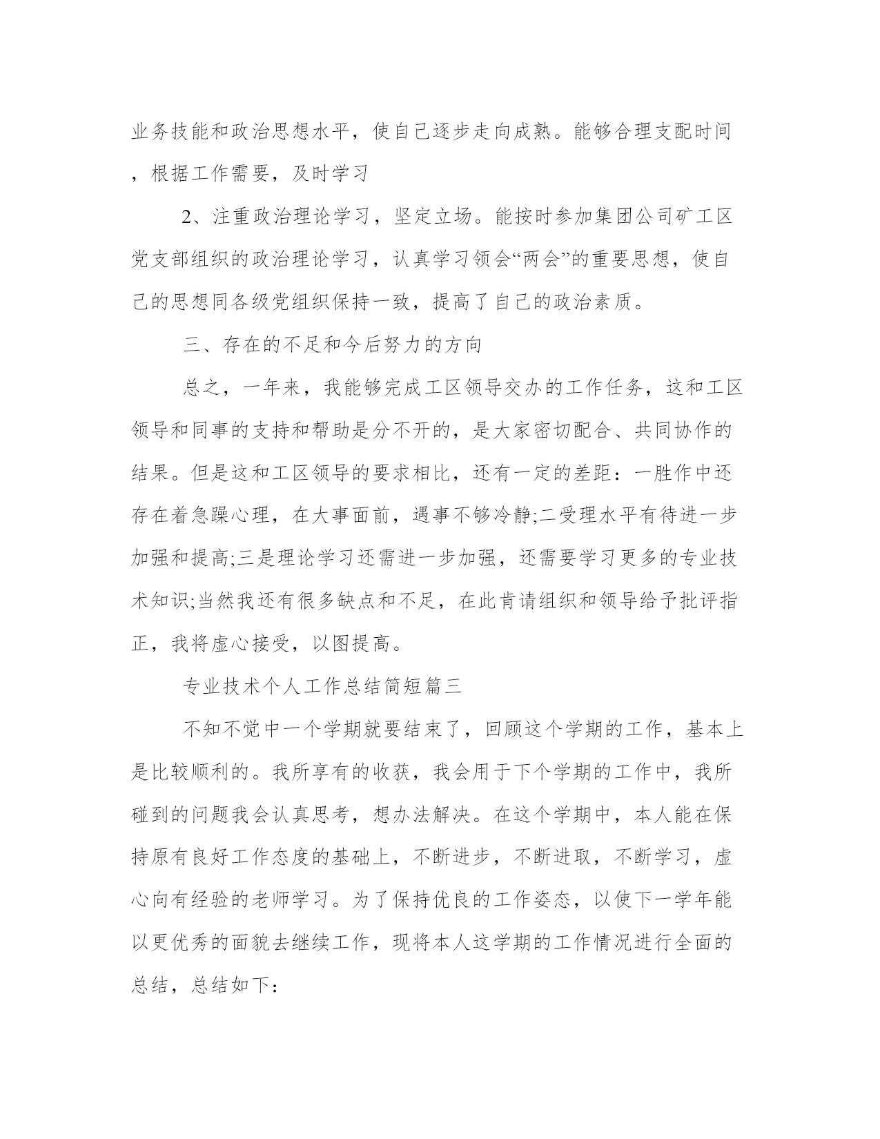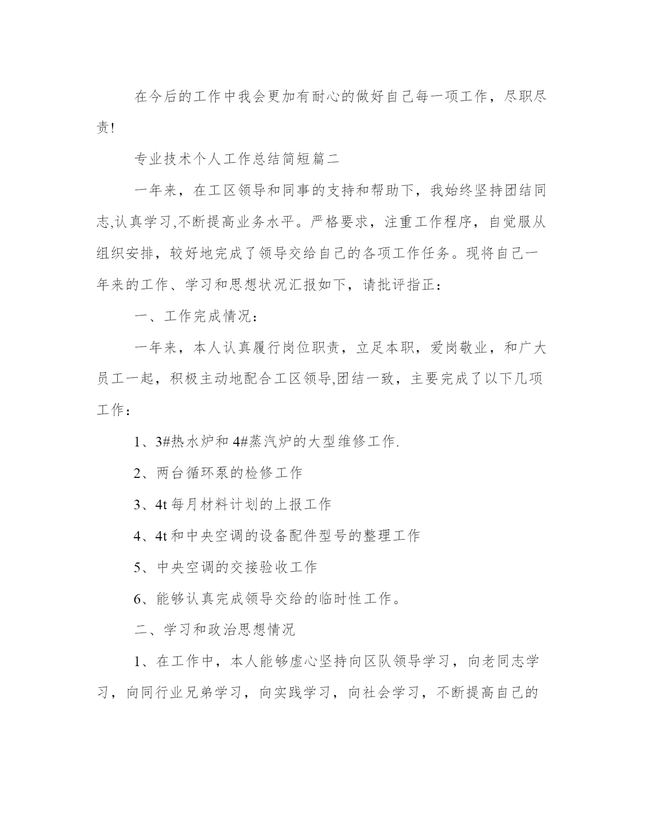 2024年专业技术个人工作总结简短(11篇)总结是对过去一定时期的工作、学习或思想情况进行回顾、分析,并做出客观评价的书面材料,它可使零星的、肤浅的、表面的感性认知上升到全面的、系统的、本质的理性认识上来,让我们一起认真地写一份总结吧。那么我们该如何写一篇较为完美的总结呢?下面是我给大家整理的总结范文,欢迎大家阅读分享借鉴,希望对大家能够有所帮助。专业技术个人工作总结简短篇一一、思想方面:在本月中我认真遵守执行幼儿园的各项规章制度,全心全意搞好教学,让孩子们学到更多,让自己的生活更加充实并认真学习让自己做一名好教师。二、教学经验1、坚持每天单训:这是每天必须认真做好的一项,在单训时首先先让孩子把47个拼音及16个整体认读音节熟记一遍,并且及时纠正孩子的发音,然后因人而异进行单训。通过本月的教学使孩子们学到了很多,所以在今后的教学中一定要做到心中有数,对每个孩子负责。2、教学整合:本月通过教学整合让孩子们在课堂上更有气氛,并且孩子们接受的内容也多样化了,这样让孩子们在体智德美各方面得到更全面的发展。三、培训内容通过本月的学习,了解到一些关于听障儿童在听觉、言语方面的学习方法,这些方法使我在课堂中更注意到一些教学方式。通过学习和应用,让孩子们在听觉或言语方面都有了改进。四、值班工作在值班的期间首先我把孩子们的安全问题放在第一位,认真做好每一项工作,对每个孩子负责,并且和生活老师合作让孩子谬好他们的每一天。还有让孩子们养成良好的生活习惯,锻炼孩子们的自立能力。五、家园沟通孩子的成长离不开老师和家长的沟通,每天主动亲切地与家长沟通。充分利用放学的时间跟家长交流,使家长了解自己孩子在园的情况。并且及时向家长反映幼儿在幼儿园的情况表现,及时取得家长的配合。在与家长沟通时对待特殊情况要冷静、有条理地进行交流,对家长的建议虚心听取。六、存在问题和努力方向在教学方面还需注重自己的教学方式,让孩子们在理解方面有所提高。还要和家长加强交流沟通,争取得到家长更多的支持和配合。在今后的工作中我会更加有耐心的做好自己每一项工作,尽职尽责!专业技术个人工作总结简短篇二一年来,在工区领导和同事的支持和帮助下,我始终坚持团结同志,认真学习,不断提高业务水平。严格要求,注重工作程序,自觉服从组织安排,较好地完成了领导交给自己的各项工作任务。现将自己一年来的工作、学习和思想状况汇报如下,请批评指正:一、工作完成情况:一年来,本人认真履行岗位职责,立足本职,爱岗敬业,和广大员工一起,积极主动地配合工区领导,团结一致,主要完成了以下几项工作:1、3#热水炉和4#蒸汽炉的大型维修工作.2、两台循环泵的检修工作3、4t每月材料计划的上报工作4、4t和中央空调的设备配件型号的整理工作5、中央空调的交接验收工作6、能够认真完成领导交给的临时性工作。二、学习和政治思想情况1、在工作中,本人能够虚心坚持向区队领导学习,向老同志学习,向同行业兄弟学习,向实践学习,向社会学习,不断提高自己的业务技能和政治思想水平,使自己逐步走向成熟。能够合理支配时间,根据工作需要,及时学习2、注重政治理论学习,坚定立场。能按时参加集团公司矿工区党支部组织的政治理论学习,认真学习领会“两会”的重要思想,使自己的思想同各级党组织保持一致,提高了自己的政治素质。三、存在的不足和今后努力的方向总之,一年来,我能够完成工区领导交办的工作任务,这和工区领导和同事的支持和帮助是分不开的,是大家密切配合、共同协作的结果。但是这和工区领导的要求相比,还有一定的差距:一胜作中还存在着急躁心理,在大事面前,遇事不够冷静;二受理水平有待进一步加强和提高;三是理论学习还需进一步加强,还需要学习更多的专业技术知识;当然我还有很多缺点和不足,在此肯请组织和领导给予批评指正,我将虚心接受,以图提高。专业技术个人工作总结简短篇三不知不觉中一个学期就要结束了,回顾这个学期的工作,基本上是比较顺利的。我所享有的收获,我会用于下个学期的工作中,我所碰到的问题我会认真思考,想办法解决。在这个学期中,本人能在保持原有良好工作态度的基础上,不断进步,不断进取,不断学习,虚心向有经验的老师学习。为了保持优良的工作姿态,以使下一学年能以更优秀的面貌去继续工作,现将本人这学期的工作情况进行全面的总结,总结如下:一、思想方面在这学期里,我从思想上,利用师德师风教育活动端正自己;从行动上学电脑技术,学教学技能等;在生活上注意形象,为人师表。一学期来,我积极参加政治学习,努力提高自身的思想觉悟,服从学校的工作安排,默默无闻地配合领导和老师们做好校内外的各项工作,得到了领导和同事的肯定。这些肯定使我在以后的工作中变得更有信心、有动力去做好每一样工作。二、工作方面这学期主要的工作主要包