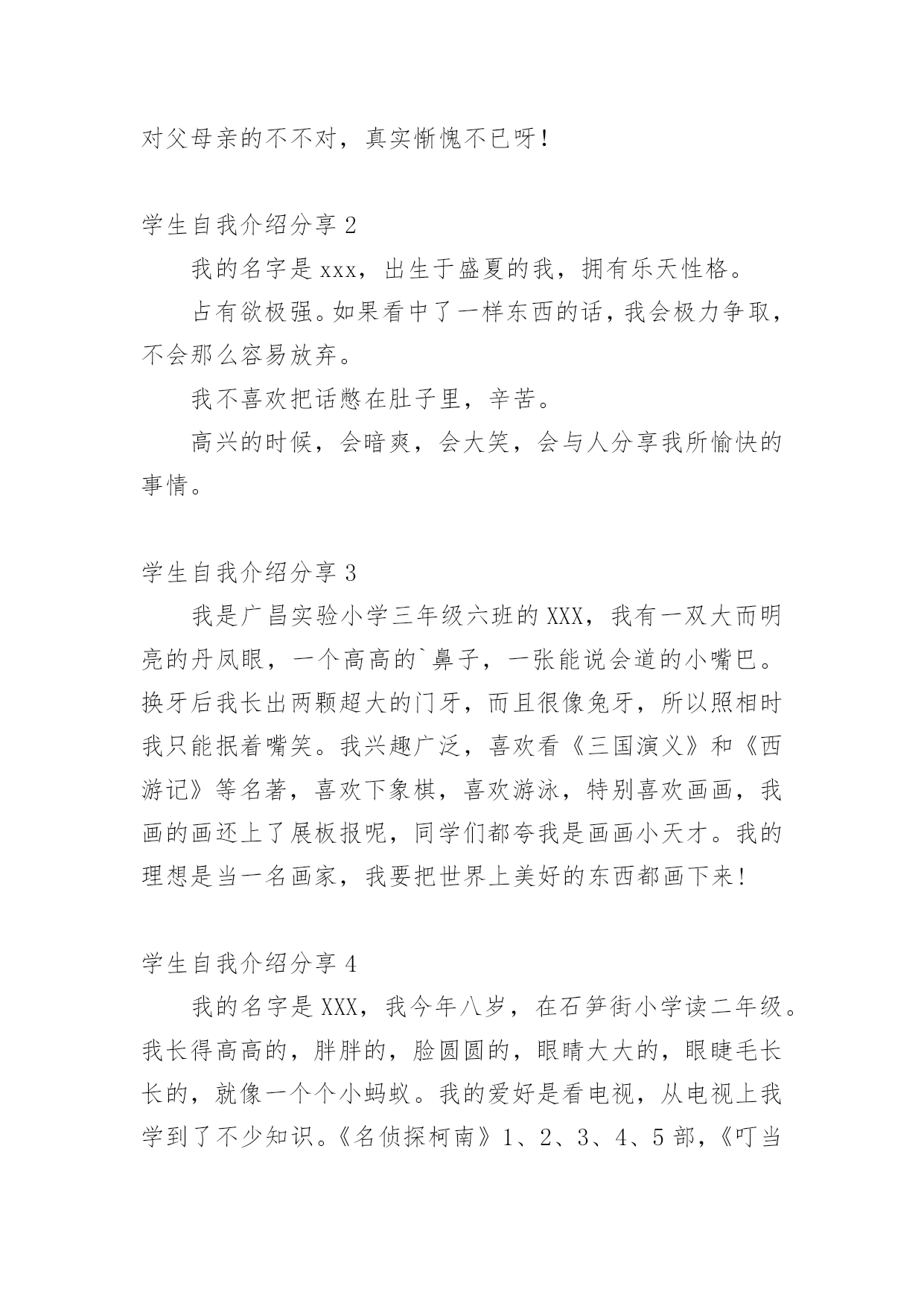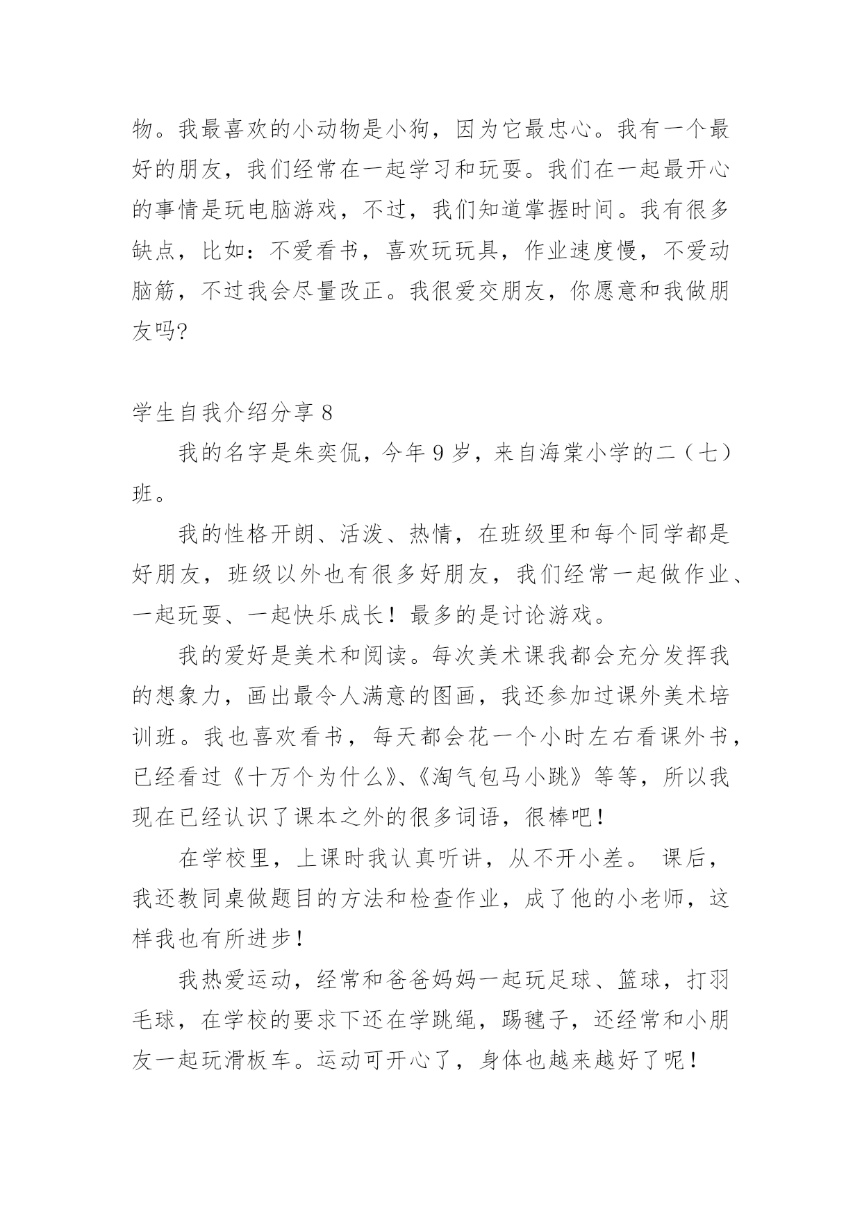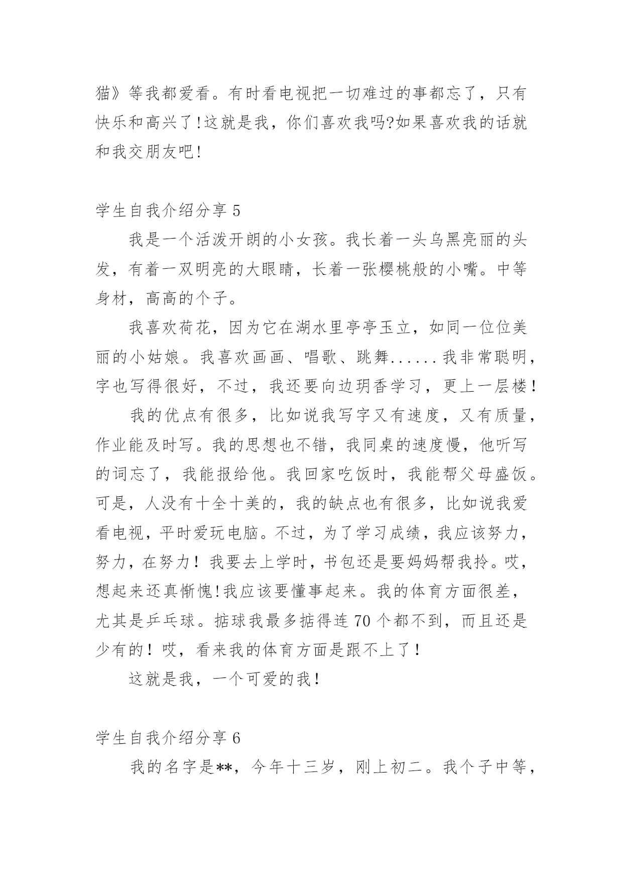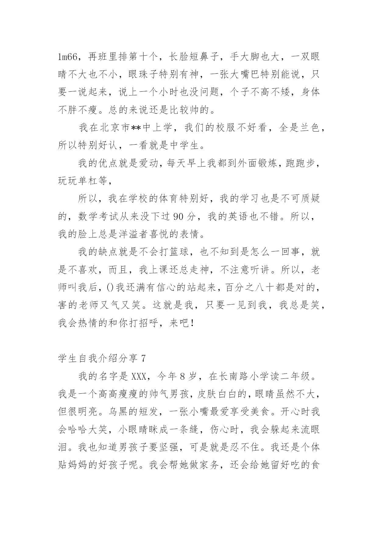 学生自我介绍分享学生自我介绍分享8篇学生自我介绍分享1我的名字是**,今年**岁。我想大家一定还不太熟悉我吧!那我就做个自我介绍吧!我最喜欢的颜色是紫色。人家说,喜欢紫色的人性格活泼直率,有极加的变通能力。说到这里,我不由地想到我的性格,我的确是个有个性、敢作敢为、敢说话的人。一次,妈妈带我去她的同学家玩。刚到那位阿姨家,我便见到一位小妹妹躲阿姨家,好像很怕生。我见到此景,便知道可以表现以下我的交友能力啦。我坐到了那位小妹妹身边,伸出手,说道:“来,我们交个朋友吧!”她也伸出手,和我握了握。聊了一会儿,我和那位小妹妹便成了无话不谈的好朋友。因为我的口才,我的人缘特别的好,上课发言也总有我的份。我长大想当一名律师,难道从小开始练习口才不是我长大当律师打下的基础吗?我有许多爱好。但最让我喜爱的还是看书。我喜爱阅读,不单是它能教我许多知识,它还能我心情愉快,变的开朗活泼。一天,我在学校处的很不愉快,百般无厌地回到家。见到父母亲,因为心情不好,而跟他们大吵一架。这时,心情落到了最地层,我躲在房间,无意中翻开一本逗你笑一笑的笑话书,书里又浮县出我百看不厌的的笑话。不一会儿,我就被这本书逗笑了。我的心情仿佛又好了许多,回忆起刚才对父母亲的不不对,真实惭愧不已呀!学生自我介绍分享2我的名字是xxx,出生于盛夏的我,拥有乐天性格。占有欲极强。如果看中了一样东西的话,我会极力争取,不会那么容易放弃。我不喜欢把话憋在肚子里,辛苦。高兴的时候,会暗爽,会大笑,会与人分享我所愉快的事情。学生自我介绍分享3我是广昌实验小学三年级六班的XXX,我有一双大而明亮的丹凤眼,一个高高的`鼻子,一张能说会道的小嘴巴。换牙后我长出两颗超大的门牙,而且很像兔牙,所以照相时我只能抿着嘴笑。我兴趣广泛,喜欢看《三国演义》和《西游记》等名著,喜欢下象棋,喜欢游泳,特别喜欢画画,我画的画还上了展板报呢,同学们都夸我是画画小天才。我的理想是当一名画家,我要把世界上美好的东西都画下来!学生自我介绍分享4我的名字是XXX,我今年八岁,在石笋街小学读二年级。我长得高高的,胖胖的,脸圆圆的,眼睛大大的,眼睫毛长长的,就像一个个小蚂蚁。我的爱好是看电视,从电视上我学到了不少知识。《名侦探柯南》1、2、3、4、5部,《叮当猫》等我都爱看。有时看电视把一切难过的事都忘了,只有快乐和高兴了!这就是我,你们喜欢我吗?如果喜欢我的话就和我交朋友吧!学生自我介绍分享5我是一个活泼开朗的小女孩。我长着一头乌黑亮丽的头发,有着一双明亮的大眼睛,长着一张樱桃般的小嘴。中等身材,高高的个子。我喜欢荷花,因为它在湖水里亭亭玉立,如同一位位美丽的小姑娘。我喜欢画画、唱歌、跳舞......我非常聪明,字也写得很好,不过,我还要向边玥香学习,更上一层楼!我的优点有很多,比如说我写字又有速度,又有质量,作业能及时写。我的思想也不错,我同桌的速度慢,他听写的词忘了,我能报给他。我回家吃饭时,我能帮父母盛饭。可是,人没有十全十美的,我的缺点也有很多,比如说我爱看电视,平时爱玩电脑。不过,为了学习成绩,我应该努力,努力,在努力!我要去上学时,书包还是要妈妈帮我拎。哎,想起来还真惭愧!我应该要懂事起来。我的体育方面很差,尤其是乒乓球。掂球我最多掂得连70个都不到,而且还是少有的!哎,看来我的体育方面是跟不上了!这就是我,一个可爱的我!学生自我介绍分享6我的名字是**,今年十三岁,刚上初二。我个子中等,1m66,再班里排第十个,长脸短鼻子,手大脚也大,一双眼睛不大也不小,眼珠子特别有神,一张大嘴巴特别能说,只要一说起来,说上一个小时也没问题,个子不高不矮,身体不胖不瘦。总的来说还是比较帅的。我在北京市**中上学,我们的校服不好看,全是兰色,所以特别好认,一看就是中学生。我的优点就是爱动,每天早上我都到外面锻炼,跑跑步,玩玩单杠等,所以,我在学校的体育特别好,我的学习也是不可质疑的,数学考试从来没下过90分,我的英语也不错。所以,我的脸上总是洋溢者喜悦的表情。我的缺点就是不会打篮球,也不知到是怎么一回事,就是不喜欢,而且,我上课还总走神,不注意听讲。所以,老师叫我后,()我还满有信心的站起来,百分之八十都是对的,害的老师又气又笑。这就是我,只要一见到我,我总是笑,我会热情的和你打招呼,来吧!学生自我介绍分享7我的名字是XXX,今年8岁,在长南路小学读二年级。我是一个高高瘦瘦的帅气男孩,皮肤白白的,眼睛虽然不大,但很明亮。乌黑的短发,一张小嘴最爱享受美食。开心时我会哈哈大笑,小眼睛眯成一条缝,伤心时,我会躲起来流眼泪。我也知道男孩子要坚强,可是就是忍不住。我还是个体贴妈妈的好孩子呢。我会帮她做家务,还会给她留好吃的食物。我最喜欢的小动物是小狗,因为它最忠心。我有一个最好的朋友,我们经常在一起学习和玩耍。我们在一起最开心的事情