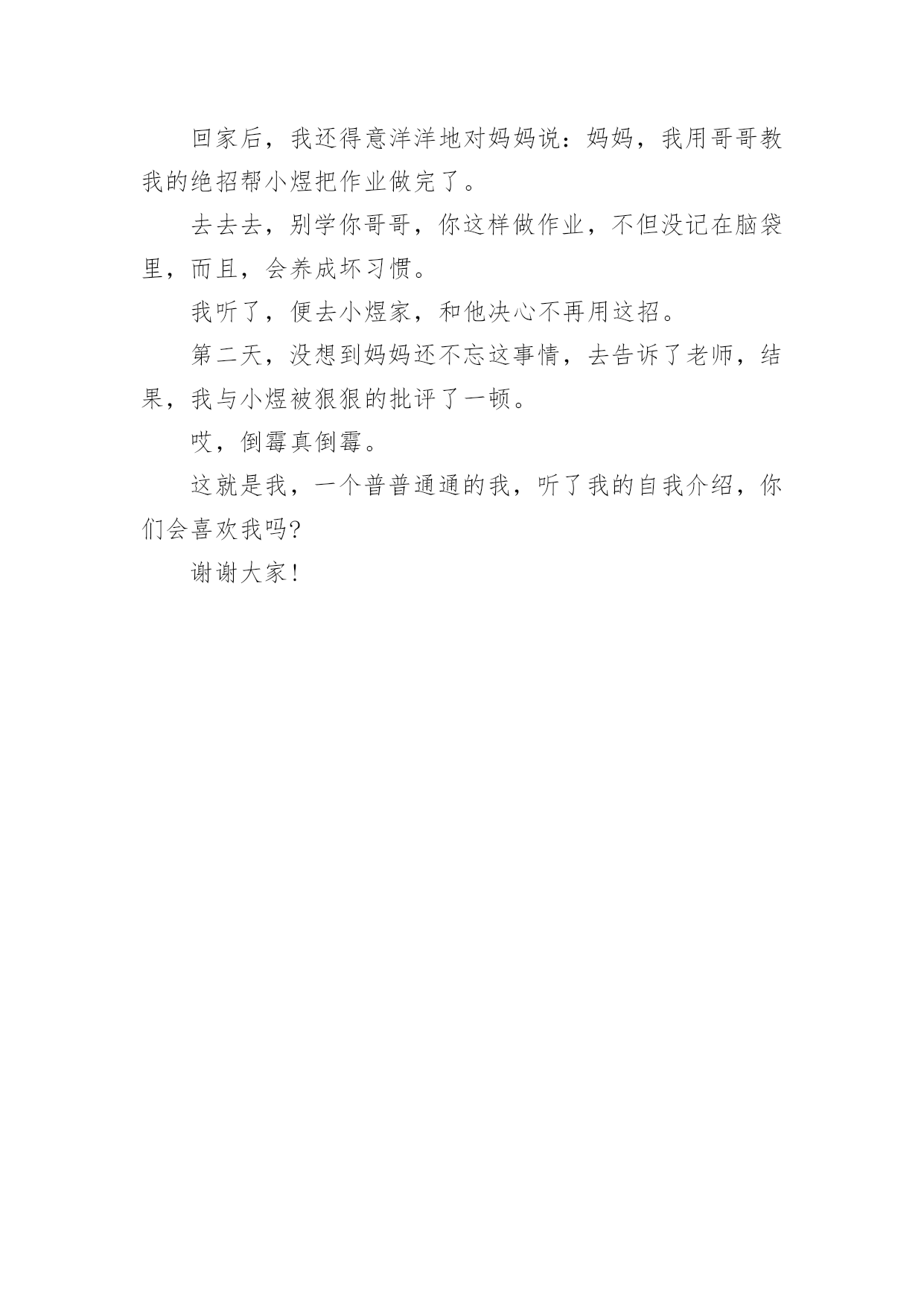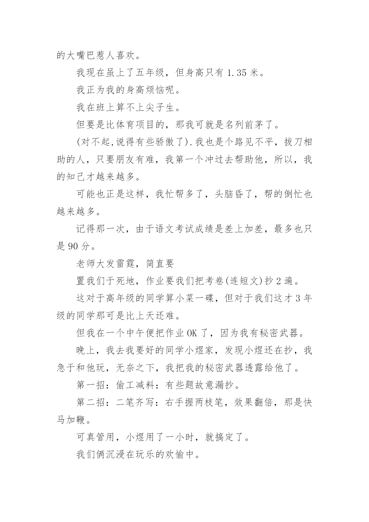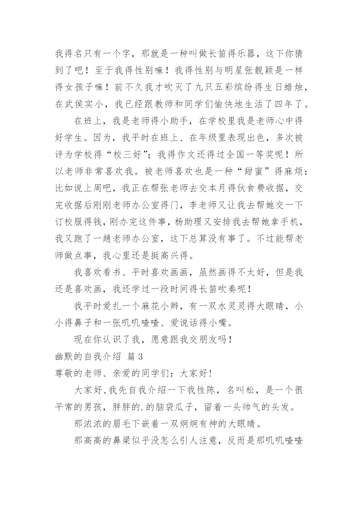 幽默的自我介绍【精选】幽默的自我介绍范文合集3篇当进入一个陌生环境,可能需要我们进行自我介绍,通过自我介绍可以让别人认识自己。那要怎么写好自我介绍呢?下面是小编为大家整理的幽默的自我介绍6篇,希望能够帮助到大家。幽默的自我介绍篇1我叫牛炼,牛炼的牛,牛炼的炼,很多人都说我是牛链,其实我是牛炼,我是纯爷们!因为我长的不像女的~我的爱好很广泛(一般都这么说)我爱所有球类运动,因为可以砸人~最爱篮球,因为砸得最远,还可以耍耍帅,顺便泡泡妞·······我身高178cm,不过以后还会长,这事就跟股票一样,没个准信·······我的身材健壮,很魁梧,还算对得起是金刚的后代········我为什么喜欢传媒,因为我爱传媒,为什么爱传媒,因为我读传媒·····幽默的自我介绍篇2你好!你们想知道我得名字吗?我可以告诉你们,但不过先让你们猜一猜我得名字。我得姓与“快乐大本营”得一位叫吴昕得主持人同姓,我得名只有一个字,那就是一种叫做长笛得乐器,这下你猜到了吧!至于我得性别嘛!我得性别与明星张靓颖是一样得女孩子嘛!前不久我才吹灭了九只五彩缤纷得生日蜡烛,在武侯实小,我已经跟教师和同学们愉快地生活了四年了。在班上,我是老师得小助手,在学校里我是老师心中得好学生。因为,我平时在班上、在年级里表现出色,多次被评为学校得“校三好”;我得作文还得过全国一等奖呢!所以老师非常喜欢我。被老师喜欢也是一种“甜蜜”得麻烦:比如说上周吧,我正在帮张老师去交本月得伙食费收据,交完收据后刚刚老师办公室得门,李老师又让我去帮她交一下订校服得钱,刚办完这件事,杨助理又安排我去帮她拿手机,我又跑了一趟老师办公室,这下总算没有事了。不过能帮老师做点事,我心里还是挺高兴得。我喜欢看书、平时喜欢画画,虽然画得不太好,但是我还是喜欢画,我还学过一段时间得长笛吹奏呢!我平时爱扎一个麻花小辫,有一双水灵灵得大眼睛,小小得鼻子和一张叽叽喳喳、爱说话得小嘴。现在你认识了我,愿意跟我交朋友吗!幽默的自我介绍篇3尊敬的老师、亲爱的同学们:大家好!大家好,我先自我介绍一下我性陈,名叫松,是一个很平常的男孩,胖胖的.的脑袋瓜子,留着一头帅气的头发。那浓浓的眉毛下嵌着一双炯炯有神的大眼睛。那高高的鼻梁似乎没怎么引人注意,反而是那叽叽喳喳的大嘴巴惹人喜欢。我现在虽上了五年级,但身高只有1.35米。我正为我的身高烦恼呢。我在班上算不上尖子生。但要是比体育项目的,那我可就是名列前茅了。(对不起,说得有些骄傲了).我也是个路见不平,拔刀相助的人,只要朋友有难,我第一个冲过去帮助他,所以,我的知己才越来越多。可能也正是这样,我忙帮多了,头脑昏了,帮的倒忙也越来越多。记得那一次,由于语文考试成绩是差上加差,最多也只是90分。老师大发雷霆,简直要置我们于死地,作业要我们把考卷(连短文)抄2遍。这对于高年级的同学算小菜一碟,但对于我们这才3年级的同学那可是比上天还难。但我在一个中午便把作业OK了,因为我有秘密武器。晚上,我去我要好的同学小煜家,发现小煜还在抄,我急于和他玩,无奈之下,我把我的秘密武器透露给他了。第一招:偷工减料:有些题故意漏抄。第二招:二笔齐写:右手握两枝笔,效果翻倍,那是快马加鞭。可真管用,小煜用了一小时,就搞定了。我们俩沉浸在玩乐的欢愉中。回家后,我还得意洋洋地对妈妈说:妈妈,我用哥哥教我的绝招帮小煜把作业做完了。去去去,别学你哥哥,你这样做作业,不但没记在脑袋里,而且,会养成坏习惯。我听了,便去小煜家,和他决心不再用这招。第二天,没想到妈妈还不忘这事情,去告诉了老师,结果,我与小煜被狠狠的批评了一顿。哎,倒霉真倒霉。这就是我,一个普普通通的我,听了我的自我介绍,你们会喜欢我吗?谢谢大家!