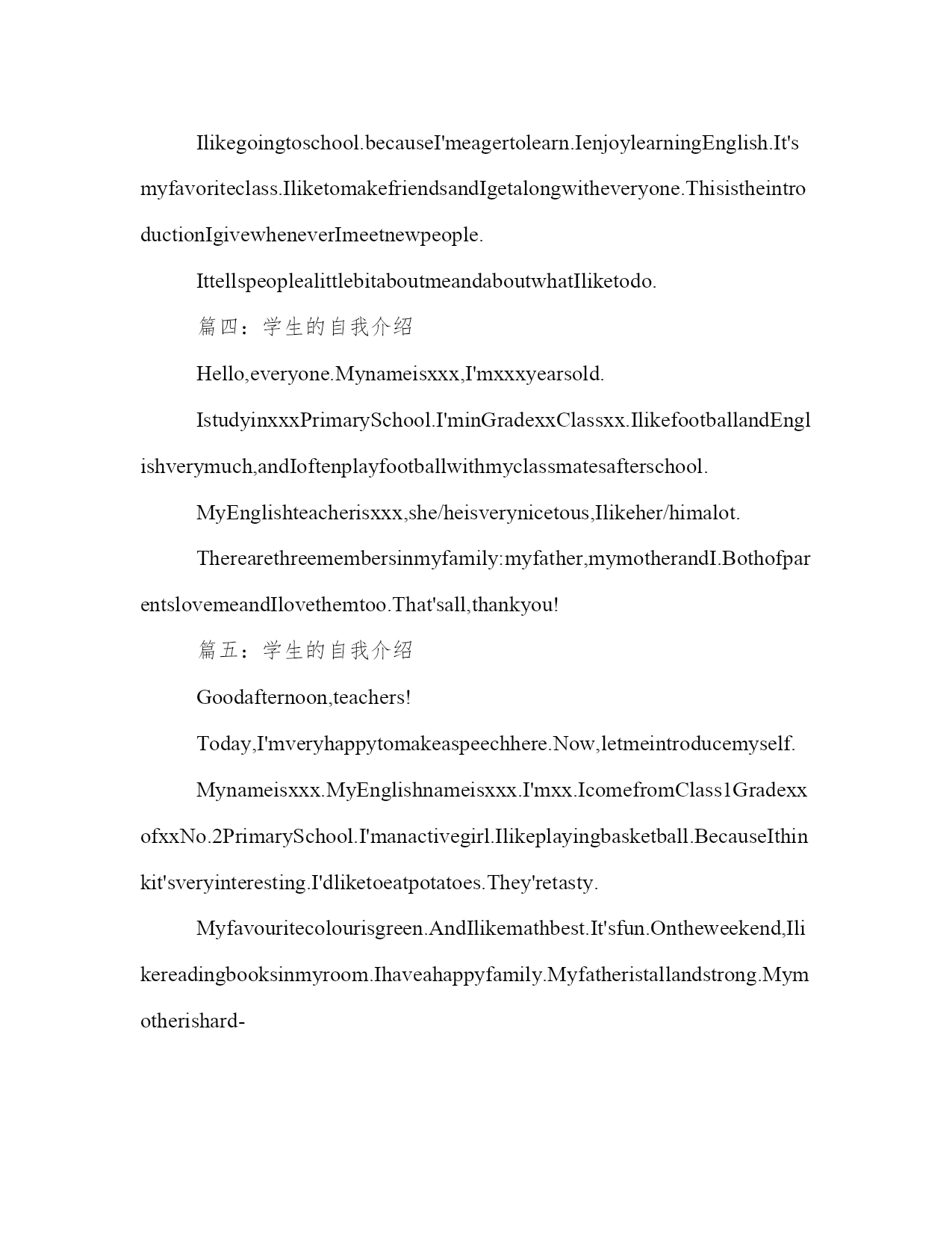 学生的英文自我介绍篇一:学生的自我介绍Hello,everybody.Myname'sxxx.I'minClassxxGradexxofxxschool.I'mtall/short.I'mxxcentimeters.IlikeEnglishverymuch.BeacuseEnglishisinteresting.SomyEnglishisverygood.Iacquiremanyaward.Ihopethateveryofyouwillloveme.篇二:学生的自我介绍Hello,mynameis_______.Iam_______yearsold.NowIamstudyingin_______PrimarySchool.IaminGrade_______,Class_______.Ilivein_______.Thereare_______members/peopleinmyfamily—father,motherandme.Myfatherisa_______butmymotherisworkingin_______.Ilovebothofthem.Inmysparetime,Ilike_______,andmyfavoritecolouris_______.AlsoIlove__________verymuch,suchas________________.IhopeIcanlearnEnglishwell,becauseIthinkitisveryimportant.But_______isfavoritesubject,becauseitisveryinteresting.IwishIcanbecomea_______inthefuture.篇三:学生的自我介绍MynameisxxandI'mfromxx.Rightnow,I'mastudent.Istudyveryhardeveryday.Ilikegoingtoschool.becauseI'meagertolearn.IenjoylearningEnglish.It'smyfavoriteclass.IliketomakefriendsandIgetalongwitheveryone.ThisistheintroductionIgivewheneverImeetnewpeople.IttellspeoplealittlebitaboutmeandaboutwhatIliketodo.篇四:学生的自我介绍Hello,everyone.Mynameisxxx,I'mxxxyearsold.IstudyinxxxPrimarySchool.I'minGradexxClassxx.IlikefootballandEnglishverymuch,andIoftenplayfootballwithmyclassmatesafterschool.MyEnglishteacherisxxx,she/heisverynicetous,Ilikeher/himalot.Therearethreemembersinmyfamily:myfather,mymotherandI.BothofparentslovemeandIlovethemtoo.That'sall,thankyou!篇五:学生的自我介绍Goodafternoon,teachers!Today,I'mveryhappytomakeaspeechhere.Now,letmeintroducemyself.Mynameisxxx.MyEnglishnameisxxx.I'mxx.IcomefromClass1GradexxofxxNo.2PrimarySchool.I'manactivegirl.Ilikeplayingbasketball.BecauseIthinkit'sveryinteresting.I'dliketoeatpotatoes.They'retasty.Myfavouritecolourisgreen.AndIlikemathbest.It'sfun.Ontheweekend,Ilikereadingbooksinmyroom.Ihaveahappyfamily.Myfatheristallandstrong.Mymotherishard-workingandtall,too.Mybrotherissmart.AndI'magoodstudent.Mydreamistobeateacher,becauseIwanttohelpthepoorchildreninthefuture.Thankyouforlistening!Pleaserememberme