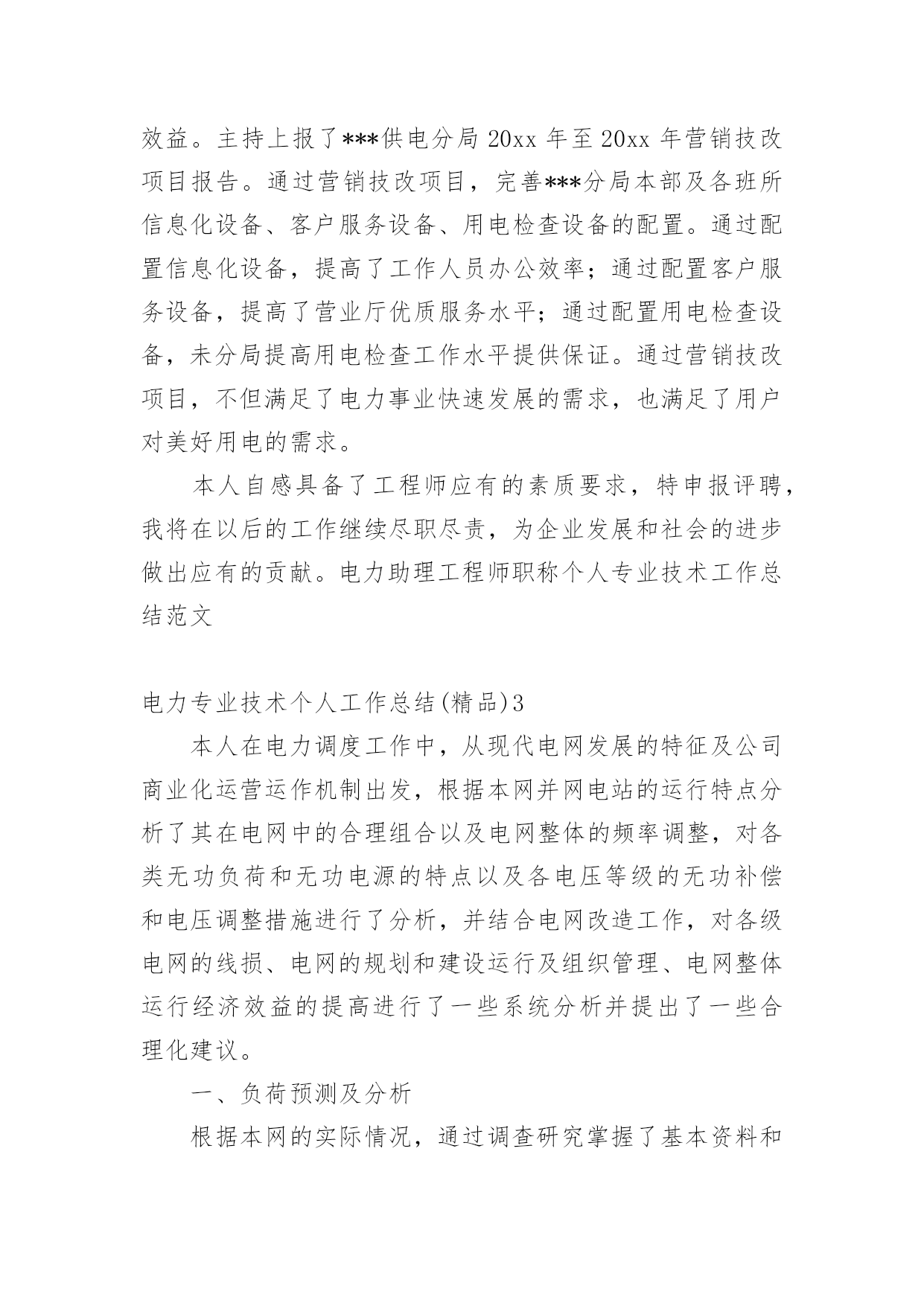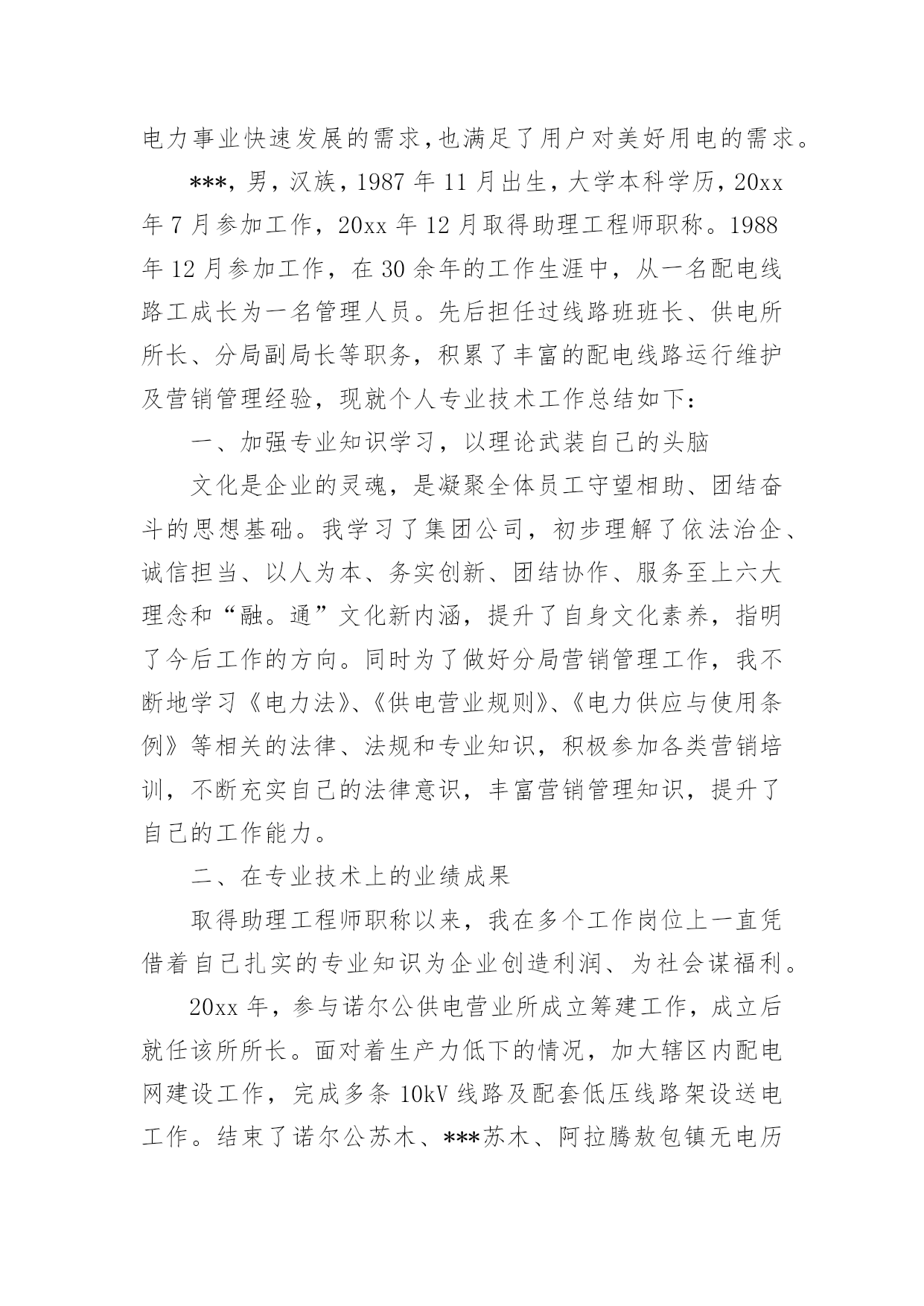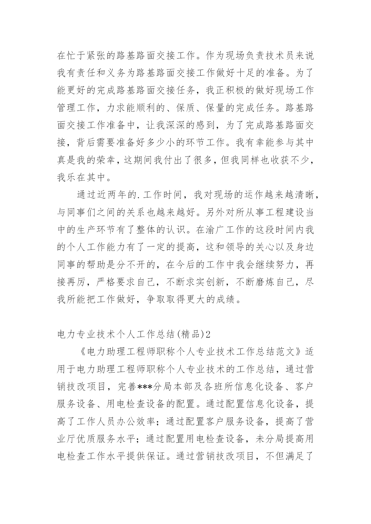 电力专业技术个人工作总结电力专业技术个人工作总结(精品)总结是指社会团体、企业单位和个人在自身的某一时期、某一项目或某些工作告一段落或者全部完成后进行回顾检查、分析评价,从而肯定成绩,得到经验,找出差距,得出教训和一些规律性认识的一种书面材料,它能够给人努力工作的动力,因此好好准备一份总结吧。你想知道总结怎么写吗?以下是小编为大家整理的电力专业技术个人工作总结(精品),希望能够帮助到大家。电力专业技术个人工作总结(精品)1时光飞逝,从20xx年7月毕业后参加工作到现在马上就有两年的时间了。在这近一年的工作过程中我不仅加深了对原来学习的知识理解,而且对以前书本中没有接触或接触不深的知识有了进一步的认识。工作以来,在单位领导的精心培育和教导下,通过自身的不断努力,无论是思想上、学习上还是工作上,都取得了长足的发展和巨大的收获,现将工作总结如下:思想上,坚持认真学习马列主义、毛泽东思想、邓小平理论和“三个代表”重要思想,坚持实事求是,不断提高自己的政治思想觉悟与水平,不断地探索与追求。学习上,自参加工作以来我一直严格要求自己,认真对待自己的工作,自身很好的为自己定位,尽管来到了重庆这块离家乡挺远的地方工作,条件很艰苦,但对我们年青人来说,也不失为一次锻炼自我,挑战自我的机遇。理论来源于生活高于生活更应该还原回到生活,在重庆这样的一个地方,还有许多值得我们来发现的好东西,值得我们来深究学习的地方。工作中我时刻牢记要在工作中不断地学习,将理论与实际的工作很好的结合在一起。在工作中不断地改变自我,适时地对自己提出不同的要求,在工作中不断总结经验,提升自身工作能力的同时,在工作中不断地学习,也在工作中逐渐的成长。工作中,来到渝广后开始负责清平隧道资料工作,在不断填写资料的过程中大概的了解到隧道工作中的众多环节搭接,以及质量要求,同时在完成分内工作之余去现场观察施工,为以后从事隧道现场管理打下基础。20xx年初,开始负责清平隧道的现场工作,由于之前对其工作有一定的了解,现场管理工作还是比较容易入门。在之后的工作中,不断与施工队以及工人不断磨合,经过四五个月的时间对现场管理有了一定的经验,同时也学到了不少东西,人们常说:“知识来源于实践”,这句话我感触颇深,在不断的工作中,也从中找到好多经验,并且在与工人的接触、交流学习到好多经验,在以后从事现场管理中能更好的工作。在负责清平隧道现场管理的这段时间里也取得了一些成绩,所负责队伍获得先进集体称号,自己也被评为20xx年度渝广高速公路先进个人。目前,我从事三汇互通路基现场管理工作,目前正在忙于紧张的路基路面交接工作。作为现场负责技术员来说我有责任和义务为路基路面交接工作做好十足的准备。为了能更好的完成路基路面交接任务,我正积极的做好现场工作管理工作,力求能顺利的、保质、保量的完成任务。路基路面交接工作准备中,让我深深的感到,为了完成路基路面交接,背后需要准备好多少小的环节工作。我有幸能参与其中真是我的荣幸,这期间我付出了很多,但我同样也收获不少,我乐在其中。通过近两年的.工作时间,我对现场的运作越来越清晰,与同事们之间的关系也越来越好。另外对所从事工程建设当中的生产环节有了整体的认识。在渝广工作的这段时间内我的个人工作能力有了一定的提高,这和领导的关心以及身边同事的帮助是分不开的,在今后的工作中我会继续努力,再接再厉,严格要求自己,不断求实创新,不断磨炼自己,尽我所能把工作做好,争取取得更大的成绩。电力专业技术个人工作总结(精品)2《电力助理工程师职称个人专业技术工作总结范文》适用于电力助理工程师职称个人专业技术的工作总结,通过营销技改项目,完善***分局本部及各班所信息化设备、客户服务设备、用电检查设备的配置。通过配置信息化设备,提高了工作人员办公效率;通过配置客户服务设备,提高了营业厅优质服务水平;通过配置用电检查设备,未分局提高用电检查工作水平提供保证。通过营销技改项目,不但满足了电力事业快速发展的需求,也满足了用户对美好用电的需求。***,男,汉族,1987年11月出生,大学本科学历,20xx年7月参加工作,20xx年12月取得助理工程师职称。1988年12月参加工作,在30余年的工作生涯中,从一名配电线路工成长为一名管理人员。先后担任过线路班班长、供电所所长、分局副局长等职务,积累了丰富的配电线路运行维护及营销管理经验,现就个人专业技术工作总结如下:一、加强专业知识学习,以理论武装自己的头脑文化是企业的灵魂,是凝聚全体员工守望相助、团结奋斗的思想基础。我学习了集团公司,初步理解了依法治企、诚信担当、以人为本、务实创新、团结协作、服务至上六大理念和“融。通”文化新内涵,提升了自身文化素养,指明了今后工作的方向。同时为了做好分局营销管理工作,我不断地学习《电力法》、《供电营业规则》、《电力