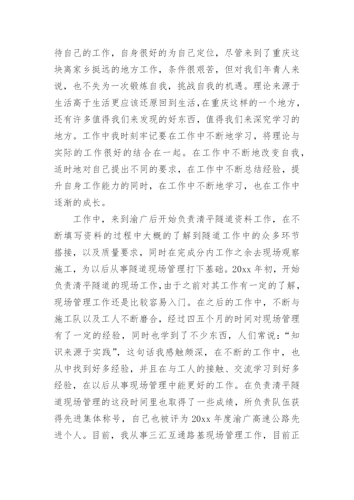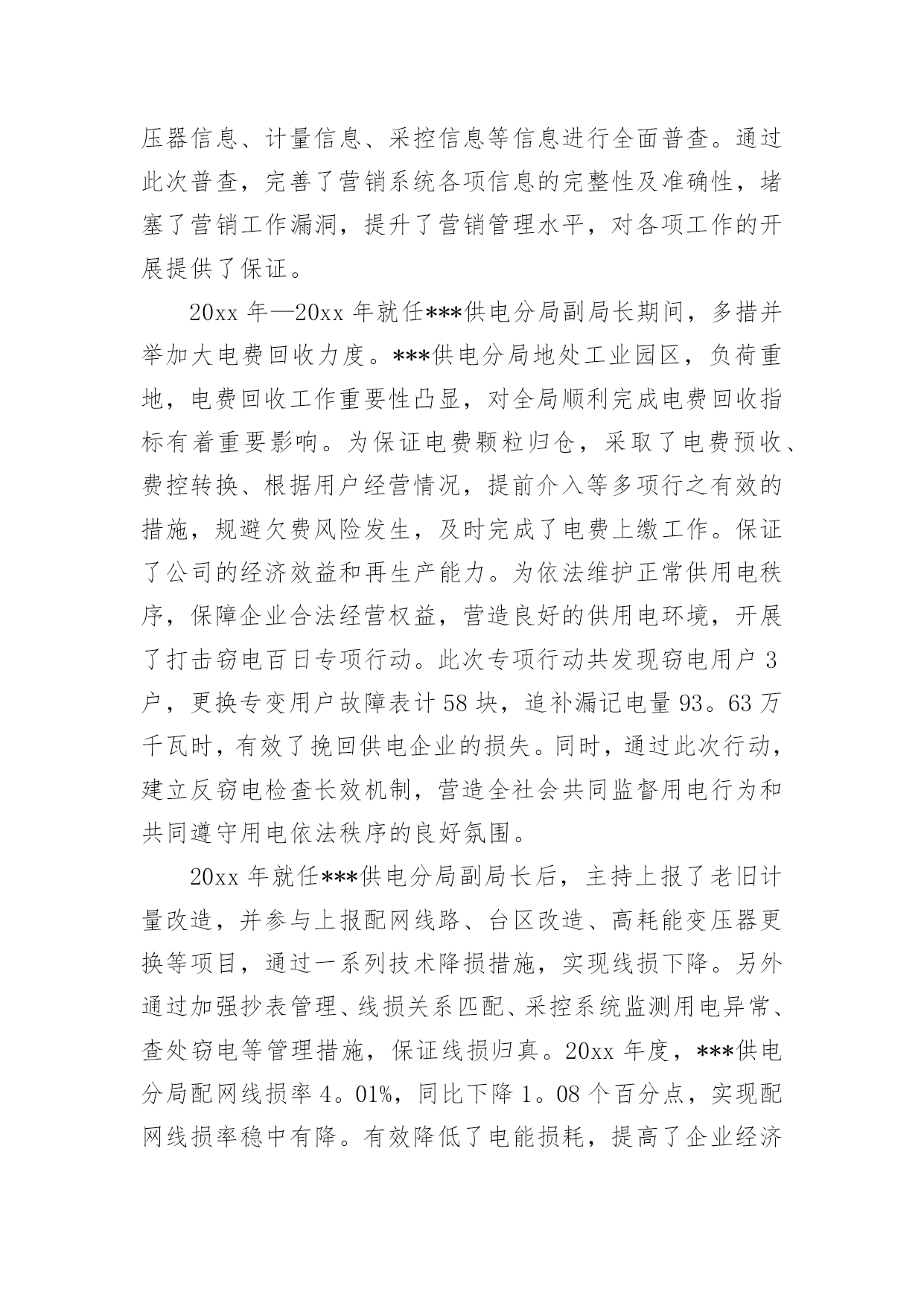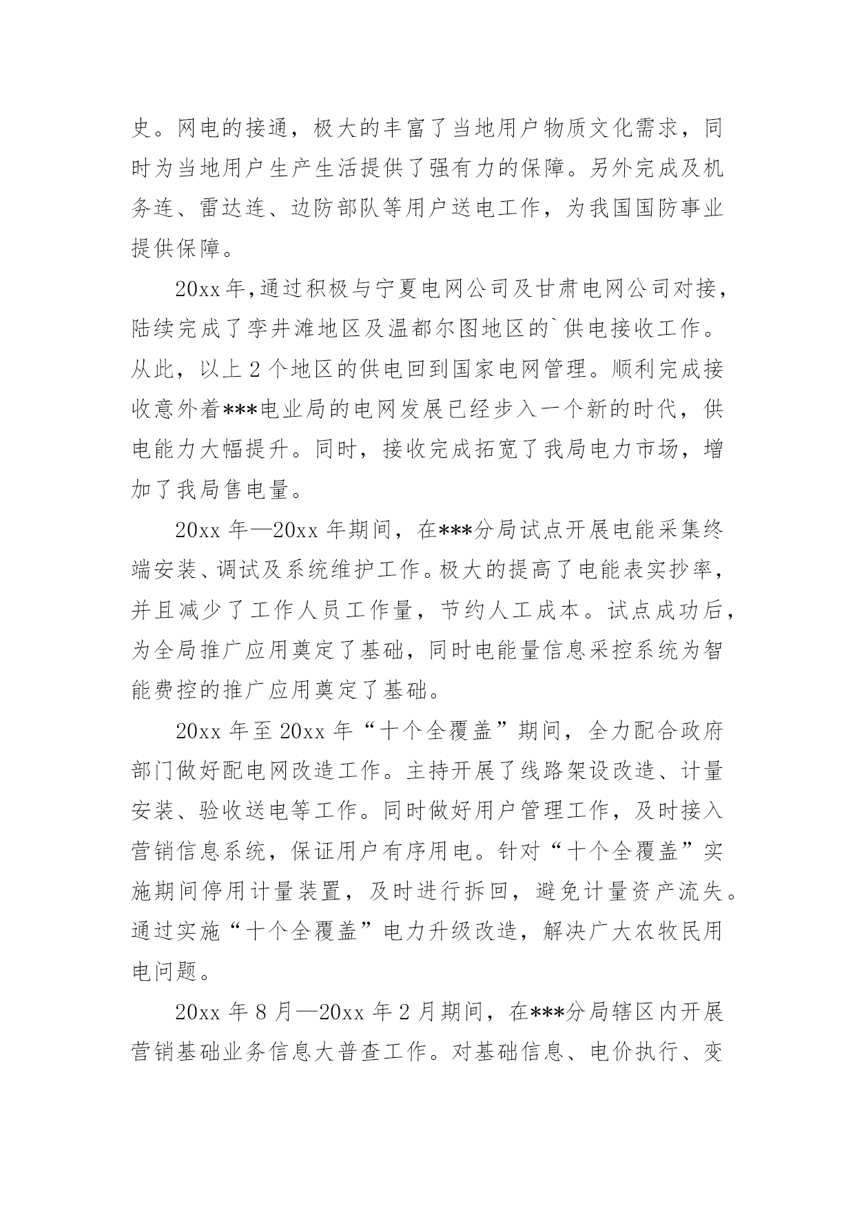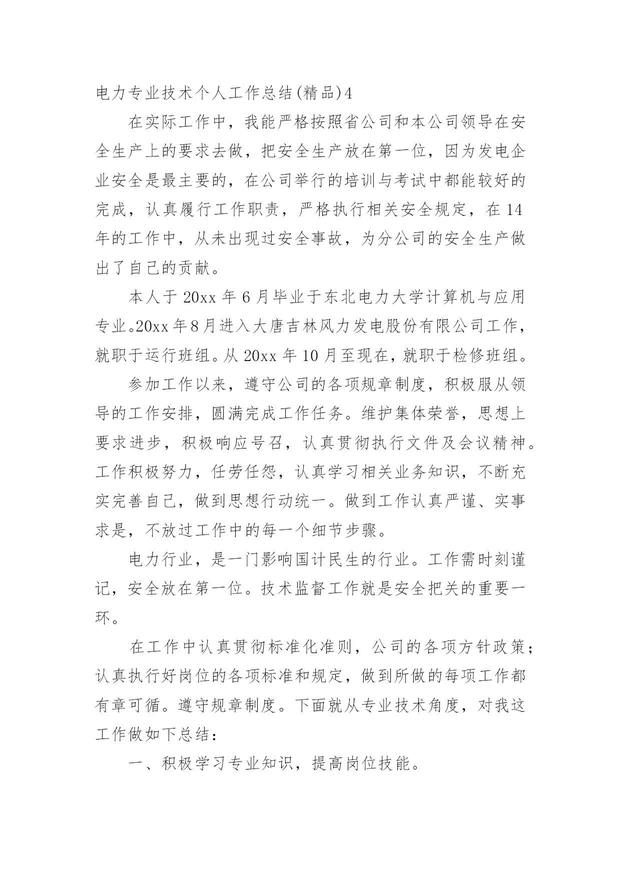 电力专业技术个人工作总结电力专业技术个人工作总结(精品)总结是指社会团体、企业单位和个人在自身的某一时期、某一项目或某些工作告一段落或者全部完成后进行回顾检查、分析评价,从而肯定成绩,得到经验,找出差距,得出教训和一些规律性认识的一种书面材料,它能够给人努力工作的动力,因此好好准备一份总结吧。你想知道总结怎么写吗?以下是小编为大家整理的电力专业技术个人工作总结(精品),希望能够帮助到大家。电力专业技术个人工作总结(精品)1时光飞逝,从20xx年7月毕业后参加工作到现在马上就有两年的时间了。在这近一年的工作过程中我不仅加深了对原来学习的知识理解,而且对以前书本中没有接触或接触不深的知识有了进一步的认识。工作以来,在单位领导的精心培育和教导下,通过自身的不断努力,无论是思想上、学习上还是工作上,都取得了长足的发展和巨大的收获,现将工作总结如下:思想上,坚持认真学习马列主义、毛泽东思想、邓小平理论和“三个代表”重要思想,坚持实事求是,不断提高自己的政治思想觉悟与水平,不断地探索与追求。学习上,自参加工作以来我一直严格要求自己,认真对待自己的工作,自身很好的为自己定位,尽管来到了重庆这块离家乡挺远的地方工作,条件很艰苦,但对我们年青人来说,也不失为一次锻炼自我,挑战自我的机遇。理论来源于生活高于生活更应该还原回到生活,在重庆这样的一个地方,还有许多值得我们来发现的好东西,值得我们来深究学习的地方。工作中我时刻牢记要在工作中不断地学习,将理论与实际的工作很好的结合在一起。在工作中不断地改变自我,适时地对自己提出不同的要求,在工作中不断总结经验,提升自身工作能力的同时,在工作中不断地学习,也在工作中逐渐的成长。工作中,来到渝广后开始负责清平隧道资料工作,在不断填写资料的过程中大概的了解到隧道工作中的众多环节搭接,以及质量要求,同时在完成分内工作之余去现场观察施工,为以后从事隧道现场管理打下基础。20xx年初,开始负责清平隧道的现场工作,由于之前对其工作有一定的了解,现场管理工作还是比较容易入门。在之后的工作中,不断与施工队以及工人不断磨合,经过四五个月的时间对现场管理有了一定的经验,同时也学到了不少东西,人们常说:“知识来源于实践”,这句话我感触颇深,在不断的工作中,也从中找到好多经验,并且在与工人的接触、交流学习到好多经验,在以后从事现场管理中能更好的工作。在负责清平隧道现场管理的这段时间里也取得了一些成绩,所负责队伍获得先进集体称号,自己也被评为20xx年度渝广高速公路先进个人。目前,我从事三汇互通路基现场管理工作,目前正在忙于紧张的路基路面交接工作。作为现场负责技术员来说我有责任和义务为路基路面交接工作做好十足的准备。为了能更好的完成路基路面交接任务,我正积极的做好现场工作管理工作,力求能顺利的、保质、保量的完成任务。路基路面交接工作准备中,让我深深的感到,为了完成路基路面交接,背后需要准备好多少小的环节工作。我有幸能参与其中真是我的荣幸,这期间我付出了很多,但我同样也收获不少,我乐在其中。通过近两年的.工作时间,我对现场的运作越来越清晰,与同事们之间的关系也越来越好。另外对所从事工程建设当中的生产环节有了整体的认识。在渝广工作的这段时间内我的个人工作能力有了一定的提高,这和领导的关心以及身边同事的帮助是分不开的,在今后的工作中我会继续努力,再接再厉,严格要求自己,不断求实创新,不断磨炼自己,尽我所能把工作做好,争取取得更大的成绩。电力专业技术个人工作总结(精品)2《电力助理工程师职称个人专业技术工作总结范文》适用于电力助理工程师职称个人专业技术的工作总结,通过营销技改项目,完善***分局本部及各班所信息化设备、客户服务设备、用电检查设备的配置。通过配置信息化设备,提高了工作人员办公效率;通过配置客户服务设备,提高了营业厅优质服务水平;通过配置用电检查设备,未分局提高用电检查工作水平提供保证。通过营销技改项目,不但满足了电力事业快速发展的需求,也满足了用户对美好用电的需求。***,男,汉族,1987年11月出生,大学本科学历,20xx年7月参加工作,20xx年12月取得助理工程师职称。1988年12月参加工作,在30余年的工作生涯中,从一名配电线路工成长为一名管理人员。先后担任过线路班班长、供电所所长、分局副局长等职务,积累了丰富的配电线路运行维护及营销管理经验,现就个人专业技术工作总结如下:一、加强专业知识学习,以理论武装自己的头脑文化是企业的灵魂,是凝聚全体员工守望相助、团结奋斗的思想基础。我学习了集团公司,初步理解了依法治企、诚信担当、以人为本、务实创新、团结协作、服务至上六大理念和“融。通”文化新内涵,提升了自身文化素养,指明了今后工作的方向。同时为了做好分局营销管理工作,我不断地学习《电力法》、《供电营业规则》、《电力