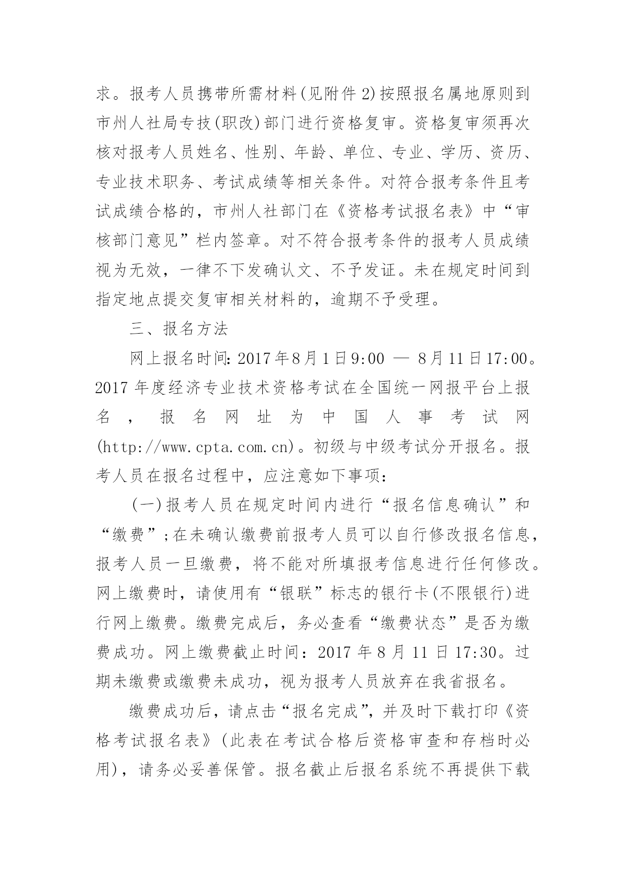 永州经济师考试报名时间通知永州2017年经济师考试报名时间通知2017年永州经济师考试报名时间是2017年8月1日9:00—8月11日17:00。下面是百分网小编为大家带来的永州经济师考试报名通知,欢迎阅读。一、报名条件凡符合原人事部《关于印发<经济专业技术资格考试暂行规定>及其<实施办法>的通知》(人职发〔1993〕1号)和《关于印发<经济专业技术资格考试报名条件的补充规定>的通知》(人职发〔1993〕3号)和原人事部办公厅《关于部分专业技术人员资格考试安排和考试工作有关问题的通知》(国人厅发〔2004〕45号)(详见“中国人事考试网”考试政策http://www.cpta.com.cn/)规定条件申请报名参加考试的考生本人,即报考人员(下同),均可报名参加经济专业技术资格考试。二、资格审查根据原人事部《关于资格考试工作中有关问题的通知》(人办发﹝1996﹞52号)和湖南省人力资源和社会保障厅《关于专业技术人员资格考试实行考后资格审查的通知》(湘人社函〔2012〕526号)等有关文件精神,经济专业技术资格考试实行网上报名前报考人员自我资格审查、所在单位资格初审、考试成绩公布后人社部门组织资格复审,资格审查中的具体注意事项见附件1、提交材料要求见附件2。在资格审查过程中,如不符合报考条件或提交虚假信息等,将按照相关规定追究责任(见附件3)。(一)报考人员自我资格审查。报考人员在报考前务必全面准确把握报考条件和要求,即学历、资历、专业等条件和要求。在确认本人完全符合国家和考区规定的各项规定后方能报名(把握不准的可在报考前咨询当地人社部门)。报考人员缴费成功下载打印《资格考试报名表》后,需在“承诺人签名”栏内签署本人姓名进行真实性承诺。报考人员必须诚信报名、诚信参考,不得以虚假信息报名参考和做虚假承诺,否则,责任自负。(二)所在单位初审。报考人员携带所需材料(见附件2)到所在单位进行资料初审。所在单位人事部门须对报考人员《资格考试报名表》的信息一一核实,严格把关,确保其符合报名参考条件。初审符合条件的,所在单位在《资格考试报名表》中“单位意见”栏内签署“初审合格”意见并盖章。不符合条件的,及时告知报考人员不符合报名参考条件,不得参考、也不再参加资格复审。所在单位应充分运用现代信息技术进行核查,对申请人提供的材料加强网上查询验证,严防弄虚作假,并保留初审查验结果以备复审。同时开具工作年限证明。(三)资格复审。国家成绩和合格线公布后,湖南人事考试网(http://www.hunanpea.com)和市州人事考试网站及时公布考试成绩合格人员名单和资格审查时间、地点及相关要求。报考人员携带所需材料(见附件2)按照报名属地原则到市州人社局专技(职改)部门进行资格复审。资格复审须再次核对报考人员姓名、性别、年龄、单位、专业、学历、资历、专业技术职务、考试成绩等相关条件。对符合报考条件且考试成绩合格的,市州人社部门在《资格考试报名表》中“审核部门意见”栏内签章。对不符合报考条件的报考人员成绩视为无效,一律不下发确认文、不予发证。未在规定时间到指定地点提交复审相关材料的,逾期不予受理。三、报名方法网上报名时间:2017年8月1日9:00—8月11日17:00。2017年度经济专业技术资格考试在全国统一网报平台上报名,报名网址为中国人事考试网(http://www.cpta.com.cn)。初级与中级考试分开报名。报考人员在报名过程中,应注意如下事项:(一)报考人员在规定时间内进行“报名信息确认”和“缴费”;在未确认缴费前报考人员可以自行修改报名信息,报考人员一旦缴费,将不能对所填报考信息进行任何修改。网上缴费时,请使用有“银联”标志的银行卡(不限银行)进行网上缴费。缴费完成后,务必查看“缴费状态”是否为缴费成功。网上缴费截止时间:2017年8月11日17:30。过期未缴费或缴费未成功,视为报考人员放弃在我省报名。缴费成功后,请点击“报名完成”,并及时下载打印《资格考试报名表》(此表在考试合格后资格审查和存档时必用),请务必妥善保管。报名截止后报名系统不再提供下载和打印。未按时打印表格而影响资格审核和发证的,报考人员责任自负。缴费完成之后,报考人员即完成所有报名手续。(二)报考人员在网上报名时,须仔细阅读网上报名流程、报考条件和考试科目、《专业技术人员资格考试违纪违规行为处理规定》(人力资源和社会保障部令第31号)、《关于专业技术人员资格考试实行考后资格审查的通知》(湘人社函〔2012〕526号)等,签订《报考人员诚信考试承诺书》,如实填写本人信息。(三)在报名、考试、资格审查、证书发放等环节中,报考人员应主动浏览湖南人事考试网(http://www.hunanpea.com)、市州人事考试网站和中国人事考试