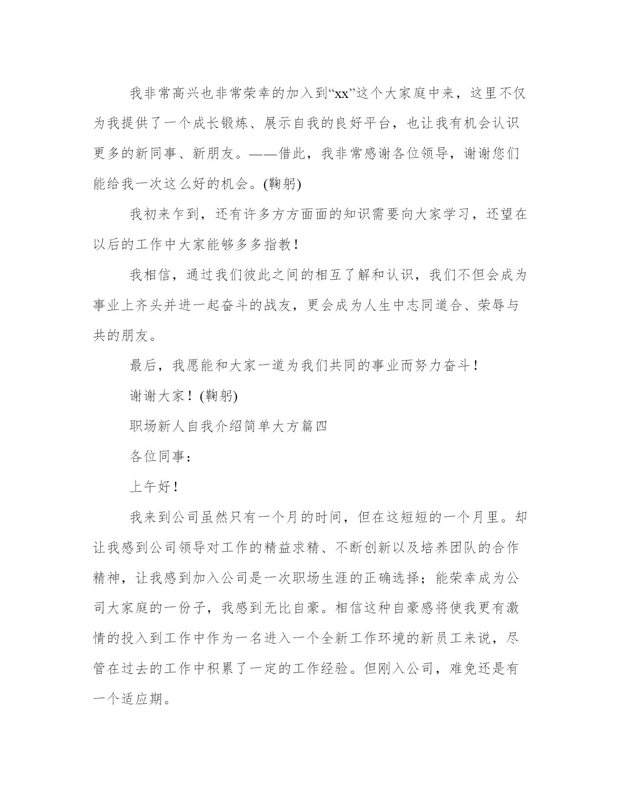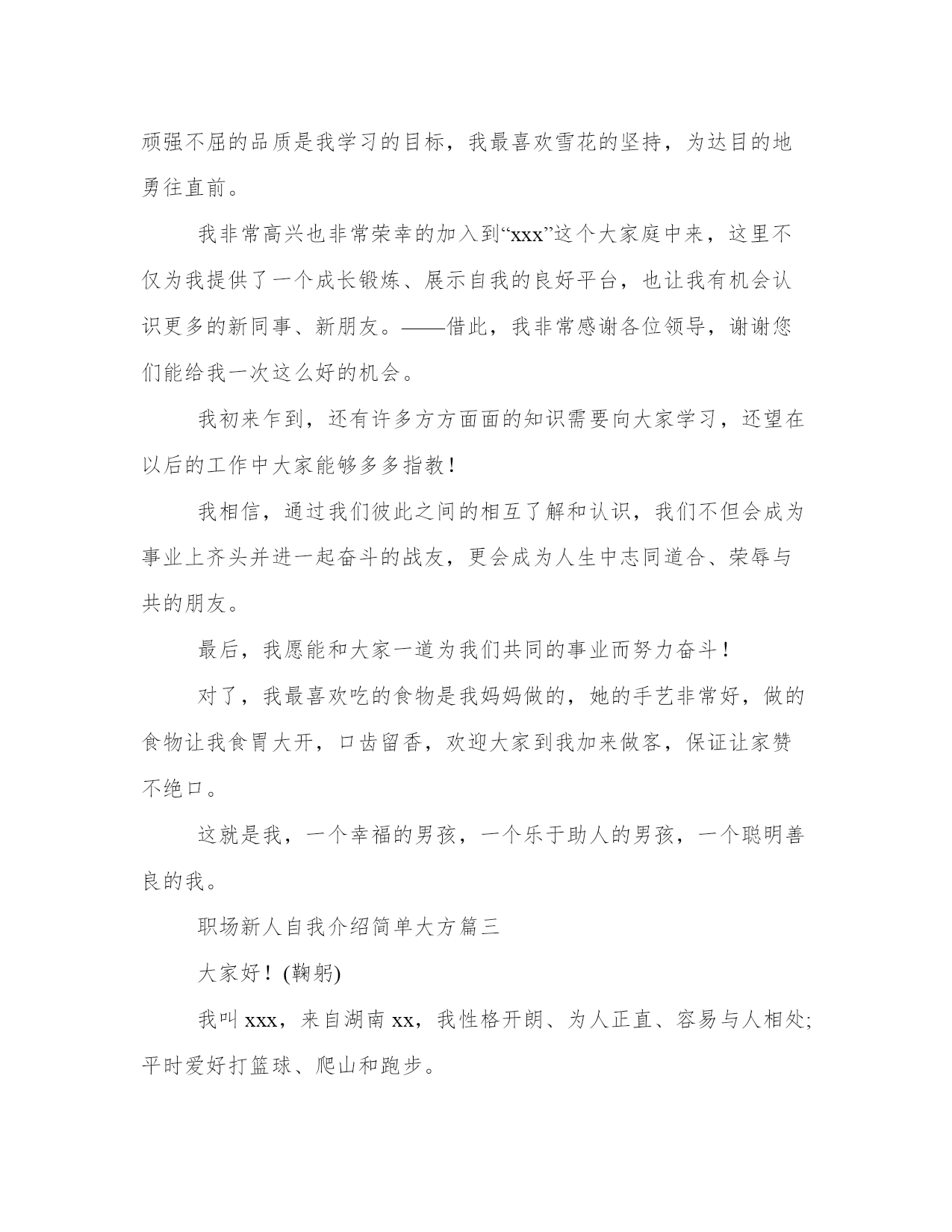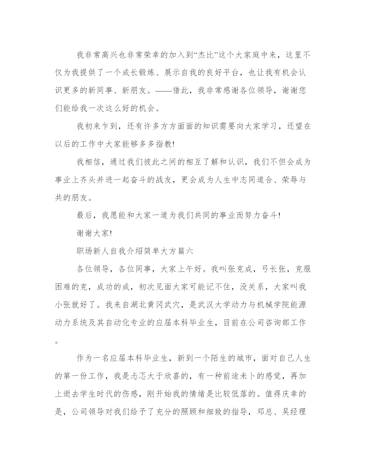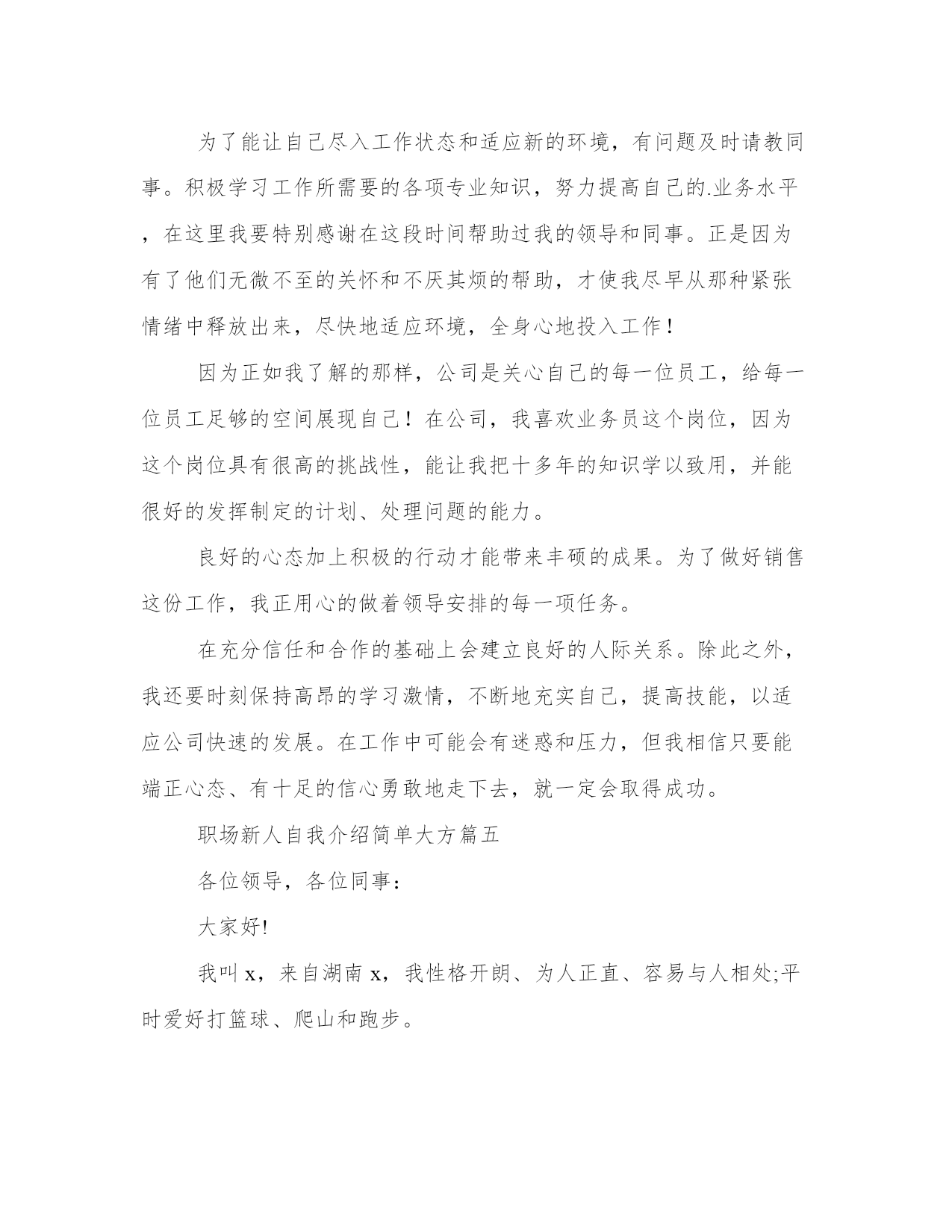 最新职场新人自我介绍简单大方(优质11篇)范文为教学中作为模范的文章,也常常用来指写作的模板。常常用于文秘写作的参考,也可以作为演讲材料编写前的参考。大家想知道怎么样才能写一篇比较优质的范文吗?以下是我为大家搜集的优质范文,仅供参考,一起来看看吧职场新人自我介绍简单大方篇一您好,我叫刘_,来自_大学。虽然我是女生,学的是基础医学专业,但是我更热衷于从事极具挑战性的销售职业,因为我觉得推销成功以后很有成就感,我认为我在三个方面的优势可以胜任贵公司的销售管理培训生职位。一、积累的销售经验。在读期间我做了很多销售类的实习与兼职工作。参加了20多次商场促销、校园促销活动,其中包括雅芳化妆品促销、卡西欧电子词典促销等,做过_公司_手机高校销售代表,曾经在2个月时间内完成功销售26部手机,销售额达30000多元。销售工作锻炼了我的勇气和耐力,我相信这两种素质将会对我未来的工作很有帮助!二、不怕吃苦。正如之前介绍的我的销售实践经历,我参加的这些销售兼职活动占据了我全部的课余时间,同时我还要兼顾学业,这个过程很辛苦,但是我坚持了下来,学业成绩和社会实践两不误。还有,我不担心频繁出差,因为我身体素质很好,我已经坚持晨跑两年多了。三、性别优势。作为女生,我认为女性和客户沟通具体天然的优势,是男性所不能比拟的,女性给人的亲和力更强。当然,在大学做推销比真正的销售工作要容易得多,我知道自己的推销技巧还很不够,有很多东西要现学现卖,不过,我已经做好“好好学习,天天向上”的准备,呵呵。职场新人自我介绍简单大方篇二大家好!我叫xxx。幼年时曾作过许多色彩斑斓的梦,当个xxx是我其中之一的梦想我有一个远大的理想,那就是我要当一名xxx,所以我还喜欢天蓝色和银白色,它代表着我要飞向天空。我身高xxx,是一个性格内向的人,所以我很喜欢读书,各种书都喜欢,当然啦,我最喜欢x,不知道大家是否看过另我喜欢不已的死神,动漫中经典中的经典啊!我尽情遨游在书的海洋中,在这里也希望交到和我拥有同样爱好的你。有广泛爱好的我的优点是乐于助人,我这个人就是典型的热肠子,以后你们如果谁有困难,只要我能帮到你们的,尽管说,我一定在所不辞!!古道热肠来称呼再合适不过了,我这个人很好相处,你们会慢慢了解我的。呵呵。我呢,最喜欢冬天,没有什么特别的原因吗,秋太过于伤感,夏太过于热情,而春天却太过于温和,冬再好不过了,介于四者之间,可以使人冷静,使人回味我最喜欢冬天的傲梅,顽强不屈的品质是我学习的目标,我最喜欢雪花的坚持,为达目的地勇往直前。我非常高兴也非常荣幸的加入到“xxx”这个大家庭中来,这里不仅为我提供了一个成长锻炼、展示自我的良好平台,也让我有机会认识更多的新同事、新朋友。——借此,我非常感谢各位领导,谢谢您们能给我一次这么好的机会。我初来乍到,还有许多方方面面的知识需要向大家学习,还望在以后的工作中大家能够多多指教!我相信,通过我们彼此之间的相互了解和认识,我们不但会成为事业上齐头并进一起奋斗的战友,更会成为人生中志同道合、荣辱与共的朋友。最后,我愿能和大家一道为我们共同的事业而努力奋斗!对了,我最喜欢吃的食物是我妈妈做的,她的手艺非常好,做的食物让我食胃大开,口齿留香,欢迎大家到我加来做客,保证让家赞不绝口。这就是我,一个幸福的男孩,一个乐于助人的男孩,一个聪明善良的我。职场新人自我介绍简单大方篇三大家好!(鞠躬)我叫xxx,来自湖南xx,我性格开朗、为人正直、容易与人相处;平时爱好打篮球、爬山和跑步。我非常高兴也非常荣幸的加入到“xx”这个大家庭中来,这里不仅为我提供了一个成长锻炼、展示自我的良好平台,也让我有机会认识更多的新同事、新朋友。――借此,我非常感谢各位领导,谢谢您们能给我一次这么好的机会。(鞠躬)我初来乍到,还有许多方方面面的知识需要向大家学习,还望在以后的工作中大家能够多多指教!我相信,通过我们彼此之间的相互了解和认识,我们不但会成为事业上齐头并进一起奋斗的战友,更会成为人生中志同道合、荣辱与共的朋友。最后,我愿能和大家一道为我们共同的事业而努力奋斗!谢谢大家!(鞠躬)职场新人自我介绍简单大方篇四各位同事:上午好!我来到公司虽然只有一个月的时间,但在这短短的一个月里。却让我感到公司领导对工作的精益求精、不断创新以及培养团队的合作精神,让我感到加入公司是一次职场生涯的正确选择;能荣幸成为公司大家庭的一份子,我感到无比自豪。相信这种自豪感将使我更有激情的投入到工作中作为一名进入一个全新工作环境的新员工来说,尽管在过去的工作中积累了一定的工作经验。但刚入公司,难免还是有一个适应期。为了能让自己尽入工作状态和适应新的环境,有问题及时请教同事。积极学习工作所需要的各项专业知识,努力提高自己的.业务水平,在这里我要特