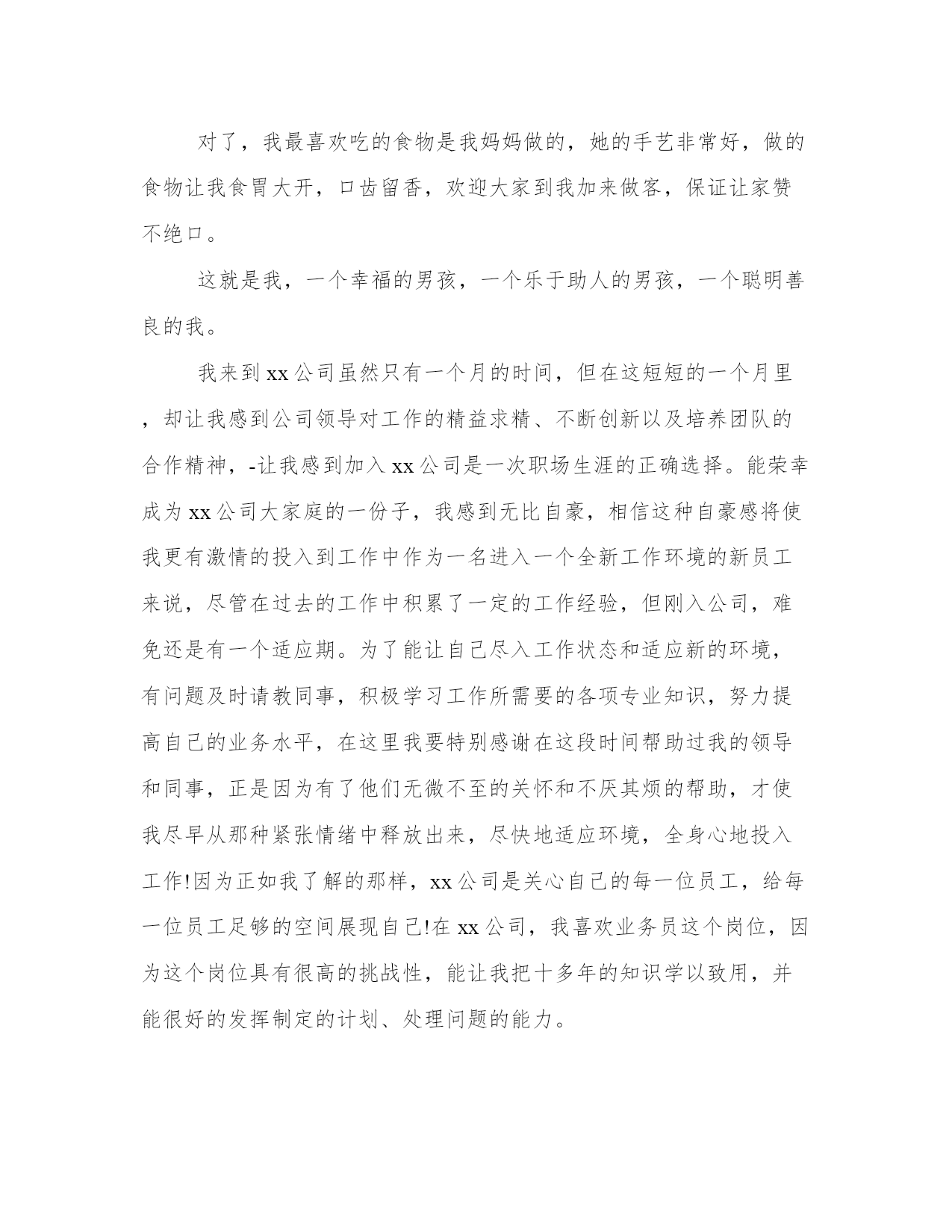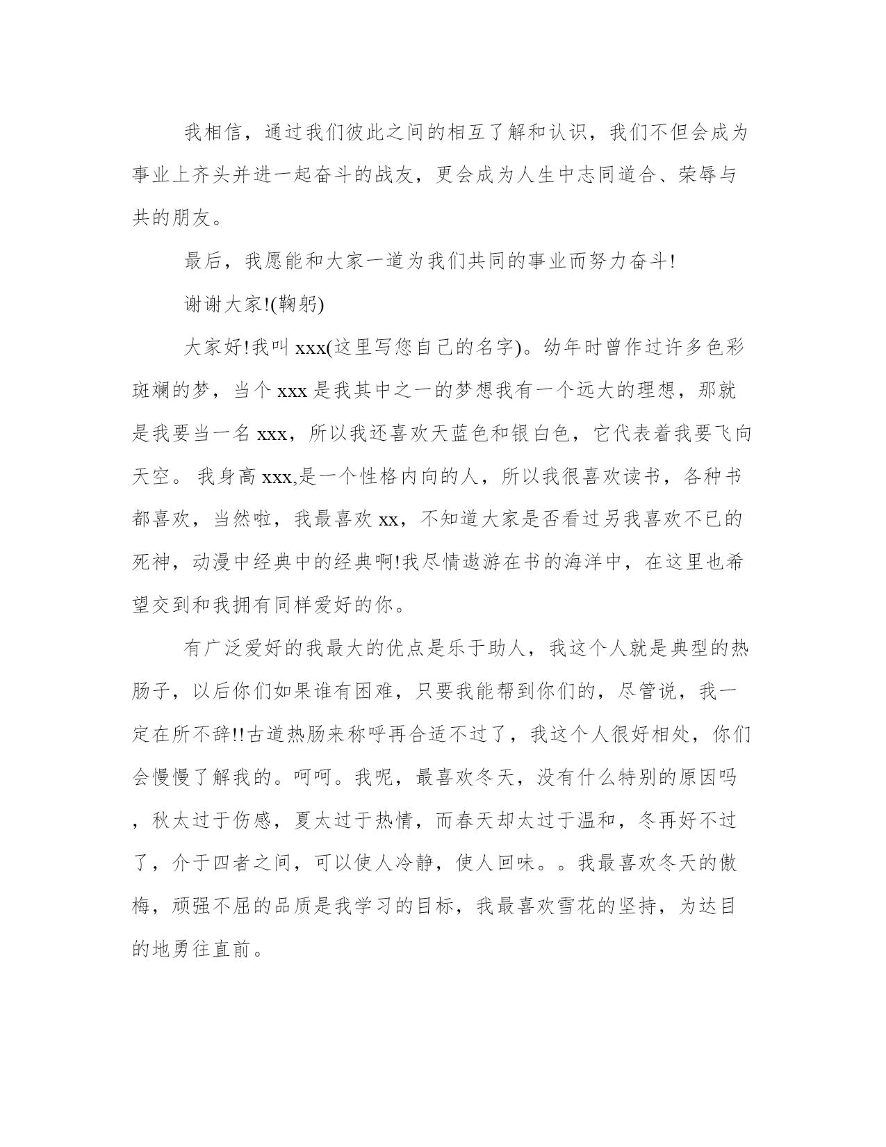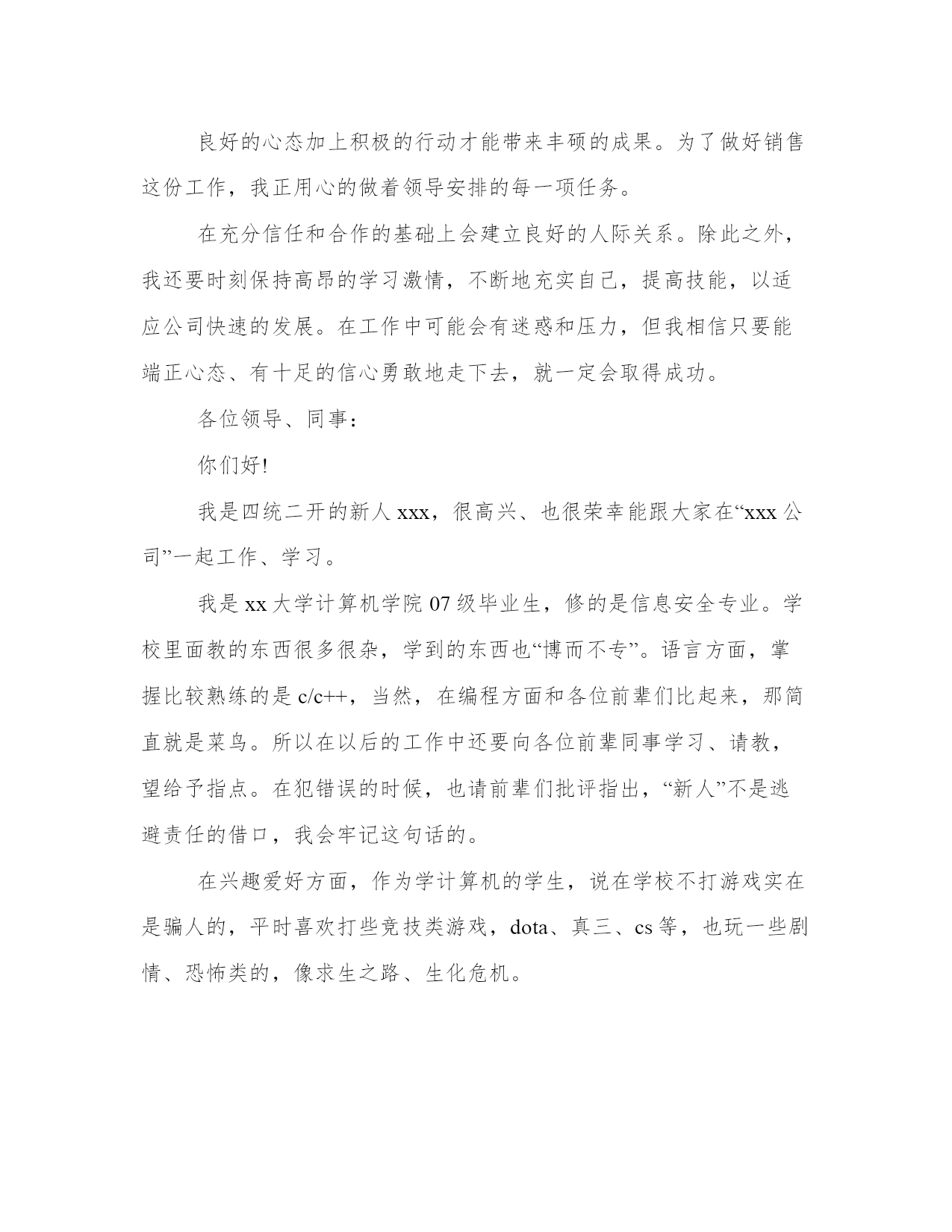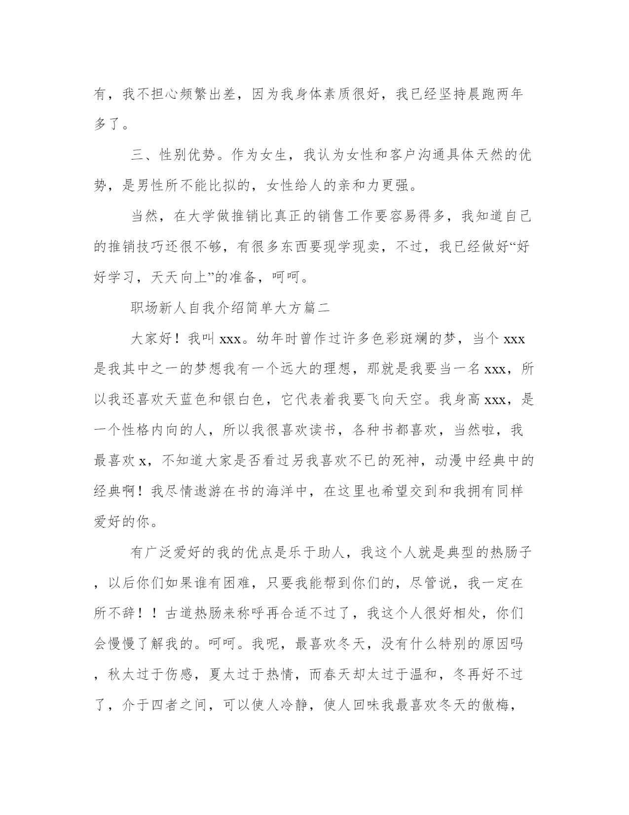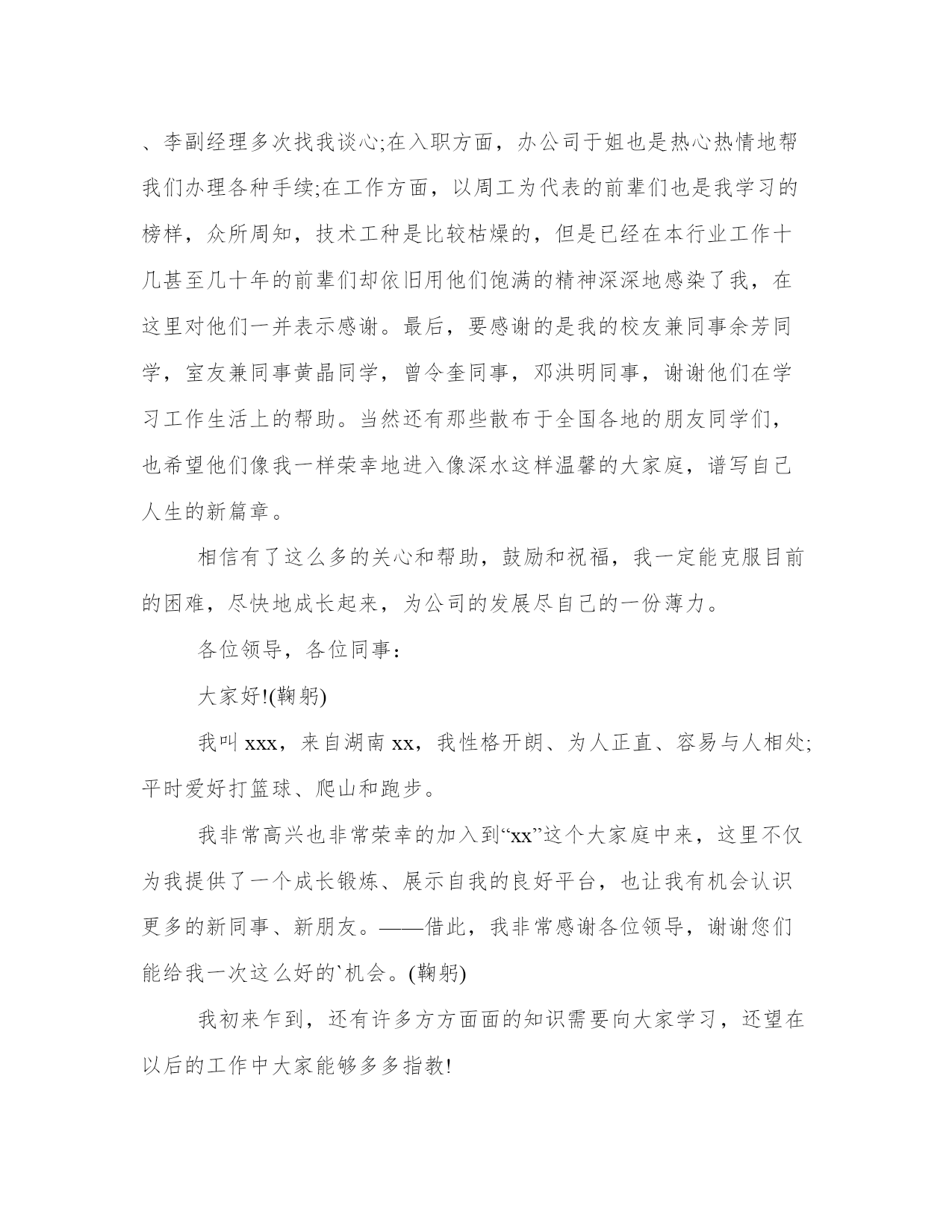 最新职场新人自我介绍简单大方(优质11篇)范文为教学中作为模范的文章,也常常用来指写作的模板。常常用于文秘写作的参考,也可以作为演讲材料编写前的参考。大家想知道怎么样才能写一篇比较优质的范文吗?以下是我为大家搜集的优质范文,仅供参考,一起来看看吧职场新人自我介绍简单大方篇一您好,我叫刘_,来自_大学。虽然我是女生,学的是基础医学专业,但是我更热衷于从事极具挑战性的销售职业,因为我觉得推销成功以后很有成就感,我认为我在三个方面的优势可以胜任贵公司的销售管理培训生职位。一、积累的销售经验。在读期间我做了很多销售类的实习与兼职工作。参加了20多次商场促销、校园促销活动,其中包括雅芳化妆品促销、卡西欧电子词典促销等,做过_公司_手机高校销售代表,曾经在2个月时间内完成功销售26部手机,销售额达30000多元。销售工作锻炼了我的勇气和耐力,我相信这两种素质将会对我未来的工作很有帮助!二、不怕吃苦。正如之前介绍的我的销售实践经历,我参加的这些销售兼职活动占据了我全部的课余时间,同时我还要兼顾学业,这个过程很辛苦,但是我坚持了下来,学业成绩和社会实践两不误。还有,我不担心频繁出差,因为我身体素质很好,我已经坚持晨跑两年多了。三、性别优势。作为女生,我认为女性和客户沟通具体天然的优势,是男性所不能比拟的,女性给人的亲和力更强。当然,在大学做推销比真正的销售工作要容易得多,我知道自己的推销技巧还很不够,有很多东西要现学现卖,不过,我已经做好“好好学习,天天向上”的准备,呵呵。职场新人自我介绍简单大方篇二大家好!我叫xxx。幼年时曾作过许多色彩斑斓的梦,当个xxx是我其中之一的梦想我有一个远大的理想,那就是我要当一名xxx,所以我还喜欢天蓝色和银白色,它代表着我要飞向天空。我身高xxx,是一个性格内向的人,所以我很喜欢读书,各种书都喜欢,当然啦,我最喜欢x,不知道大家是否看过另我喜欢不已的死神,动漫中经典中的经典啊!我尽情遨游在书的海洋中,在这里也希望交到和我拥有同样爱好的你。有广泛爱好的我的优点是乐于助人,我这个人就是典型的热肠子,以后你们如果谁有困难,只要我能帮到你们的,尽管说,我一定在所不辞!!古道热肠来称呼再合适不过了,我这个人很好相处,你们会慢慢了解我的。呵呵。我呢,最喜欢冬天,没有什么特别的原因吗,秋太过于伤感,夏太过于热情,而春天却太过于温和,冬再好不过了,介于四者之间,可以使人冷静,使人回味我最喜欢冬天的傲梅,顽强不屈的品质是我学习的目标,我最喜欢雪花的坚持,为达目的地勇往直前。我非常高兴也非常荣幸的加入到“xxx”这个大家庭中来,这里不仅为我提供了一个成长锻炼、展示自我的良好平台,也让我有机会认识更多的新同事、新朋友。——借此,我非常感谢各位领导,谢谢您们能给我一次这么好的机会。我初来乍到,还有许多方方面面的知识需要向大家学习,还望在以后的工作中大家能够多多指教!我相信,通过我们彼此之间的相互了解和认识,我们不但会成为事业上齐头并进一起奋斗的战友,更会成为人生中志同道合、荣辱与共的朋友。最后,我愿能和大家一道为我们共同的事业而努力奋斗!对了,我最喜欢吃的食物是我妈妈做的,她的手艺非常好,做的食物让我食胃大开,口齿留香,欢迎大家到我加来做客,保证让家赞不绝口。这就是我,一个幸福的男孩,一个乐于助人的男孩,一个聪明善良的我。职场新人自我介绍简单大方篇三大家好!(鞠躬)我叫xxx,来自湖南xx,我性格开朗、为人正直、容易与人相处;平时爱好打篮球、爬山和跑步。我非常高兴也非常荣幸的加入到“xx”这个大家庭中来,这里不仅为我提供了一个成长锻炼、展示自我的良好平台,也让我有机会认识更多的新同事、新朋友。――借此,我非常感谢各位领导,谢谢您们能给我一次这么好的机会。(鞠躬)我初来乍到,还有许多方方面面的知识需要向大家学习,还望在以后的工作中大家能够多多指教!我相信,通过我们彼此之间的相互了解和认识,我们不但会成为事业上齐头并进一起奋斗的战友,更会成为人生中志同道合、荣辱与共的朋友。最后,我愿能和大家一道为我们共同的事业而努力奋斗!谢谢大家!(鞠躬)职场新人自我介绍简单大方篇四各位同事:上午好!我来到公司虽然只有一个月的时间,但在这短短的一个月里。却让我感到公司领导对工作的精益求精、不断创新以及培养团队的合作精神,让我感到加入公司是一次职场生涯的正确选择;能荣幸成为公司大家庭的一份子,我感到无比自豪。相信这种自豪感将使我更有激情的投入到工作中作为一名进入一个全新工作环境的新员工来说,尽管在过去的工作中积累了一定的工作经验。但刚入公司,难免还是有一个适应期。为了能让自己尽入工作状态和适应新的环境,有问题及时请教同事。积极学习工作所需要的各项专业知识,努力提高自己的.业务水平,在这里我要特
