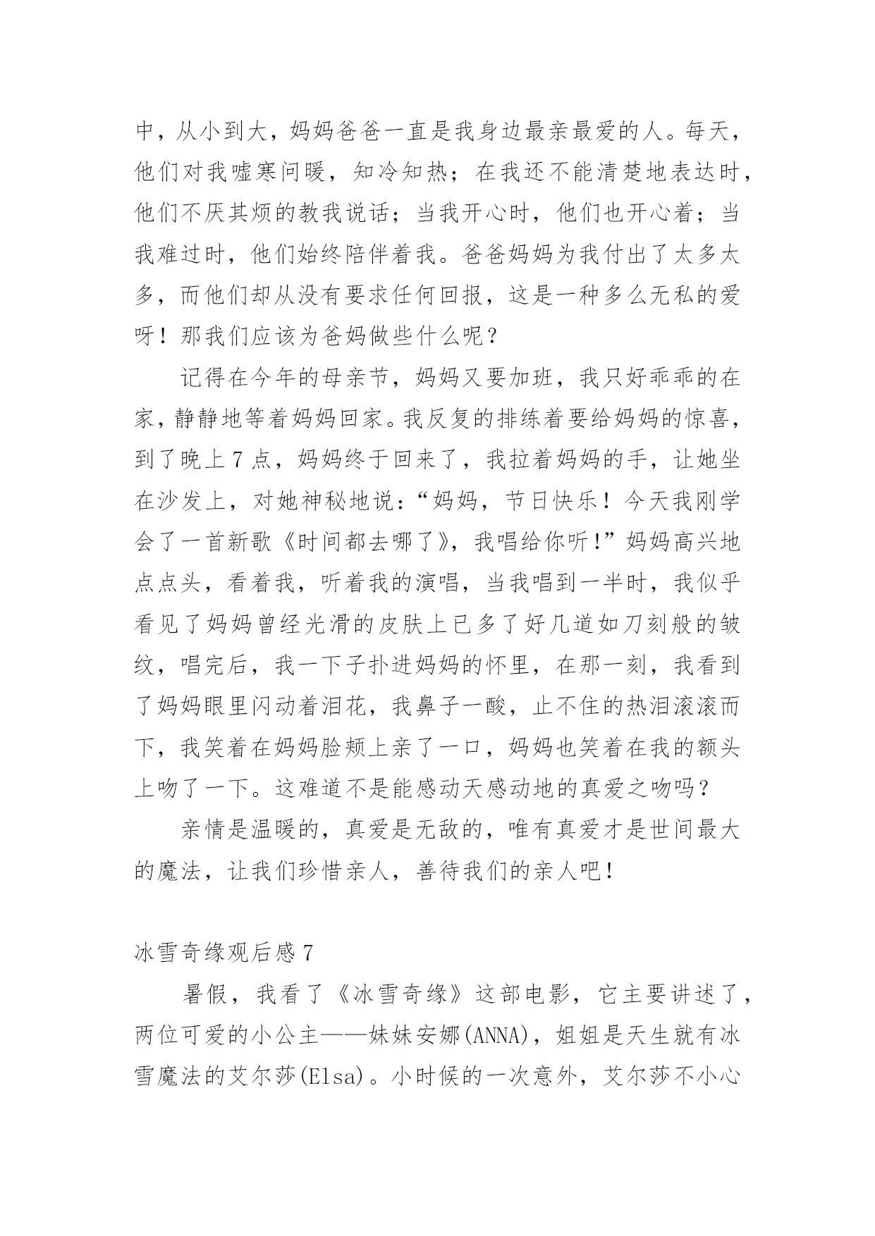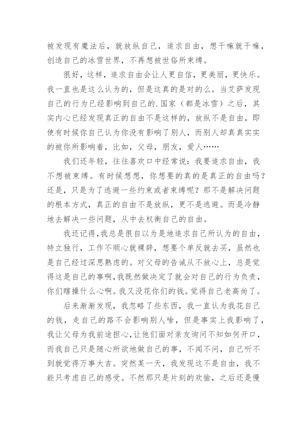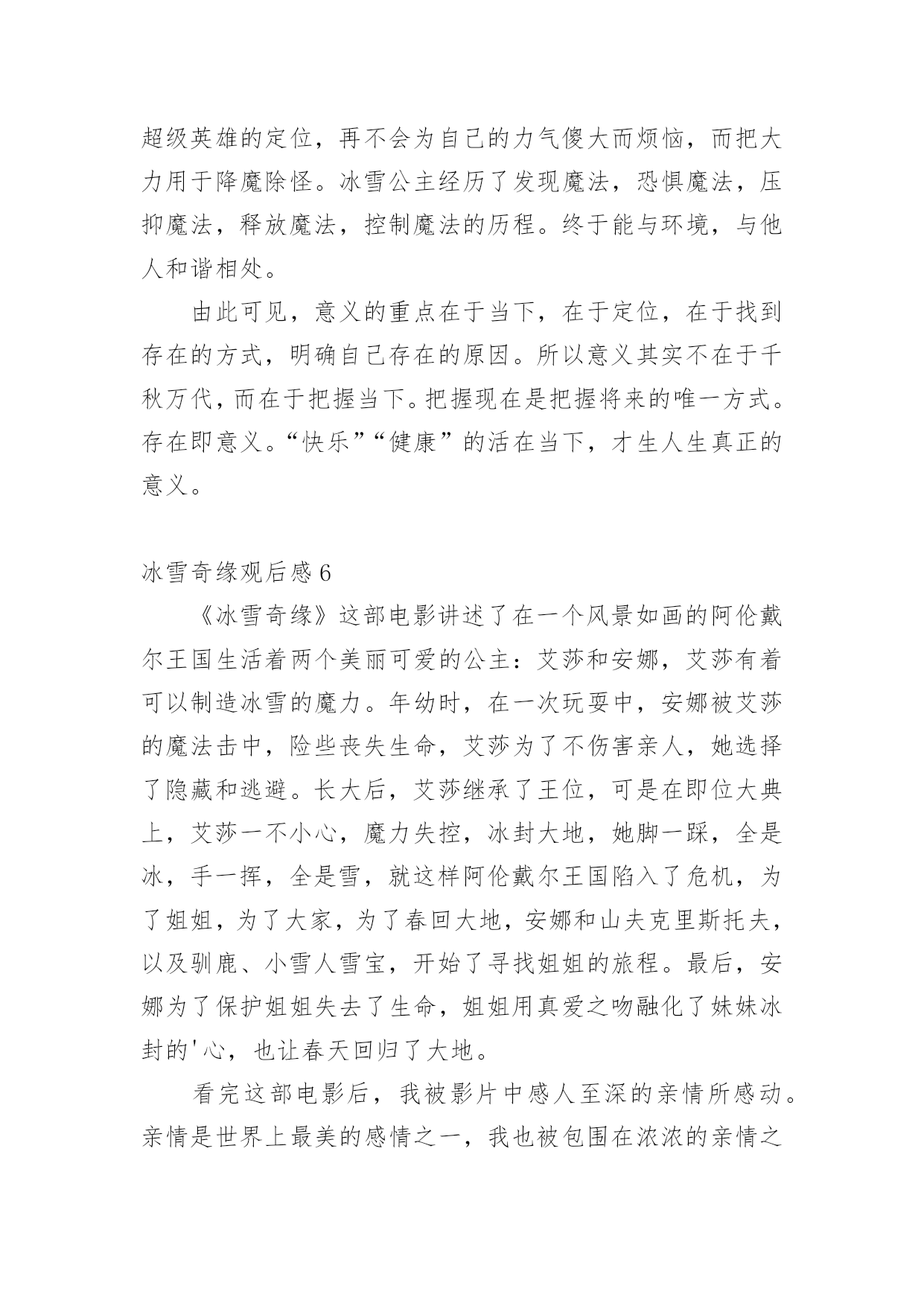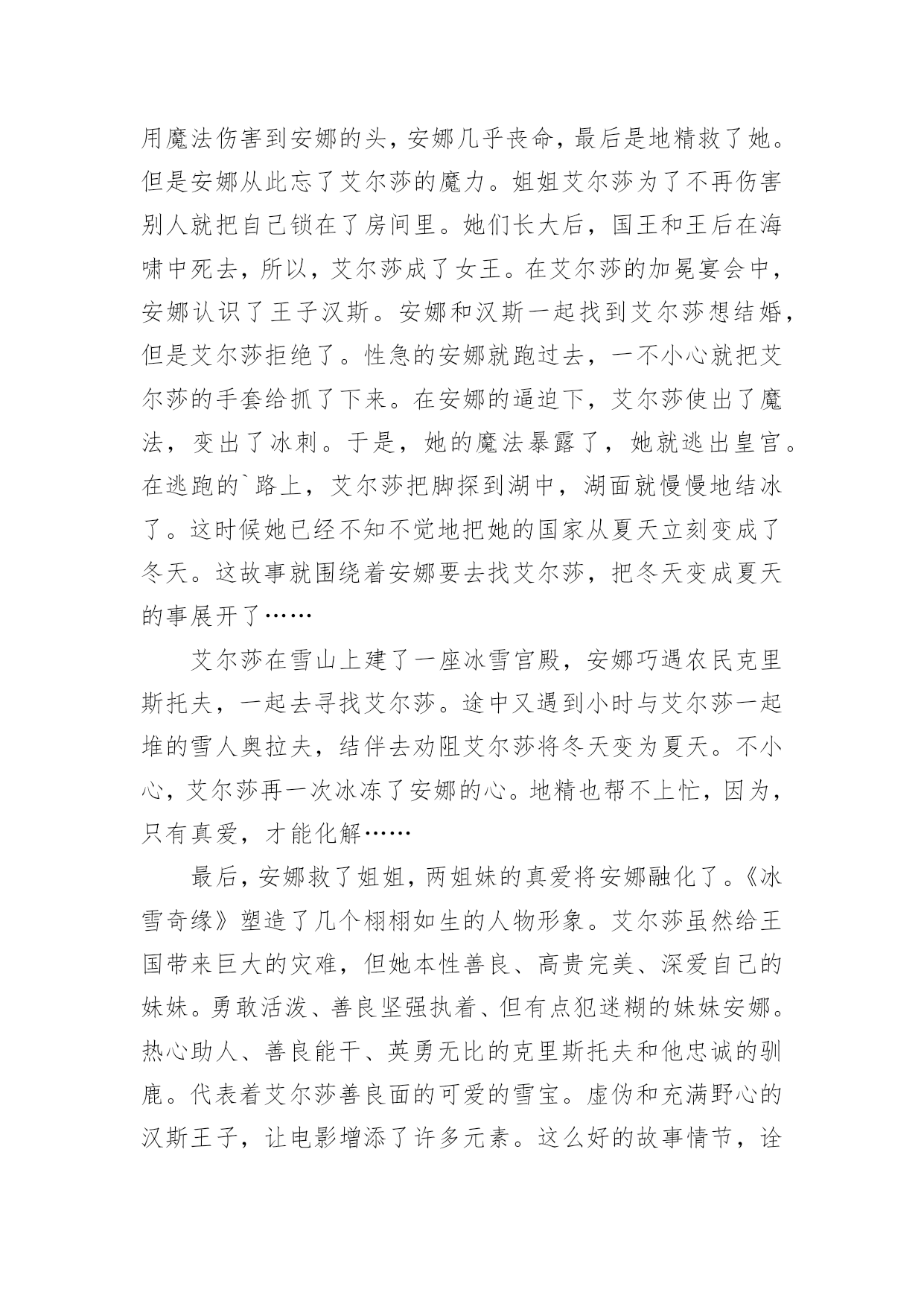 冰雪奇缘观后感(精品)冰雪奇缘观后感当看完一部影视作品后,对人生或者事物一定产生了许多感想吧,撰写观后感可以帮助我们提升自己。现在你是否对观后感一筹莫展呢?以下是小编收集整理的冰雪奇缘观后感,仅供参考,大家一起来看看吧。冰雪奇缘观后感1周末我看了《冰雪奇缘》这部电影,看完让我知道了:真爱可以感动一切。这部电影主要是讲二位美丽善良的公主:一天晚上,安娜公主睡不着,就爬到姐姐艾莎公主床上,闹着要姐姐的魔法来玩堆雪人。姐姐没办法就与妹妹一起堆雪人。接着又玩起了冰滑梯,就在这时姐姐一不小心滑倒了,魔法失控了!一下击中了妹妹的头。姐姐吓的大叫,把爸爸和妈妈引了过来。爸爸和妈妈立刻骑着“宝马”飞奔到了地精住的地方,地精把妹妹救了。但姐姐很担心再伤到别人就躲在房间不出来了。最后,爸爸、妈妈不幸死了。姐姐在加冕盛会的时候,妹妹安娜想和刚认识一天的`王子结婚,姐姐不同意。安娜就与姐姐吵了起来,姐姐一生气发动了魔法。大家都认为姐姐是怪物时妹妹不信。于是去找伤心逃走的姐姐。可是,这次姐姐艾莎又一次不小心发动了魔法把妹妹的心冰冻了起来。一个做冰块生意的人把安娜带到了地精住的地方。可是,地精说:不行,头可以治但心不行,必须要有真爱的人的吻才行!于是,做冰块生意的斯温决定带她回自己的王国去,让王子救她。可是那个王子没有救她还用水把火灭了,把她关在房间里。这时小雪人来了把火重新点燃。就在这时候天气变坏了,冰把房顶弄烂了。做生意的斯温也一路飞奔回来救安娜。安娜马上要得救时,她发现王子正拿着一把刀正准备往姐姐身上砍下去。安娜放弃了生命,用手挡刀。一下子安娜变成了冰人。正在大家都在哭的时候,泪水把冰解冻了,安娜复活了!姐姐也被真爱感动,知道了解除魔咒的方法,冬天又变回了夏天!从此他们又过上快乐的日子。这个电影就是要告诉我们:真爱可以感化一切!如果一个人没有爱心就会象王子一样变得可恶,遭人们讨厌。我也要做一个有爱心的人,真诚的与人交往,做人、做事正直向上。冰雪奇缘观后感2一样东西,一百个不同的人看到,可能会有一百种不同的结果。在迪尼斯动画片《冰雪奇缘》中,有的人可能看到了爱情,有的人可能看到了亲情,有的人可能看到了别的。对我来说,我感触比较深的是艾萨对于自由的理解过程。可能跟自己现实中也有很大的相像之处吧。影片中讲的死艾萨被发现有魔法后,就放纵自己,追求自由,想干嘛就干嘛,创造自己的冰雪世界,不再想被世俗所束缚。很好,这样,追求自由会让人更自信,更美丽,更快乐。我一直也是这么认为的,但是这真的是对的么。当艾萨发现自己的行为已经影响到自己的.国家(都是冰雪)之后,其实内心已经发现真正的自由不是这样的,放纵不是自由,即使有时候你自己认为你没有影响了别人,而别人却真真实实的被你所影响着,比如,父母,朋友,爱人……我们还年轻,往往喜欢口中经常说:我要追求自由,我不想被束缚。有时候想想,你想要的真的是真正的自由吗?还是,只是为了逃避一些约束或者束缚呢?那不是解决问题的根本方式,真正的自由不是放纵,更不是逃避。而是冷静地去解决一些问题,从中去权衡自己的自由。我还记得,我总是很自以为是地追求自己所认为的自由,特立独行,工作不顺心就裸辞,想要个单反就去买,虽然也是自己经过深思熟虑的。对父母的告诫从不放心上,总是觉得这是自己的事啊,我既然做决定了就会对自己的行为负责,你们瞎操什么心啊。我又没花你们的钱。觉得自己老高尚了。后来渐渐发现,我忽略了些东西,我一直认为我花自己的钱,走自己的路不会影响别人啥,但是事实上我影响了,我让父母为我前途担心,让他们面对亲友询问不知如何开口,而我自己只是随心所欲地做自己的事,不闻不问,自己听不到就觉得万事大吉。突然某一天,我发现这不是自由,我不能只考虑自己的感受。不然那只是片刻的欢愉,之后还是慢慢在孤独中消亡。我想,如果艾萨一直在冰宫呆着,会很快乐吗?我不觉得,活在自己的世界里纵然会有一时的快乐,但是人终究是群体动物,不可能真的独自生活,所以,生活中是没有绝对的自由的。我们要做的,就是如何去权衡这个东西,让自己和身边的人尽可能多的理解和快乐。冰雪奇缘观后感3这部影片写了妹妹安娜活泼可爱,姐姐艾尔沙有神奇的冰雪魔法。但是姐姐的魔法在气愤的时候发出的是冰尖;在高兴时发出的是纷纷扬扬的雪花。故事的开始写妹妹安娜找姐姐艾尔沙玩,缠着姐姐用魔法,玩跳“雪山”游戏,姐姐玩着玩着,一不小心滑到了,没有及时变出“雪山”,安娜跳空了,把头伤了。国王和王后听到艾尔沙的喊声也来了,看到安娜生命危急,找到地精,地精告诉国王安娜伤的不是心,是头,一会儿可以治好。但是要让姐姐学会控制魔法。艾尔沙担心再次伤到人,就把自己关了起来。三年后,宫殿的大门都打开了,艾尔沙要接管整个国家。妹妹也高兴地跳来跳去,这时她认识了来参加开城仪式的汉斯,被汉斯的花言巧语给迷惑了,安娜想与汉斯结婚。
