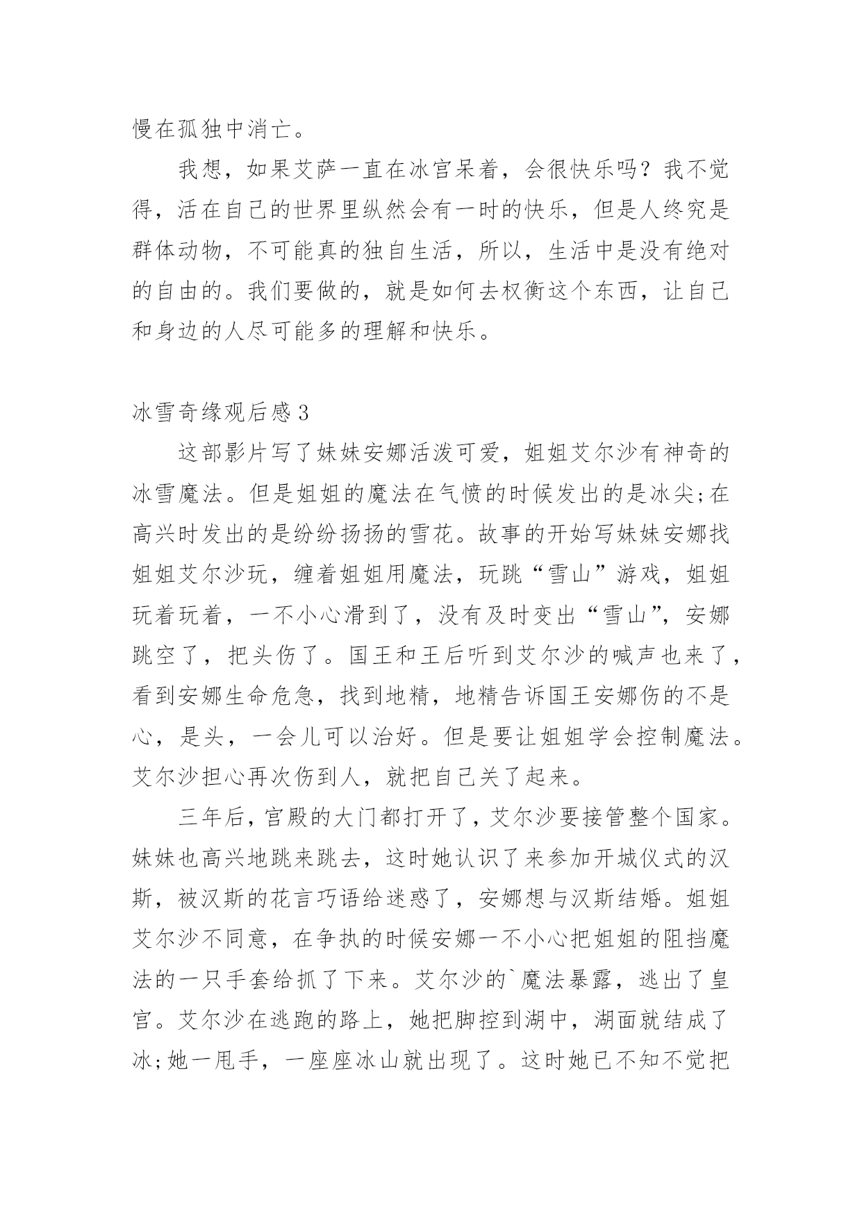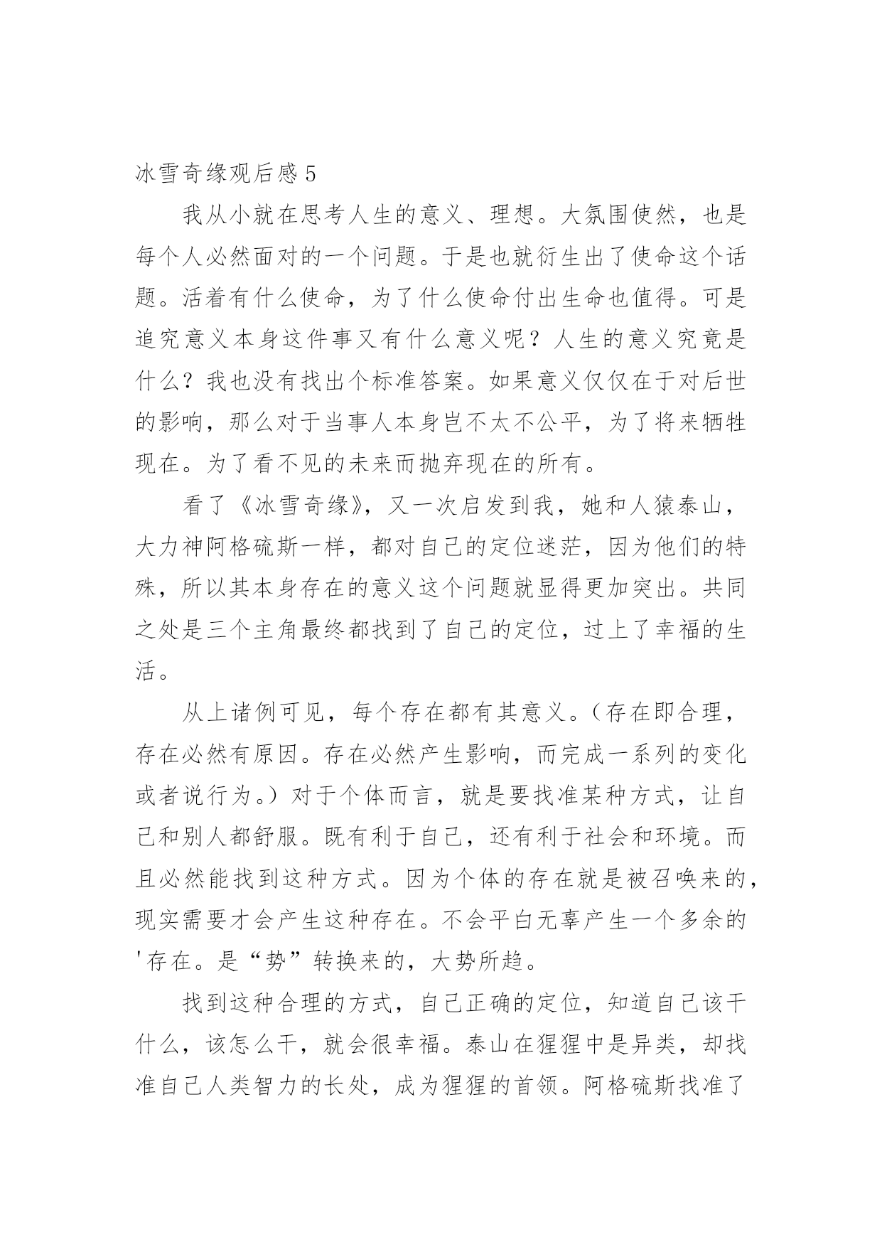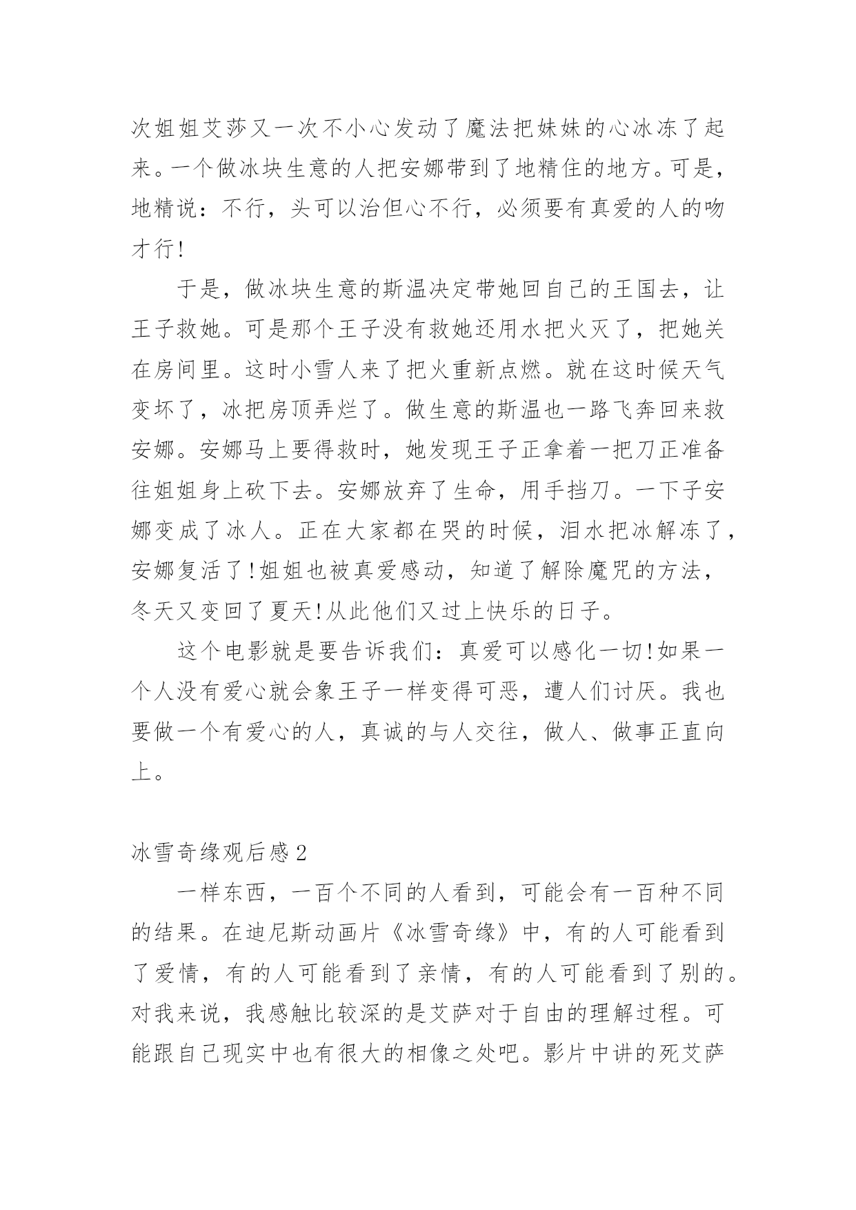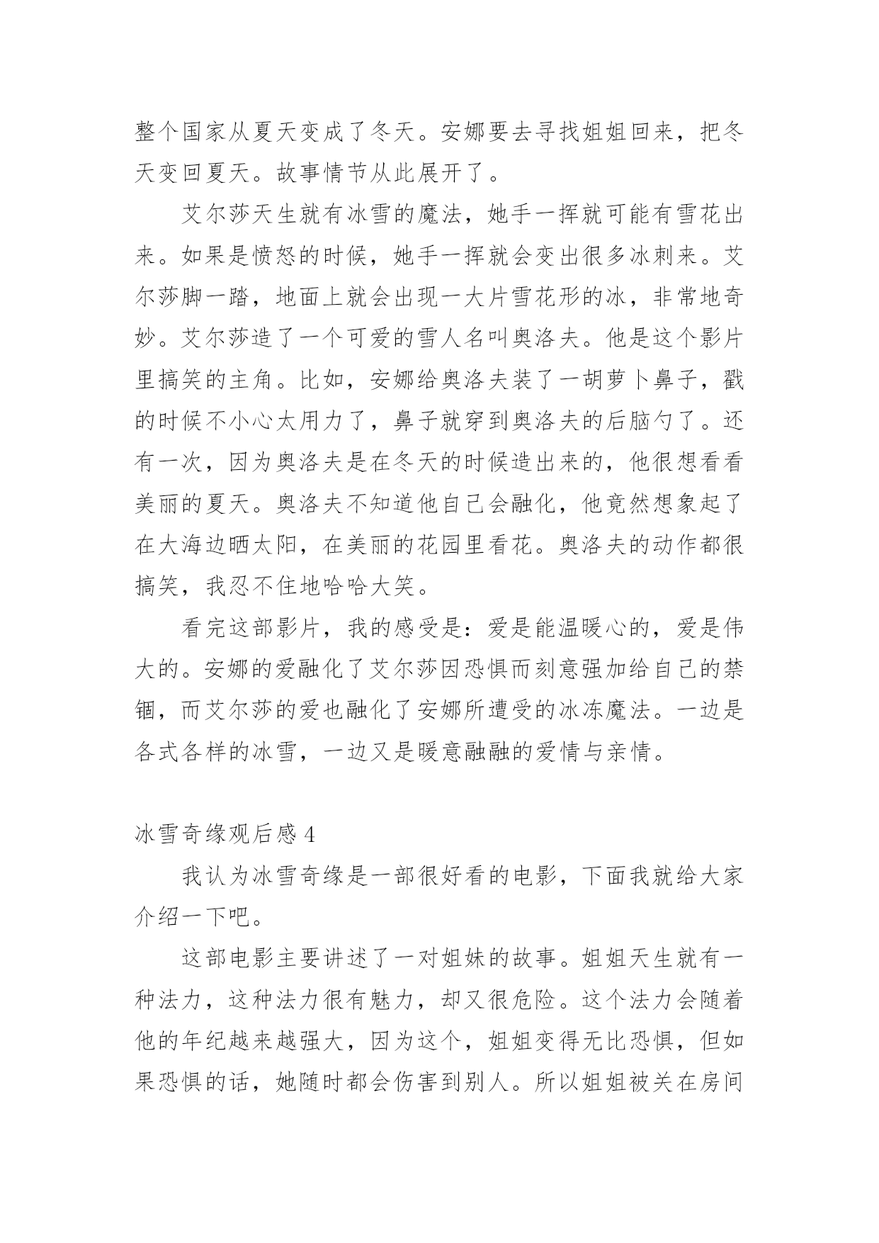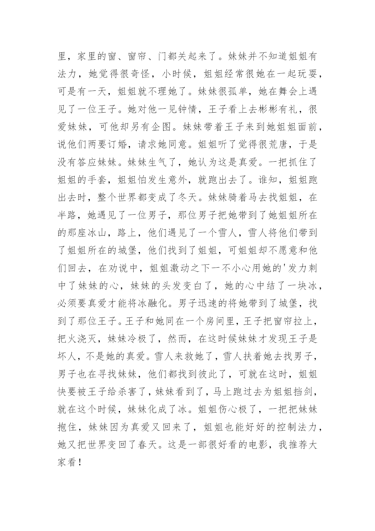 冰雪奇缘观后感(精品)冰雪奇缘观后感当看完一部影视作品后,对人生或者事物一定产生了许多感想吧,撰写观后感可以帮助我们提升自己。现在你是否对观后感一筹莫展呢?以下是小编收集整理的冰雪奇缘观后感,仅供参考,大家一起来看看吧。冰雪奇缘观后感1周末我看了《冰雪奇缘》这部电影,看完让我知道了:真爱可以感动一切。这部电影主要是讲二位美丽善良的公主:一天晚上,安娜公主睡不着,就爬到姐姐艾莎公主床上,闹着要姐姐的魔法来玩堆雪人。姐姐没办法就与妹妹一起堆雪人。接着又玩起了冰滑梯,就在这时姐姐一不小心滑倒了,魔法失控了!一下击中了妹妹的头。姐姐吓的大叫,把爸爸和妈妈引了过来。爸爸和妈妈立刻骑着“宝马”飞奔到了地精住的地方,地精把妹妹救了。但姐姐很担心再伤到别人就躲在房间不出来了。最后,爸爸、妈妈不幸死了。姐姐在加冕盛会的时候,妹妹安娜想和刚认识一天的`王子结婚,姐姐不同意。安娜就与姐姐吵了起来,姐姐一生气发动了魔法。大家都认为姐姐是怪物时妹妹不信。于是去找伤心逃走的姐姐。可是,这次姐姐艾莎又一次不小心发动了魔法把妹妹的心冰冻了起来。一个做冰块生意的人把安娜带到了地精住的地方。可是,地精说:不行,头可以治但心不行,必须要有真爱的人的吻才行!于是,做冰块生意的斯温决定带她回自己的王国去,让王子救她。可是那个王子没有救她还用水把火灭了,把她关在房间里。这时小雪人来了把火重新点燃。就在这时候天气变坏了,冰把房顶弄烂了。做生意的斯温也一路飞奔回来救安娜。安娜马上要得救时,她发现王子正拿着一把刀正准备往姐姐身上砍下去。安娜放弃了生命,用手挡刀。一下子安娜变成了冰人。正在大家都在哭的时候,泪水把冰解冻了,安娜复活了!姐姐也被真爱感动,知道了解除魔咒的方法,冬天又变回了夏天!从此他们又过上快乐的日子。这个电影就是要告诉我们:真爱可以感化一切!如果一个人没有爱心就会象王子一样变得可恶,遭人们讨厌。我也要做一个有爱心的人,真诚的与人交往,做人、做事正直向上。冰雪奇缘观后感2一样东西,一百个不同的人看到,可能会有一百种不同的结果。在迪尼斯动画片《冰雪奇缘》中,有的人可能看到了爱情,有的人可能看到了亲情,有的人可能看到了别的。对我来说,我感触比较深的是艾萨对于自由的理解过程。可能跟自己现实中也有很大的相像之处吧。影片中讲的死艾萨被发现有魔法后,就放纵自己,追求自由,想干嘛就干嘛,创造自己的冰雪世界,不再想被世俗所束缚。很好,这样,追求自由会让人更自信,更美丽,更快乐。我一直也是这么认为的,但是这真的是对的么。当艾萨发现自己的行为已经影响到自己的.国家(都是冰雪)之后,其实内心已经发现真正的自由不是这样的,放纵不是自由,即使有时候你自己认为你没有影响了别人,而别人却真真实实的被你所影响着,比如,父母,朋友,爱人……我们还年轻,往往喜欢口中经常说:我要追求自由,我不想被束缚。有时候想想,你想要的真的是真正的自由吗?还是,只是为了逃避一些约束或者束缚呢?那不是解决问题的根本方式,真正的自由不是放纵,更不是逃避。而是冷静地去解决一些问题,从中去权衡自己的自由。我还记得,我总是很自以为是地追求自己所认为的自由,特立独行,工作不顺心就裸辞,想要个单反就去买,虽然也是自己经过深思熟虑的。对父母的告诫从不放心上,总是觉得这是自己的事啊,我既然做决定了就会对自己的行为负责,你们瞎操什么心啊。我又没花你们的钱。觉得自己老高尚了。后来渐渐发现,我忽略了些东西,我一直认为我花自己的钱,走自己的路不会影响别人啥,但是事实上我影响了,我让父母为我前途担心,让他们面对亲友询问不知如何开口,而我自己只是随心所欲地做自己的事,不闻不问,自己听不到就觉得万事大吉。突然某一天,我发现这不是自由,我不能只考虑自己的感受。不然那只是片刻的欢愉,之后还是慢慢在孤独中消亡。我想,如果艾萨一直在冰宫呆着,会很快乐吗?我不觉得,活在自己的世界里纵然会有一时的快乐,但是人终究是群体动物,不可能真的独自生活,所以,生活中是没有绝对的自由的。我们要做的,就是如何去权衡这个东西,让自己和身边的人尽可能多的理解和快乐。冰雪奇缘观后感3这部影片写了妹妹安娜活泼可爱,姐姐艾尔沙有神奇的冰雪魔法。但是姐姐的魔法在气愤的时候发出的是冰尖;在高兴时发出的是纷纷扬扬的雪花。故事的开始写妹妹安娜找姐姐艾尔沙玩,缠着姐姐用魔法,玩跳“雪山”游戏,姐姐玩着玩着,一不小心滑到了,没有及时变出“雪山”,安娜跳空了,把头伤了。国王和王后听到艾尔沙的喊声也来了,看到安娜生命危急,找到地精,地精告诉国王安娜伤的不是心,是头,一会儿可以治好。但是要让姐姐学会控制魔法。艾尔沙担心再次伤到人,就把自己关了起来。三年后,宫殿的大门都打开了,艾尔沙要接管整个国家。妹妹也高兴地跳来跳去,这时她认识了来参加开城仪式的汉斯,被汉斯的花言巧语给迷惑了,安娜想与汉斯结婚。