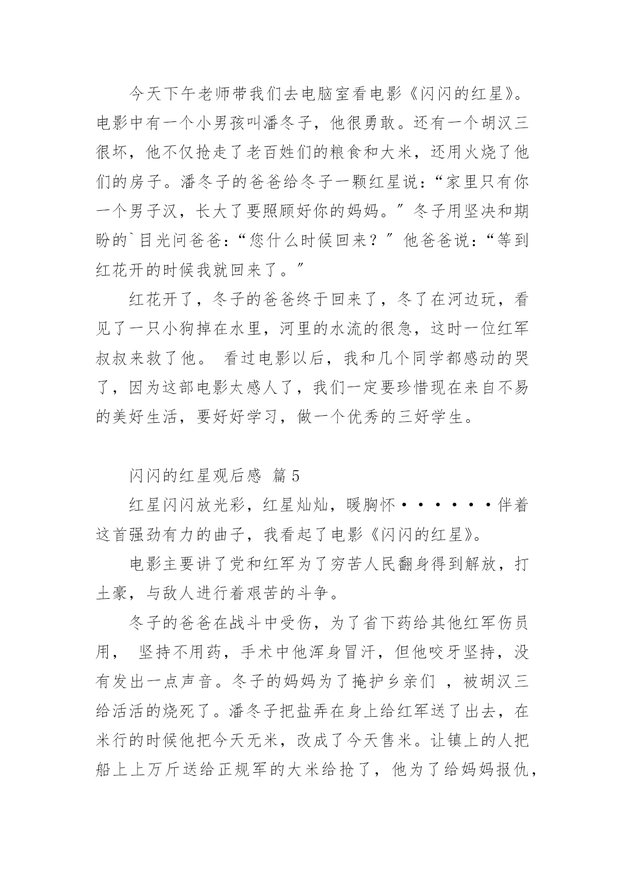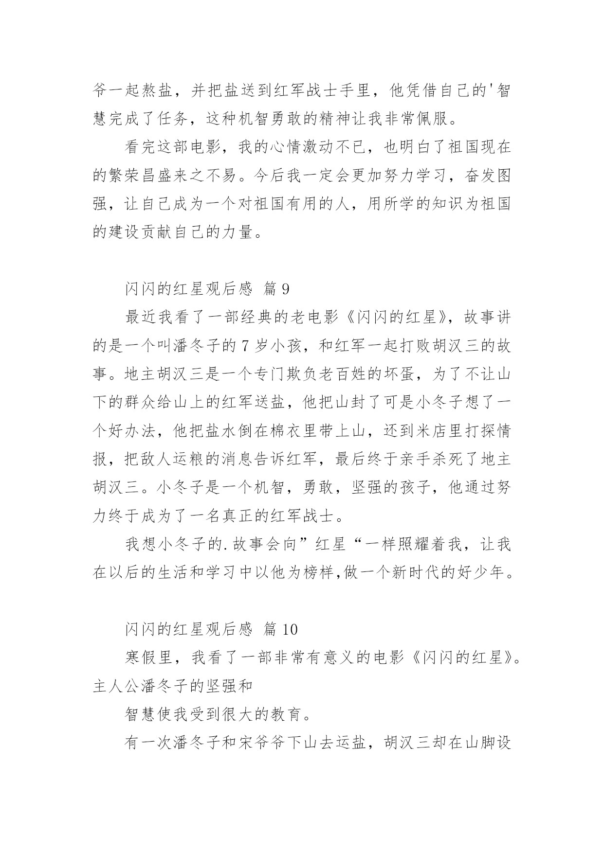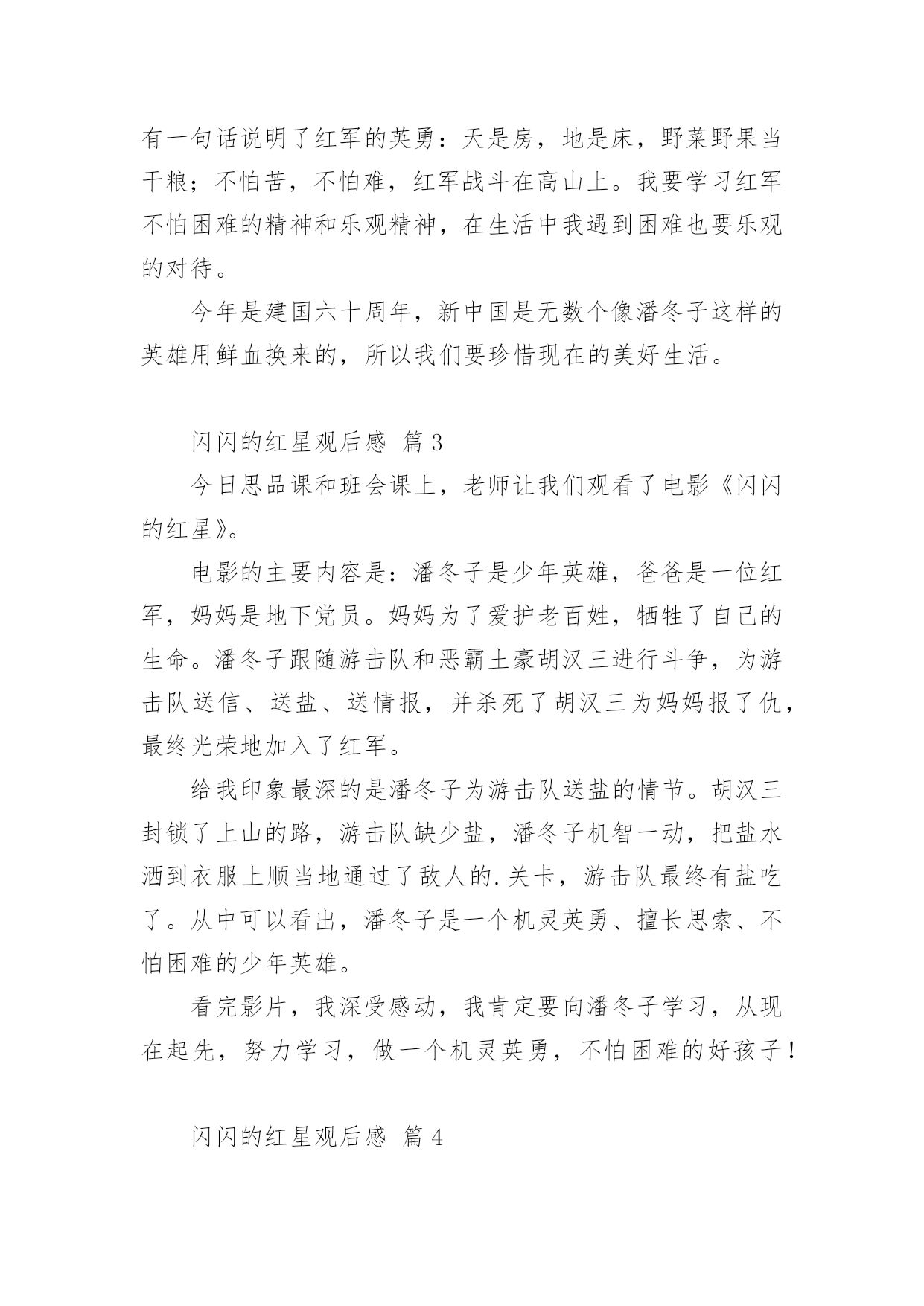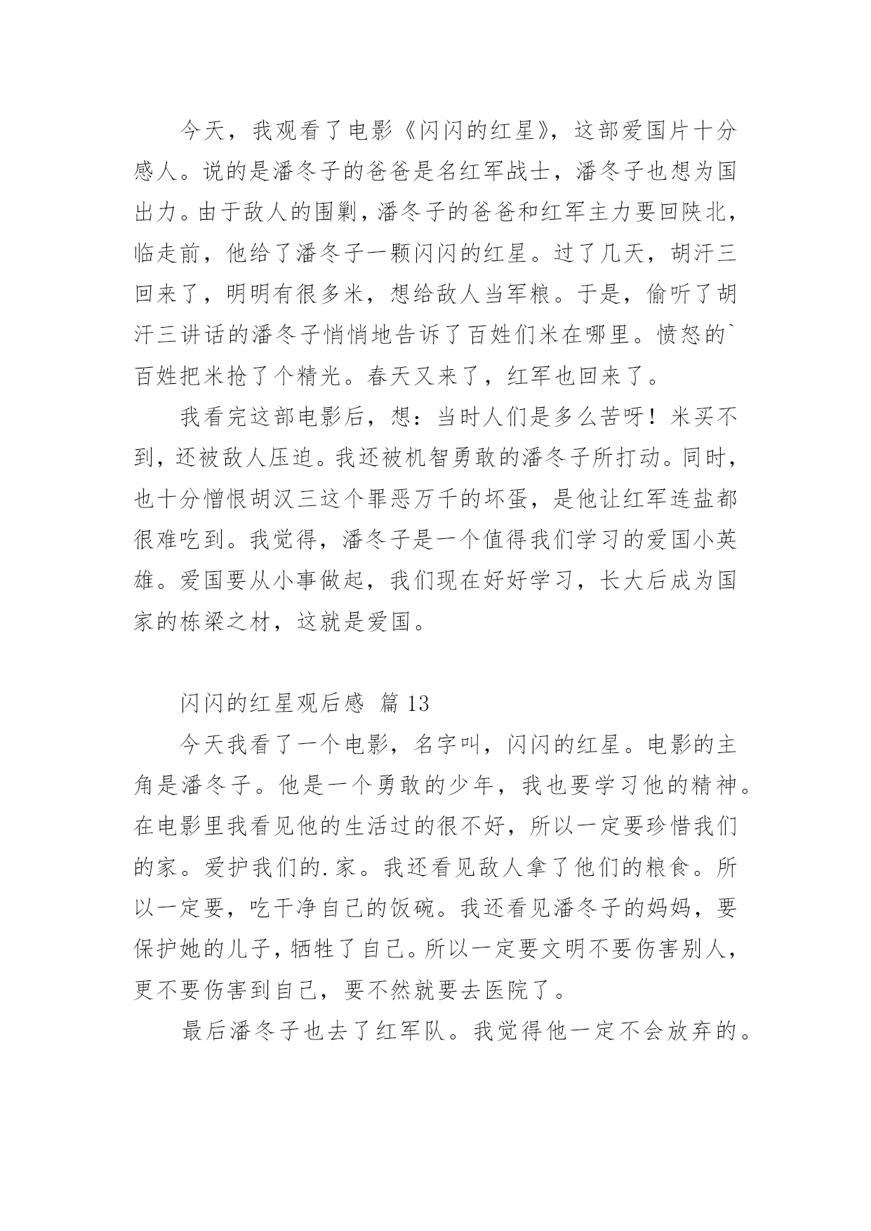闪闪的红星观后感当看完一部影视作品后,这次观看让你心中有什么感想呢?这时候,最关键的观后感怎么能落下!那么我们如何去写观后感呢?下面是小编收集整理的闪闪的红星观后感,希望能够帮助到大家。闪闪的红星观后感篇1今天下午,老师让我们看了电影《闪闪的红星》。讲的是潘冬子和游击队联手对抗恶霸的精彩故事,潘冬子的爸爸是红军团长,他的妈妈是地下党成员,他妈妈为了党的.工作献出了宝贵的生命。潘冬子后来也靠自己的机智和勇敢成为一名共产儿童团员,他说:"无论什么困难我都不怕,党叫我做什么,我就做什么,我就是党的孩子。"看完了后,我感觉潘冬子很机智,也很勇敢,最后还杀死了胡三汉,成为了一名”小红军“。我们一定要努力学习,刻苦钻研,做个能为社会的发展作出贡献的人。闪闪的红星观后感篇2我读了《闪闪的红星》这本书,它是说红军和国民党的军队打仗的时候潘冬子的爸爸出去打仗,潘冬子的`妈妈牺牲了,他英勇杀敌成为了红军战士。我读了这本书的感想:读了这本书,我要向潘冬子学习他的机智、勇敢、不怕苦、不怕难,真是个小英雄啊!特别有一句话说明了红军的英勇:天是房,地是床,野菜野果当干粮;不怕苦,不怕难,红军战斗在高山上。我要学习红军不怕困难的精神和乐观精神,在生活中我遇到困难也要乐观的对待。今年是建国六十周年,新中国是无数个像潘冬子这样的英雄用鲜血换来的,所以我们要珍惜现在的美好生活。闪闪的红星观后感篇3今日思品课和班会课上,老师让我们观看了电影《闪闪的红星》。电影的主要内容是:潘冬子是少年英雄,爸爸是一位红军,妈妈是地下党员。妈妈为了爱护老百姓,牺牲了自己的生命。潘冬子跟随游击队和恶霸土豪胡汉三进行斗争,为游击队送信、送盐、送情报,并杀死了胡汉三为妈妈报了仇,最终光荣地加入了红军。给我印象最深的是潘冬子为游击队送盐的情节。胡汉三封锁了上山的路,游击队缺少盐,潘冬子机智一动,把盐水洒到衣服上顺当地通过了敌人的.关卡,游击队最终有盐吃了。从中可以看出,潘冬子是一个机灵英勇、擅长思索、不怕困难的少年英雄。看完影片,我深受感动,我肯定要向潘冬子学习,从现在起先,努力学习,做一个机灵英勇,不怕困难的好孩子!闪闪的红星观后感篇4今天下午老师带我们去电脑室看电影《闪闪的红星》。电影中有一个小男孩叫潘冬子,他很勇敢。还有一个胡汉三很坏,他不仅抢走了老百姓们的粮食和大米,还用火烧了他们的房子。潘冬子的爸爸给冬子一颗红星说:“家里只有你一个男子汉,长大了要照顾好你的妈妈。〞冬子用坚决和期盼的`目光问爸爸:“您什么时候回来?〞他爸爸说:“等到红花开的时候我就回来了。〞红花开了,冬子的爸爸终于回来了,冬了在河边玩,看见了一只小狗掉在水里,河里的水流的很急,这时一位红军叔叔来救了他。看过电影以后,我和几个同学都感动的哭了,因为这部电影太感人了,我们一定要珍惜现在来自不易的美好生活,要好好学习,做一个优秀的三好学生。闪闪的红星观后感篇5红星闪闪放光彩,红星灿灿,暖胸怀······伴着这首强劲有力的曲子,我看起了电影《闪闪的红星》。电影主要讲了党和红军为了穷苦人民翻身得到解放,打土豪,与敌人进行着艰苦的斗争。冬子的爸爸在战斗中受伤,为了省下药给其他红军伤员用,坚持不用药,手术中他浑身冒汗,但他咬牙坚持,没有发出一点声音。冬子的妈妈为了掩护乡亲们,被胡汉三给活活的烧死了。潘冬子把盐弄在身上给红军送了出去,在米行的时候他把今天无米,改成了今天售米。让镇上的人把船上上万斤送给正规军的大米给抢了,他为了给妈妈报仇,还亲手把胡汉三给砍死了。看完这部电影后,我觉得冬子很勇敢,他不怕死,他不怕苦。我要像冬子那样,时刻不忘自己肩负的'责任。我们现在的生活,是他们为我们争取的。我们要好好学习,天天向上。闪闪的红星观后感篇6在学校看了闪闪的红星这个微电影,里面的故事非常的感人,看完后,我感触很深……这个电影主要是讲了冬子的`爸爸是当兵的,冬子长大后也想要去当兵,他先加入了儿童团,他听说他爸爸打了胜仗便回家找他爸爸,谁知他爸爸中了子弹,医生正在取子弹,冬子认为他爸爸很伟大,为了留一些药,竟然连麻药都没有打……后来红军走了,胡汉三回到他们的村子,他们趁着天黑,逃了出去……之后冬子处处帮助红军,成了一个伟大的人……我认为,我们要向冬子一样学会保护我们的祖国,我们的祖国曾受过屈辱,我们要牢记历史,以后成为祖国的栋梁,成为为祖国尽力的一份子。闪闪的红星观后感篇7今天我看的电影是《红星闪闪》,非常感人。电影讲的是一个勇敢机智的小男孩叫潘冬子,他生活在一个小山村里,地主胡汉三整天欺负老百姓,如果谁不听他的话,就要被鞭子抽打。后来潘冬子的爸爸参加了红军,临走前留给他一颗闪闪的红星,要冬子学会坚强。冬子和妈妈一起坚难的生活着,为了掩护红军和乡亲们撤退,冬子妈妈被活活烧死不幸牺牲了,妈妈的`死让冬子坚强了许多。后来冬子参加了战斗,破