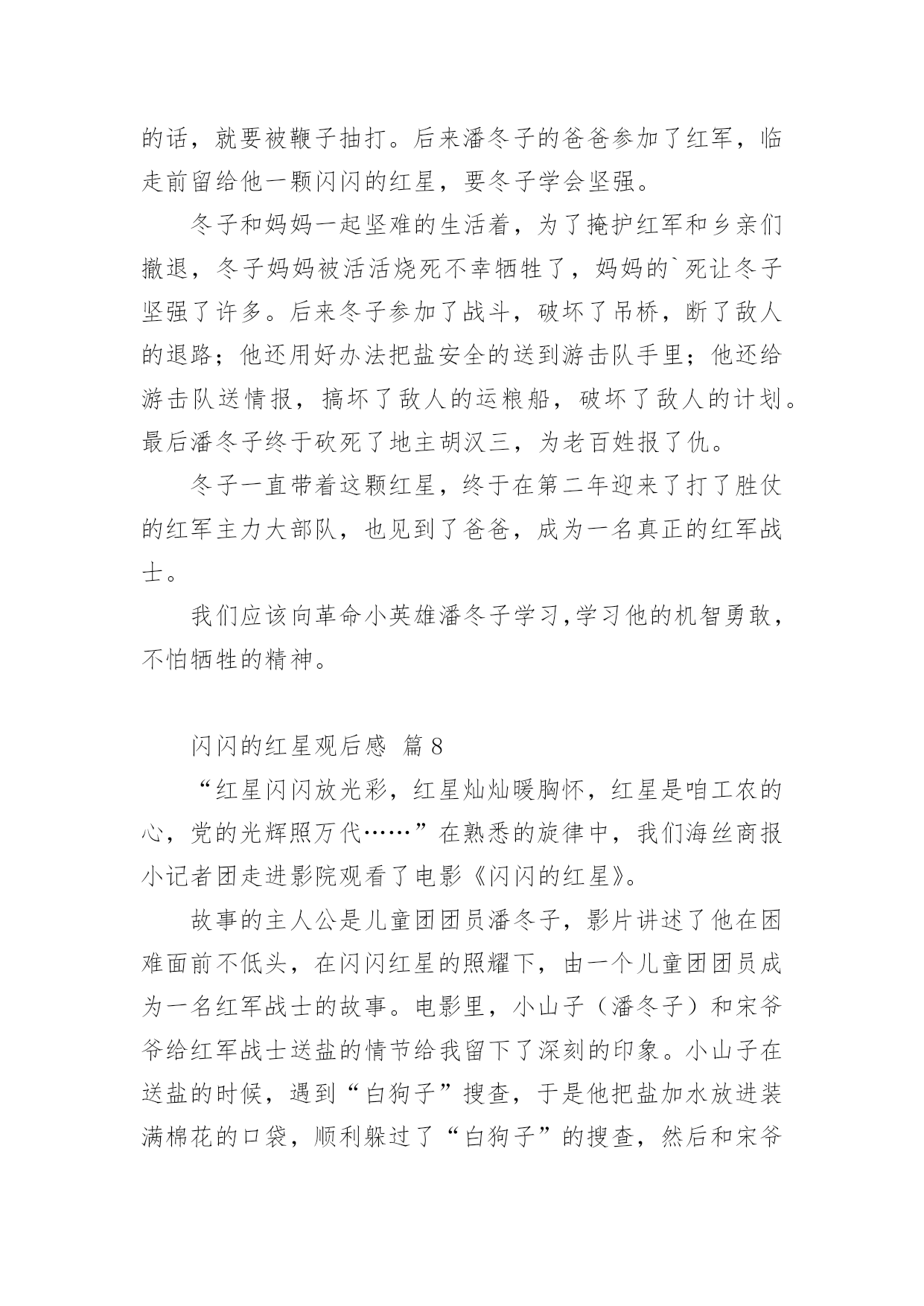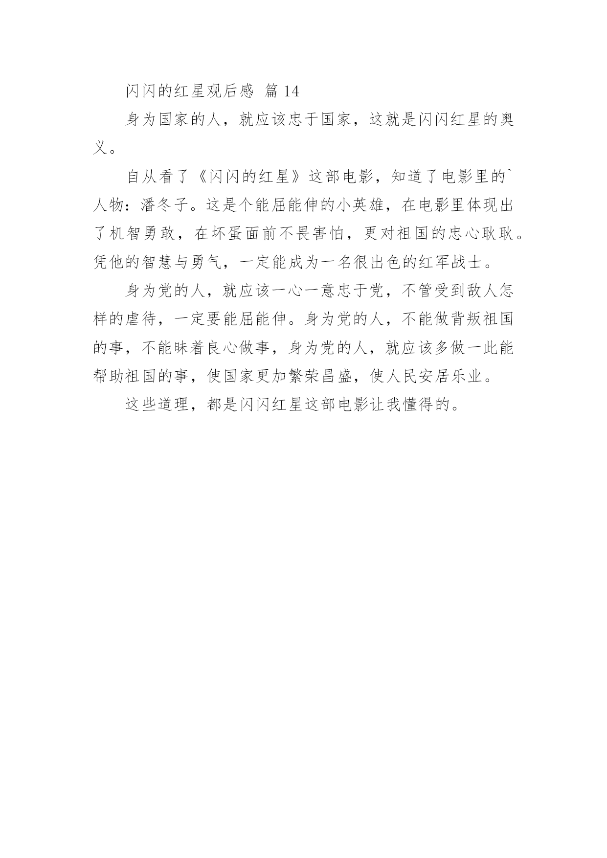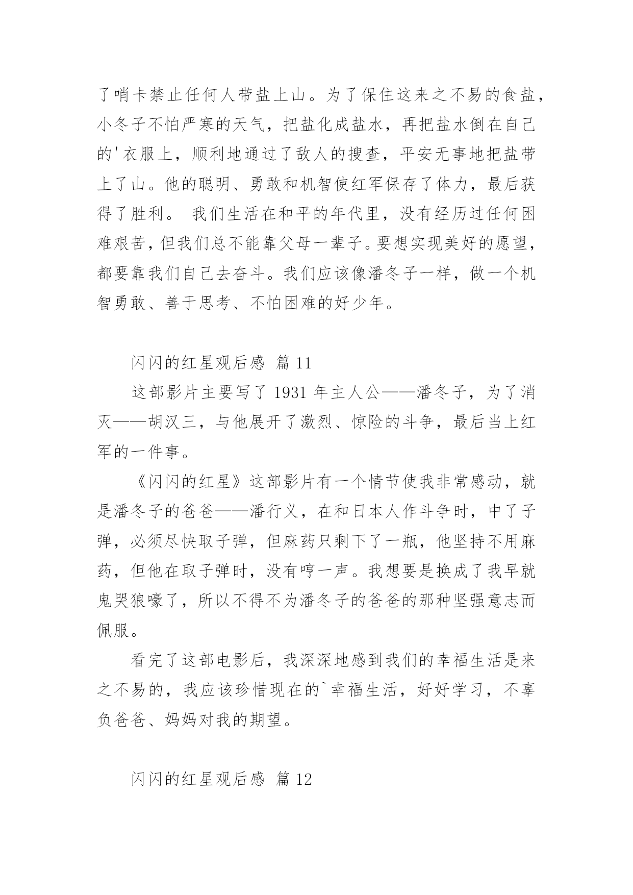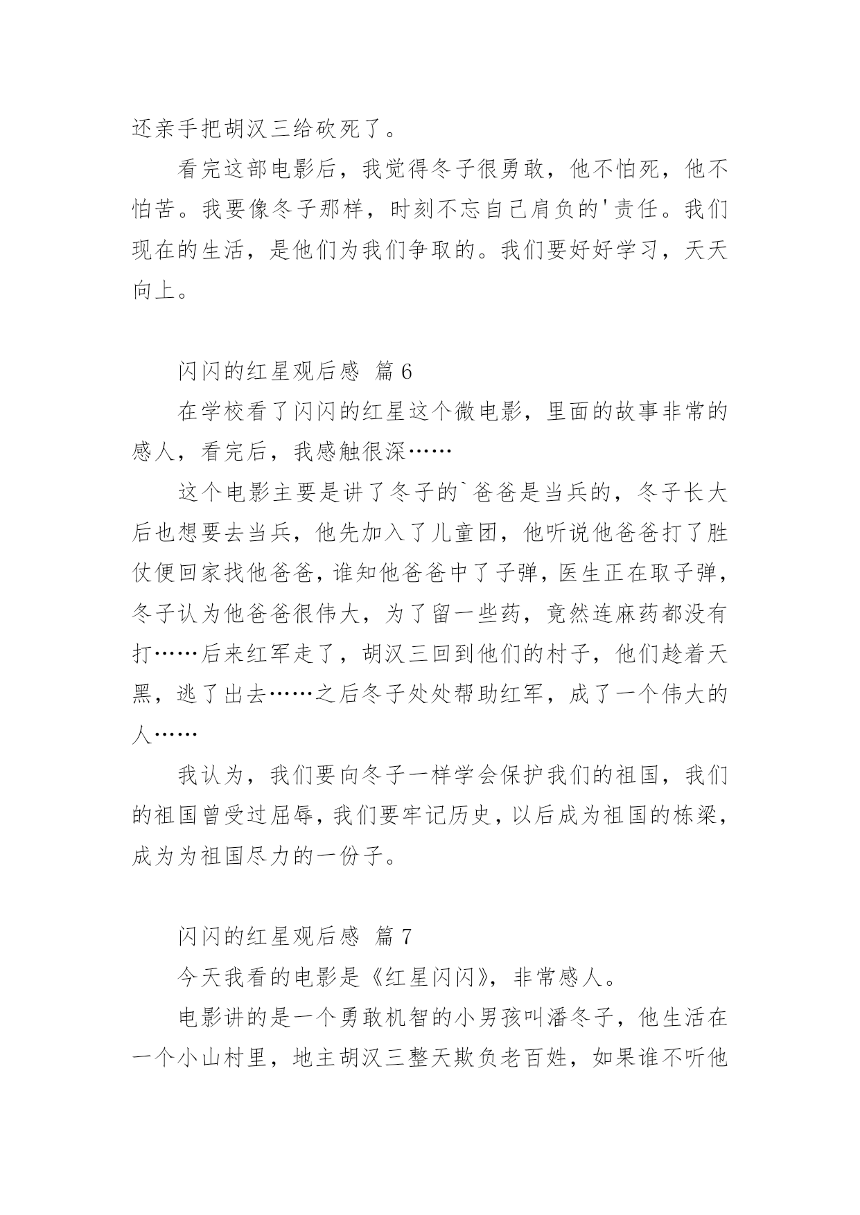 闪闪的红星观后感当看完一部影视作品后,这次观看让你心中有什么感想呢?这时候,最关键的观后感怎么能落下!那么我们如何去写观后感呢?下面是小编收集整理的闪闪的红星观后感,希望能够帮助到大家。闪闪的红星观后感篇1今天下午,老师让我们看了电影《闪闪的红星》。讲的是潘冬子和游击队联手对抗恶霸的精彩故事,潘冬子的爸爸是红军团长,他的妈妈是地下党成员,他妈妈为了党的.工作献出了宝贵的生命。潘冬子后来也靠自己的机智和勇敢成为一名共产儿童团员,他说:"无论什么困难我都不怕,党叫我做什么,我就做什么,我就是党的孩子。"看完了后,我感觉潘冬子很机智,也很勇敢,最后还杀死了胡三汉,成为了一名”小红军“。我们一定要努力学习,刻苦钻研,做个能为社会的发展作出贡献的人。闪闪的红星观后感篇2我读了《闪闪的红星》这本书,它是说红军和国民党的军队打仗的时候潘冬子的爸爸出去打仗,潘冬子的`妈妈牺牲了,他英勇杀敌成为了红军战士。我读了这本书的感想:读了这本书,我要向潘冬子学习他的机智、勇敢、不怕苦、不怕难,真是个小英雄啊!特别有一句话说明了红军的英勇:天是房,地是床,野菜野果当干粮;不怕苦,不怕难,红军战斗在高山上。我要学习红军不怕困难的精神和乐观精神,在生活中我遇到困难也要乐观的对待。今年是建国六十周年,新中国是无数个像潘冬子这样的英雄用鲜血换来的,所以我们要珍惜现在的美好生活。闪闪的红星观后感篇3今日思品课和班会课上,老师让我们观看了电影《闪闪的红星》。电影的主要内容是:潘冬子是少年英雄,爸爸是一位红军,妈妈是地下党员。妈妈为了爱护老百姓,牺牲了自己的生命。潘冬子跟随游击队和恶霸土豪胡汉三进行斗争,为游击队送信、送盐、送情报,并杀死了胡汉三为妈妈报了仇,最终光荣地加入了红军。给我印象最深的是潘冬子为游击队送盐的情节。胡汉三封锁了上山的路,游击队缺少盐,潘冬子机智一动,把盐水洒到衣服上顺当地通过了敌人的.关卡,游击队最终有盐吃了。从中可以看出,潘冬子是一个机灵英勇、擅长思索、不怕困难的少年英雄。看完影片,我深受感动,我肯定要向潘冬子学习,从现在起先,努力学习,做一个机灵英勇,不怕困难的好孩子!闪闪的红星观后感篇4今天下午老师带我们去电脑室看电影《闪闪的红星》。电影中有一个小男孩叫潘冬子,他很勇敢。还有一个胡汉三很坏,他不仅抢走了老百姓们的粮食和大米,还用火烧了他们的房子。潘冬子的爸爸给冬子一颗红星说:“家里只有你一个男子汉,长大了要照顾好你的妈妈。〞冬子用坚决和期盼的`目光问爸爸:“您什么时候回来?〞他爸爸说:“等到红花开的时候我就回来了。〞红花开了,冬子的爸爸终于回来了,冬了在河边玩,看见了一只小狗掉在水里,河里的水流的很急,这时一位红军叔叔来救了他。看过电影以后,我和几个同学都感动的哭了,因为这部电影太感人了,我们一定要珍惜现在来自不易的美好生活,要好好学习,做一个优秀的三好学生。闪闪的红星观后感篇5红星闪闪放光彩,红星灿灿,暖胸怀······伴着这首强劲有力的曲子,我看起了电影《闪闪的红星》。电影主要讲了党和红军为了穷苦人民翻身得到解放,打土豪,与敌人进行着艰苦的斗争。冬子的爸爸在战斗中受伤,为了省下药给其他红军伤员用,坚持不用药,手术中他浑身冒汗,但他咬牙坚持,没有发出一点声音。冬子的妈妈为了掩护乡亲们,被胡汉三给活活的烧死了。潘冬子把盐弄在身上给红军送了出去,在米行的时候他把今天无米,改成了今天售米。让镇上的人把船上上万斤送给正规军的大米给抢了,他为了给妈妈报仇,还亲手把胡汉三给砍死了。看完这部电影后,我觉得冬子很勇敢,他不怕死,他不怕苦。我要像冬子那样,时刻不忘自己肩负的'责任。我们现在的生活,是他们为我们争取的。我们要好好学习,天天向上。闪闪的红星观后感篇6在学校看了闪闪的红星这个微电影,里面的故事非常的感人,看完后,我感触很深……这个电影主要是讲了冬子的`爸爸是当兵的,冬子长大后也想要去当兵,他先加入了儿童团,他听说他爸爸打了胜仗便回家找他爸爸,谁知他爸爸中了子弹,医生正在取子弹,冬子认为他爸爸很伟大,为了留一些药,竟然连麻药都没有打……后来红军走了,胡汉三回到他们的村子,他们趁着天黑,逃了出去……之后冬子处处帮助红军,成了一个伟大的人……我认为,我们要向冬子一样学会保护我们的祖国,我们的祖国曾受过屈辱,我们要牢记历史,以后成为祖国的栋梁,成为为祖国尽力的一份子。闪闪的红星观后感篇7今天我看的电影是《红星闪闪》,非常感人。电影讲的是一个勇敢机智的小男孩叫潘冬子,他生活在一个小山村里,地主胡汉三整天欺负老百姓,如果谁不听他的话,就要被鞭子抽打。后来潘冬子的爸爸参加了红军,临走前留给他一颗闪闪的红星,要冬子学会坚强。冬子和妈妈一起坚难的生活着,为了掩护红军和乡亲们撤退,冬子妈妈被活活烧死不幸牺牲了,妈妈的`死让冬子坚强了许多。后来冬子参加了战斗,破