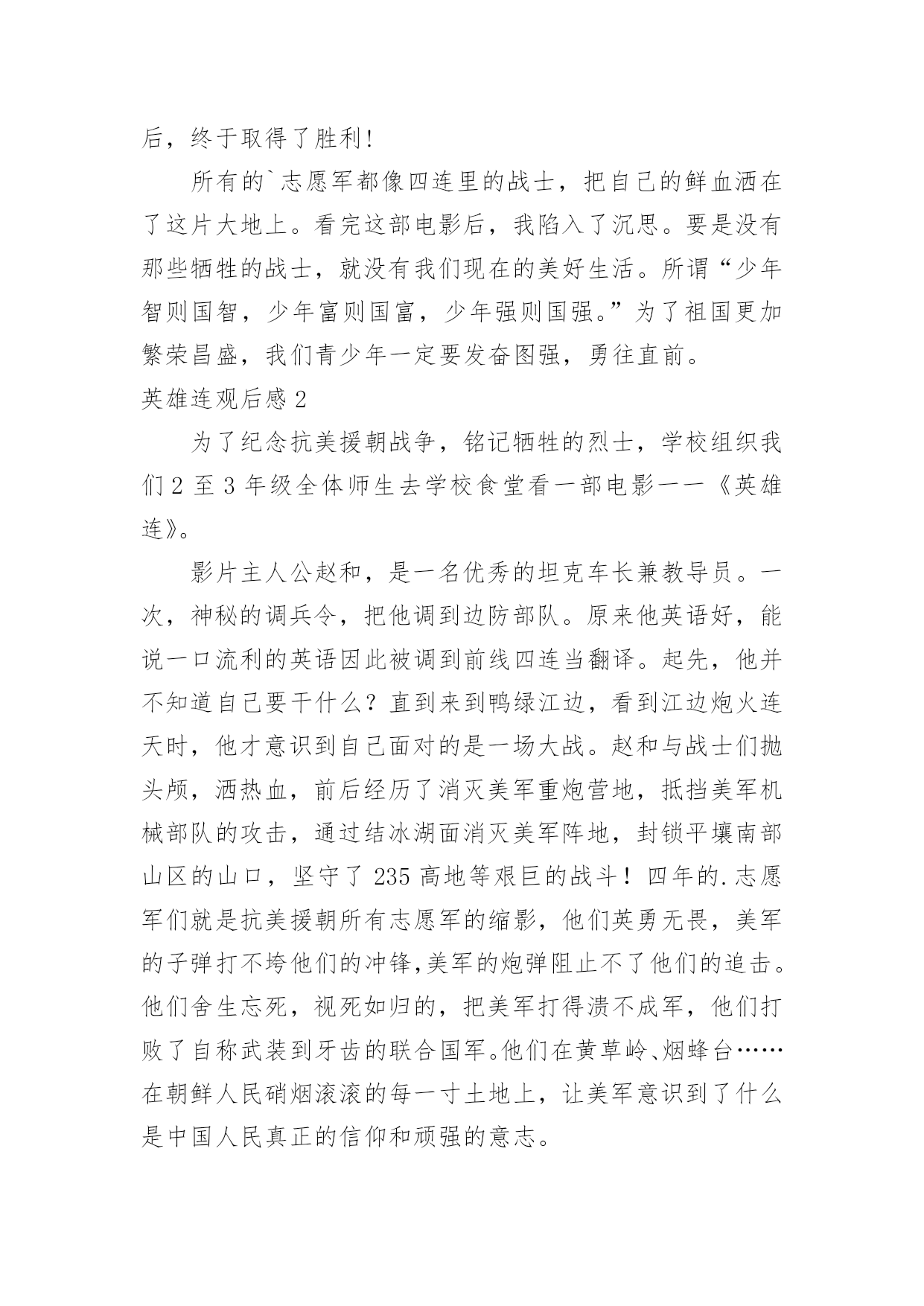英雄连观后感英雄连观后感观看完作品之后,内心会产生很多感慨,从中我们收获新的思想,很多人观看之后都有不一样的心情。在写观后感之前,可以先参考范文,以下是小编整理的英雄连观后感,供大家参考借鉴,希望可以帮助到有需要的朋友。英雄连观后感1在这和平的年代,谁会想到战争这两个字呢?正因如此,学校为了激发我们的爱国热情,所以才有了爱国主义影片进校园这个活动。我们这次观看的电影是《英雄连》。它主要讲述的主人公是赵和,他本来是一名优秀的坦克车长兼教导员。因为边防缺乏翻译员,正好他的英语很好,就被调到了边防军的前线四连当翻译。他坐火车到鸭绿江时,才知道这是一个硝烟弥漫的战场。赵和和战士们用一把把步枪消灭了美军,抵挡了美军机械化军队,通过冰湖消灭了美军的阵地,封锁了平壤南部山区山口,坚守了.铁原等艰巨任务。途中,赵和因为在坦克上指挥,而被狙击手射中脑颅,送到后方治疗,过了六个月后才康复。但在这六个月里,战士们又牺牲了很多。尤其是那那次雨林大战中,有些战士因为失血过多,抢救无效牺牲了。当二排长赵和重新回到战队中时,成为了四连长。他带领着战士们进行又一次战斗,最后,终于取得了胜利!所有的`志愿军都像四连里的战士,把自己的鲜血洒在了这片大地上。看完这部电影后,我陷入了沉思。要是没有那些牺牲的战士,就没有我们现在的美好生活。所谓“少年智则国智,少年富则国富,少年强则国强。”为了祖国更加繁荣昌盛,我们青少年一定要发奋图强,勇往直前。英雄连观后感2为了纪念抗美援朝战争,铭记牺牲的烈士,学校组织我们2至3年级全体师生去学校食堂看一部电影一一《英雄连》。影片主人公赵和,是一名优秀的坦克车长兼教导员。一次,神秘的调兵令,把他调到边防部队。原来他英语好,能说一口流利的英语因此被调到前线四连当翻译。起先,他并不知道自己要干什么?直到来到鸭绿江边,看到江边炮火连天时,他才意识到自己面对的是一场大战。赵和与战士们抛头颅,洒热血,前后经历了消灭美军重炮营地,抵挡美军机械部队的攻击,通过结冰湖面消灭美军阵地,封锁平壤南部山区的山口,坚守了235高地等艰巨的战斗!四年的.志愿军们就是抗美援朝所有志愿军的缩影,他们英勇无畏,美军的子弹打不垮他们的冲锋,美军的炮弹阻止不了他们的追击。他们舍生忘死,视死如归的,把美军打得溃不成军,他们打败了自称武装到牙齿的联合国军。他们在黄草岭、烟蜂台……在朝鲜人民硝烟滚滚的每一寸土地上,让美军意识到了什么是中国人民真正的信仰和顽强的意志。我想,如果我是战场上的一名战士,我肯定不会像他们那么勇敢!在学习上,我遇到一些困难就轻易放弃,不像志愿军战士们,他们不管面对多大的困难,都会勇敢克服,在此,我想对英烈们说:“请安息吧!你们舍弃自己,为我们带来了和平与幸福,我们一定不会辜负你们!