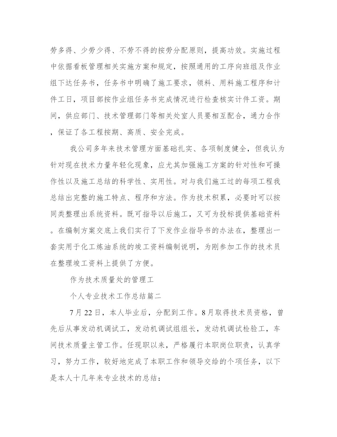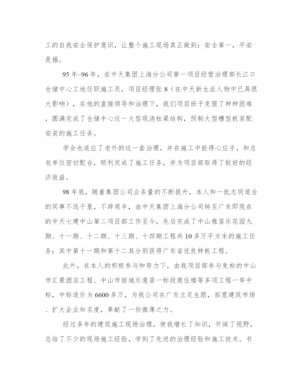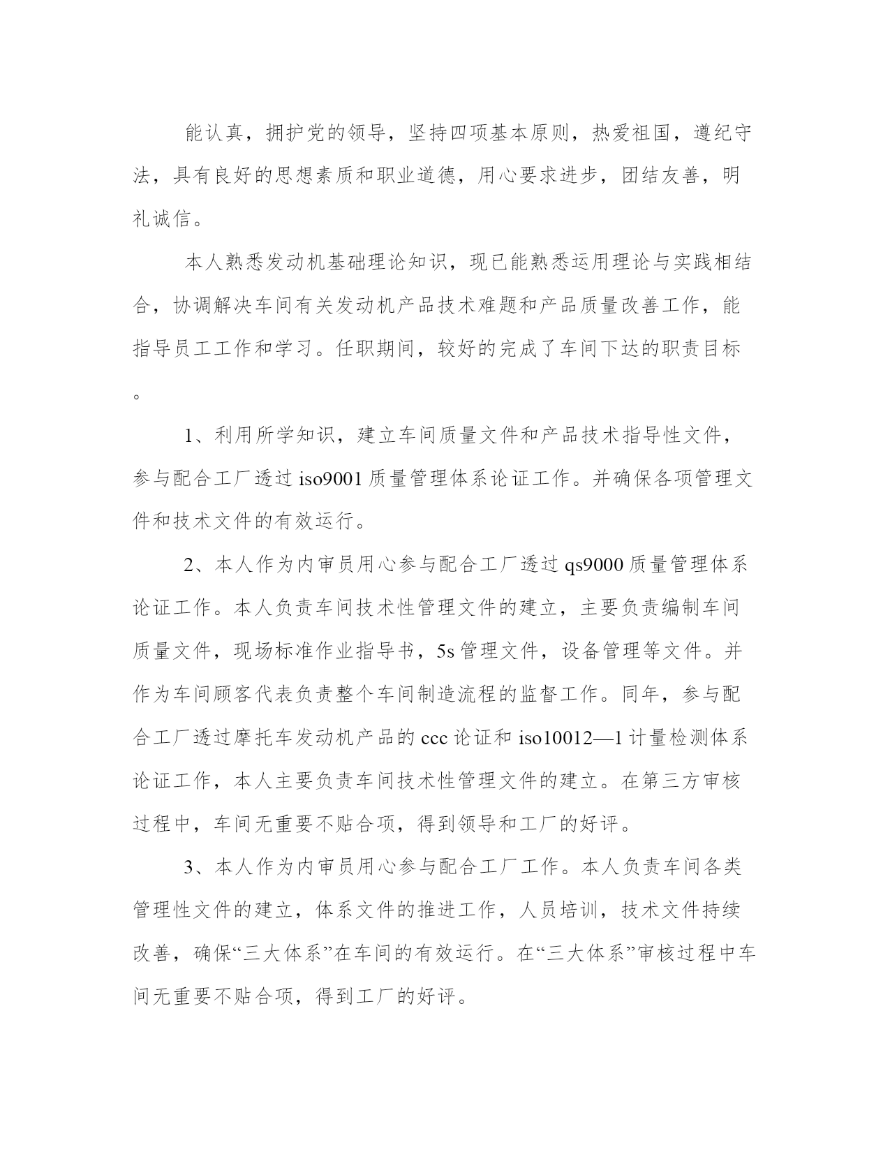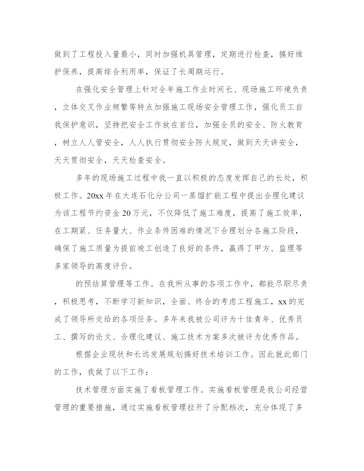 最新个人专业技术工作总结(汇总16篇)总结是对自己工作和生活的一种自我评价和反思。如何写一篇完美的总结一直是大家关注的问题之一。在此分享一些实用的总结模板,供大家参考和应用。个人专业技术工作总结篇一200x年到200x年先后在xx乙烯厂10万吨/年乙烯挖潜技术改造项目、xx乙烯厂15万吨/年聚乙烯挖潜技术改造项目、xx炼油厂140万吨/年催化裂化技术改造工程、大连石化分公司一蒸馏扩能改造工程中从事施工管理工作,在这些施工中,我强化质量管理、成本管理、进度管理、安全管理。在质量管理上我把加强质量终身责任制的管理,明确责任,强化管理责任卡做为施工过程中的重点,这样保证了施工各道工序质量合格,同时加大对质量的日常管理工作,做到本道工序不合格不得进行下道工序施工,保证每到工序受控。同时加强了施工开工前的技术交底、方案的编制和执行监督工作。施工中严格执行各类标准,加强了过程质量控制,实行质量工资制,优质优价,对创建精品工程起到了推动作用。在成本管理上,在施工前认真做好成本预测,在施工中对成本管理实施动态监控管理,使工程成本始终在有序可控的管理体系下运行。实际施工中禁止现场出现大面积返工现象,合理用料,利旧利废,做到了工程投入量最小,同时加强机具管理,定期进行检查,搞好维护保养,提高综合利用率,保证了长周期运行。在强化安全管理上针对全年施工作业时间长、现场施工环境负责,立体交叉作业频繁等特点加强施工现场安全管理工作,强化员工自我保护意识,坚持把安全工作放在首位,加强全员的安全、防火教育,树立人人管安全,人人执行贯彻安全防火规定,做到天天讲安全,天天贯彻安全,天天检查安全。多年的现场施工过程中我一直以积极的态度发挥自己的长处,积极工作。20xx年在大连石化分公司一蒸馏扩能工程中提出合理化建议为该工程节约资金20万元,不仅降低了施工难度,提高了施工效率,在工期紧、任务量大、作业条件困难的情况下合理划分各施工阶段,确保了施工质量为提前竣工创造了良好的条件,赢得了甲方、监理等多家领导的高度评价。的预结算管理等工作。在我所从事的各项工作中,都能尽职尽责,积极思考,不断学习新知识,全面、终合的考虑工程施工,xx的完成了领导所交给的各项任务。多年来我被公司评为十佳青年、优秀员工、撰写的论文、合理化建议、施工技术方案多次被评为优秀作品。根据企业现状和长远发展规划搞好技术培训工作。因此就此部门的工作,我做了以下工作:技术管理方面实施了看板管理工作。实施看板管理是我公司经营管理的重要措施,通过实施看板管理拉开了分配档次,充分体现了多劳多得、少劳少得、不劳不得的按劳分配原则,提高功效。实施过程中依据看板管理相关实施方案和规定,按照通用的工序向班组及作业组下达任务书,任务书中明确了施工要求,领料、用料施工程序和计件工日,项目部按作业组任务书完成情况进行检查核实计件工资。期间,供应部门、技术管理部门等相关处室人员要相互配合,通力合作,保证了各工程按期、高质、安全完成。我公司多年来技术管理方面基础扎实、各项制度健全,但我认为针对现在技术力量年轻化现象,应尤其加强施工方案的针对性和可操作性以及施工总结的科学性、实用性。对与我们施工过的每项工程我总结出完整的施工特点、程序和方法。作为技术积累,必要时可以按同类整理出系统资料。既可指导以后施工,又可为投标提供基础资料。在编制方案交底上我们实行了下发作业指导书的办法在,整理出一套实用于化工炼油系统的竣工资料编制说明,为刚参加工作的技术员在整理竣工资料上提供了方便。作为技术质量处的管理工个人专业技术工作总结篇二7月22日,本人毕业后,分配到工作。8月取得技术员资格,曾先后从事发动机调试工,发动机调试组组长,发动机调试检验工,车间技术质量主管工作。任现职以来,严格履行本职岗位职责,认真学习,努力工作,较好地完成了本职工作和领导交给的个项任务,以下是本人十几年来专业技术的总结:能认真,拥护党的领导,坚持四项基本原则,热爱祖国,遵纪守法,具有良好的思想素质和职业道德,用心要求进步,团结友善,明礼诚信。本人熟悉发动机基础理论知识,现已能熟悉运用理论与实践相结合,协调解决车间有关发动机产品技术难题和产品质量改善工作,能指导员工工作和学习。任职期间,较好的完成了车间下达的职责目标。1、利用所学知识,建立车间质量文件和产品技术指导性文件,参与配合工厂透过iso9001质量管理体系论证工作。并确保各项管理文件和技术文件的有效运行。2、本人作为内审员用心参与配合工厂透过qs9000质量管理体系论证工作。本人负责车间技术性管理文件的建立,主要负责编制车间质量文件,现场标准作业指导书,5s管理文件,设备管理等文件。并作为车间顾客代表负责整个车间制造流程的监督工作。同年,参与配合工厂透过摩托车发动机产品的ccc论