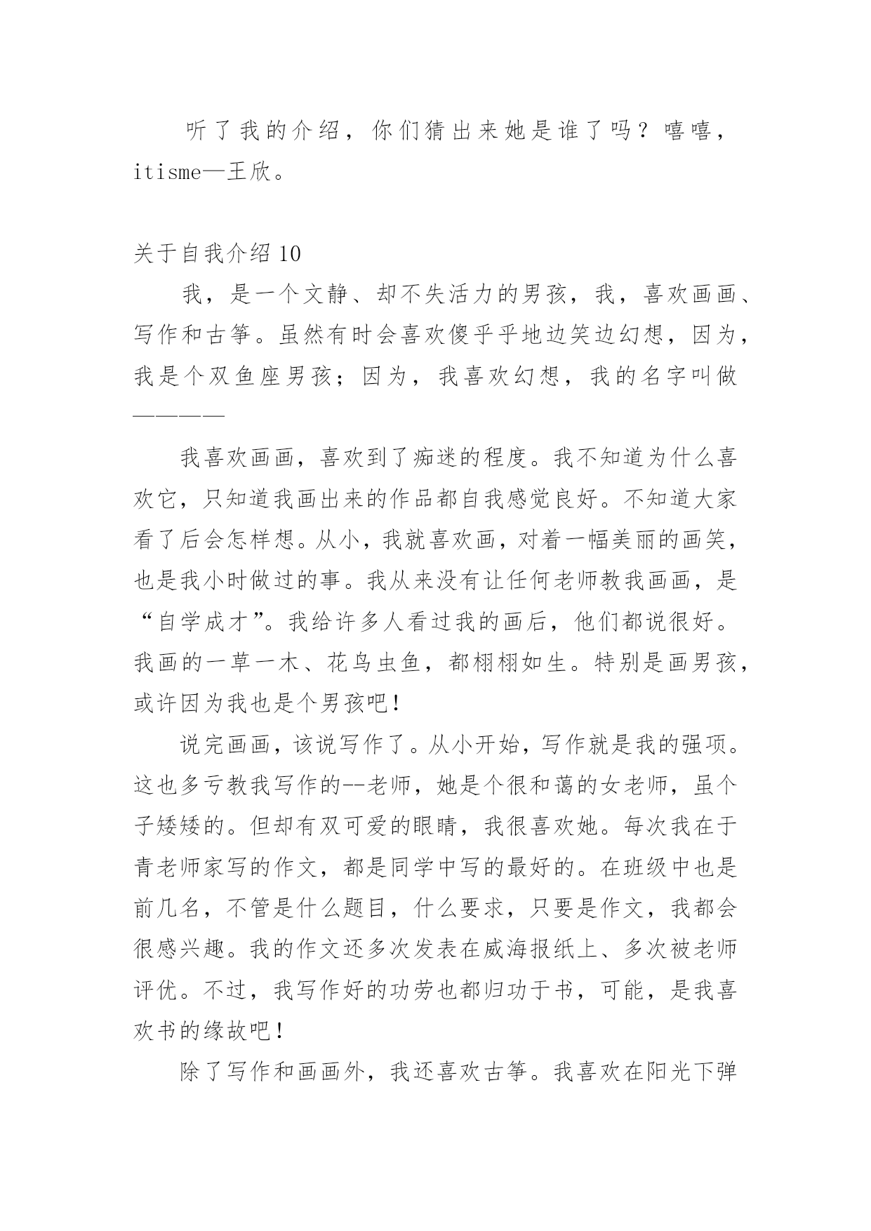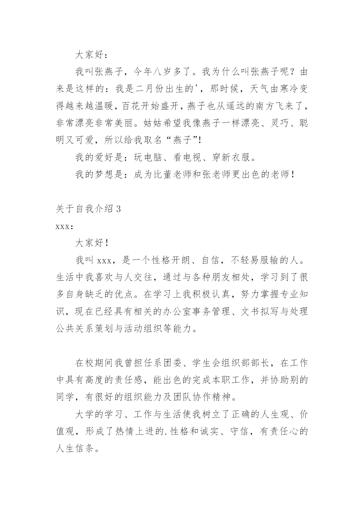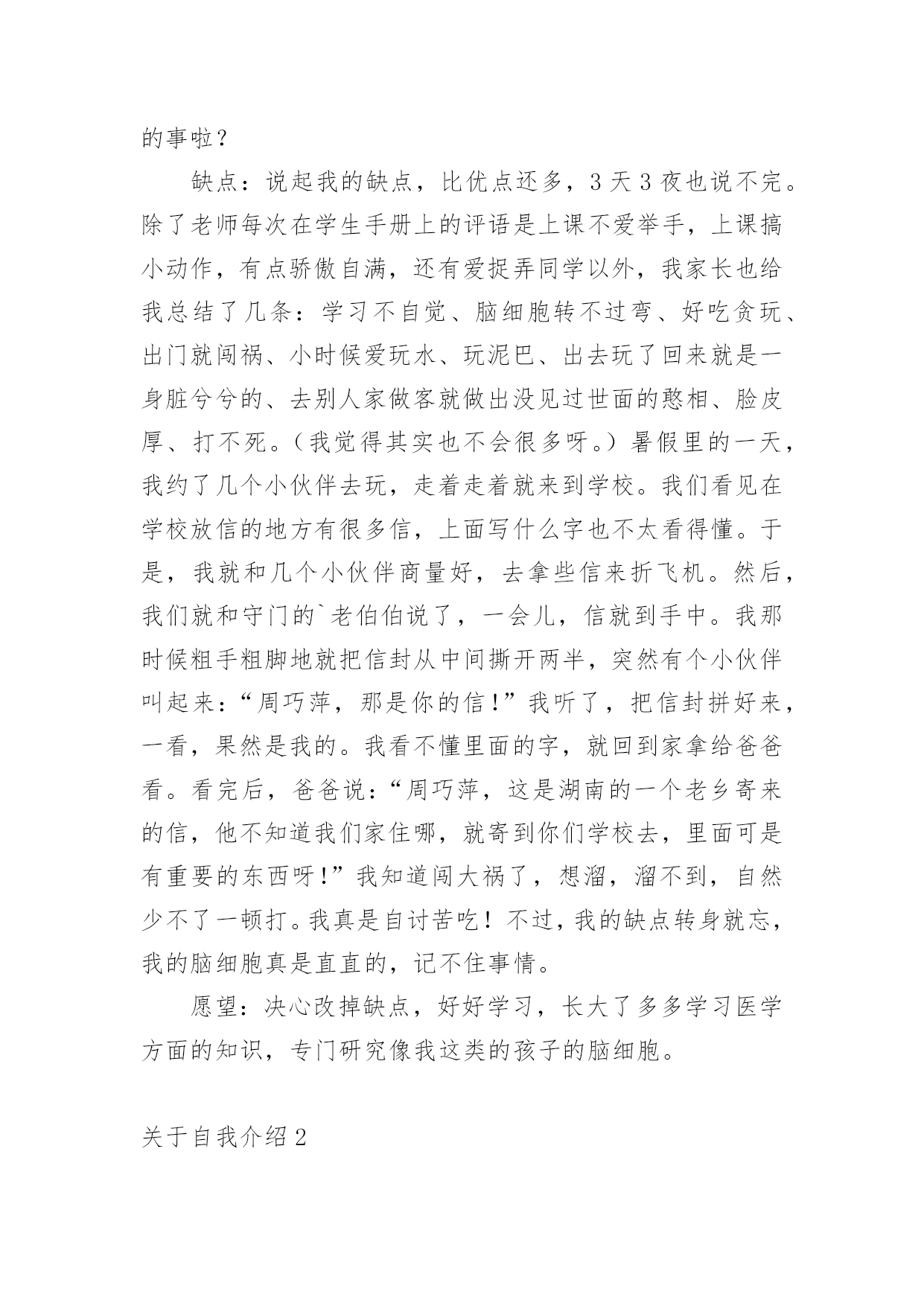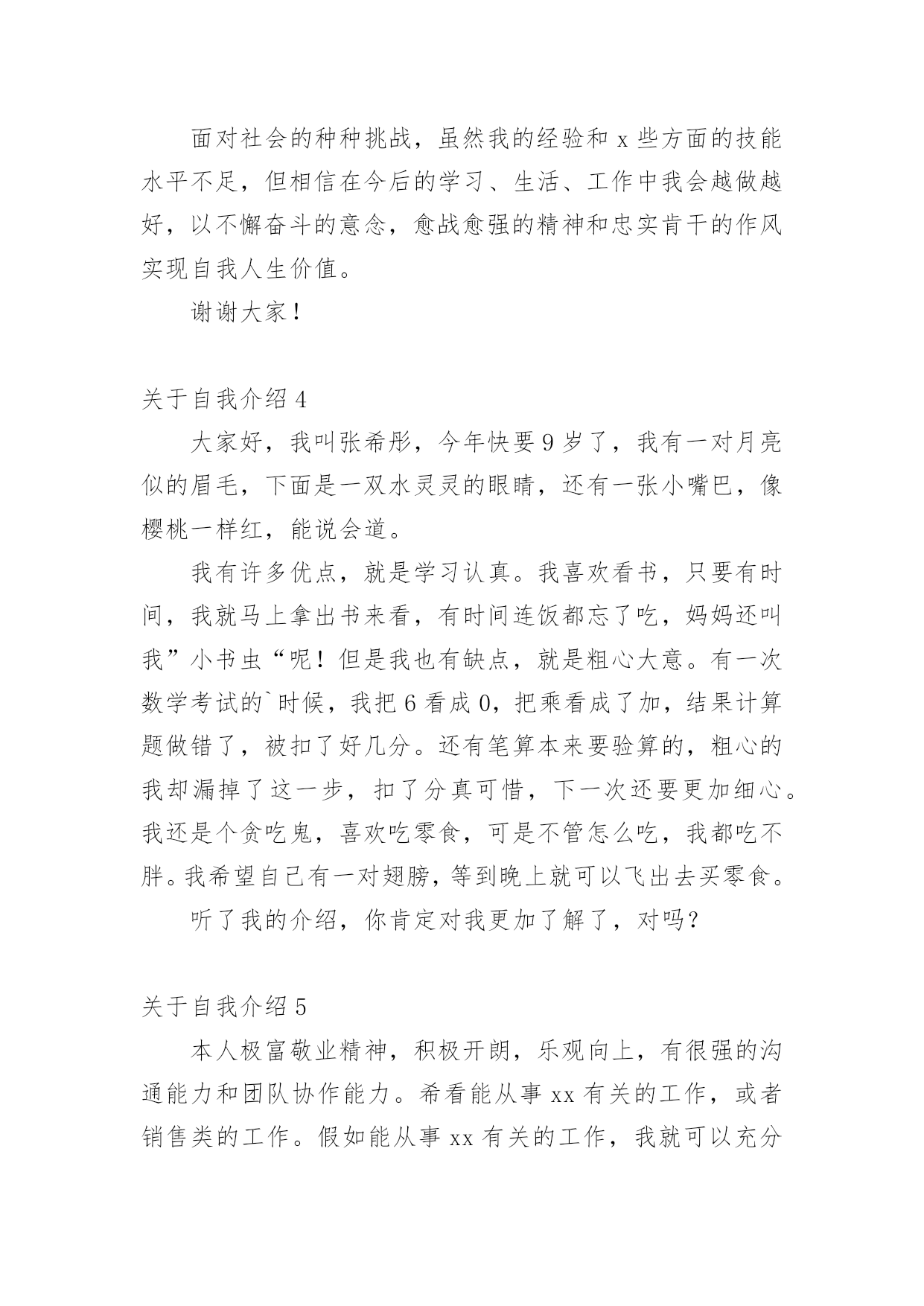 自我介绍关于自我介绍(合集15篇)来到一个完全陌生的环境,常常要进行自我介绍,用自我介绍往往可以让他人有一定的了解。到底应如何写自我介绍呢?下面是小编精心整理的关于自我介绍,欢迎大家借鉴与参考,希望对大家有所帮助。关于自我介绍1我张超文是个可爱的女孩,性别和妈妈一样年龄度过了12个中秋。模样:瓜子脸扁鼻子,手大脚大像爸爸。是遗传噢长头发黑眼珠像妈妈。有点高不矮,1。67有点胖不瘦。47公斤,嘿嘿,胖吧!优点:从幼儿园到现在,有将近30本奖状。每次一考完期末考试选学习标兵,三好学生的时候,一大堆同学就已经在喃喃道:“这次的学习标兵准是周巧萍。”听完后,我不禁在一旁偷笑。不过想起大考前那几个月,真是惨不忍睹。不说学校布置的作业,就光说家庭作业就每天规定做3张试卷,语文数学英语各一张,一天一篇日记。到了晚上,好不容易熬完这些作业,要是碰上妈妈不高兴,兴许还要读一个单元课文。要是到了要和市里统考的时候,更是……天哪,我这还是在说我优点嘛?怎么说到说到变成我大考前受难的事啦?缺点:说起我的缺点,比优点还多,3天3夜也说不完。除了老师每次在学生手册上的评语是上课不爱举手,上课搞小动作,有点骄傲自满,还有爱捉弄同学以外,我家长也给我总结了几条:学习不自觉、脑细胞转不过弯、好吃贪玩、出门就闯祸、小时候爱玩水、玩泥巴、出去玩了回来就是一身脏兮兮的、去别人家做客就做出没见过世面的憨相、脸皮厚、打不死。(我觉得其实也不会很多呀。)暑假里的一天,我约了几个小伙伴去玩,走着走着就来到学校。我们看见在学校放信的地方有很多信,上面写什么字也不太看得懂。于是,我就和几个小伙伴商量好,去拿些信来折飞机。然后,我们就和守门的`老伯伯说了,一会儿,信就到手中。我那时候粗手粗脚地就把信封从中间撕开两半,突然有个小伙伴叫起来:“周巧萍,那是你的信!”我听了,把信封拼好来,一看,果然是我的。我看不懂里面的字,就回到家拿给爸爸看。看完后,爸爸说:“周巧萍,这是湖南的一个老乡寄来的信,他不知道我们家住哪,就寄到你们学校去,里面可是有重要的东西呀!”我知道闯大祸了,想溜,溜不到,自然少不了一顿打。我真是自讨苦吃!不过,我的缺点转身就忘,我的脑细胞真是直直的,记不住事情。愿望:决心改掉缺点,好好学习,长大了多多学习医学方面的知识,专门研究像我这类的孩子的脑细胞。关于自我介绍2大家好:我叫张燕子,今年八岁多了。我为什么叫张燕子呢?由来是这样的:我是二月份出生的',那时候,天气由寒冷变得越来越温暖,百花开始盛开,燕子也从遥远的南方飞来了,非常漂亮非常美丽。姑姑希望我像燕子一样漂亮、灵巧、聪明又可爱,所以给我取名“燕子”!我的爱好是:玩电脑、看电视、穿新衣服。我的梦想是:成为比董老师和张老师更出色的老师!关于自我介绍3xxx:大家好!我叫xxx,是一个性格开朗、自信,不轻易服输的人。生活中我喜欢与人交往,通过与各种朋友相处,学习到了很多自身缺乏的优点。在学习上我积极认真,努力掌握专业知识,现在已经具有相关的办公室事务管理、文书拟写与处理公共关系策划与活动组织等能力。在校期间我曾担任系团委、学生会组织部部长,在工作中具有高度的责任感,能出色的完成本职工作,并协助别的同学,有很好的组织能力及团队协作精神。大学的学习、工作与生活使我树立了正确的人生观、价值观,形成了热情上进的.性格和诚实、守信,有责任心的人生信条。面对社会的种种挑战,虽然我的经验和x些方面的技能水平不足,但相信在今后的学习、生活、工作中我会越做越好,以不懈奋斗的意念,愈战愈强的精神和忠实肯干的作风实现自我人生价值。谢谢大家!关于自我介绍4大家好,我叫张希彤,今年快要9岁了,我有一对月亮似的眉毛,下面是一双水灵灵的眼睛,还有一张小嘴巴,像樱桃一样红,能说会道。我有许多优点,就是学习认真。我喜欢看书,只要有时间,我就马上拿出书来看,有时间连饭都忘了吃,妈妈还叫我”小书虫“呢!但是我也有缺点,就是粗心大意。有一次数学考试的`时候,我把6看成0,把乘看成了加,结果计算题做错了,被扣了好几分。还有笔算本来要验算的,粗心的我却漏掉了这一步,扣了分真可惜,下一次还要更加细心。我还是个贪吃鬼,喜欢吃零食,可是不管怎么吃,我都吃不胖。我希望自己有一对翅膀,等到晚上就可以飞出去买零食。听了我的介绍,你肯定对我更加了解了,对吗?关于自我介绍5本人极富敬业精神,积极开朗,乐观向上,有很强的沟通能力和团队协作能力。希看能从事xx有关的工作,或者销售类的工作。假如能从事xx有关的工作,我就可以充分的发挥自己所学的知识,将所学的知识与具体的实际的工作结合。将工作做的更好;我相信我的能力和耐性可以让企业发展的更好。实践是检验人才的标准,我始终相信“一分耕耘,一分收获”。勤奋踏实,积极进取是我的优点,我的家庭培养了我乐观,自信的.性格;十几年辗转求学的