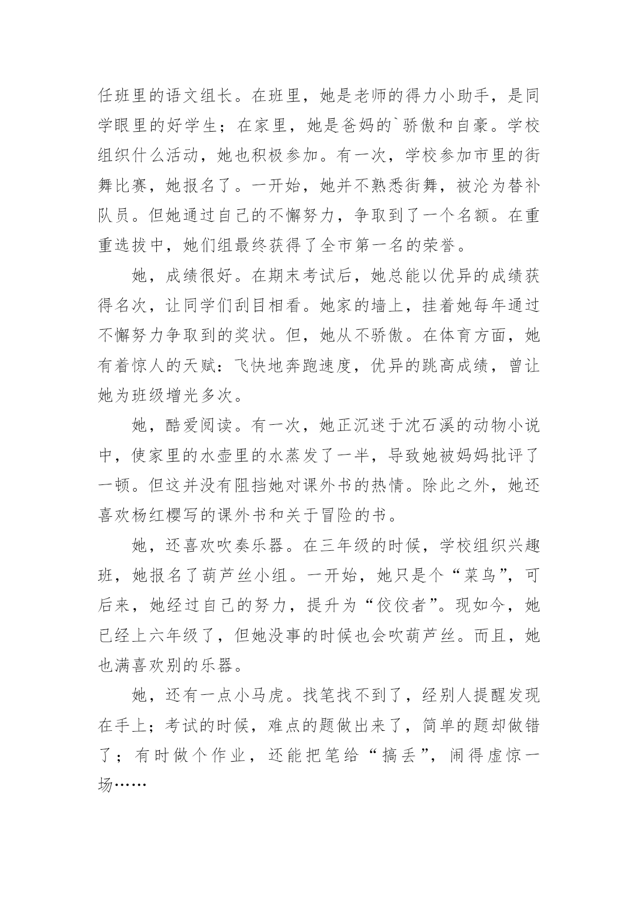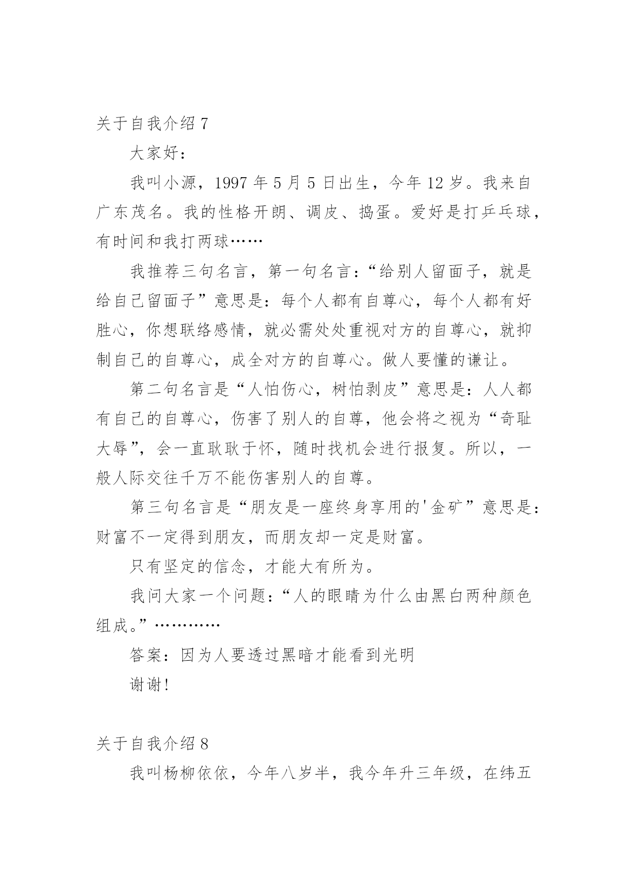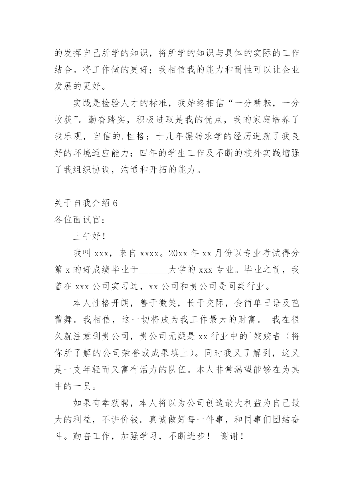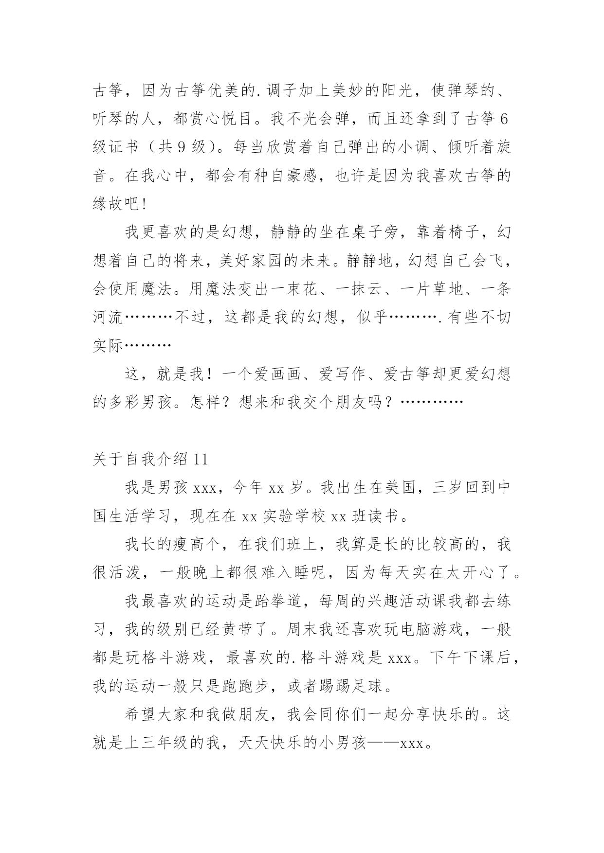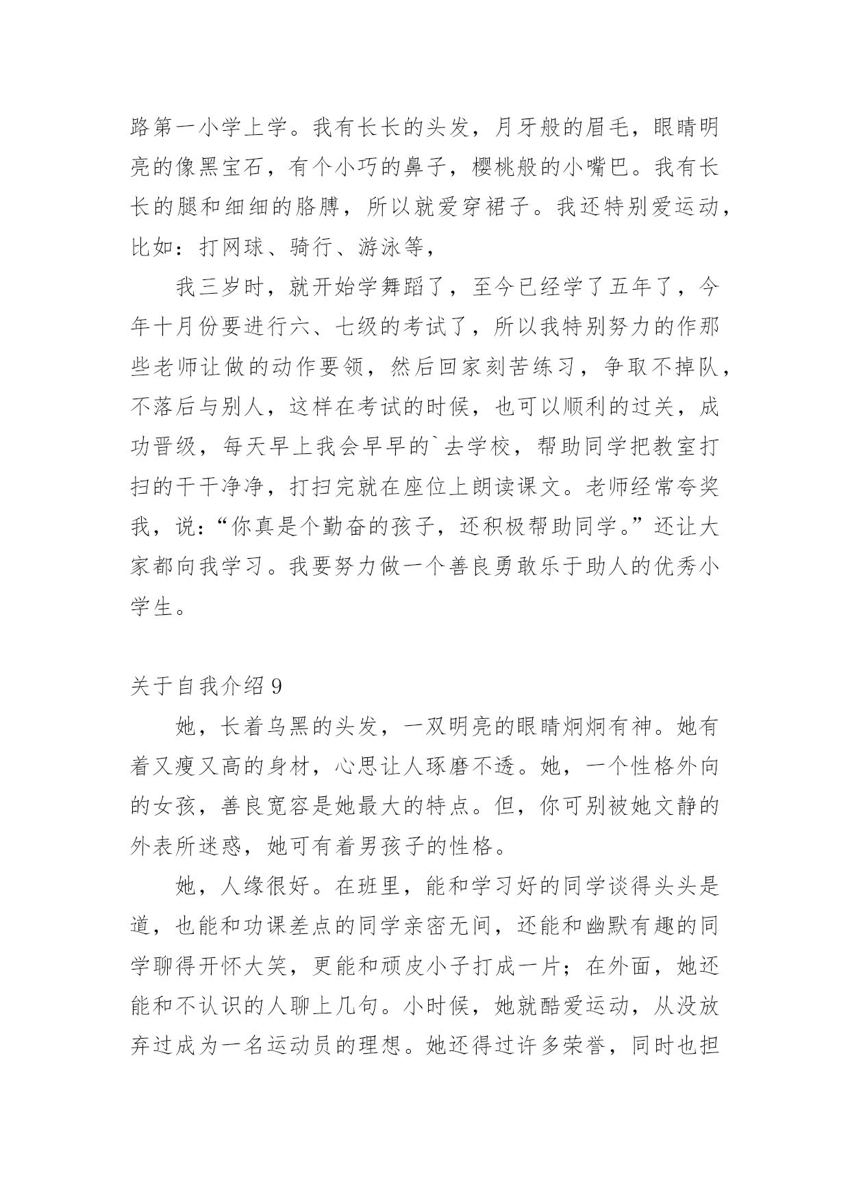 自我介绍关于自我介绍(合集15篇)来到一个完全陌生的环境,常常要进行自我介绍,用自我介绍往往可以让他人有一定的了解。到底应如何写自我介绍呢?下面是小编精心整理的关于自我介绍,欢迎大家借鉴与参考,希望对大家有所帮助。关于自我介绍1我张超文是个可爱的女孩,性别和妈妈一样年龄度过了12个中秋。模样:瓜子脸扁鼻子,手大脚大像爸爸。是遗传噢长头发黑眼珠像妈妈。有点高不矮,1。67有点胖不瘦。47公斤,嘿嘿,胖吧!优点:从幼儿园到现在,有将近30本奖状。每次一考完期末考试选学习标兵,三好学生的时候,一大堆同学就已经在喃喃道:“这次的学习标兵准是周巧萍。”听完后,我不禁在一旁偷笑。不过想起大考前那几个月,真是惨不忍睹。不说学校布置的作业,就光说家庭作业就每天规定做3张试卷,语文数学英语各一张,一天一篇日记。到了晚上,好不容易熬完这些作业,要是碰上妈妈不高兴,兴许还要读一个单元课文。要是到了要和市里统考的时候,更是……天哪,我这还是在说我优点嘛?怎么说到说到变成我大考前受难的事啦?缺点:说起我的缺点,比优点还多,3天3夜也说不完。除了老师每次在学生手册上的评语是上课不爱举手,上课搞小动作,有点骄傲自满,还有爱捉弄同学以外,我家长也给我总结了几条:学习不自觉、脑细胞转不过弯、好吃贪玩、出门就闯祸、小时候爱玩水、玩泥巴、出去玩了回来就是一身脏兮兮的、去别人家做客就做出没见过世面的憨相、脸皮厚、打不死。(我觉得其实也不会很多呀。)暑假里的一天,我约了几个小伙伴去玩,走着走着就来到学校。我们看见在学校放信的地方有很多信,上面写什么字也不太看得懂。于是,我就和几个小伙伴商量好,去拿些信来折飞机。然后,我们就和守门的`老伯伯说了,一会儿,信就到手中。我那时候粗手粗脚地就把信封从中间撕开两半,突然有个小伙伴叫起来:“周巧萍,那是你的信!”我听了,把信封拼好来,一看,果然是我的。我看不懂里面的字,就回到家拿给爸爸看。看完后,爸爸说:“周巧萍,这是湖南的一个老乡寄来的信,他不知道我们家住哪,就寄到你们学校去,里面可是有重要的东西呀!”我知道闯大祸了,想溜,溜不到,自然少不了一顿打。我真是自讨苦吃!不过,我的缺点转身就忘,我的脑细胞真是直直的,记不住事情。愿望:决心改掉缺点,好好学习,长大了多多学习医学方面的知识,专门研究像我这类的孩子的脑细胞。关于自我介绍2大家好:我叫张燕子,今年八岁多了。我为什么叫张燕子呢?由来是这样的:我是二月份出生的',那时候,天气由寒冷变得越来越温暖,百花开始盛开,燕子也从遥远的南方飞来了,非常漂亮非常美丽。姑姑希望我像燕子一样漂亮、灵巧、聪明又可爱,所以给我取名“燕子”!我的爱好是:玩电脑、看电视、穿新衣服。我的梦想是:成为比董老师和张老师更出色的老师!关于自我介绍3xxx:大家好!我叫xxx,是一个性格开朗、自信,不轻易服输的人。生活中我喜欢与人交往,通过与各种朋友相处,学习到了很多自身缺乏的优点。在学习上我积极认真,努力掌握专业知识,现在已经具有相关的办公室事务管理、文书拟写与处理公共关系策划与活动组织等能力。在校期间我曾担任系团委、学生会组织部部长,在工作中具有高度的责任感,能出色的完成本职工作,并协助别的同学,有很好的组织能力及团队协作精神。大学的学习、工作与生活使我树立了正确的人生观、价值观,形成了热情上进的.性格和诚实、守信,有责任心的人生信条。面对社会的种种挑战,虽然我的经验和x些方面的技能水平不足,但相信在今后的学习、生活、工作中我会越做越好,以不懈奋斗的意念,愈战愈强的精神和忠实肯干的作风实现自我人生价值。谢谢大家!关于自我介绍4大家好,我叫张希彤,今年快要9岁了,我有一对月亮似的眉毛,下面是一双水灵灵的眼睛,还有一张小嘴巴,像樱桃一样红,能说会道。我有许多优点,就是学习认真。我喜欢看书,只要有时间,我就马上拿出书来看,有时间连饭都忘了吃,妈妈还叫我”小书虫“呢!但是我也有缺点,就是粗心大意。有一次数学考试的`时候,我把6看成0,把乘看成了加,结果计算题做错了,被扣了好几分。还有笔算本来要验算的,粗心的我却漏掉了这一步,扣了分真可惜,下一次还要更加细心。我还是个贪吃鬼,喜欢吃零食,可是不管怎么吃,我都吃不胖。我希望自己有一对翅膀,等到晚上就可以飞出去买零食。听了我的介绍,你肯定对我更加了解了,对吗?关于自我介绍5本人极富敬业精神,积极开朗,乐观向上,有很强的沟通能力和团队协作能力。希看能从事xx有关的工作,或者销售类的工作。假如能从事xx有关的工作,我就可以充分的发挥自己所学的知识,将所学的知识与具体的实际的工作结合。将工作做的更好;我相信我的能力和耐性可以让企业发展的更好。实践是检验人才的标准,我始终相信“一分耕耘,一分收获”。勤奋踏实,积极进取是我的优点,我的家庭培养了我乐观,自信的.性格;十几年辗转求学的