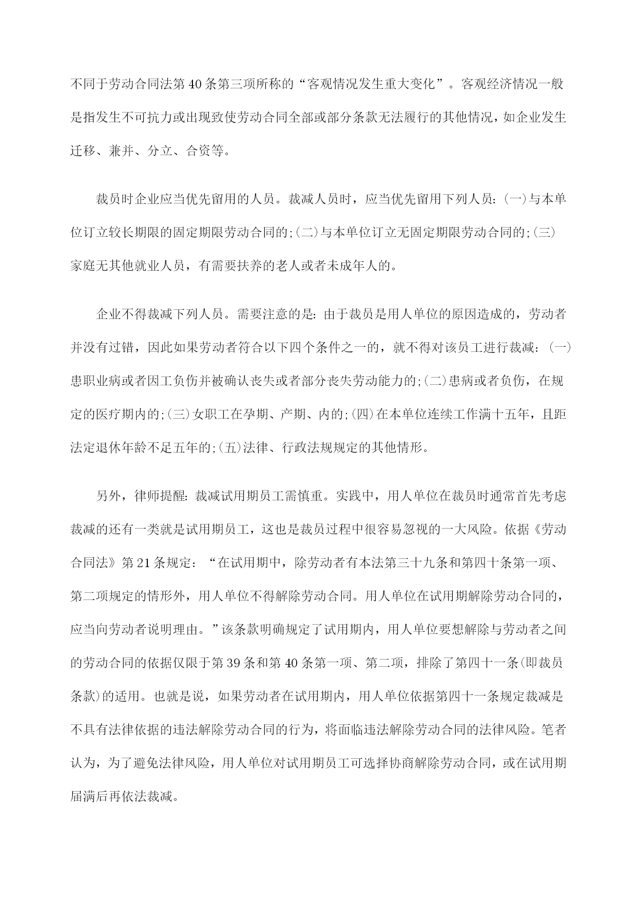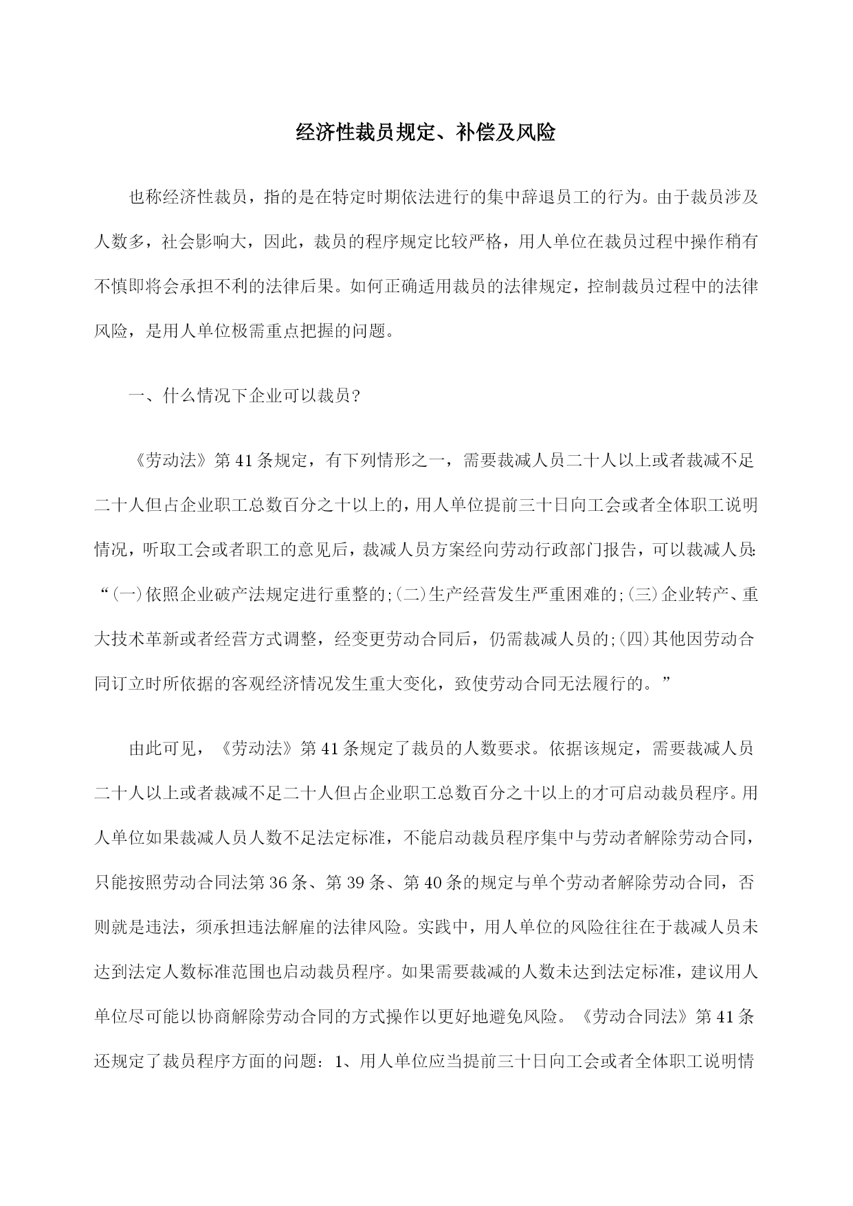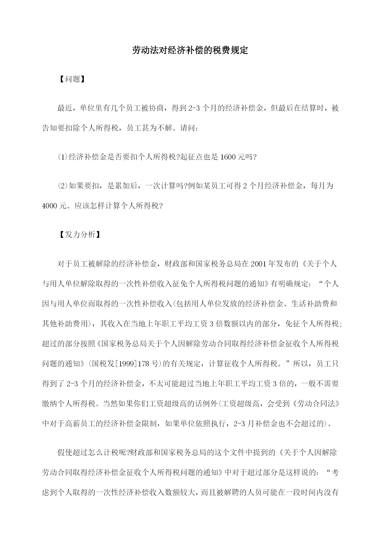 劳动法对经济补偿的税费规定(完整版)实用资料(可以直接使用,可编辑完整版实用资料,欢迎下载)劳动法对经济补偿的税费规定【问题】最近,单位里有几个员工被协商,得到2-3个月的经济补偿金,但最后在结算时,被告知要扣除个人所得税,员工甚为不解。请问:(1)经济补偿金是否要扣个人所得税?起征点也是1600元吗?(2)如果要扣,是累加后,一次计算吗?例如某员工可得2个月经济补偿金,每月为4000元。应该怎样计算个人所得税?【发力分析】对于员工被解除的经济补偿金,财政部和国家税务总局在2001年发布的《关于个人与用人单位解除取得的一次性补偿收入征免个人所得税问题的通知》有明确规定:“个人因与用人单位而取得的一次性补偿收入(包括用人单位发放的经济补偿金、生活补助费和其他补助费用),其收入在当地上年职工平均工资3倍数额以内的部分,免征个人所得税;超过的部分按照《国家税务总局关于个人因解除劳动合同取得经济补偿金征收个人所得税问题的通知》(国税发[1999]178号)的有关规定,计算征收个人所得税。”所以,员工只得到了2-3个月的经济补偿金,不太可能超过当地上年职工平均工资3倍的,一般不需要缴纳个人所得税。当然如果你们工资超级高的话例外(工资超级高,会受到《劳动合同法》中对于高薪员工的经济补偿金限制,如果单位依照执行,2-3月补偿金也不会超过的)。假使超过怎么计税呢?财政部和国家税务总局的这个文件中提到的《关于个人因解除劳动合同取得经济补偿金征收个人所得税问题的通知》中对于超过部分是这样说的:“考虑到个人取得的一次性经济补偿收入数额较大,而且被解聘的人员可能在一段时间内没有固定收入,因此,对于个人取得的一次性经济补偿收入,可视为一次取得数月的工资、薪金收入,允许在一定期限内进行平均。具体平均办法为:以个人取得的一次性经济补偿收入,除以个人在本企业的工作年限数,以其商数作为个人的月工资、薪金收入,按照税法规定计算缴纳个人所得税。个人在本企业的工作年限数按实际工作年限数计算,超过12年的按12计算。”因此,即使超过,也不是按照单月工资收入那样累加后一次性计算的,而是按照工作年限平均计税。文章来源:中顾法律网(免费法律咨询,就上中顾法律网)经济性裁员规定、补偿及风险也称经济性裁员,指的是在特定时期依法进行的集中辞退员工的行为。由于裁员涉及人数多,社会影响大,因此,裁员的程序规定比较严格,用人单位在裁员过程中操作稍有不慎即将会承担不利的法律后果。如何正确适用裁员的法律规定,控制裁员过程中的法律风险,是用人单位极需重点把握的问题。一、什么情况下企业可以裁员?《劳动法》第41条规定,有下列情形之一,需要裁减人员二十人以上或者裁减不足二十人但占企业职工总数百分之十以上的,用人单位提前三十日向工会或者全体职工说明情况,听取工会或者职工的意见后,裁减人员方案经向劳动行政部门报告,可以裁减人员:“(一)依照企业破产法规定进行重整的;(二)生产经营发生严重困难的;(三)企业转产、重大技术革新或者经营方式调整,经变更劳动合同后,仍需裁减人员的;(四)其他因劳动合同订立时所依据的客观经济情况发生重大变化,致使劳动合同无法履行的。”由此可见,《劳动法》第41条规定了裁员的人数要求。依据该规定,需要裁减人员二十人以上或者裁减不足二十人但占企业职工总数百分之十以上的才可启动裁员程序。用人单位如果裁减人员人数不足法定标准,不能启动裁员程序集中与劳动者解除劳动合同,只能按照劳动合同法第36条、第39条、第40条的规定与单个劳动者解除劳动合同,否则就是违法,须承担违法解雇的法律风险。实践中,用人单位的风险往往在于裁减人员未达到法定人数标准范围也启动裁员程序。如果需要裁减的人数未达到法定标准,建议用人单位尽可能以协商解除劳动合同的方式操作以更好地避免风险。《劳动合同法》第41条还规定了裁员程序方面的问题:1、用人单位应当提前三十日向工会或者全体职工说明情况,听取工会或者职工的意见,这一点上,用人单位可以选择向工会说明情况,或向全体职工说明情况。实践操作中要注意,法律规定的是“全体职工”而非“职工代表”,用人单位不能仅向职工代表说明,而应当向全体职工说明。要注意保留提前三十天向工会或者全体职工说明的书面证据材料,否则很可能会导致违法裁员的风险。2、裁减人员方案需向劳动行政部门报告,依照法律规定,用人单位之需要向劳动行政部门履行报告程序即可,无需经其批准。但用人单位要注意保留劳动行政部门签收的相关证据。二、企业裁员,如何控制风险?裁员的举证责任由用人单位承担,用人单位必须有充分证据证明达到上述法律所规定的可以裁员的条件方可裁员,不能举证的将会被认定为违法裁员。用人单位裁员的法定条件具体到实践中主要有以下几种:(1)用人单位依照企业破产法规定进行重整的。依照