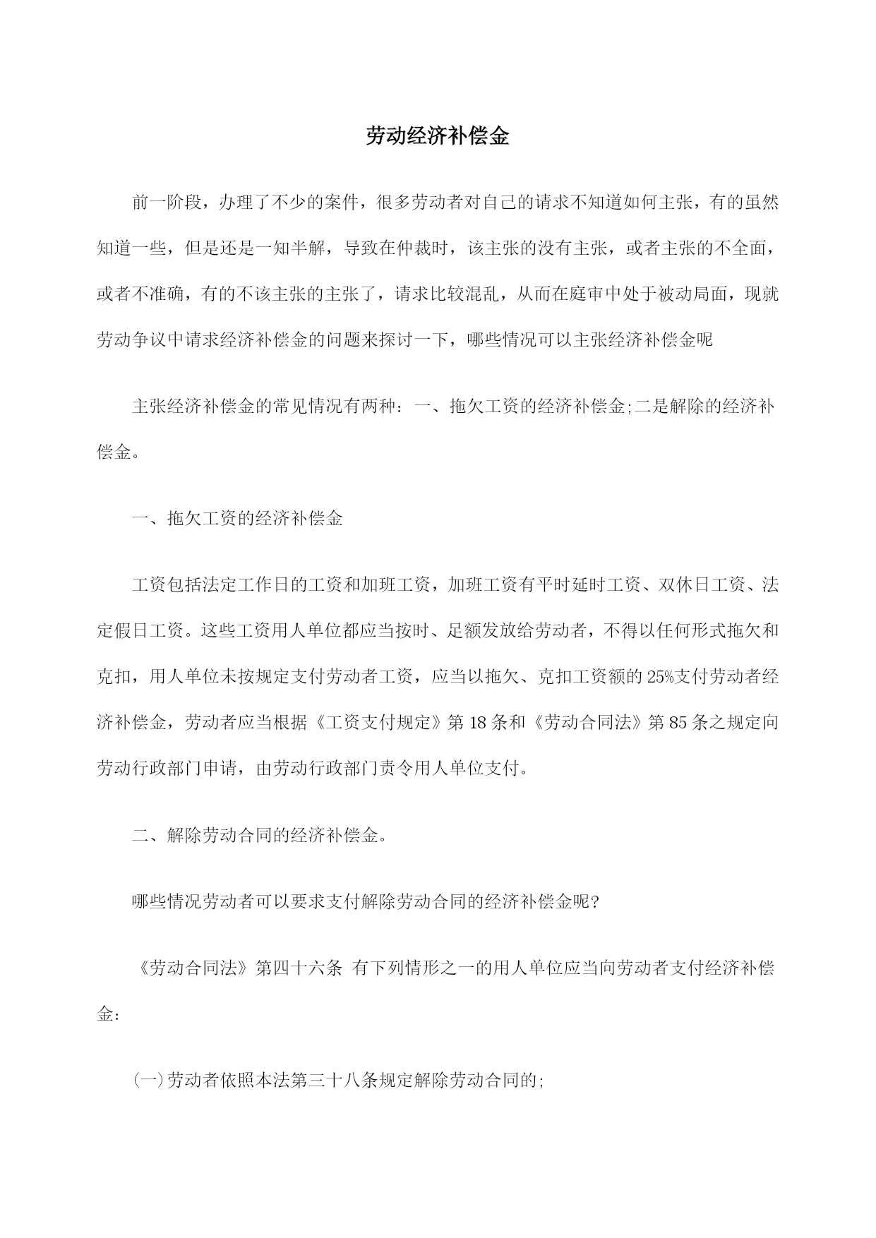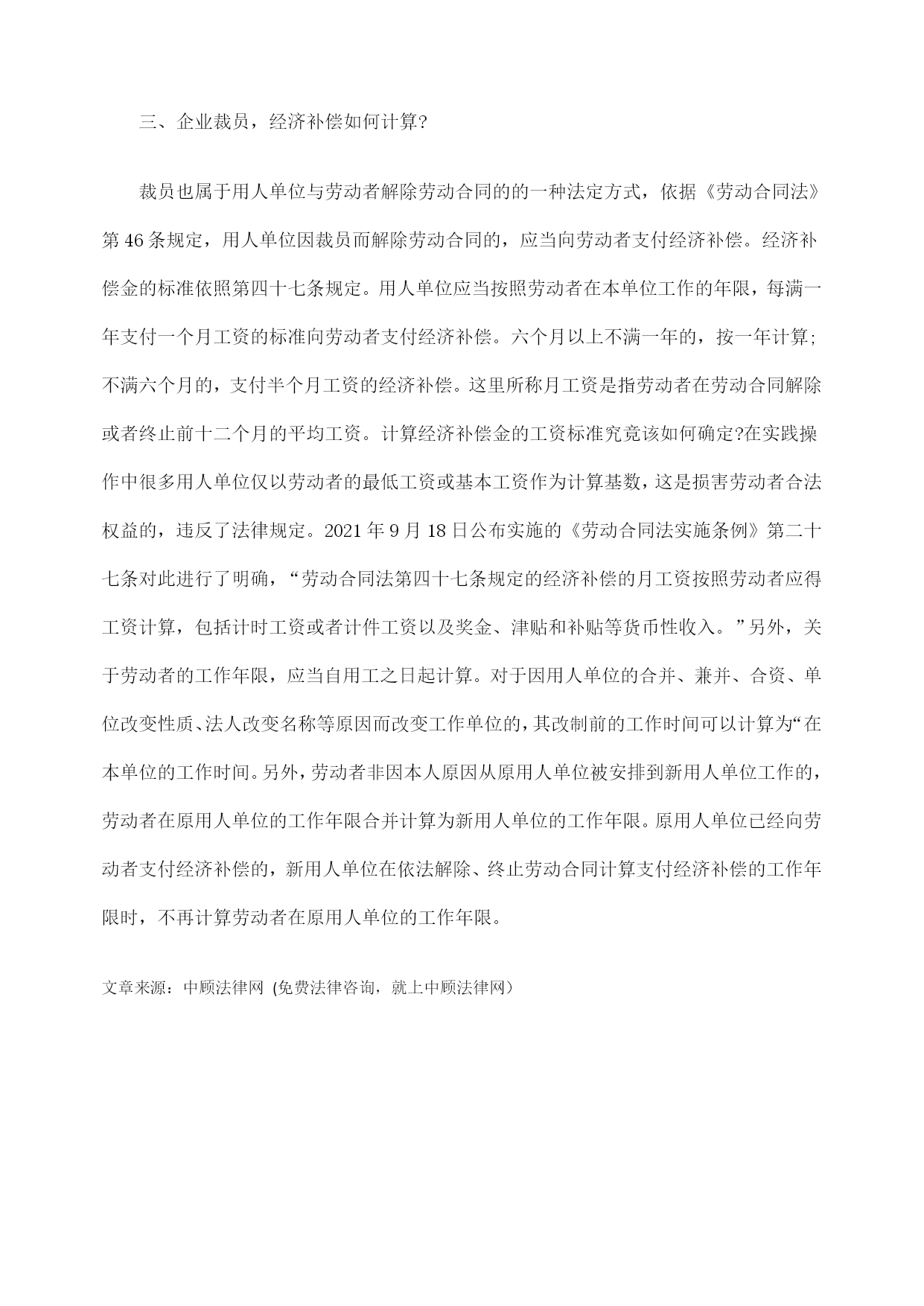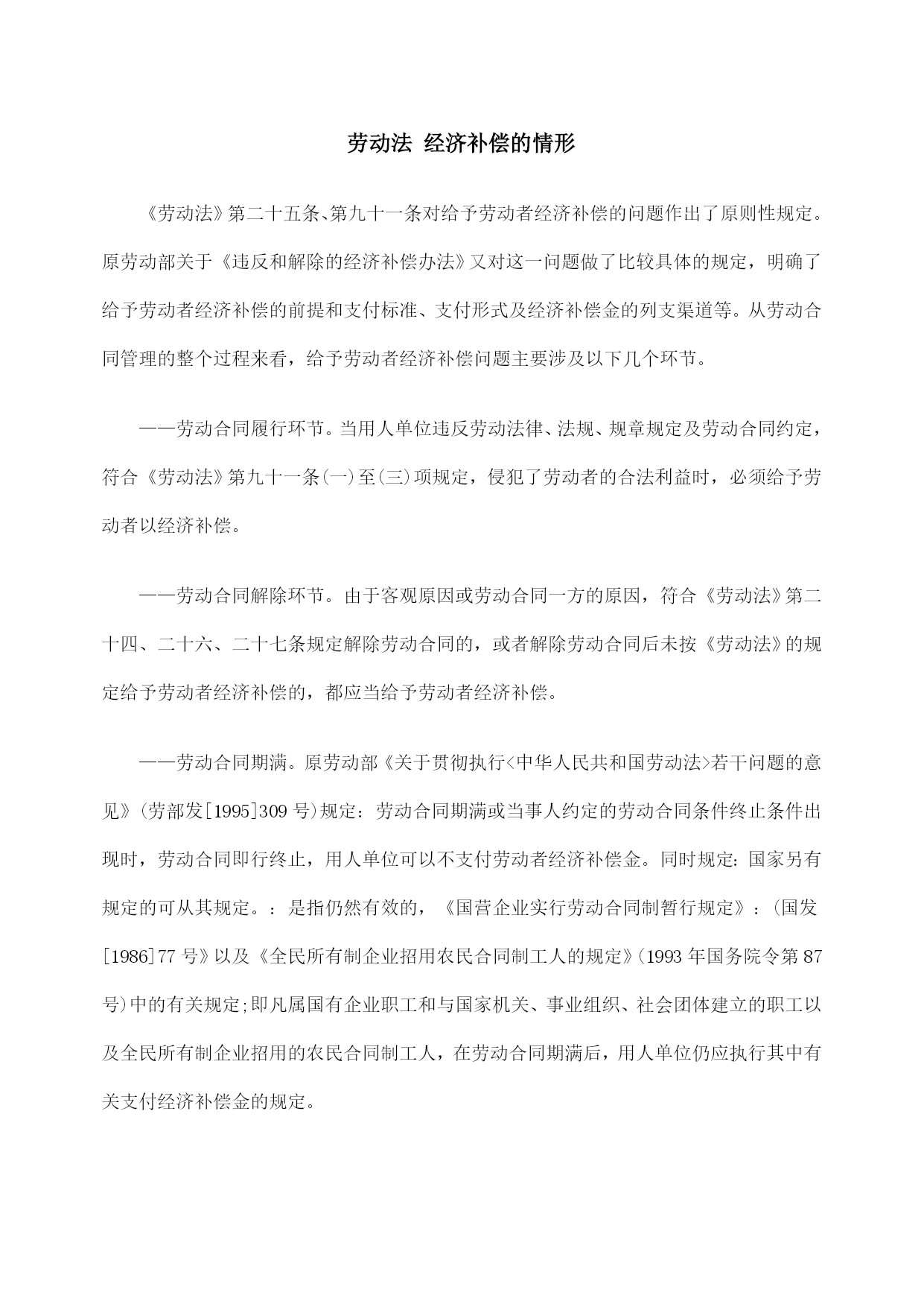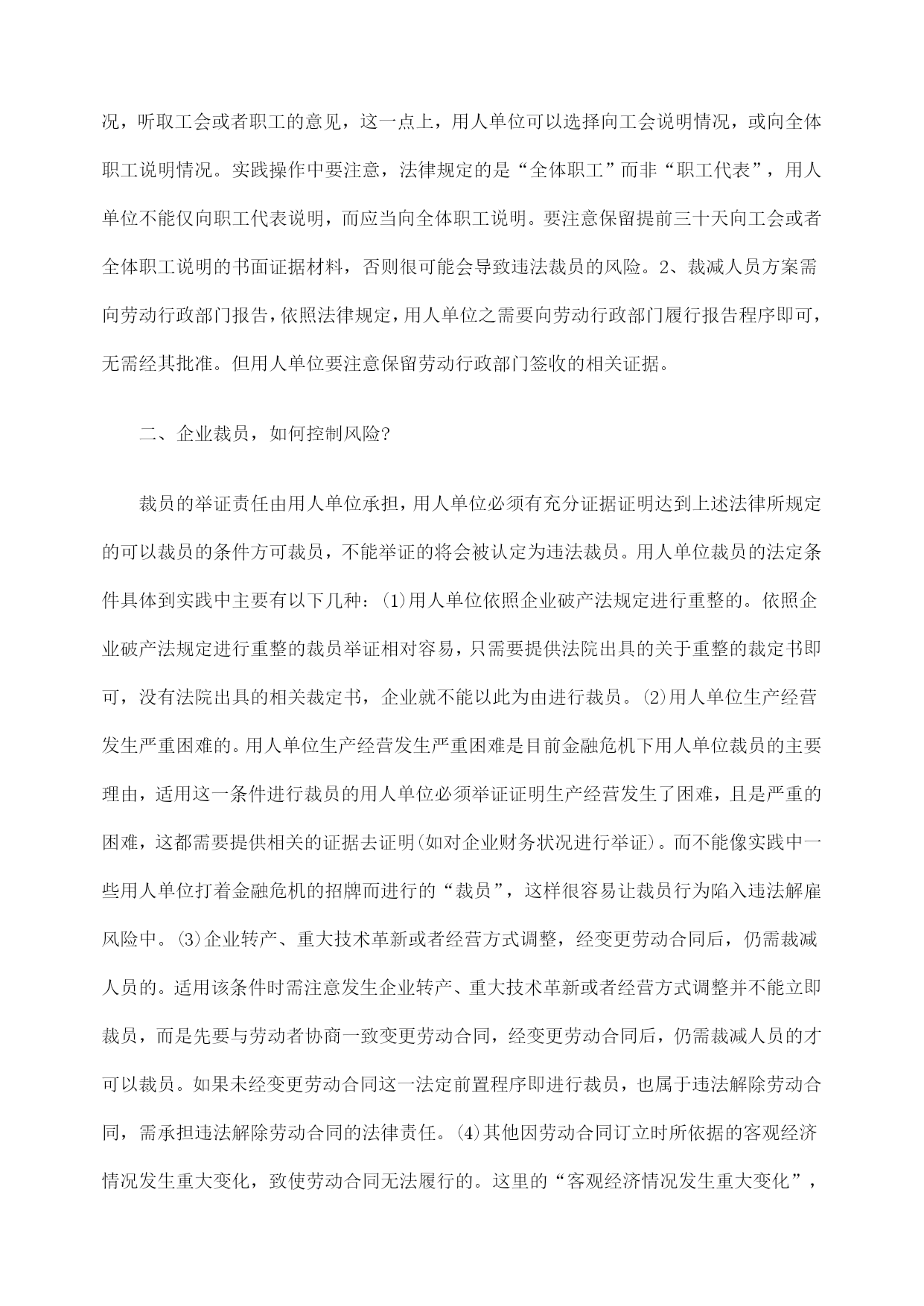 劳动法对经济补偿的税费规定(完整版)实用资料(可以直接使用,可编辑完整版实用资料,欢迎下载)劳动法对经济补偿的税费规定【问题】最近,单位里有几个员工被协商,得到2-3个月的经济补偿金,但最后在结算时,被告知要扣除个人所得税,员工甚为不解。请问:(1)经济补偿金是否要扣个人所得税?起征点也是1600元吗?(2)如果要扣,是累加后,一次计算吗?例如某员工可得2个月经济补偿金,每月为4000元。应该怎样计算个人所得税?【发力分析】对于员工被解除的经济补偿金,财政部和国家税务总局在2001年发布的《关于个人与用人单位解除取得的一次性补偿收入征免个人所得税问题的通知》有明确规定:“个人因与用人单位而取得的一次性补偿收入(包括用人单位发放的经济补偿金、生活补助费和其他补助费用),其收入在当地上年职工平均工资3倍数额以内的部分,免征个人所得税;超过的部分按照《国家税务总局关于个人因解除劳动合同取得经济补偿金征收个人所得税问题的通知》(国税发[1999]178号)的有关规定,计算征收个人所得税。”所以,员工只得到了2-3个月的经济补偿金,不太可能超过当地上年职工平均工资3倍的,一般不需要缴纳个人所得税。当然如果你们工资超级高的话例外(工资超级高,会受到《劳动合同法》中对于高薪员工的经济补偿金限制,如果单位依照执行,2-3月补偿金也不会超过的)。假使超过怎么计税呢?财政部和国家税务总局的这个文件中提到的《关于个人因解除劳动合同取得经济补偿金征收个人所得税问题的通知》中对于超过部分是这样说的:“考虑到个人取得的一次性经济补偿收入数额较大,而且被解聘的人员可能在一段时间内没有固定收入,因此,对于个人取得的一次性经济补偿收入,可视为一次取得数月的工资、薪金收入,允许在一定期限内进行平均。具体平均办法为:以个人取得的一次性经济补偿收入,除以个人在本企业的工作年限数,以其商数作为个人的月工资、薪金收入,按照税法规定计算缴纳个人所得税。个人在本企业的工作年限数按实际工作年限数计算,超过12年的按12计算。”因此,即使超过,也不是按照单月工资收入那样累加后一次性计算的,而是按照工作年限平均计税。文章来源:中顾法律网(免费法律咨询,就上中顾法律网)经济性裁员规定、补偿及风险也称经济性裁员,指的是在特定时期依法进行的集中辞退员工的行为。由于裁员涉及人数多,社会影响大,因此,裁员的程序规定比较严格,用人单位在裁员过程中操作稍有不慎即将会承担不利的法律后果。如何正确适用裁员的法律规定,控制裁员过程中的法律风险,是用人单位极需重点把握的问题。一、什么情况下企业可以裁员?《劳动法》第41条规定,有下列情形之一,需要裁减人员二十人以上或者裁减不足二十人但占企业职工总数百分之十以上的,用人单位提前三十日向工会或者全体职工说明情况,听取工会或者职工的意见后,裁减人员方案经向劳动行政部门报告,可以裁减人员:“(一)依照企业破产法规定进行重整的;(二)生产经营发生严重困难的;(三)企业转产、重大技术革新或者经营方式调整,经变更劳动合同后,仍需裁减人员的;(四)其他因劳动合同订立时所依据的客观经济情况发生重大变化,致使劳动合同无法履行的。”由此可见,《劳动法》第41条规定了裁员的人数要求。依据该规定,需要裁减人员二十人以上或者裁减不足二十人但占企业职工总数百分之十以上的才可启动裁员程序。用人单位如果裁减人员人数不足法定标准,不能启动裁员程序集中与劳动者解除劳动合同,只能按照劳动合同法第36条、第39条、第40条的规定与单个劳动者解除劳动合同,否则就是违法,须承担违法解雇的法律风险。实践中,用人单位的风险往往在于裁减人员未达到法定人数标准范围也启动裁员程序。如果需要裁减的人数未达到法定标准,建议用人单位尽可能以协商解除劳动合同的方式操作以更好地避免风险。《劳动合同法》第41条还规定了裁员程序方面的问题:1、用人单位应当提前三十日向工会或者全体职工说明情况,听取工会或者职工的意见,这一点上,用人单位可以选择向工会说明情况,或向全体职工说明情况。实践操作中要注意,法律规定的是“全体职工”而非“职工代表”,用人单位不能仅向职工代表说明,而应当向全体职工说明。要注意保留提前三十天向工会或者全体职工说明的书面证据材料,否则很可能会导致违法裁员的风险。2、裁减人员方案需向劳动行政部门报告,依照法律规定,用人单位之需要向劳动行政部门履行报告程序即可,无需经其批准。但用人单位要注意保留劳动行政部门签收的相关证据。二、企业裁员,如何控制风险?裁员的举证责任由用人单位承担,用人单位必须有充分证据证明达到上述法律所规定的可以裁员的条件方可裁员,不能举证的将会被认定为违法裁员。用人单位裁员的法定条件具体到实践中主要有以下几种:(1)用人单位依照企业破产法规定进行重整的。依照