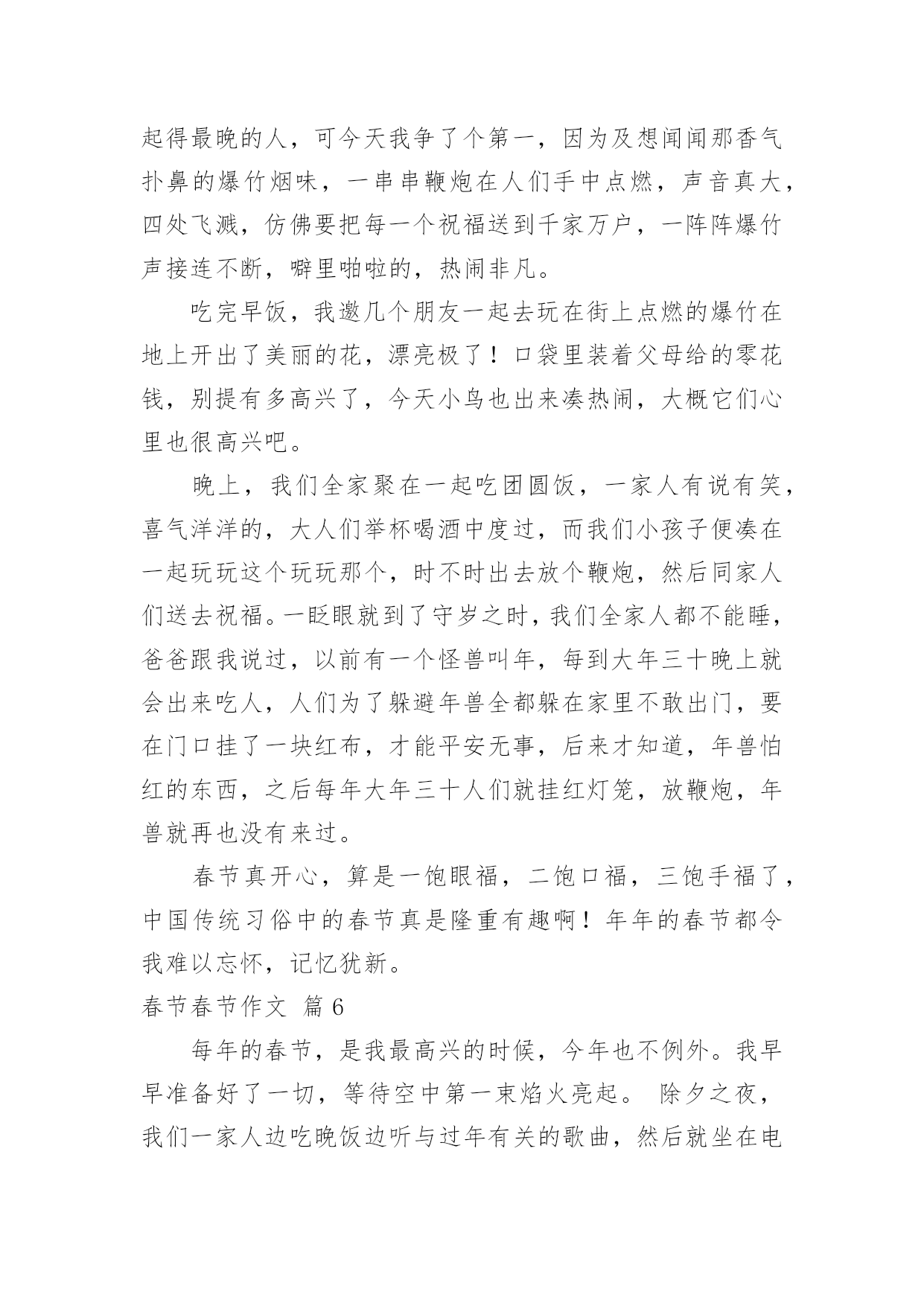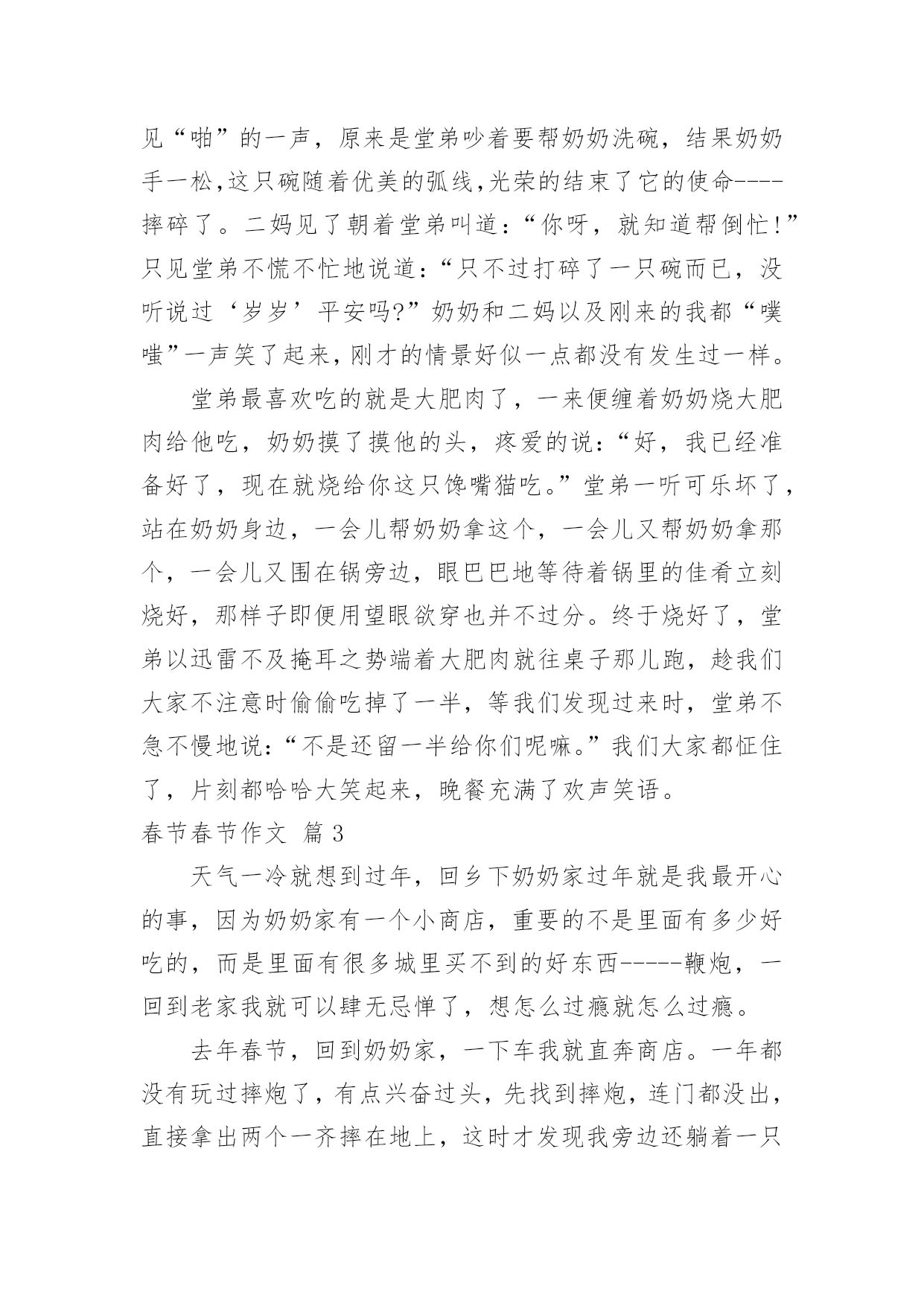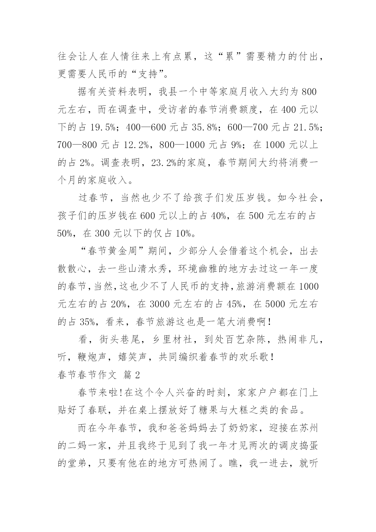 春节春节作文【精华】春节春节作文汇编8篇在生活、工作和学习中,大家对作文都不陌生吧,作文是一种言语活动,具有高度的综合性和创造性。还是对作文一筹莫展吗?以下是小编精心整理的春节春节作文8篇,欢迎大家分享。春节春节作文篇1火红的灯笼挂起来,欢乐的歌儿唱起来,随着噼里啪啦的鞭炮声,春节如约而至的到来了。下面,让我们去作个春节社会调查吧!letusgo!春节是我国的传统节日。是家人团聚,欢天喜地的日子。大部分人走访亲戚,互相送礼也是不可少的。当今社会,春节送礼,许多人已经司空见惯了。那多少人认为"送礼"是春节必不可少的一个内容呢?调查显示:68.5%的人认为"送礼"是春节必不可少的内容,仅有8.9%表示"送礼"并非春节必不可少的内容,有22。6%的被访者表示不好判断。从我们调查的情况看,既然大部分认为送礼是春节必不可少的一个内容,那么今年春节送什么礼物好呢?其中,50%的人认为送食品合适;35%认为送保健品高雅;10%认为送烟酒茶类时尚;5%认为送什么也无所谓。在与被访着的交谈中可以了解到,大家认为“送礼”往往会让人在人情往来上有点累,这“累”需要精力的付出,更需要人民币的“支持”。据有关资料表明,我县一个中等家庭月收入大约为800元左右,而在调查中,受访者的春节消费额度,在400元以下的占19.5%;400—600元占35.8%;600—700元占21.5%;700—800元占12.2%,800—1000元占9%;在1000元以上的占2%。调查表明,23.2%的家庭,春节期间大约将消费一个月的家庭收入。过春节,当然也少不了给孩子们发压岁钱。如今社会,孩子们的压岁钱在600元以上的占40%,在500元左右的占50%,在300元以下的仅占10%。“春节黄金周”期间,少部分人会借着这个机会,出去散散心,去一些山清水秀,环境幽雅的地方去过这一年一度的春节,当然,这也少不了人民币的支持,旅游消费额在1000元左右的占20%,在3000元左右的占45%,在5000元左右的占35%,看来,春节旅游这也是一笔大消费啊!看,街头巷尾,乡里材社,到处百艺杂陈,热闹非凡,听,鞭炮声,嬉笑声,共同编织着春节的欢乐歌!春节春节作文篇2春节来啦!在这个令人兴奋的时刻,家家户户都在门上贴好了春联,并在桌上摆放好了糖果与大糕之类的食品。而在今年春节,我和爸爸妈妈去了奶奶家,迎接在苏州的二妈一家,并且我终于见到了我一年才见两次的调皮捣蛋的堂弟,只要有他在的地方可热闹了。瞧,我一进去,就听见“啪”的一声,原来是堂弟吵着要帮奶奶洗碗,结果奶奶手一松,这只碗随着优美的弧线,光荣的结束了它的使命----摔碎了。二妈见了朝着堂弟叫道:“你呀,就知道帮倒忙!”只见堂弟不慌不忙地说道:“只不过打碎了一只碗而已,没听说过‘岁岁’平安吗?”奶奶和二妈以及刚来的我都“噗嗤”一声笑了起来,刚才的情景好似一点都没有发生过一样。堂弟最喜欢吃的就是大肥肉了,一来便缠着奶奶烧大肥肉给他吃,奶奶摸了摸他的头,疼爱的说:“好,我已经准备好了,现在就烧给你这只馋嘴猫吃。”堂弟一听可乐坏了,站在奶奶身边,一会儿帮奶奶拿这个,一会儿又帮奶奶拿那个,一会儿又围在锅旁边,眼巴巴地等待着锅里的佳肴立刻烧好,那样子即便用望眼欲穿也并不过分。终于烧好了,堂弟以迅雷不及掩耳之势端着大肥肉就往桌子那儿跑,趁我们大家不注意时偷偷吃掉了一半,等我们发现过来时,堂弟不急不慢地说:“不是还留一半给你们呢嘛。”我们大家都怔住了,片刻都哈哈大笑起来,晚餐充满了欢声笑语。春节春节作文篇3天气一冷就想到过年,回乡下奶奶家过年就是我最开心的事,因为奶奶家有一个小商店,重要的不是里面有多少好吃的,而是里面有很多城里买不到的好东西-----鞭炮,一回到老家我就可以肆无忌惮了,想怎么过瘾就怎么过瘾。去年春节,回到奶奶家,一下车我就直奔商店。一年都没有玩过摔炮了,有点兴奋过头,先找到摔炮,连门都没出,直接拿出两个一齐摔在地上,这时才发现我旁边还躺着一只小猫,但是已经晚了,只听“啪--啪--”的二重唱,摔炮落地了,小猫被吓得浑身的毛都竖了起来,喵---呜一声蹿了出去,转眼没了踪影。我和哥哥哈哈大笑,追向大门外。这一下午就拿着摔炮,在村里逛着,把那些在外面跑的小猫、小狗、小鸡逗了个遍,实在是太好玩了,不过后来还是被大人们训了一顿。晚上吃团圆饭的时候,喝完饮料,手里拿着瓶盖玩,看到桌子上有一个小鞭炮,突然有了一个好主意。一吃完饭我就拉着哥哥出来放鞭炮,哥哥找来一个捻芯比较长的鞭炮,放在石板上,让我去点。我故意把院子里的灯关上,说这样就能看到它爆炸的火花,在我点火的时候,悄悄地把瓶盖盖在了小炮身上,然后自己躲得老远。“砰”的一声,盖子随着一声巨响飞上了天空,紧接着,一个小东西从天而降,不偏不倚,正砸在了哥哥的鼻尖上,“什么东西?”哥哥吓得连退几步