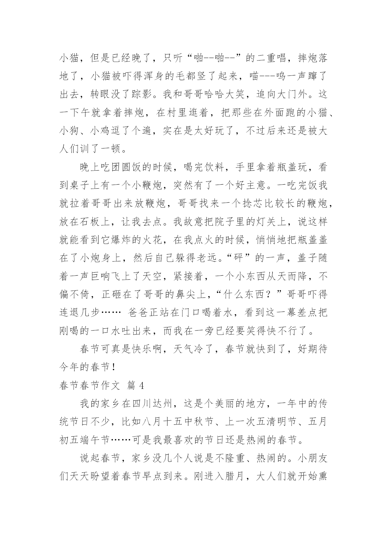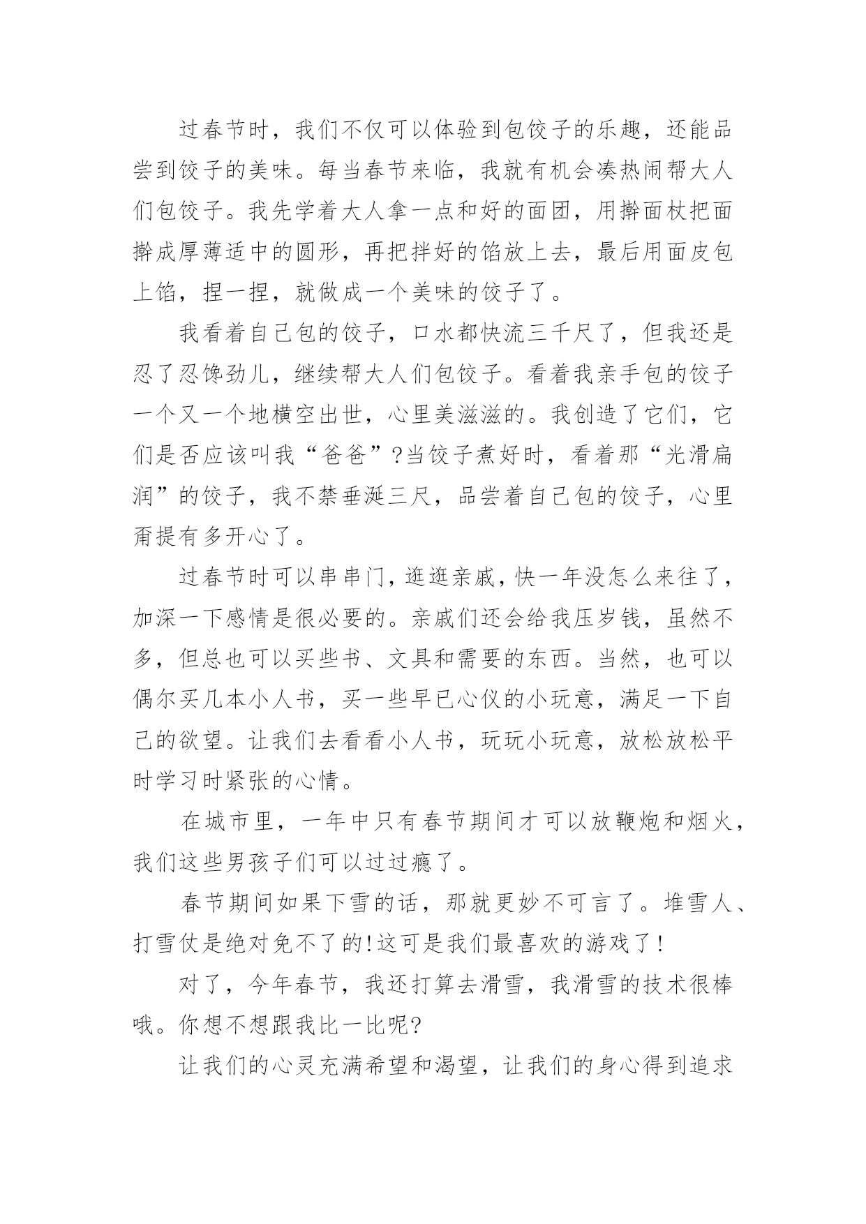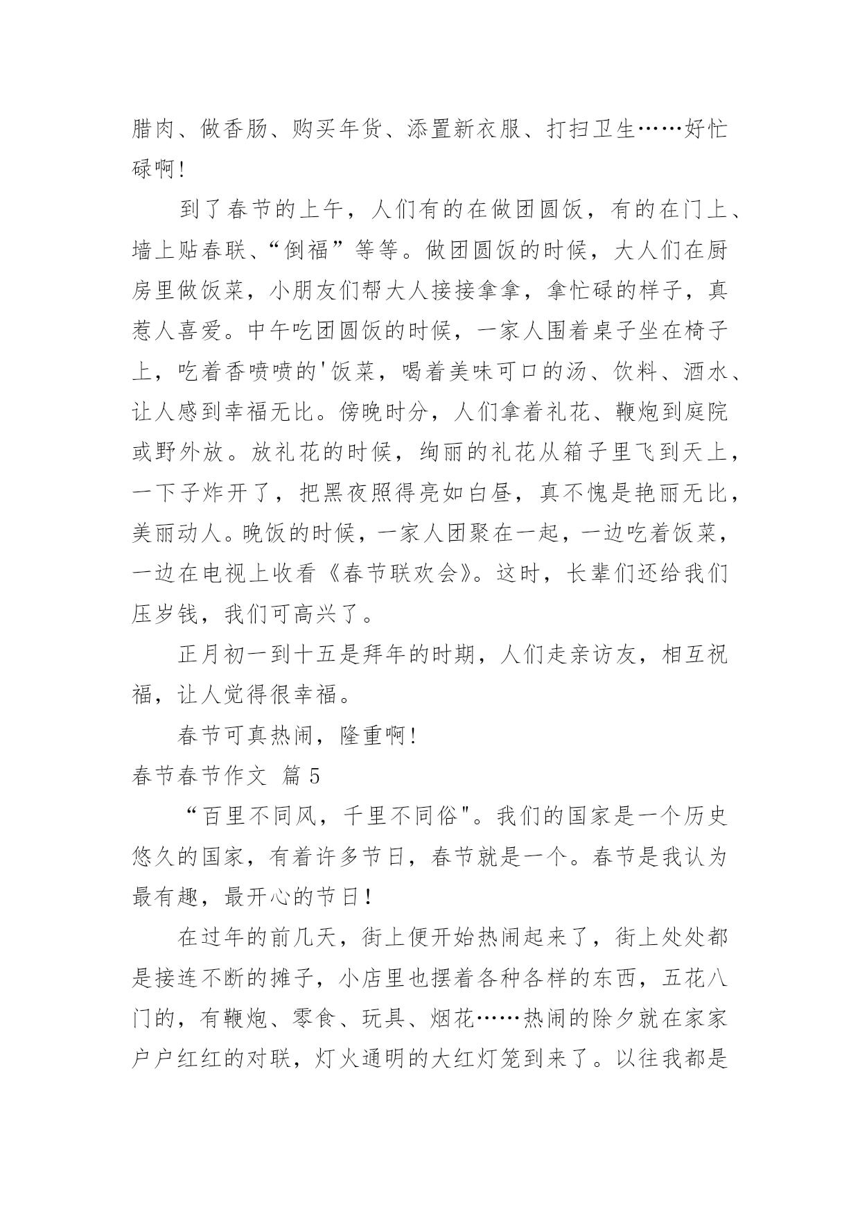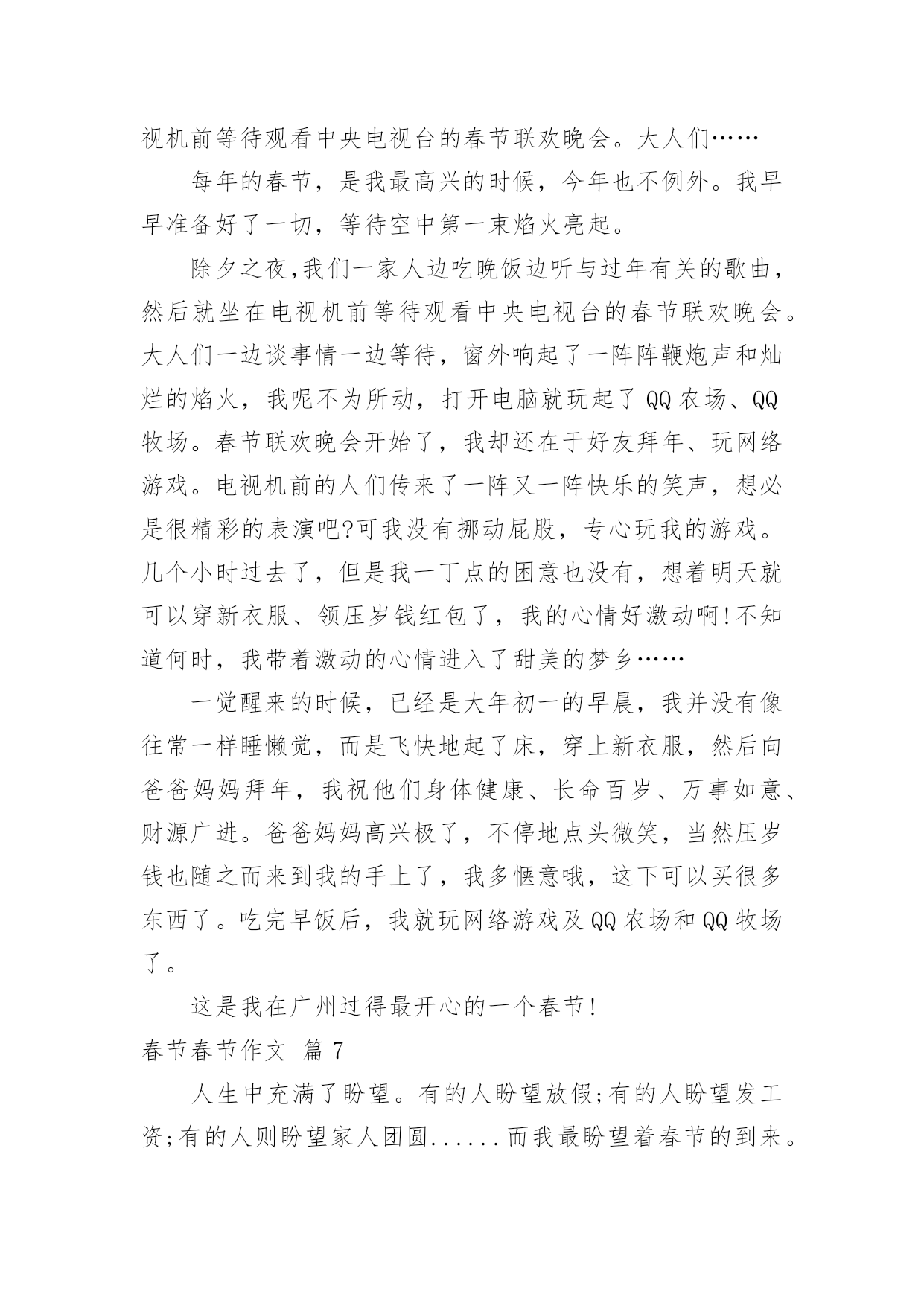 春节春节作文【精华】春节春节作文汇编8篇在生活、工作和学习中,大家对作文都不陌生吧,作文是一种言语活动,具有高度的综合性和创造性。还是对作文一筹莫展吗?以下是小编精心整理的春节春节作文8篇,欢迎大家分享。春节春节作文篇1火红的灯笼挂起来,欢乐的歌儿唱起来,随着噼里啪啦的鞭炮声,春节如约而至的到来了。下面,让我们去作个春节社会调查吧!letusgo!春节是我国的传统节日。是家人团聚,欢天喜地的日子。大部分人走访亲戚,互相送礼也是不可少的。当今社会,春节送礼,许多人已经司空见惯了。那多少人认为"送礼"是春节必不可少的一个内容呢?调查显示:68.5%的人认为"送礼"是春节必不可少的内容,仅有8.9%表示"送礼"并非春节必不可少的内容,有22。6%的被访者表示不好判断。从我们调查的情况看,既然大部分认为送礼是春节必不可少的一个内容,那么今年春节送什么礼物好呢?其中,50%的人认为送食品合适;35%认为送保健品高雅;10%认为送烟酒茶类时尚;5%认为送什么也无所谓。在与被访着的交谈中可以了解到,大家认为“送礼”往往会让人在人情往来上有点累,这“累”需要精力的付出,更需要人民币的“支持”。据有关资料表明,我县一个中等家庭月收入大约为800元左右,而在调查中,受访者的春节消费额度,在400元以下的占19.5%;400—600元占35.8%;600—700元占21.5%;700—800元占12.2%,800—1000元占9%;在1000元以上的占2%。调查表明,23.2%的家庭,春节期间大约将消费一个月的家庭收入。过春节,当然也少不了给孩子们发压岁钱。如今社会,孩子们的压岁钱在600元以上的占40%,在500元左右的占50%,在300元以下的仅占10%。“春节黄金周”期间,少部分人会借着这个机会,出去散散心,去一些山清水秀,环境幽雅的地方去过这一年一度的春节,当然,这也少不了人民币的支持,旅游消费额在1000元左右的占20%,在3000元左右的占45%,在5000元左右的占35%,看来,春节旅游这也是一笔大消费啊!看,街头巷尾,乡里材社,到处百艺杂陈,热闹非凡,听,鞭炮声,嬉笑声,共同编织着春节的欢乐歌!春节春节作文篇2春节来啦!在这个令人兴奋的时刻,家家户户都在门上贴好了春联,并在桌上摆放好了糖果与大糕之类的食品。而在今年春节,我和爸爸妈妈去了奶奶家,迎接在苏州的二妈一家,并且我终于见到了我一年才见两次的调皮捣蛋的堂弟,只要有他在的地方可热闹了。瞧,我一进去,就听见“啪”的一声,原来是堂弟吵着要帮奶奶洗碗,结果奶奶手一松,这只碗随着优美的弧线,光荣的结束了它的使命----摔碎了。二妈见了朝着堂弟叫道:“你呀,就知道帮倒忙!”只见堂弟不慌不忙地说道:“只不过打碎了一只碗而已,没听说过‘岁岁’平安吗?”奶奶和二妈以及刚来的我都“噗嗤”一声笑了起来,刚才的情景好似一点都没有发生过一样。堂弟最喜欢吃的就是大肥肉了,一来便缠着奶奶烧大肥肉给他吃,奶奶摸了摸他的头,疼爱的说:“好,我已经准备好了,现在就烧给你这只馋嘴猫吃。”堂弟一听可乐坏了,站在奶奶身边,一会儿帮奶奶拿这个,一会儿又帮奶奶拿那个,一会儿又围在锅旁边,眼巴巴地等待着锅里的佳肴立刻烧好,那样子即便用望眼欲穿也并不过分。终于烧好了,堂弟以迅雷不及掩耳之势端着大肥肉就往桌子那儿跑,趁我们大家不注意时偷偷吃掉了一半,等我们发现过来时,堂弟不急不慢地说:“不是还留一半给你们呢嘛。”我们大家都怔住了,片刻都哈哈大笑起来,晚餐充满了欢声笑语。春节春节作文篇3天气一冷就想到过年,回乡下奶奶家过年就是我最开心的事,因为奶奶家有一个小商店,重要的不是里面有多少好吃的,而是里面有很多城里买不到的好东西-----鞭炮,一回到老家我就可以肆无忌惮了,想怎么过瘾就怎么过瘾。去年春节,回到奶奶家,一下车我就直奔商店。一年都没有玩过摔炮了,有点兴奋过头,先找到摔炮,连门都没出,直接拿出两个一齐摔在地上,这时才发现我旁边还躺着一只小猫,但是已经晚了,只听“啪--啪--”的二重唱,摔炮落地了,小猫被吓得浑身的毛都竖了起来,喵---呜一声蹿了出去,转眼没了踪影。我和哥哥哈哈大笑,追向大门外。这一下午就拿着摔炮,在村里逛着,把那些在外面跑的小猫、小狗、小鸡逗了个遍,实在是太好玩了,不过后来还是被大人们训了一顿。晚上吃团圆饭的时候,喝完饮料,手里拿着瓶盖玩,看到桌子上有一个小鞭炮,突然有了一个好主意。一吃完饭我就拉着哥哥出来放鞭炮,哥哥找来一个捻芯比较长的鞭炮,放在石板上,让我去点。我故意把院子里的灯关上,说这样就能看到它爆炸的火花,在我点火的时候,悄悄地把瓶盖盖在了小炮身上,然后自己躲得老远。“砰”的一声,盖子随着一声巨响飞上了天空,紧接着,一个小东西从天而降,不偏不倚,正砸在了哥哥的鼻尖上,“什么东西?”哥哥吓得连退几步