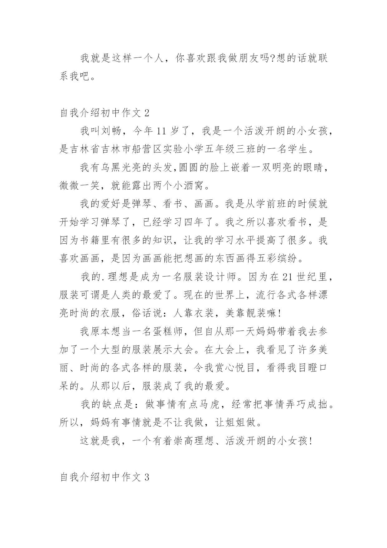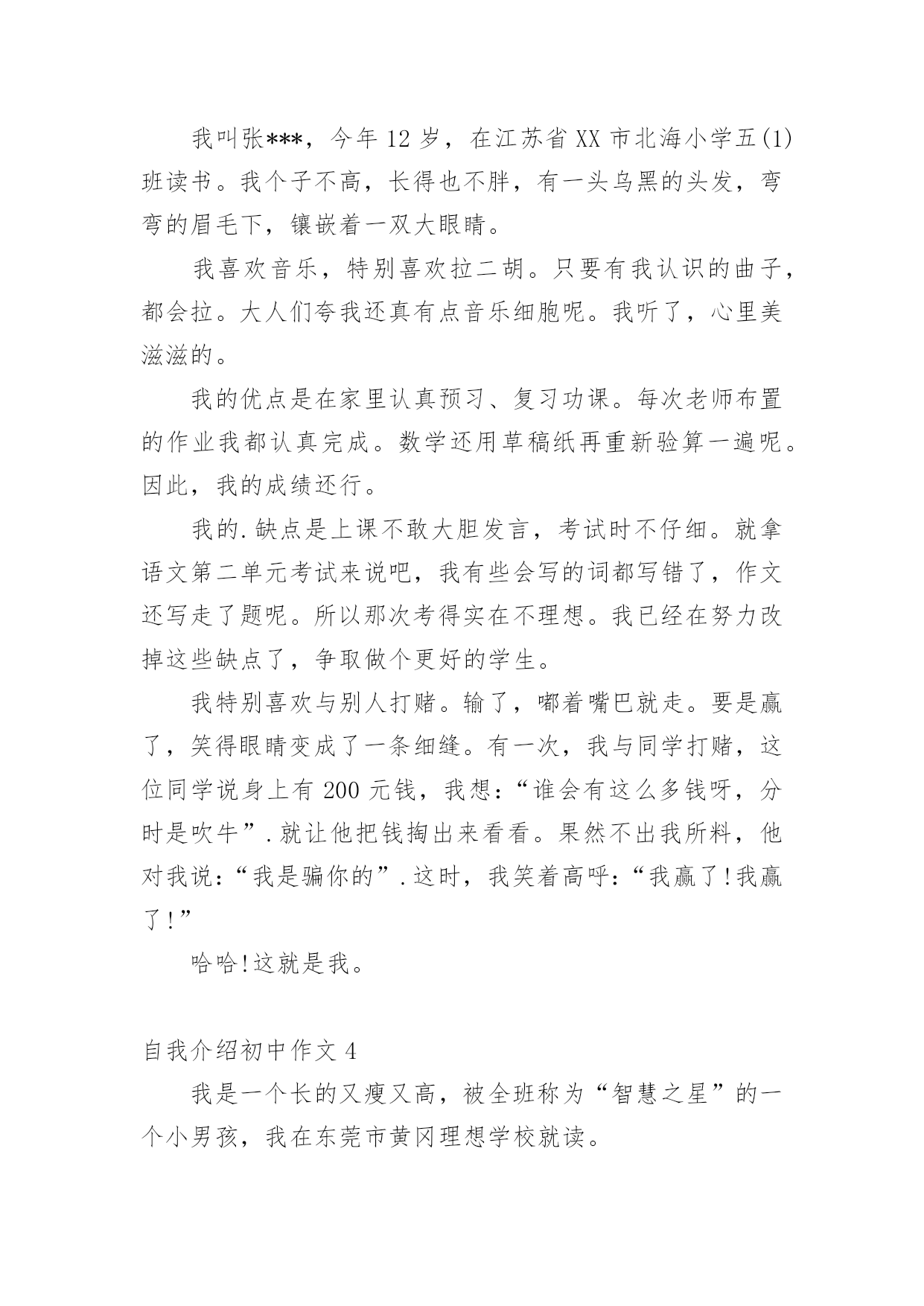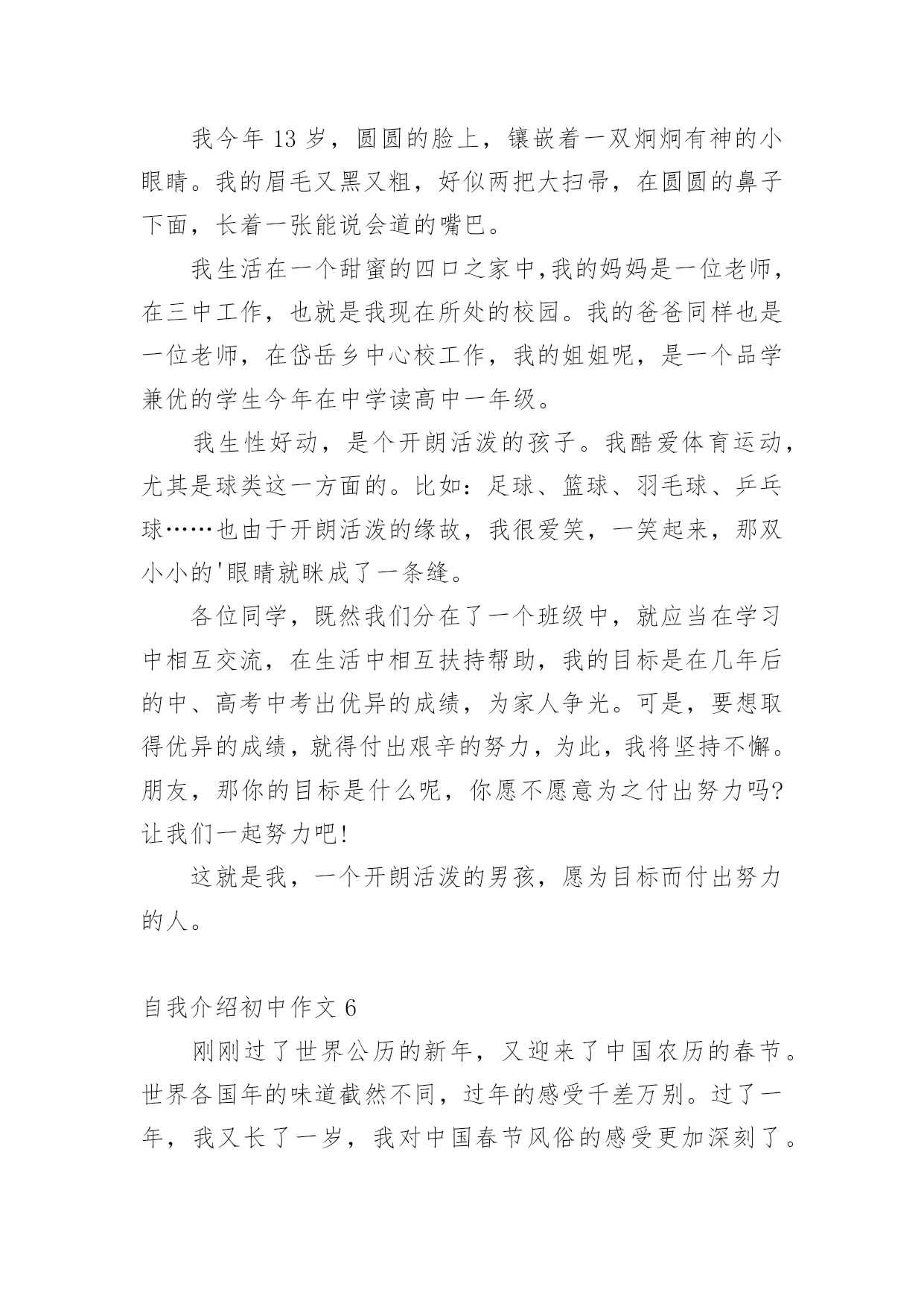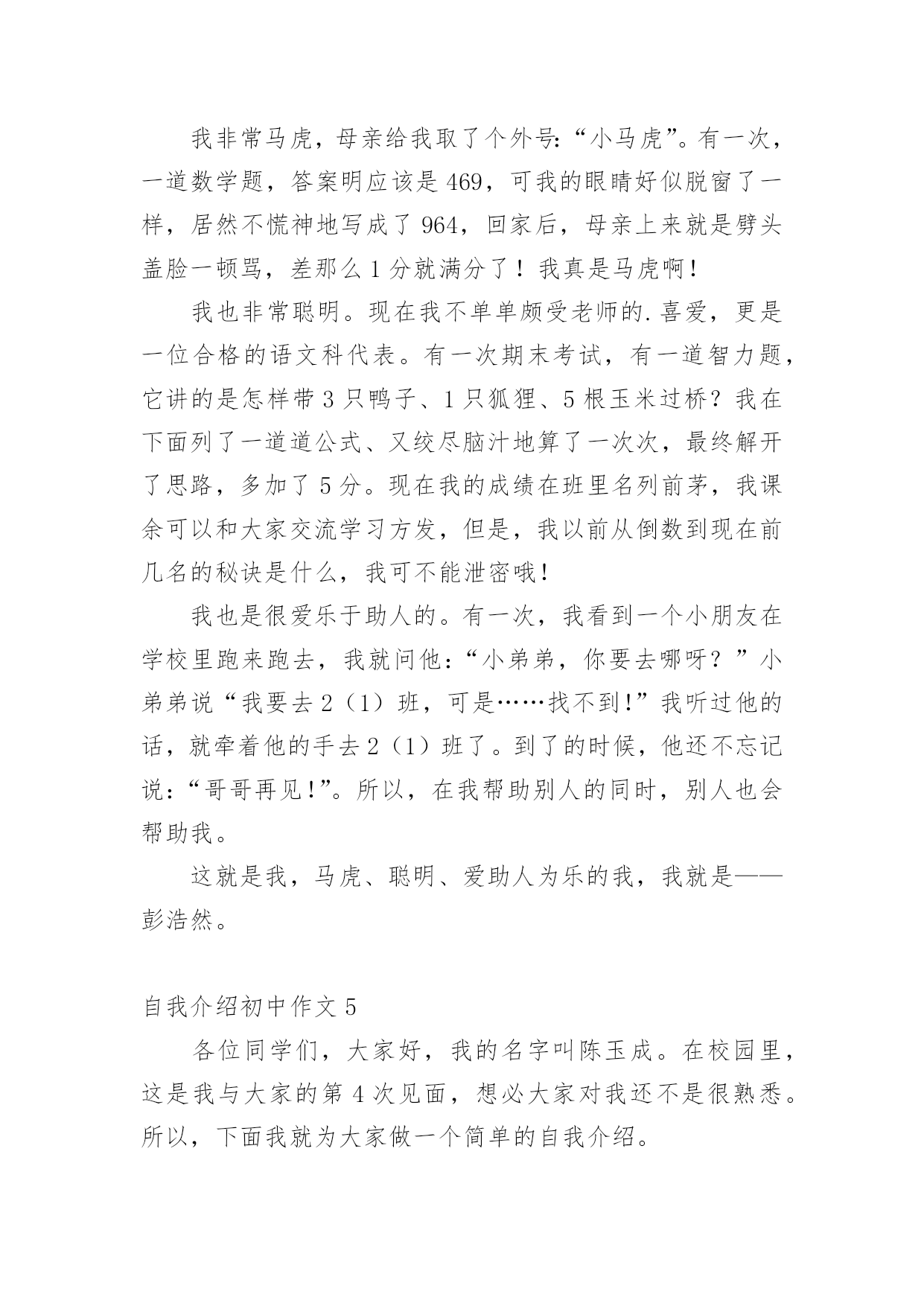 自我介绍初中作文当碰到不熟悉的人时,我们往往需要进行适当的自我介绍,通过自我介绍可以让别人认识自己。千万不能认为自我介绍随便应付就可以,以下是小编整理的自我介绍初中作文,仅供参考,希望能够帮助到大家。自我介绍初中作文1我叫肖佳暖,在妈妈的眼中我是个可爱的孩子,留着一头秀发,一双大眼睛有神明亮。我爱说话,经常‘哇啦哇啦’说个不听,所以妈妈叫我小麻雀。我爱画画,特别是动物跟风景最拿手了,同学都说我画的栩栩如生,所以每逢班里出黑班报跟图画赛都有我的名字。我爱看书,是个小书谜!当我手里拿着书看着的时候,你千万不要叫我哦,因为当我看书时我就会两耳不闻窗外事,就算是吃饭的大事,我都会不在意。我的理想多,每当从书上看发明家,发明了新产品,我的理想就是成为一个科学家,妈妈老是生病,经常要去找医生看病,这时我的理想就变成一个出色的医生了。总之,我的'理想很多很多,妈妈都说我太贪心了。我缺点也不少,上课时老是走神不注意听老师讲课,总是做小动作,总被老师批评。我就会悔过自新并发誓的想:小次再也不这样了!可是之后……到现在这个坏习惯我还在努力改正呢。我就是这样一个人,你喜欢跟我做朋友吗?想的话就联系我吧。自我介绍初中作文2我叫刘畅,今年11岁了,我是一个活泼开朗的小女孩,是吉林省吉林市船营区实验小学五年级三班的一名学生。我有乌黑光亮的头发,圆圆的脸上嵌着一双明亮的眼睛,微微一笑,就能露出两个小酒窝。我的爱好是弹琴、看书、画画。我是从学前班的时候就开始学习弹琴了,已经学习四年了。我之所以喜欢看书,是因为书籍里有很多的知识,让我的学习水平提高了很多。我喜欢画画,是因为画画能把想画的东西画得五彩缤纷。我的.理想是成为一名服装设计师。因为在21世纪里,服装可谓是人类的最爱了。现在的世界上,流行各式各样漂亮时尚的衣服,俗话说:人靠衣装,美靠靓装嘛!我原本想当一名蛋糕师,但自从那一天妈妈带着我去参加了一个大型的服装展示大会。在大会上,我看见了许多美丽、时尚的各式各样的服装,令我赏心悦目,看得我目瞪口呆的。从那以后,服装成了我的最爱。我的缺点是:做事情有点马虎,经常把事情弄巧成拙。所以,妈妈有事情就是不让我做,让姐姐做。这就是我,一个有着崇高理想、活泼开朗的小女孩!自我介绍初中作文3我叫张***,今年12岁,在江苏省XX市北海小学五(1)班读书。我个子不高,长得也不胖,有一头乌黑的头发,弯弯的眉毛下,镶嵌着一双大眼睛。我喜欢音乐,特别喜欢拉二胡。只要有我认识的曲子,都会拉。大人们夸我还真有点音乐细胞呢。我听了,心里美滋滋的。我的优点是在家里认真预习、复习功课。每次老师布置的作业我都认真完成。数学还用草稿纸再重新验算一遍呢。因此,我的成绩还行。我的.缺点是上课不敢大胆发言,考试时不仔细。就拿语文第二单元考试来说吧,我有些会写的词都写错了,作文还写走了题呢。所以那次考得实在不理想。我已经在努力改掉这些缺点了,争取做个更好的学生。我特别喜欢与别人打赌。输了,嘟着嘴巴就走。要是赢了,笑得眼睛变成了一条细缝。有一次,我与同学打赌,这位同学说身上有200元钱,我想:“谁会有这么多钱呀,分时是吹牛”.就让他把钱掏出来看看。果然不出我所料,他对我说:“我是骗你的”.这时,我笑着高呼:“我赢了!我赢了!”哈哈!这就是我。自我介绍初中作文4我是一个长的又瘦又高,被全班称为“智慧之星”的一个小男孩,我在东莞市黄冈理想学校就读。我非常马虎,母亲给我取了个外号:“小马虎”。有一次,一道数学题,答案明应该是469,可我的眼睛好似脱窗了一样,居然不慌神地写成了964,回家后,母亲上来就是劈头盖脸一顿骂,差那么1分就满分了!我真是马虎啊!我也非常聪明。现在我不单单颇受老师的.喜爱,更是一位合格的语文科代表。有一次期末考试,有一道智力题,它讲的是怎样带3只鸭子、1只狐狸、5根玉米过桥?我在下面列了一道道公式、又绞尽脑汁地算了一次次,最终解开了思路,多加了5分。现在我的成绩在班里名列前茅,我课余可以和大家交流学习方发,但是,我以前从倒数到现在前几名的秘诀是什么,我可不能泄密哦!我也是很爱乐于助人的。有一次,我看到一个小朋友在学校里跑来跑去,我就问他:“小弟弟,你要去哪呀?”小弟弟说“我要去2(1)班,可是……找不到!”我听过他的话,就牵着他的手去2(1)班了。到了的时候,他还不忘记说:“哥哥再见!”。所以,在我帮助别人的同时,别人也会帮助我。这就是我,马虎、聪明、爱助人为乐的我,我就是——彭浩然。自我介绍初中作文5各位同学们,大家好,我的名字叫陈玉成。在校园里,这是我与大家的第4次见面,想必大家对我还不是很熟悉。所以,下面我就为大家做一个简单的自我介绍。我今年13岁,圆圆的脸上,镶嵌着一双炯炯有神的小眼睛。我的眉毛又黑又粗,好似两把大扫帚,在圆圆的鼻子下面,长着一张能说会道的嘴巴。我生活在一个甜