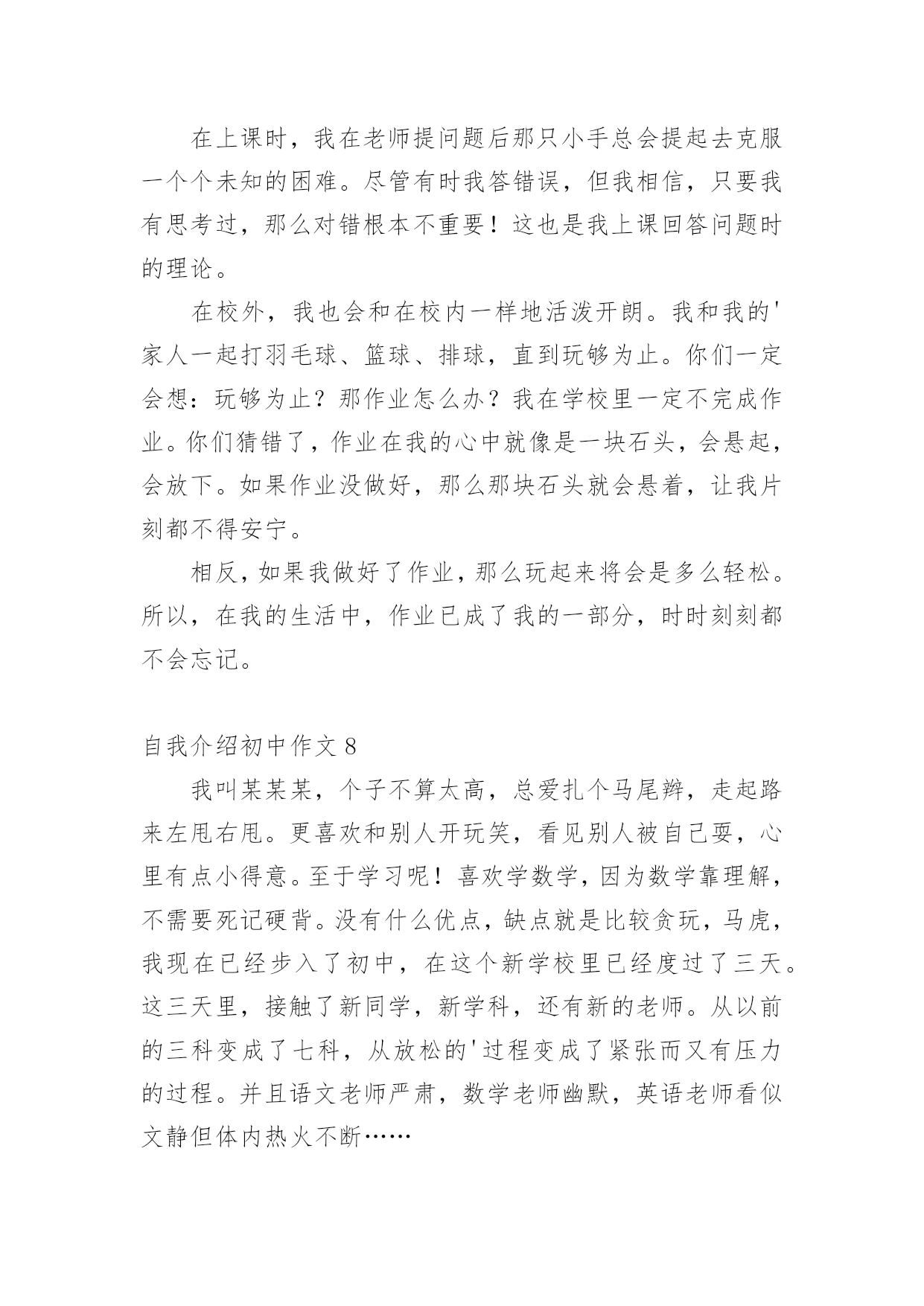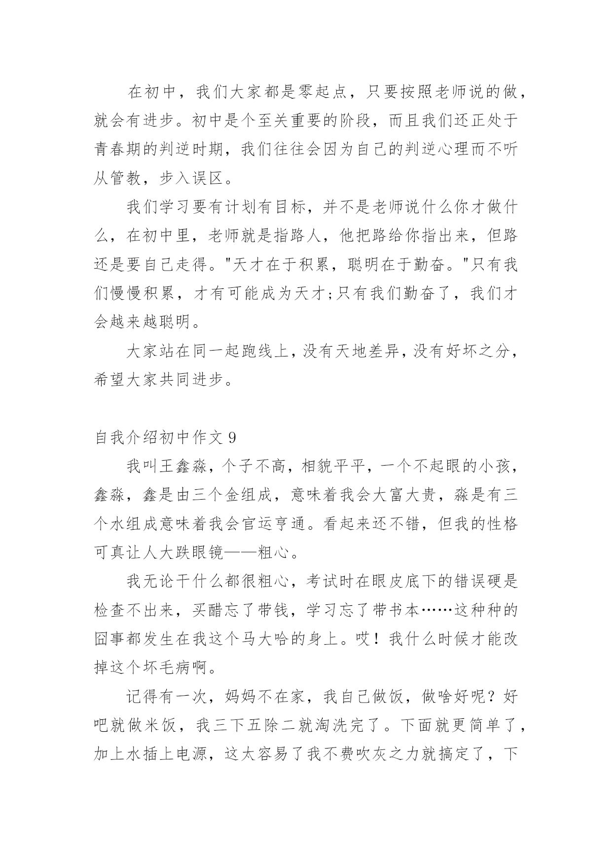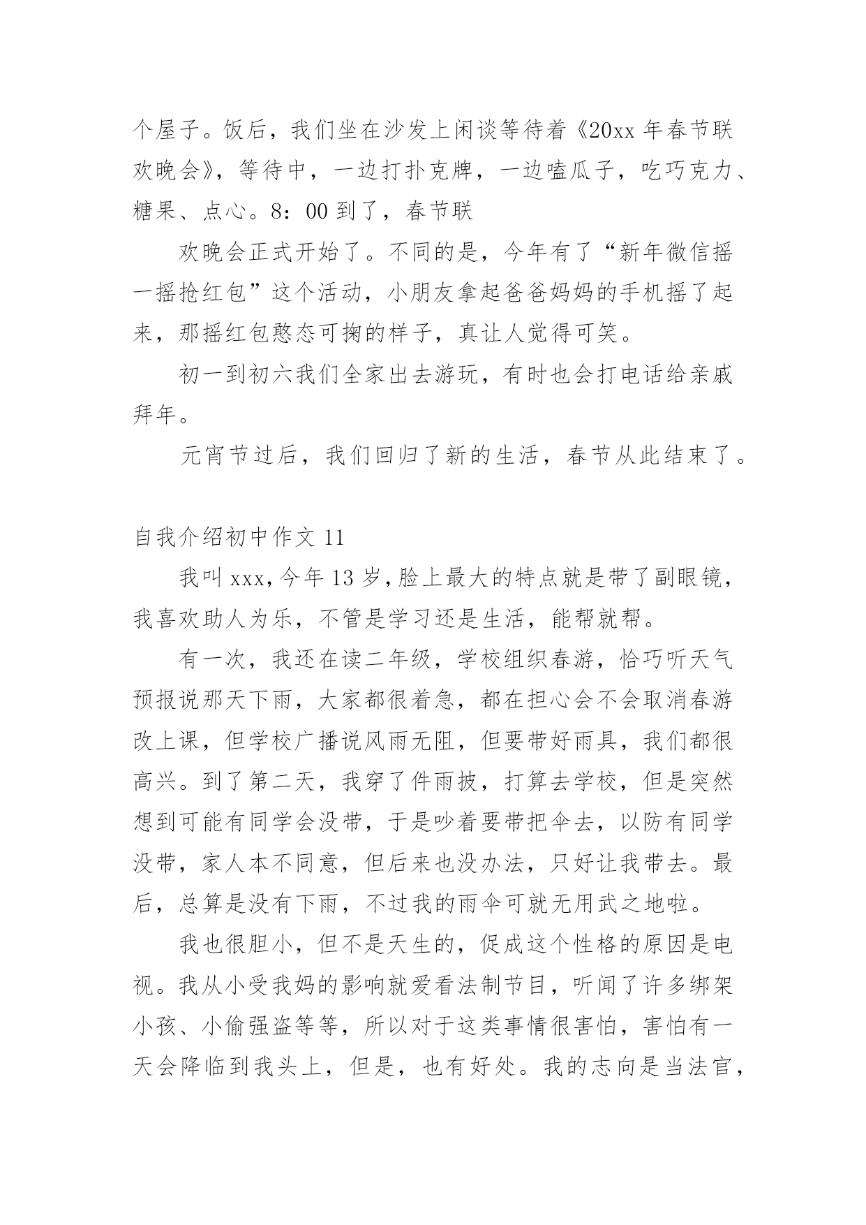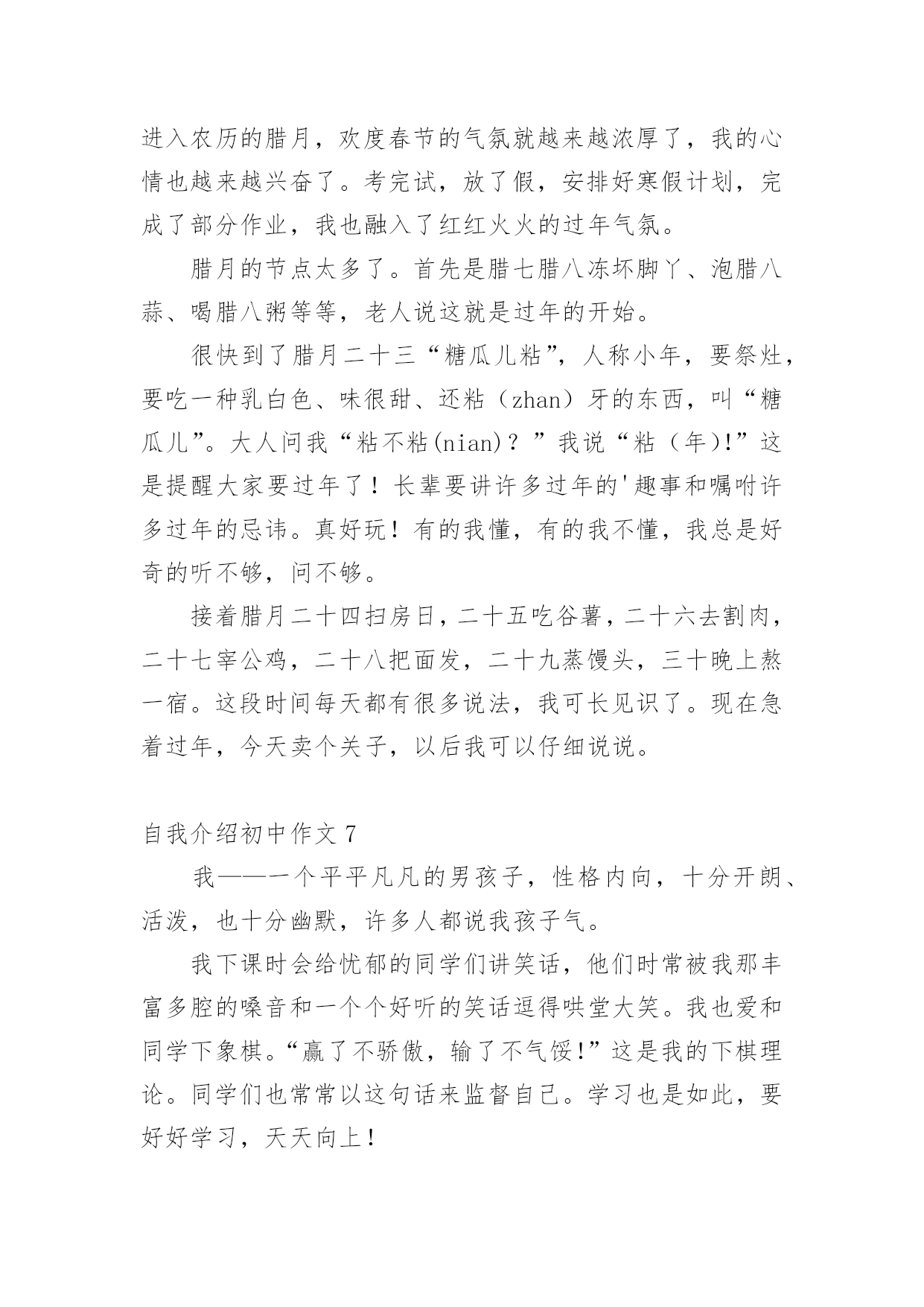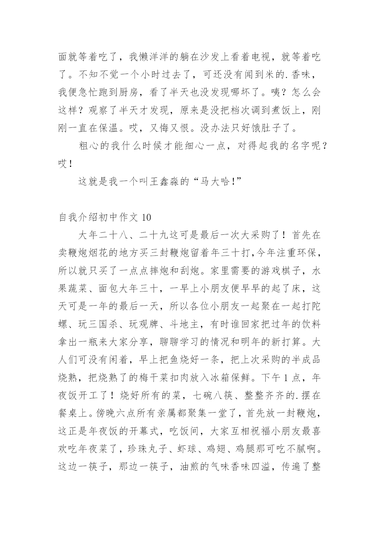 自我介绍初中作文当碰到不熟悉的人时,我们往往需要进行适当的自我介绍,通过自我介绍可以让别人认识自己。千万不能认为自我介绍随便应付就可以,以下是小编整理的自我介绍初中作文,仅供参考,希望能够帮助到大家。自我介绍初中作文1我叫肖佳暖,在妈妈的眼中我是个可爱的孩子,留着一头秀发,一双大眼睛有神明亮。我爱说话,经常‘哇啦哇啦’说个不听,所以妈妈叫我小麻雀。我爱画画,特别是动物跟风景最拿手了,同学都说我画的栩栩如生,所以每逢班里出黑班报跟图画赛都有我的名字。我爱看书,是个小书谜!当我手里拿着书看着的时候,你千万不要叫我哦,因为当我看书时我就会两耳不闻窗外事,就算是吃饭的大事,我都会不在意。我的理想多,每当从书上看发明家,发明了新产品,我的理想就是成为一个科学家,妈妈老是生病,经常要去找医生看病,这时我的理想就变成一个出色的医生了。总之,我的'理想很多很多,妈妈都说我太贪心了。我缺点也不少,上课时老是走神不注意听老师讲课,总是做小动作,总被老师批评。我就会悔过自新并发誓的想:小次再也不这样了!可是之后……到现在这个坏习惯我还在努力改正呢。我就是这样一个人,你喜欢跟我做朋友吗?想的话就联系我吧。自我介绍初中作文2我叫刘畅,今年11岁了,我是一个活泼开朗的小女孩,是吉林省吉林市船营区实验小学五年级三班的一名学生。我有乌黑光亮的头发,圆圆的脸上嵌着一双明亮的眼睛,微微一笑,就能露出两个小酒窝。我的爱好是弹琴、看书、画画。我是从学前班的时候就开始学习弹琴了,已经学习四年了。我之所以喜欢看书,是因为书籍里有很多的知识,让我的学习水平提高了很多。我喜欢画画,是因为画画能把想画的东西画得五彩缤纷。我的.理想是成为一名服装设计师。因为在21世纪里,服装可谓是人类的最爱了。现在的世界上,流行各式各样漂亮时尚的衣服,俗话说:人靠衣装,美靠靓装嘛!我原本想当一名蛋糕师,但自从那一天妈妈带着我去参加了一个大型的服装展示大会。在大会上,我看见了许多美丽、时尚的各式各样的服装,令我赏心悦目,看得我目瞪口呆的。从那以后,服装成了我的最爱。我的缺点是:做事情有点马虎,经常把事情弄巧成拙。所以,妈妈有事情就是不让我做,让姐姐做。这就是我,一个有着崇高理想、活泼开朗的小女孩!自我介绍初中作文3我叫张***,今年12岁,在江苏省XX市北海小学五(1)班读书。我个子不高,长得也不胖,有一头乌黑的头发,弯弯的眉毛下,镶嵌着一双大眼睛。我喜欢音乐,特别喜欢拉二胡。只要有我认识的曲子,都会拉。大人们夸我还真有点音乐细胞呢。我听了,心里美滋滋的。我的优点是在家里认真预习、复习功课。每次老师布置的作业我都认真完成。数学还用草稿纸再重新验算一遍呢。因此,我的成绩还行。我的.缺点是上课不敢大胆发言,考试时不仔细。就拿语文第二单元考试来说吧,我有些会写的词都写错了,作文还写走了题呢。所以那次考得实在不理想。我已经在努力改掉这些缺点了,争取做个更好的学生。我特别喜欢与别人打赌。输了,嘟着嘴巴就走。要是赢了,笑得眼睛变成了一条细缝。有一次,我与同学打赌,这位同学说身上有200元钱,我想:“谁会有这么多钱呀,分时是吹牛”.就让他把钱掏出来看看。果然不出我所料,他对我说:“我是骗你的”.这时,我笑着高呼:“我赢了!我赢了!”哈哈!这就是我。自我介绍初中作文4我是一个长的又瘦又高,被全班称为“智慧之星”的一个小男孩,我在东莞市黄冈理想学校就读。我非常马虎,母亲给我取了个外号:“小马虎”。有一次,一道数学题,答案明应该是469,可我的眼睛好似脱窗了一样,居然不慌神地写成了964,回家后,母亲上来就是劈头盖脸一顿骂,差那么1分就满分了!我真是马虎啊!我也非常聪明。现在我不单单颇受老师的.喜爱,更是一位合格的语文科代表。有一次期末考试,有一道智力题,它讲的是怎样带3只鸭子、1只狐狸、5根玉米过桥?我在下面列了一道道公式、又绞尽脑汁地算了一次次,最终解开了思路,多加了5分。现在我的成绩在班里名列前茅,我课余可以和大家交流学习方发,但是,我以前从倒数到现在前几名的秘诀是什么,我可不能泄密哦!我也是很爱乐于助人的。有一次,我看到一个小朋友在学校里跑来跑去,我就问他:“小弟弟,你要去哪呀?”小弟弟说“我要去2(1)班,可是……找不到!”我听过他的话,就牵着他的手去2(1)班了。到了的时候,他还不忘记说:“哥哥再见!”。所以,在我帮助别人的同时,别人也会帮助我。这就是我,马虎、聪明、爱助人为乐的我,我就是——彭浩然。自我介绍初中作文5各位同学们,大家好,我的名字叫陈玉成。在校园里,这是我与大家的第4次见面,想必大家对我还不是很熟悉。所以,下面我就为大家做一个简单的自我介绍。我今年13岁,圆圆的脸上,镶嵌着一双炯炯有神的小眼睛。我的眉毛又黑又粗,好似两把大扫帚,在圆圆的鼻子下面,长着一张能说会道的嘴巴。我生活在一个甜