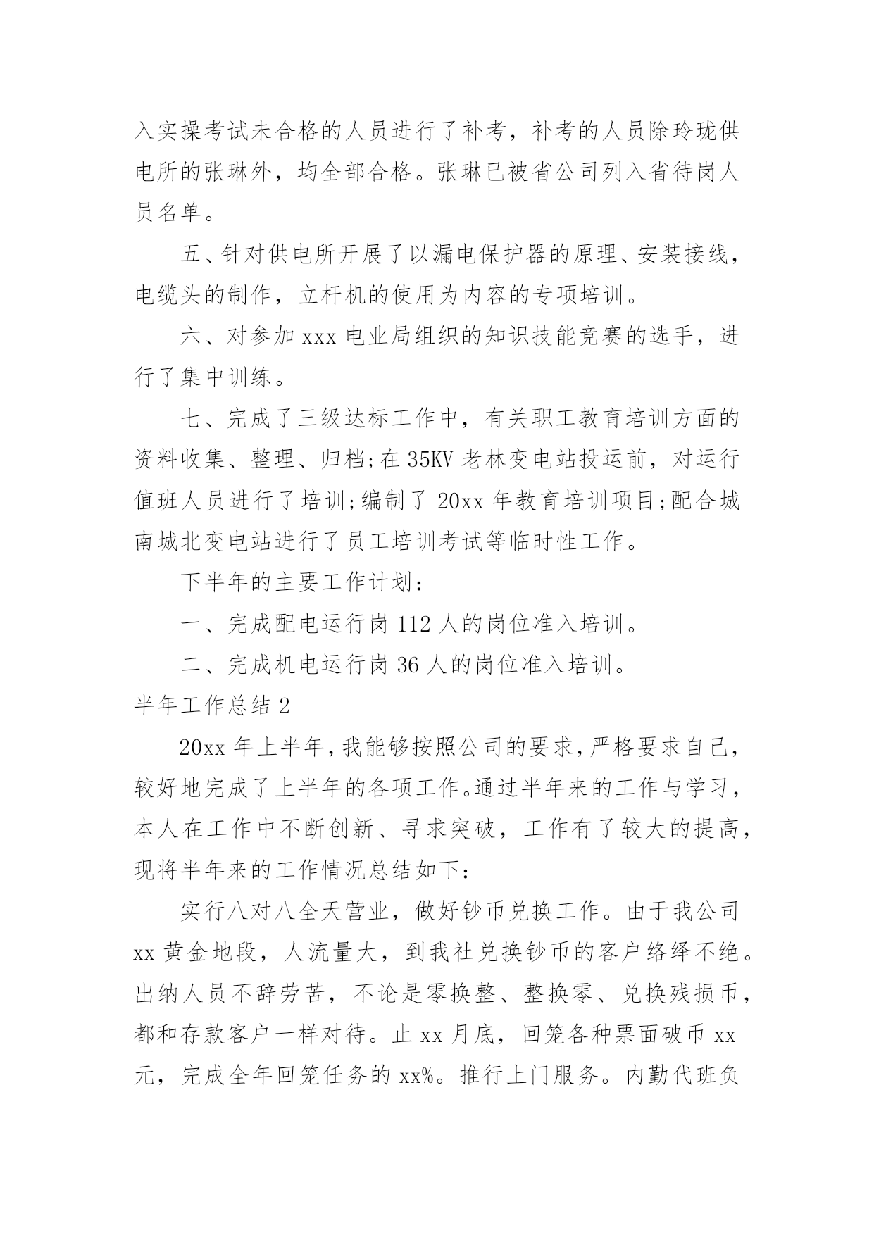 半年工作总结半年工作总结总结就是把一个时段的学习、工作或其完成情况进行一次全面系统的总结,它可以使我们更有效率,我想我们需要写一份总结了吧。但是总结有什么要求呢?以下是小编整理的半年工作总结,仅供参考,大家一起来看看吧。半年工作总结1xxxx年上半年,培训中心在经营集团的正确领导下,紧紧围绕提高员工文化素质和业务技能的要求,展开了本部门的工作。现总结如下:一、根据省公司和xxx电业局对培训工作的要求,结合各生产经营单位员工的培训需求以及公司的实际情况,年初制定了xxxx年公司的年度培训计划。二、按照省公司的规定,清理了年龄在40岁及以下员工的学历情况,对未取得中专技校以上学历的`员工进行了梳理,并组织报考了西安电子科技大学电力系统自动化专业网络班。三、组织符合申报条件的员工进行了初、中、高级工、技师职业资格鉴定的申报、理论考试、履职培训及鉴定工作。四、开展了岗位准入培训,4-5月,完成了农网营销岗的实际操作培训和考试。对前期配电运行、农网配电岗位准入实操考试未合格的人员进行了补考,补考的人员除玲珑供电所的张琳外,均全部合格。张琳已被省公司列入省待岗人员名单。五、针对供电所开展了以漏电保护器的原理、安装接线,电缆头的制作,立杆机的使用为内容的专项培训。六、对参加xxx电业局组织的知识技能竞赛的选手,进行了集中训练。七、完成了三级达标工作中,有关职工教育培训方面的资料收集、整理、归档;在35KV老林变电站投运前,对运行值班人员进行了培训;编制了20xx年教育培训项目;配合城南城北变电站进行了员工培训考试等临时性工作。下半年的主要工作计划:一、完成配电运行岗112人的岗位准入培训。二、完成机电运行岗36人的岗位准入培训。半年工作总结220xx年上半年,我能够按照公司的要求,严格要求自己,较好地完成了上半年的各项工作。通过半年来的工作与学习,本人在工作中不断创新、寻求突破,工作有了较大的提高,现将半年来的工作情况总结如下:实行八对八全天营业,做好钞币兑换工作。由于我公司xx黄金地段,人流量大,到我社兑换钞币的客户络绎不绝。出纳人员不辞劳苦,不论是零换整、整换零、兑换残损币,都和存款客户一样对待。止xx月底,回笼各种票面破币xx元,完成全年回笼任务的xx%。推行上门服务。内勤代班负责人坚持每天上门服务,同时加强对xx公司、超市、规模较大的个体工商户进行重点服务。止xx月底,仅xx公司一家就上门收款xx余次,揽储xx元。同时,利用这一客户关系,将xx技术员工资发权从xx手中夺过来。止xx月底,发工资xx笔,揽储xx元。20xx年上半年我公司各部门都取得了可喜的成就,作为公司出纳,我在收付、反映、监督、管理四个方面尽到了应尽的职责,特别是在xx期间,仍按时到银行等公共场合办理业务。xx月份根据公司安排着手成本会计交接工作。首先为接手人详细介绍工作内容和,其次为接手人进行会计电算化软件方面的培训和指导,在为期两个月的时间内完成交接工作,接手人基本能顺利开展工作,为公司工作持续稳定的开展做好了基础。由于感到自己身上的担子很重,而自己的学识、能力和阅历与其任职都有一定的距离,所以总不敢掉以轻心,总在学习,向书本学习、向周围的领导学习,向同事学习,这样下来感觉自己半年来还是有了一定的进步。经过不断学习、不断积累,已具备了办公室工作,能够比较从容地处理日常工作中出现的'各类问题,在组织管理能力、综合分析能力、协调办事能力和文字言语表达能力等方面,经过半年的锻炼都有了很大的提高,保证了本岗位各项工作的正常运行,能够以正确的态度对待各项工作任务,热爱本职工作,认真努力贯彻到实际工作中去。积极提高自身各项业务素质,争取工作的主动性,具备较强的专业心,责任心,努力提高工作效率和工作质量。对以上几点自身所存在的问题,已切实地影响到自己的本职工作,作为一名的公司秘书,我感到十分内疚。但过去的都已成为过去,学习先进找差距,总结不足求上进,为此,我将认真总结,实实在在分析原因,找出存在的问题,从中吸取经验和教训,并在以后的工作中不断改进,以下为下半年我决心做好的几个方面:为做好职工的思想政治工作,xx成员及xx管理人员经常深入生产一线,了解职工思想状况,及时理顺职工情绪,对职工中出现的突出矛盾,及时召开思想政治研讨会议分析解决。我们及时召开老职工座谈会,给他们送去组织温暖,确保了队伍的稳定。同时,筹集资金,改善职工食堂环境和服务,及时慰问困难、患病职工;组织职工外出参观学习,改善职工福利。为职工办实事,办好事,体现人性化管理。xx对我来说是一个全新的工作领域。作为办公室的负责人,自己清醒地认识到,办公室是总经理室直接领导下的综合管理机构,是承上启下、沟通内外、协调左右、联系四面八方的枢纽,推动各项工作朝着既定目标前进的中心。办公室的工作千头万绪,在文件起草、提供
