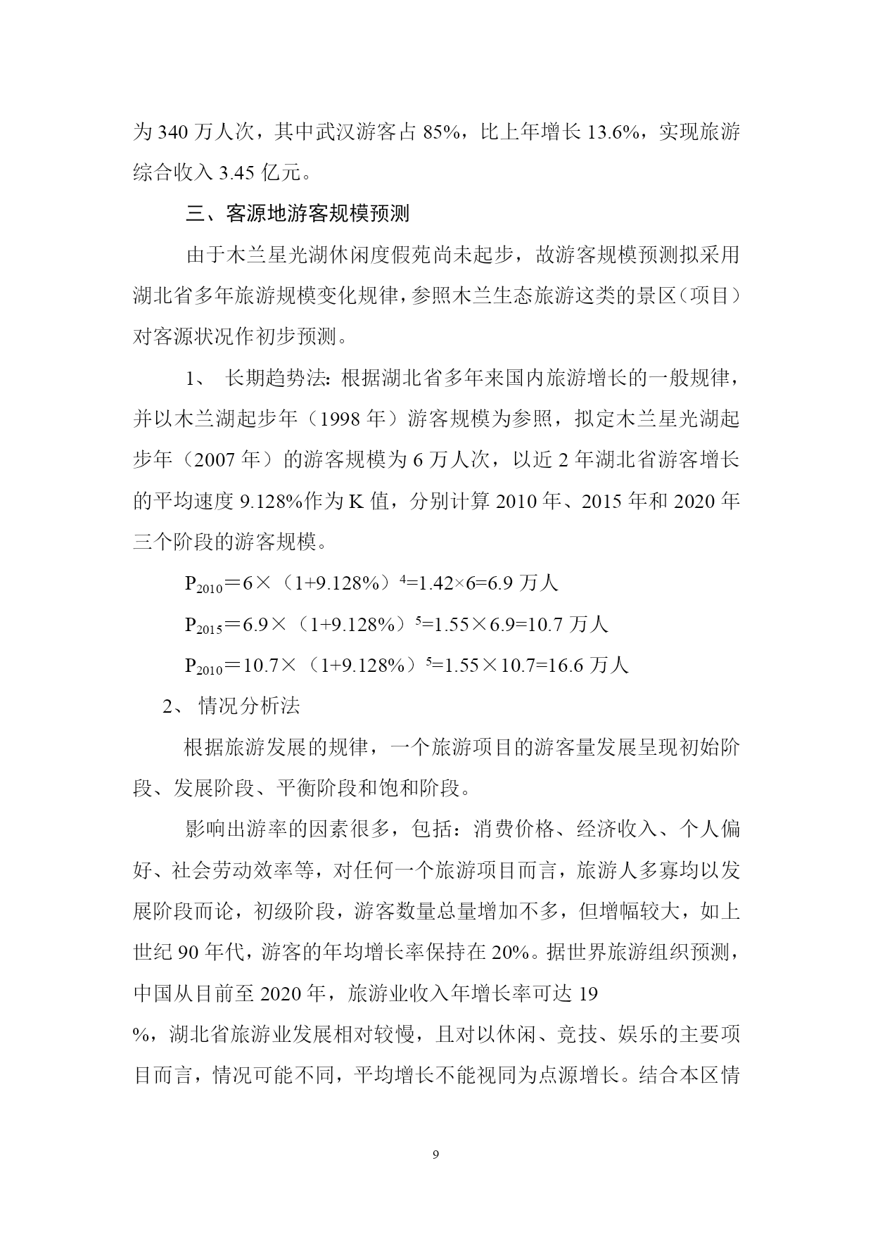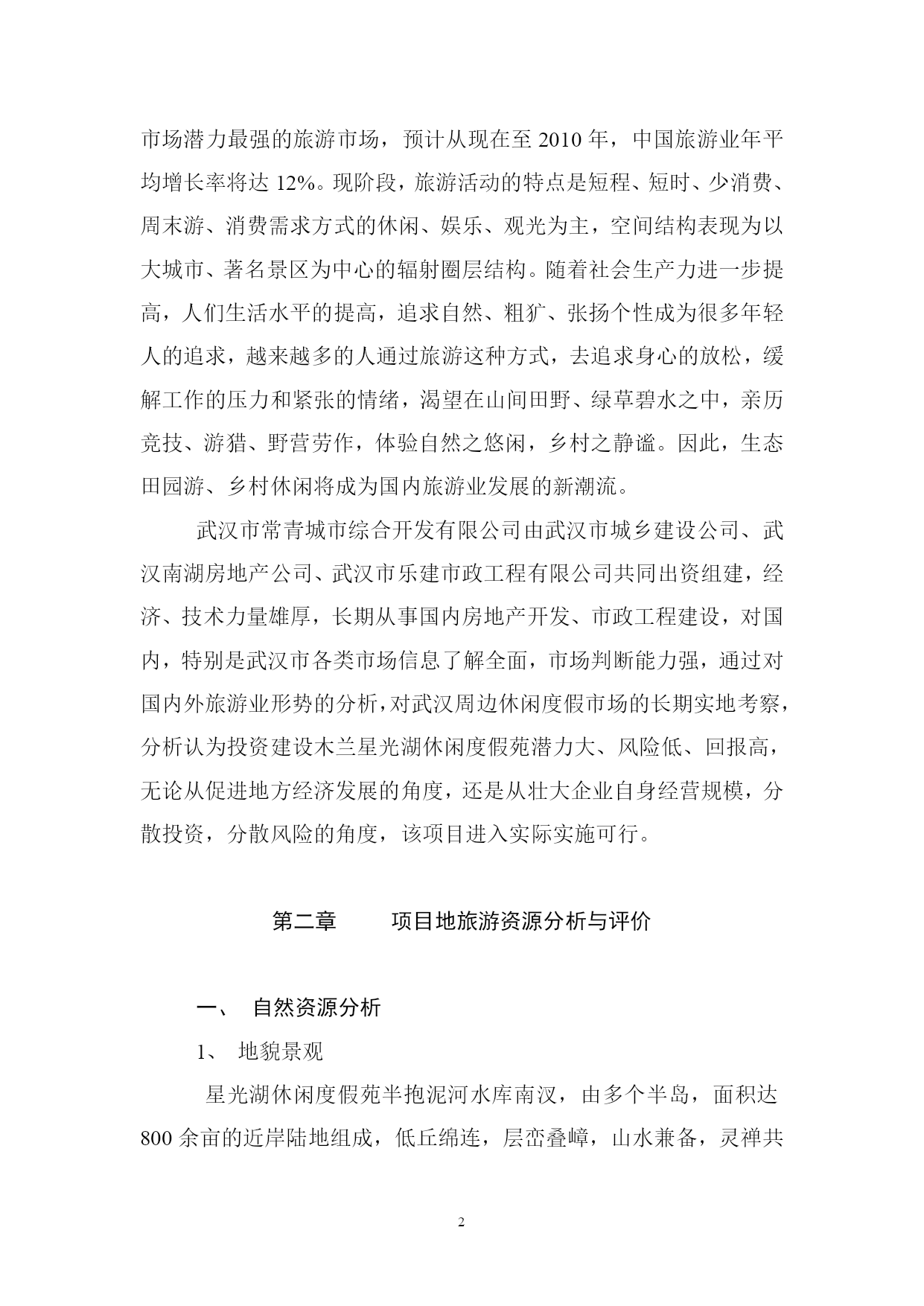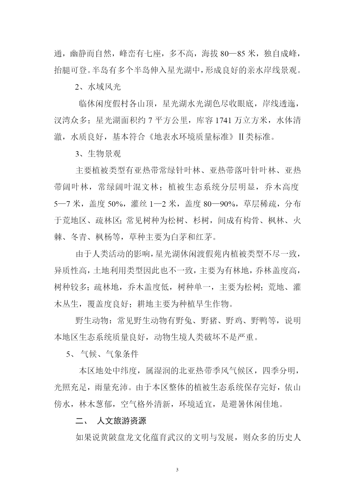 PAGEPAGE18概述项目概况项目名称及性质名称:星光湖休闲度假苑性质:新建项目内容星光湖休闲度假苑项目包括狩猎区、射箭场、别墅区、中心接待区、停车场、野营区、农庄美食休闲区等;总投资9300万元。建设地点项目处在武汉市黄陂区罗汉街长岭镇接壤部,位于星光湖东畔。建设单位业主单位:武汉市常青城市综合开发有限公司负责人:乐道明可行性研究报告编制依据《中华人民共和国水法》、《中华人民共和国水污染防治法》、《中华人民共和国水土保持法》、《黄陂区土地利用总体规划》、《黄陂旅游开发总体规划》(纲要)、《武汉市木兰生态旅游区环境保护规划方案》项目背景介绍世界旅游业的快速发展已经成为现代世界经济的一大特征,在过去的十多年里,全球旅游业平均增长率达9%,自改革开放以来,我国旅游业已成为第三产业中最具活力的新兴产品,国民经济新的增长点。据专家研究表明:中国国内旅游是世界上数量最大、增长最快、市场潜力最强的旅游市场,预计从现在至2010年,中国旅游业年平均增长率将达12%。现阶段,旅游活动的特点是短程、短时、少消费、周末游、消费需求方式的休闲、娱乐、观光为主,空间结构表现为以大城市、著名景区为中心的辐射圈层结构。随着社会生产力进一步提高,人们生活水平的提高,追求自然、粗犷、张扬个性成为很多年轻人的追求,越来越多的人通过旅游这种方式,去追求身心的放松,缓解工作的压力和紧张的情绪,渴望在山间田野、绿草碧水之中,亲历竞技、游猎、野营劳作,体验自然之悠闲,乡村之静谧。因此,生态田园游、乡村休闲将成为国内旅游业发展的新潮流。武汉市常青城市综合开发有限公司由武汉市城乡建设公司、武汉南湖房地产公司、武汉市乐建市政工程有限公司共同出资组建,经济、技术力量雄厚,长期从事国内房地产开发、市政工程建设,对国内,特别是武汉市各类市场信息了解全面,市场判断能力强,通过对国内外旅游业形势的分析,对武汉周边休闲度假市场的长期实地考察,分析认为投资建设木兰星光湖休闲度假苑潜力大、风险低、回报高,无论从促进地方经济发展的角度,还是从壮大企业自身经营规模,分散投资,分散风险的角度,该项目进入实际实施可行。项目地旅游资源分析与评价自然资源分析地貌景观星光湖休闲度假苑半抱泥河水库南汊,由多个半岛,面积达800余亩的近岸陆地组成,低丘绵连,层峦叠嶂,山水兼备,灵禅共通,幽静而自然,峰峦有七座,多不高,海拔80—85米,独自成峰,抬腿可登。半岛有多个半岛伸入星光湖中,形成良好的亲水岸线景观。2、水域风光临休闲度假村各山顶,星光湖水光湖色尽收眼底,岸线透迤,汊湾众多;星光湖面积约7平方公里,库容1741万立方米,水体清澈,水质良好,基本符合《地表水环境质量标准》Ⅱ类标准。3、生物景观主要植被类型有亚热带常绿针叶林、亚热带落叶针叶林、亚热带阔叶林,常绿阔叶混文林;植被生态系统分层明显,乔木高度5—7米,盖度50%,灌丝1—2米,盖度80—90%,草层稀疏,分布于荒地区、疏林区;常见树种为松树、杉树,间成有构骨、枫林、火棘、冬青、枫杨等,草种主要为白茅和红茅。由于人类活动的影响,星光湖休闲渡假苑内植被类型不尽一致,异质性高,土地利用类型因此也不一致,主要为有林地,乔林盖度高,树种较多;疏林地,乔木盖度低,树种单一,主要为松树;荒地、灌木丛生,覆盖度良好;耕地主要为种植旱生作物。野生动物:常见野生动物有野兔、野猪、野鸡、野鸭等,说明本地区生态系统质量良好,动物生境人类破坏不是严重。气候、气象条件本区地处中纬度,属湿润的北亚热带季风气候区,四季分明,光照充足,雨量充沛。由于本区整体的植被生态系统保存完好,依山傍水,林木葱郁,空气格外清新,环境适宜,是避暑休闲佳地。人文旅游资源如果说黄陂盘龙文化蕴育武汉的文明与发展,则众多的历史人物和事件演绎着黄陂精神,这里既有佛道伦理,也有二程理学文化,既有木兰从军的故事,也有近代风云人物证战沙场的佳话。民间习俗:黄陂素有“无陂不成镇”、“九佬十八匠”之称,有经商和从事手工制作的传统,黄陂泥塑、铸铁、纺织土布、竹器等是十分可贵的旅游资源。民间艺术:黄陂皮影戏和湖北大鼓久负盛名;楚剧和汉剧也有市场;而节庆期间的民间艺术活动为采莲船、蛛蚌精、踩高跷、舞狮、舞龙灯等更是独具特色,观赏性、娱乐性都很强。旅游资源评价评定旅游资源等仅对确定旅游开发的重点和时序具有重要的指导意义星光湖休闲度假苑兼备自然与人文条件,资源种类较多,组合状况较好,具有一定的开条件;在种类资源中,水域风光条件最好,其次是林草资源;根据我们实地勘察情况,咨询有关专家意见,评价其旅游资源质量整体并不高,属一般水平,但其可塑性较好,根据现有资源情况,合理休闲度假的经营定位,可变劣质资源为有效资源,重
