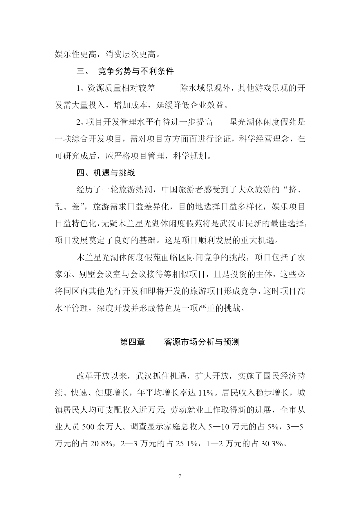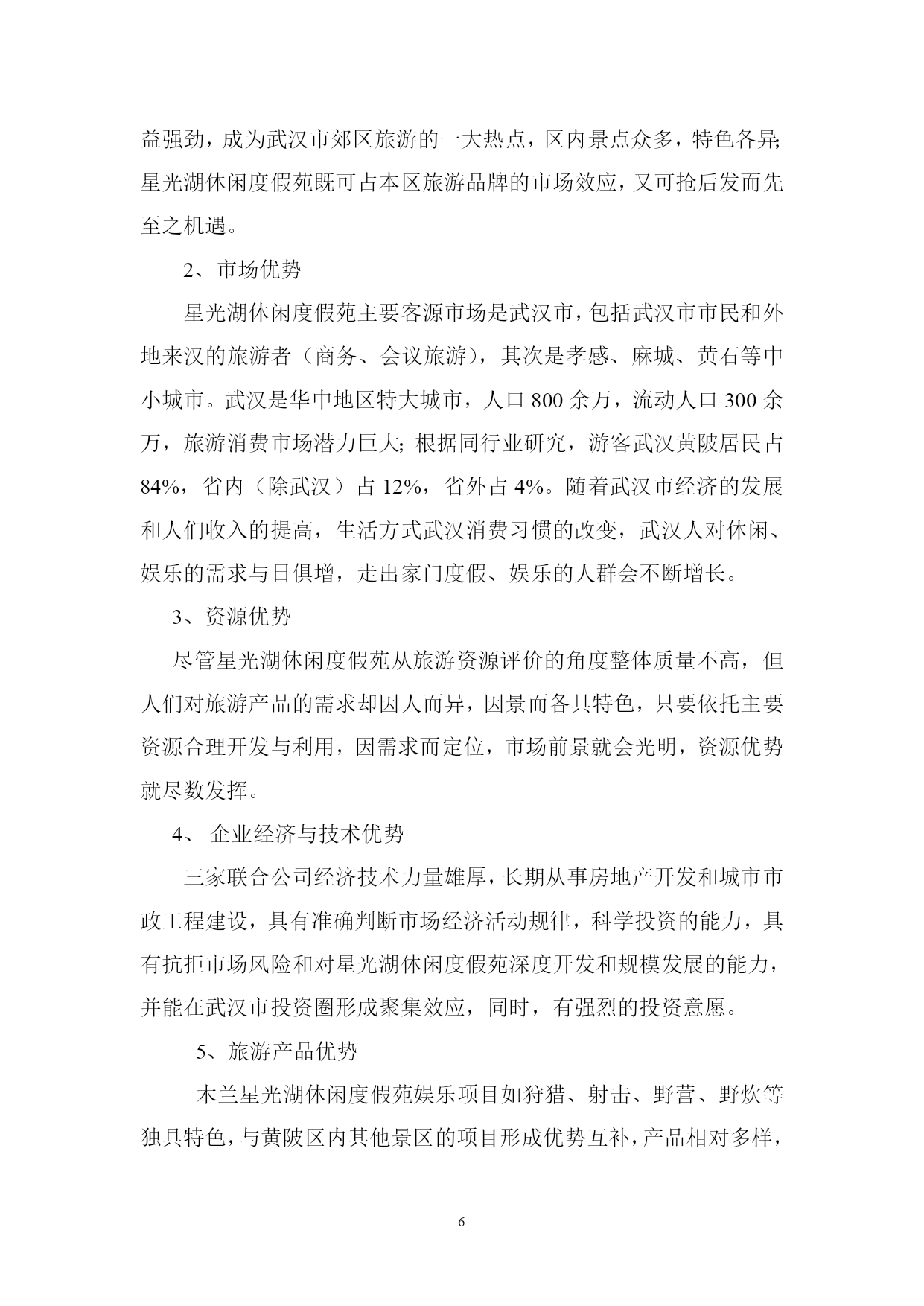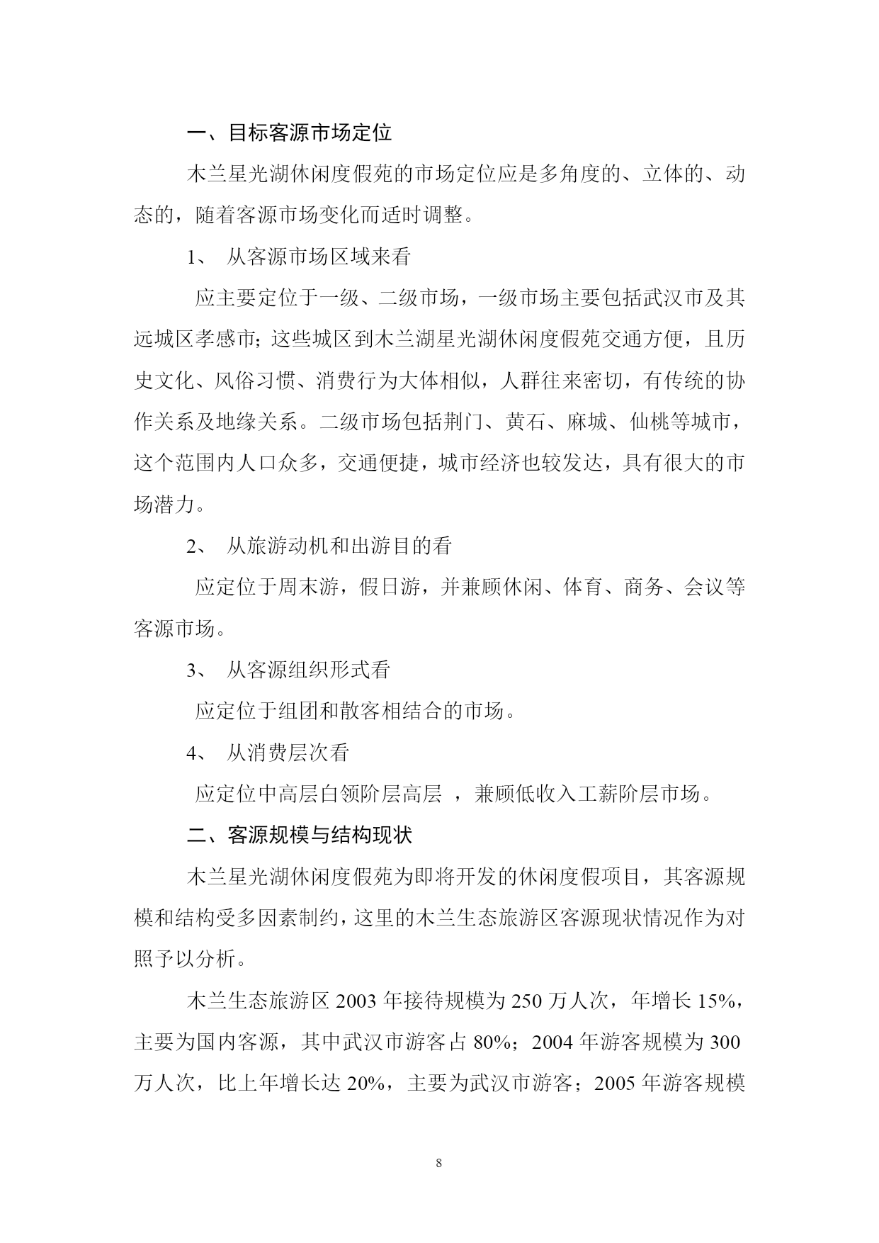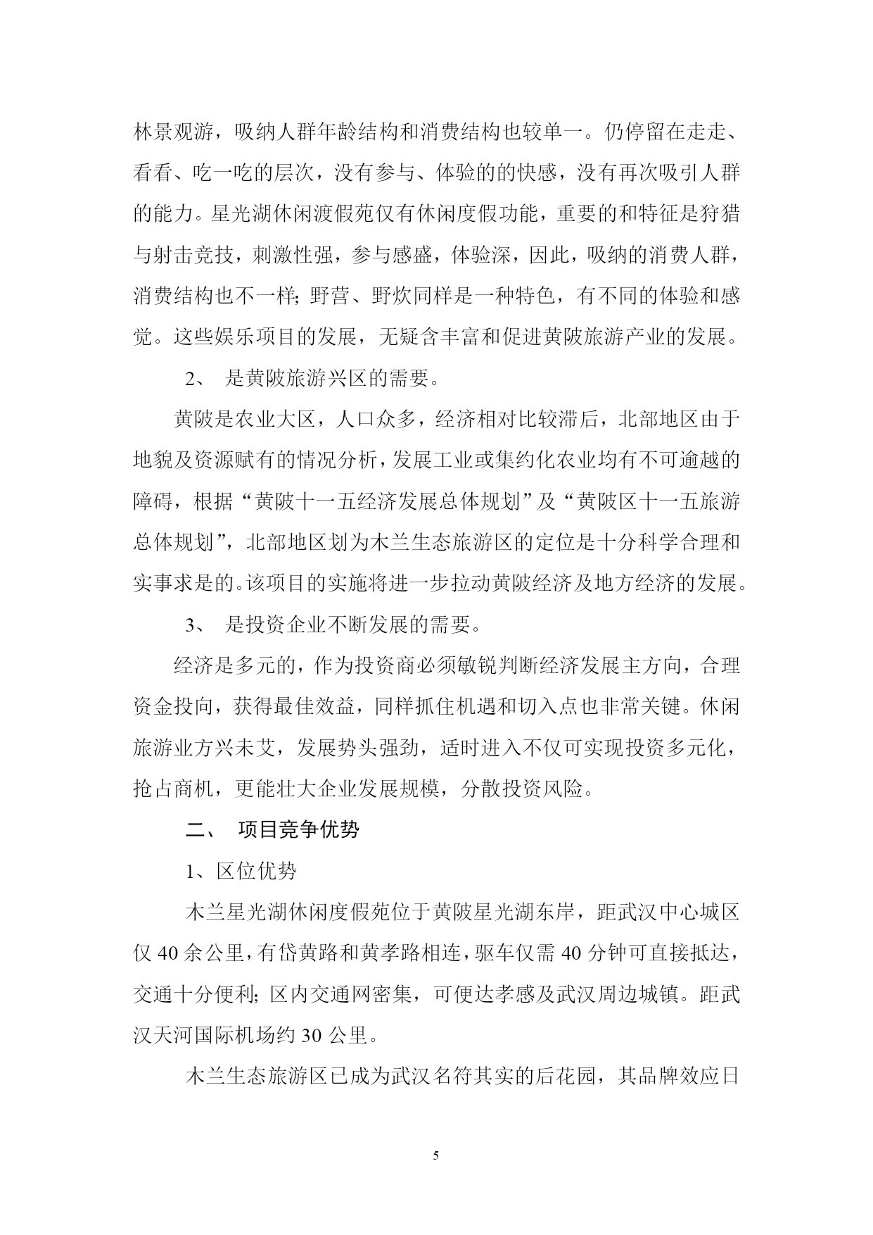 PAGEPAGE18概述项目概况项目名称及性质名称:星光湖休闲度假苑性质:新建项目内容星光湖休闲度假苑项目包括狩猎区、射箭场、别墅区、中心接待区、停车场、野营区、农庄美食休闲区等;总投资9300万元。建设地点项目处在武汉市黄陂区罗汉街长岭镇接壤部,位于星光湖东畔。建设单位业主单位:武汉市常青城市综合开发有限公司负责人:乐道明可行性研究报告编制依据《中华人民共和国水法》、《中华人民共和国水污染防治法》、《中华人民共和国水土保持法》、《黄陂区土地利用总体规划》、《黄陂旅游开发总体规划》(纲要)、《武汉市木兰生态旅游区环境保护规划方案》项目背景介绍世界旅游业的快速发展已经成为现代世界经济的一大特征,在过去的十多年里,全球旅游业平均增长率达9%,自改革开放以来,我国旅游业已成为第三产业中最具活力的新兴产品,国民经济新的增长点。据专家研究表明:中国国内旅游是世界上数量最大、增长最快、市场潜力最强的旅游市场,预计从现在至2010年,中国旅游业年平均增长率将达12%。现阶段,旅游活动的特点是短程、短时、少消费、周末游、消费需求方式的休闲、娱乐、观光为主,空间结构表现为以大城市、著名景区为中心的辐射圈层结构。随着社会生产力进一步提高,人们生活水平的提高,追求自然、粗犷、张扬个性成为很多年轻人的追求,越来越多的人通过旅游这种方式,去追求身心的放松,缓解工作的压力和紧张的情绪,渴望在山间田野、绿草碧水之中,亲历竞技、游猎、野营劳作,体验自然之悠闲,乡村之静谧。因此,生态田园游、乡村休闲将成为国内旅游业发展的新潮流。武汉市常青城市综合开发有限公司由武汉市城乡建设公司、武汉南湖房地产公司、武汉市乐建市政工程有限公司共同出资组建,经济、技术力量雄厚,长期从事国内房地产开发、市政工程建设,对国内,特别是武汉市各类市场信息了解全面,市场判断能力强,通过对国内外旅游业形势的分析,对武汉周边休闲度假市场的长期实地考察,分析认为投资建设木兰星光湖休闲度假苑潜力大、风险低、回报高,无论从促进地方经济发展的角度,还是从壮大企业自身经营规模,分散投资,分散风险的角度,该项目进入实际实施可行。项目地旅游资源分析与评价自然资源分析地貌景观星光湖休闲度假苑半抱泥河水库南汊,由多个半岛,面积达800余亩的近岸陆地组成,低丘绵连,层峦叠嶂,山水兼备,灵禅共通,幽静而自然,峰峦有七座,多不高,海拔80—85米,独自成峰,抬腿可登。半岛有多个半岛伸入星光湖中,形成良好的亲水岸线景观。2、水域风光临休闲度假村各山顶,星光湖水光湖色尽收眼底,岸线透迤,汊湾众多;星光湖面积约7平方公里,库容1741万立方米,水体清澈,水质良好,基本符合《地表水环境质量标准》Ⅱ类标准。3、生物景观主要植被类型有亚热带常绿针叶林、亚热带落叶针叶林、亚热带阔叶林,常绿阔叶混文林;植被生态系统分层明显,乔木高度5—7米,盖度50%,灌丝1—2米,盖度80—90%,草层稀疏,分布于荒地区、疏林区;常见树种为松树、杉树,间成有构骨、枫林、火棘、冬青、枫杨等,草种主要为白茅和红茅。由于人类活动的影响,星光湖休闲渡假苑内植被类型不尽一致,异质性高,土地利用类型因此也不一致,主要为有林地,乔林盖度高,树种较多;疏林地,乔木盖度低,树种单一,主要为松树;荒地、灌木丛生,覆盖度良好;耕地主要为种植旱生作物。野生动物:常见野生动物有野兔、野猪、野鸡、野鸭等,说明本地区生态系统质量良好,动物生境人类破坏不是严重。气候、气象条件本区地处中纬度,属湿润的北亚热带季风气候区,四季分明,光照充足,雨量充沛。由于本区整体的植被生态系统保存完好,依山傍水,林木葱郁,空气格外清新,环境适宜,是避暑休闲佳地。人文旅游资源如果说黄陂盘龙文化蕴育武汉的文明与发展,则众多的历史人物和事件演绎着黄陂精神,这里既有佛道伦理,也有二程理学文化,既有木兰从军的故事,也有近代风云人物证战沙场的佳话。民间习俗:黄陂素有“无陂不成镇”、“九佬十八匠”之称,有经商和从事手工制作的传统,黄陂泥塑、铸铁、纺织土布、竹器等是十分可贵的旅游资源。民间艺术:黄陂皮影戏和湖北大鼓久负盛名;楚剧和汉剧也有市场;而节庆期间的民间艺术活动为采莲船、蛛蚌精、踩高跷、舞狮、舞龙灯等更是独具特色,观赏性、娱乐性都很强。旅游资源评价评定旅游资源等仅对确定旅游开发的重点和时序具有重要的指导意义星光湖休闲度假苑兼备自然与人文条件,资源种类较多,组合状况较好,具有一定的开条件;在种类资源中,水域风光条件最好,其次是林草资源;根据我们实地勘察情况,咨询有关专家意见,评价其旅游资源质量整体并不高,属一般水平,但其可塑性较好,根据现有资源情况,合理休闲度假的经营定位,可变劣质资源为有效资源,重
