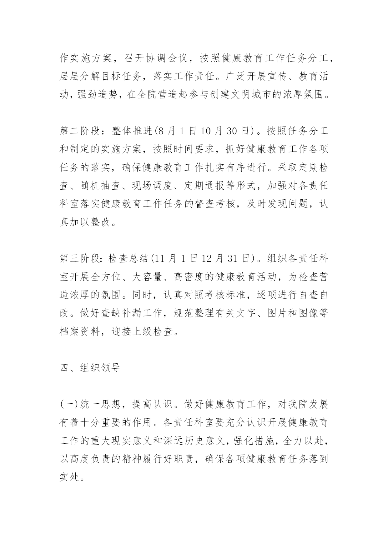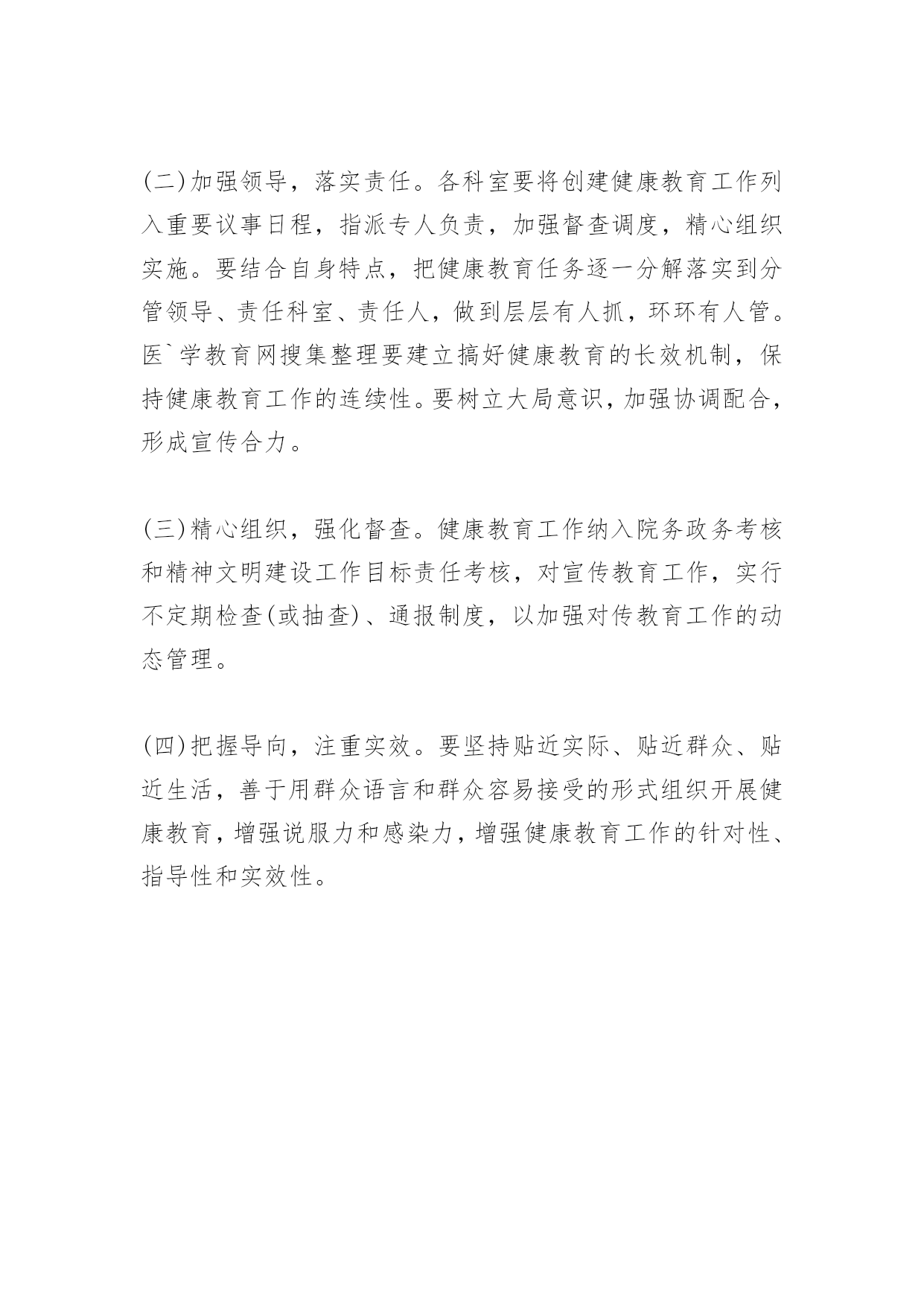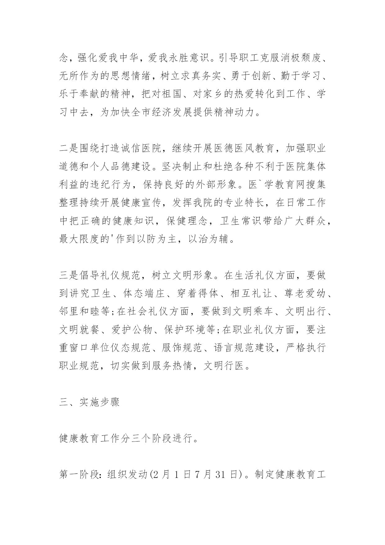 医院健康教育工作医院健康教育工作医院健康教育工作各科室:为了切实搞好二00九年健康教育工作,根据市卫生局、市健康教育所的文件精神要求,特制定以下我院创建文明城市健康教育工作计划:一、指导思想健康教育工作的指导思想是:以三个代表重要思想和党的十七大精神为指导,积极、全面、准确、深入地宣传健康教育的重大意义、总体要求和目标任务,宣传健康教育实际行动,着力营造全院动手、人人参与的良好舆论氛围,教育和引导全院职工群众统一思想,狠抓落实,把力量凝聚到工作健康教育工作上来,推进医疗保健等工作的协调发展。二、总体要求一是深入开展弘扬和培育民族精神,全面建设小康社会主题教育活动,增强全院职工社会主义、集体主义、爱国主义观念,强化爱我中华,爱我永胜意识。引导职工克服消极颓废、无所作为的思想情绪,树立求真务实、勇于创新、勤于学习、乐于奉献的精神,把对祖国、对家乡的热爱转化到工作、学习中去,为加快全市经济发展提供精神动力。二是围绕打造诚信医院,继续开展医德医风教育,加强职业道德和个人品德建设。坚决制止和杜绝各种不利于医院集体利益的违纪行为,保持良好的外部形象。医`学教育网搜集整理持续开展健康宣传,发挥我院的专业特长,在日常工作中把正确的健康知识,保健理念,卫生常识带给广大群众,最大限度的'作到以防为主,以治为辅。三是倡导礼仪规范,树立文明形象。在生活礼仪方面,要做到讲究卫生、体态端庄、穿着得体、相互礼让、尊老爱幼、邻里和睦等;在社会礼仪方面,要做到文明乘车、文明出行、文明就餐、爱护公物、保护环境等;在职业礼仪方面,要注重窗口单位仪态规范、服饰规范、语言规范建设,严格执行职业规范,切实做到服务热情,文明行医。三、实施步骤健康教育工作分三个阶段进行。第一阶段:组织发动(2月1日7月31日)。制定健康教育工作实施方案,召开协调会议,按照健康教育工作任务分工,层层分解目标任务,落实工作责任。广泛开展宣传、教育活动,强劲造势,在全院营造起参与创建文明城市的浓厚氛围。第二阶段:整体推进(8月1日10月30日)。按照任务分工和制定的实施方案,按照时间要求,抓好健康教育工作各项任务的落实,确保健康教育工作扎实有序进行。采取定期检查、随机抽查、现场调度、定期通报等形式,加强对各责任科室落实健康教育工作任务的督查考核,及时发现问题,认真加以整改。第三阶段:检查总结(11月1日12月31日)。组织各责任科室开展全方位、大容量、高密度的健康教育活动,为检查营造浓厚的氛围。同时,认真对照考核标准,逐项进行自查自改。做好查缺补漏工作,规范整理有关文字、图片和图像等档案资料,迎接上级检查。四、组织领导(一)统一思想,提高认识。做好健康教育工作,对我院发展有着十分重要的作用。各责任科室要充分认识开展健康教育工作的重大现实意义和深远历史意义,强化措施,全力以赴,以高度负责的精神履行好职责,确保各项健康教育任务落到实处。(二)加强领导,落实责任。各科室要将创建健康教育工作列入重要议事日程,指派专人负责,加强督查调度,精心组织实施。要结合自身特点,把健康教育任务逐一分解落实到分管领导、责任科室、责任人,做到层层有人抓,环环有人管。医`学教育网搜集整理要建立搞好健康教育的长效机制,保持健康教育工作的连续性。要树立大局意识,加强协调配合,形成宣传合力。(三)精心组织,强化督查。健康教育工作纳入院务政务考核和精神文明建设工作目标责任考核,对宣传教育工作,实行不定期检查(或抽查)、通报制度,以加强对传教育工作的动态管理。(四)把握导向,注重实效。要坚持贴近实际、贴近群众、贴近生活,善于用群众语言和群众容易接受的形式组织开展健康教育,增强说服力和感染力,增强健康教育工作的针对性、指导性和实效性。