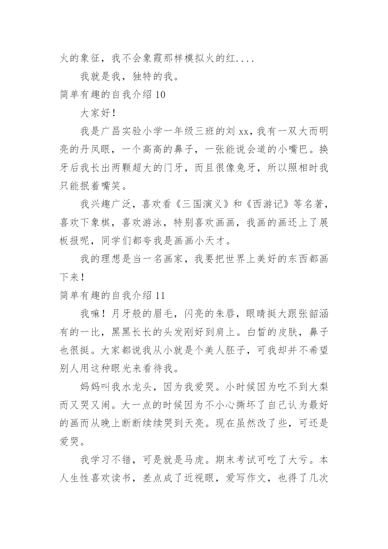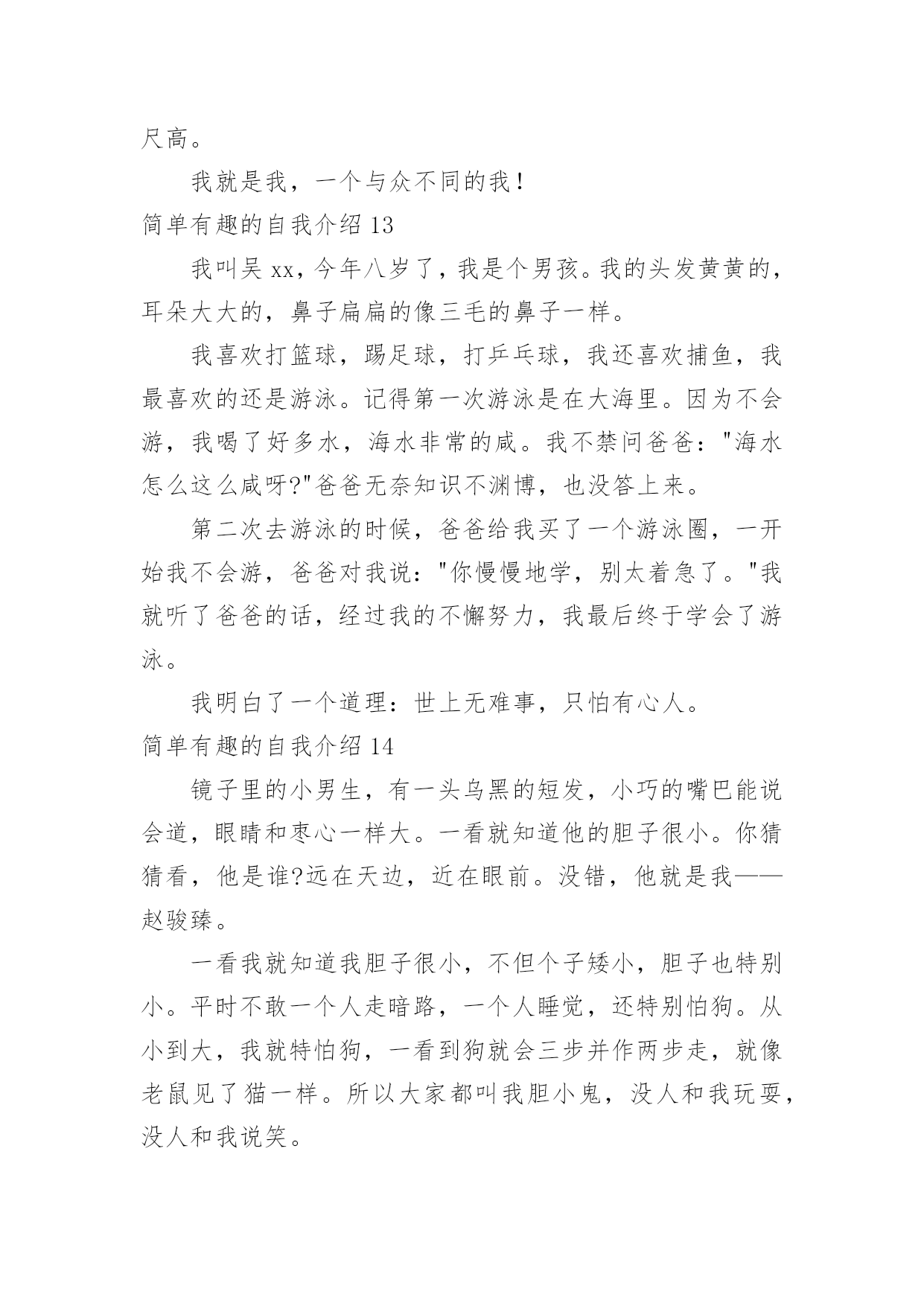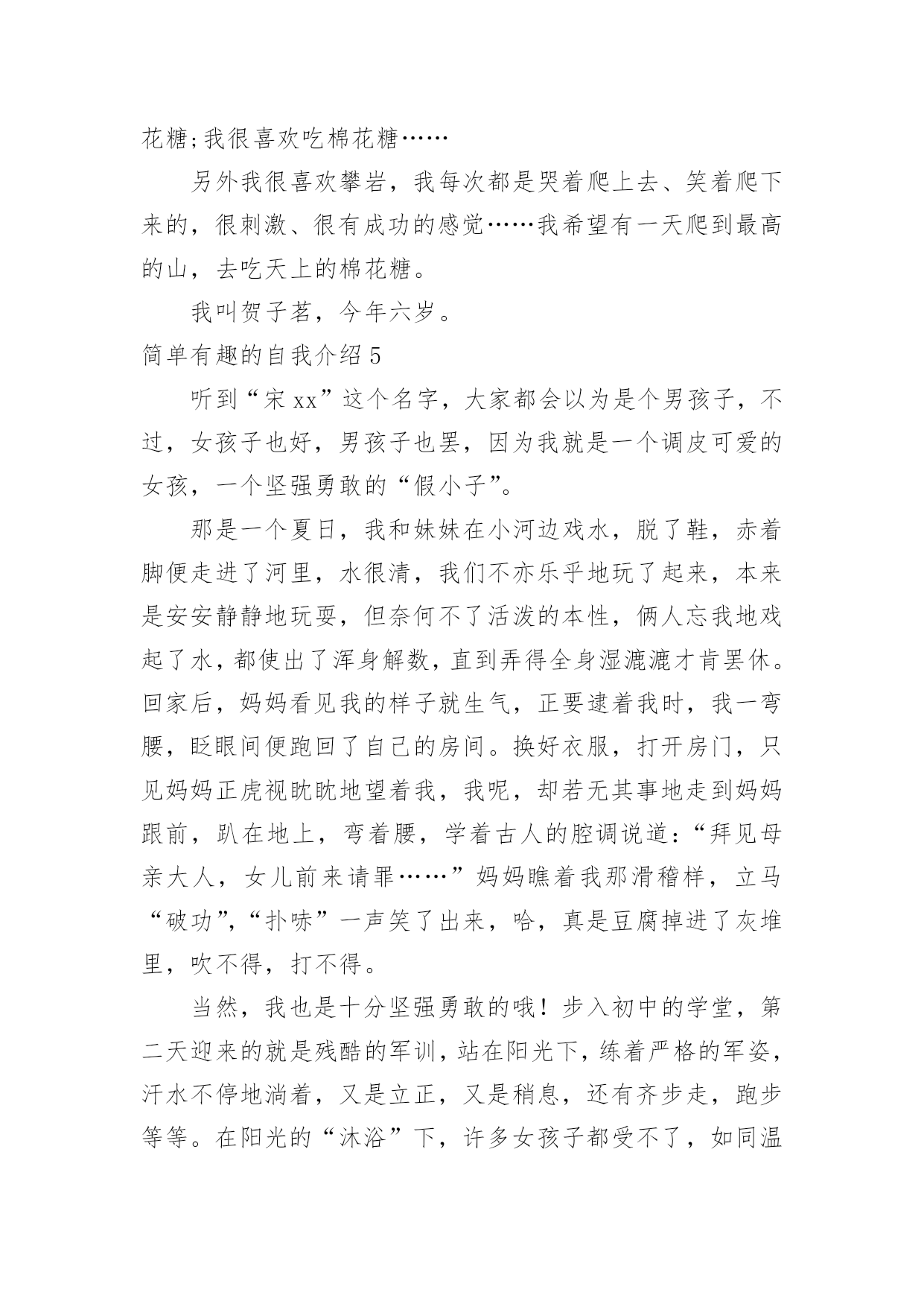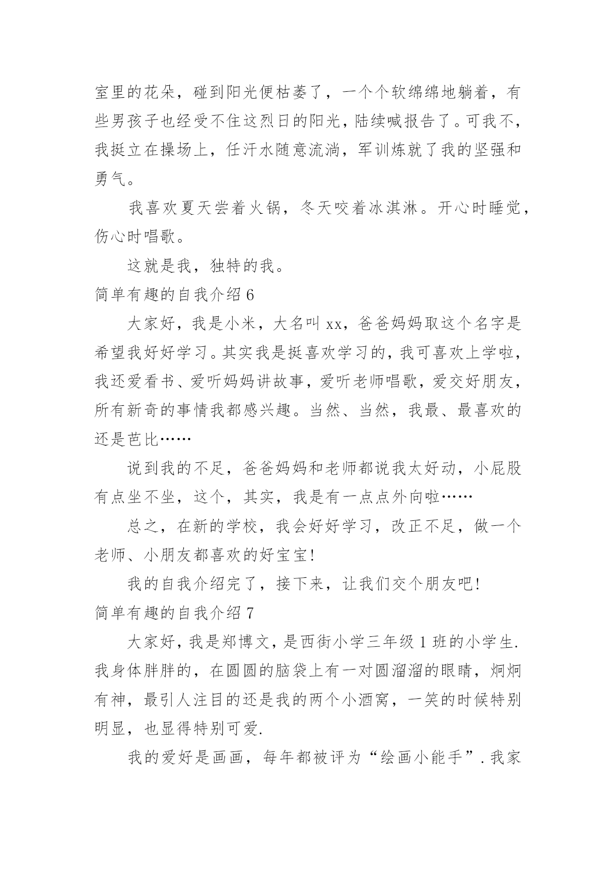 简单有趣的自我介绍简单有趣的自我介绍当来到一个陌生环境中,常常需要我们进行自我介绍,通过自我介绍可以让他人了解我们。相信大家又在为写自我介绍犯愁了吧!下面是小编收集整理的简单有趣的自我介绍,欢迎阅读,希望大家能够喜欢。简单有趣的自我介绍1我的名字叫李xx,爸爸、妈妈希望我成为一个思想开朗豁达的男子汉;我的小名叫南南,因为我在妈妈肚子里时,爸爸和妈妈正在嘉兴造大桥,嘉兴的南湖风景很美的,所以爸爸就给我取了这样一个有纪念意义的名字。我的性格很"复杂"的,遇到自已喜欢的人或事情,我会表现出非常开朗、乐观的一面,遇到难题时,我有点信心不足,还有点儿胆小,这距离我心目中的英雄"奥特曼"还差很多,所以我一定会努力的!我最喜欢的人是爸爸、妈妈、爷爷、奶奶等等,为什么这么多呢?因为他们都对我一样好,我不能取舍的。我最喜欢的事情就是玩,为了玩,可以不吃饭,不午睡,因为玩会让我非常开心,快乐。我还喜欢看书、看动画片,我喜欢大自然的花、草,哪怕一片树叶也会成为我的宝贝。我生病上医院时,看到医生打针好利害呀,就决定长大要给"小朋友打针",后来又决定要长成和"奥特曼"一样"大"的人,后来我知道了"奥特曼"的"假象",最后决定长大成为一名专门抓坏蛋的警察!简单有趣的自我介绍2镜子里头有个小男孩,他的个子长得高高的,身体壮壮的,脸蛋圆圆的,皮肤白白的,最有特点的是他那一对大大的招风耳。他有许多爱好;读各种课外书,练书法,学英语,打乒乓球,踢足球,玩电脑。他最喜欢的是指挥小人国作战,他喜欢把小棋子,玩具汽车,当成作战的,双方摆在房间的战场。"他是班长,但是他的学习不是班上最好的,因为他有个坏毛病粗心大意,每次考试和做作业,好多题本来是会做的,由于粗心不能得满分或优。他还有一个毛病-----性子急,遇事不能冷静总是急得掉眼泪,或者急得耍脾气。不过现在他已经下定决心该掉这两个坏毛病。他就是我,马上念三年级的我。简单有趣的自我介绍3大家好,我叫刘xx,属蛇,今年九岁了。我是一个非常阳光的少年。首先,我有阳光般的外貌:"一双水汪汪的大眼睛和一头乌黑光亮的头发,在阳光的照射下熠熠生辉,显得非常的健康,帅气。"其次,我有阳光般的性格:哪里有我,哪里就有笑声。在家里,每次吃饭,我都是最后一个才吃完。一天中午,饭桌上又只剩我一个人了,妈妈催促我说:"瞧你,每次吃饭都像蜗牛,快点,行不行?"我不紧不慢的说:"吃饭要细嚼慢咽才利于健康,懂吗?"妈妈"扑哧"一声笑了。在学校,我可也是一个小小笑星哦!记得有一次上自习时,一只蚊子在我的手臂上叮了一个大包,奇痒无比,我一边挠痒,一边作诗:"《春晓》,春来不洗澡,处处蚊子咬。一咬一个包,挠痒也没效。"惹得全班哄堂大笑。另外,我还喜欢阳光的运动——跆拳道。为什么我喜欢跆拳道呢?这还要从我的偶像成龙说起,因为成龙是一个实力派的武术明星,他演的片子惊险刺激,得到了大家的赞赏。我也希望我也能像他一样成为一个武术明星。阳光的我生活在阳光的天空下,但阳光的天空中偶尔也会飘过几朵乌云。记得有一次,妈妈有事要出去,临走前说:"儿子,把作业写后,就可以玩了。"我连连点头说:"好!"可是妈妈刚走,我就看我的电视,玩我的电脑,将作业这件事抛到九霄云外去了。晚上,妈妈妈回来了,非常生气,实行了最残酷的家刑:"打红挨青跪地板。"害得我两天不能坐板凳,太痛苦了,太丢人了!阳光总在风雨后,乌云是遮不住阳光的。阳光的我像向日葵一样,永远向着阳光,茁壮成长。简单有趣的自我介绍4我叫xx,我喜欢坐飞机的时候看窗外的云,它们很像棉花糖;我很喜欢吃棉花糖……另外我很喜欢攀岩,我每次都是哭着爬上去、笑着爬下来的,很刺激、很有成功的感觉……我希望有一天爬到最高的山,去吃天上的棉花糖。我叫贺子茗,今年六岁。简单有趣的自我介绍5听到“宋xx”这个名字,大家都会以为是个男孩子,不过,女孩子也好,男孩子也罢,因为我就是一个调皮可爱的女孩,一个坚强勇敢的“假小子”。那是一个夏日,我和妹妹在小河边戏水,脱了鞋,赤着脚便走进了河里,水很清,我们不亦乐乎地玩了起来,本来是安安静静地玩耍,但奈何不了活泼的本性,俩人忘我地戏起了水,都使出了浑身解数,直到弄得全身湿漉漉才肯罢休。回家后,妈妈看见我的样子就生气,正要逮着我时,我一弯腰,眨眼间便跑回了自己的房间。换好衣服,打开房门,只见妈妈正虎视眈眈地望着我,我呢,却若无其事地走到妈妈跟前,趴在地上,弯着腰,学着古人的腔调说道:“拜见母亲大人,女儿前来请罪……”妈妈瞧着我那滑稽样,立马“破功”,“扑哧”一声笑了出来,哈,真是豆腐掉进了灰堆里,吹不得,打不得。当然,我也是十分坚强勇敢的哦!步入初中的学堂,第二天迎来的就是残酷的军训,站在阳光下,练着严格的军姿,汗水不停地淌着,又是立正,又是稍息,还有齐步走,跑步等等。在阳光的“沐浴”下,许多女孩子都受不