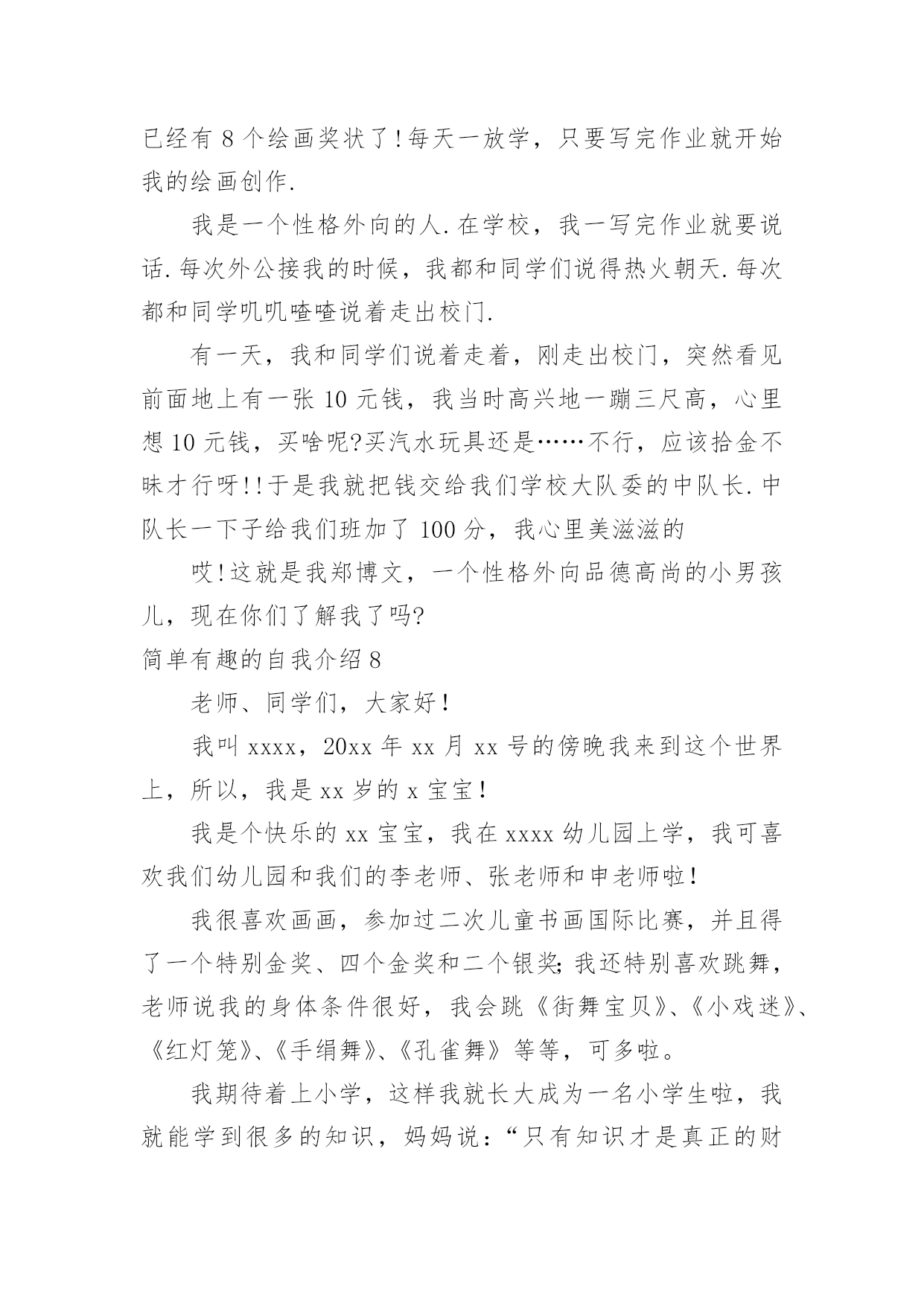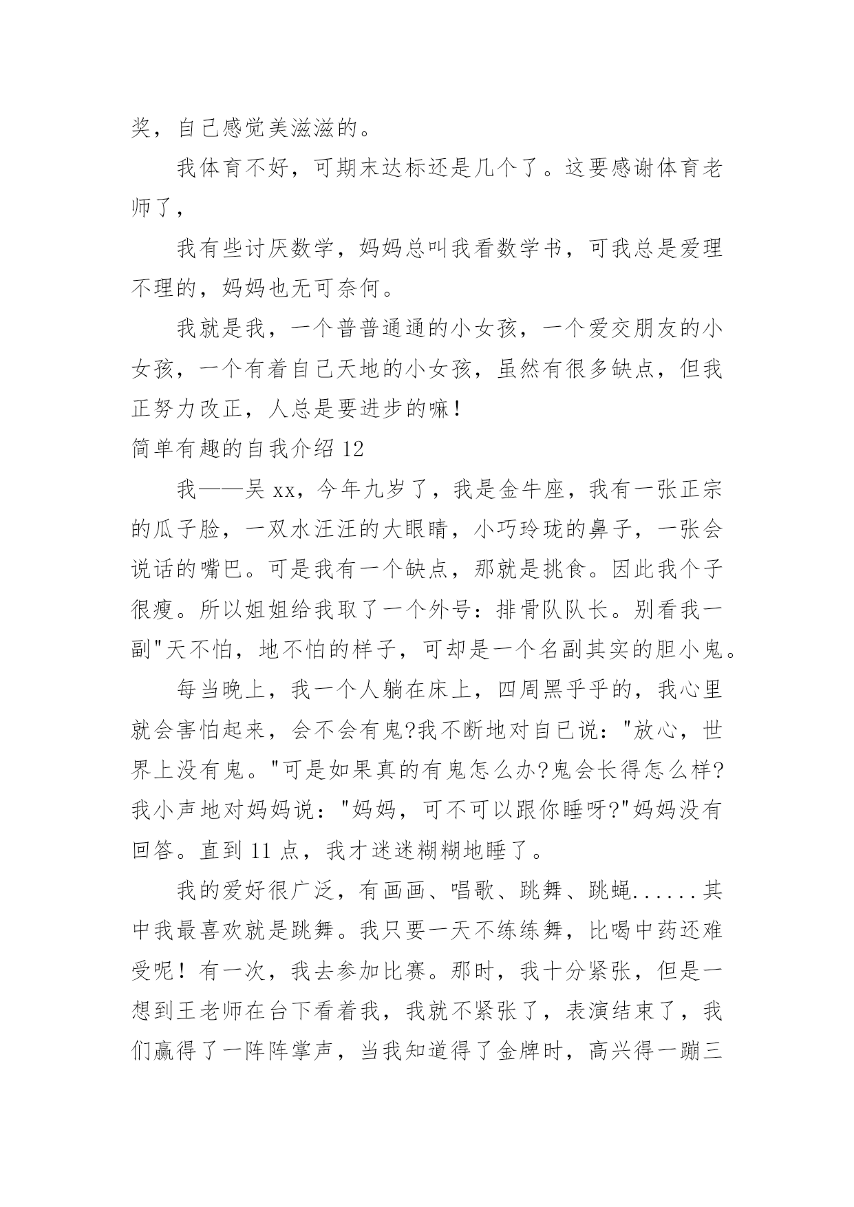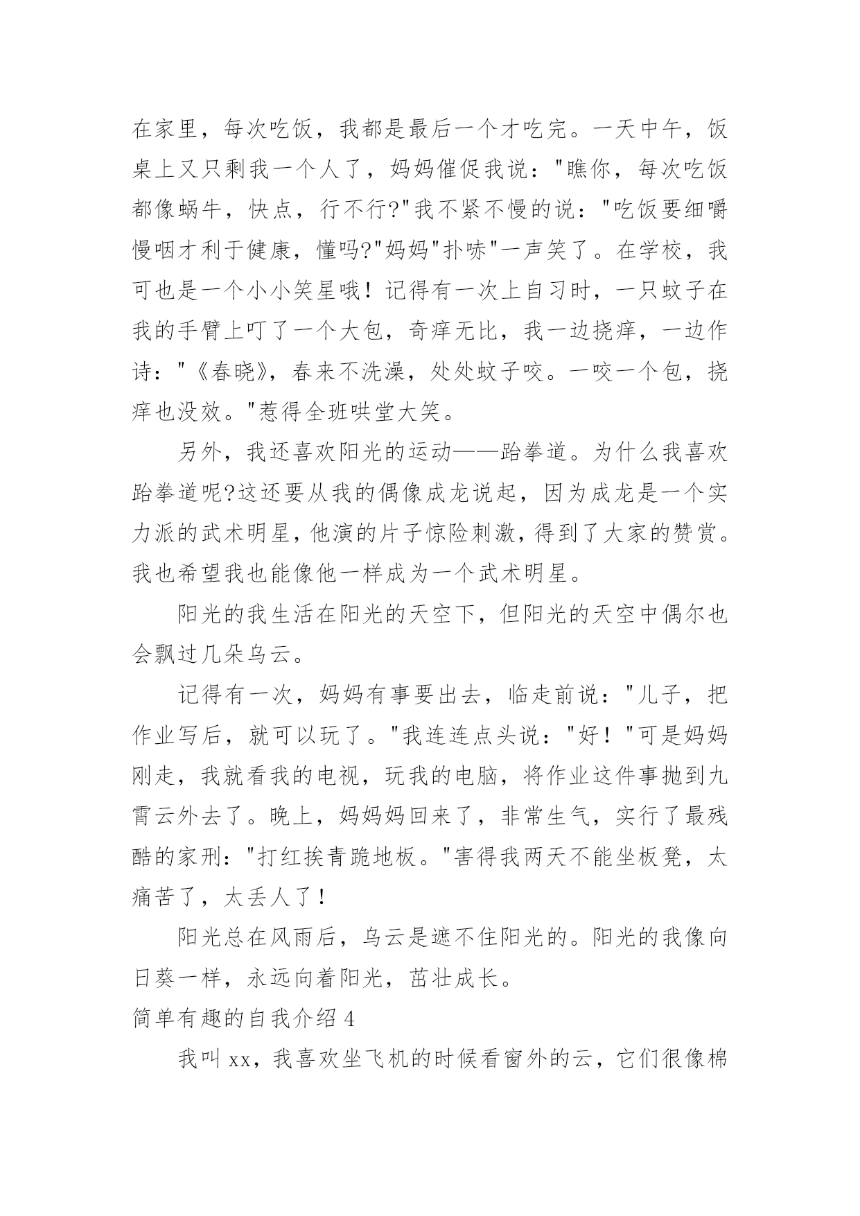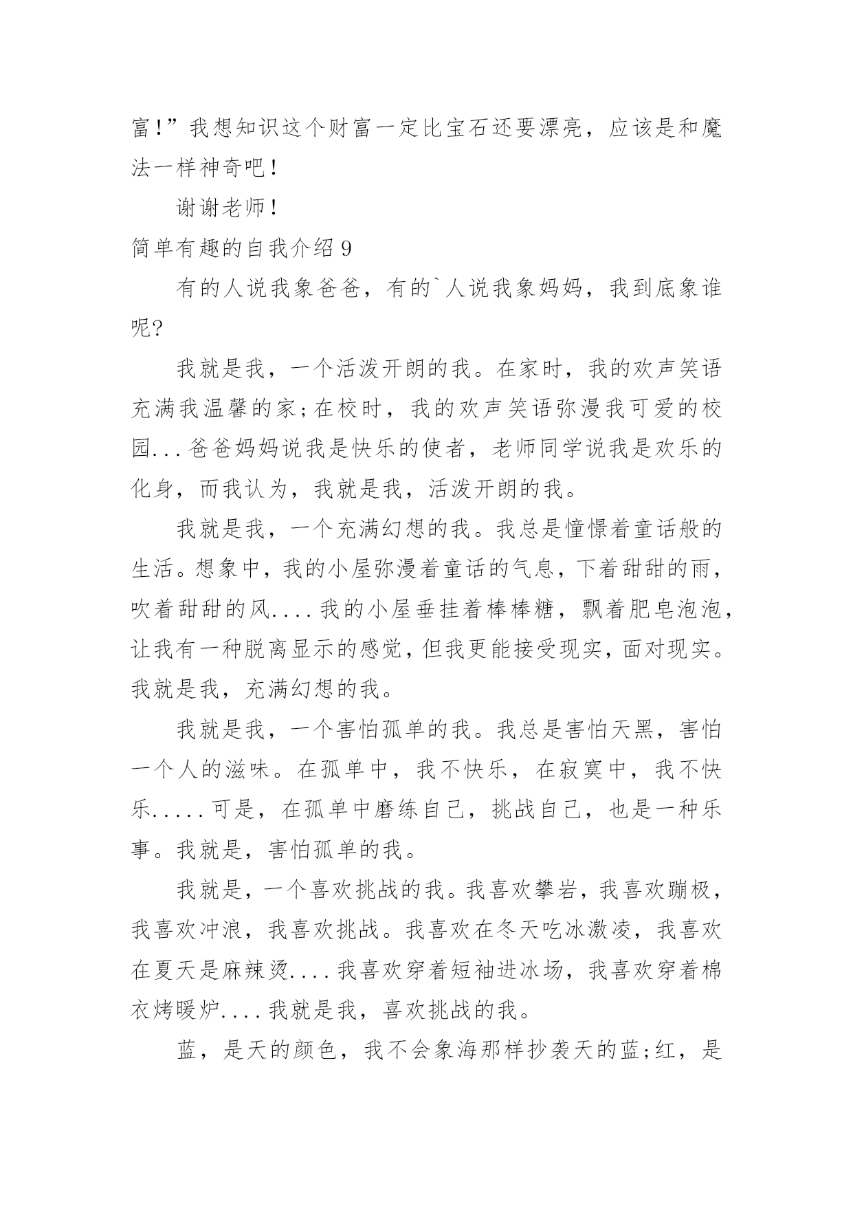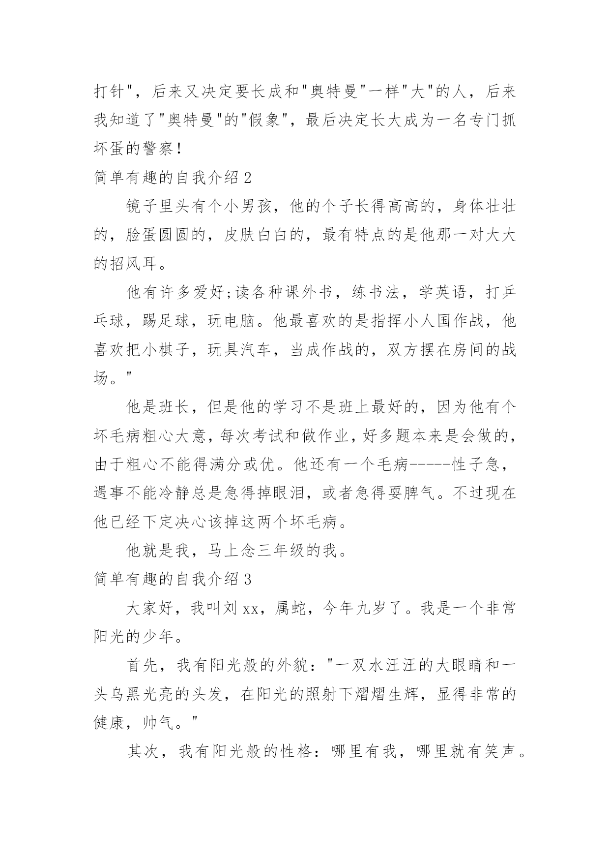 简单有趣的自我介绍简单有趣的自我介绍当来到一个陌生环境中,常常需要我们进行自我介绍,通过自我介绍可以让他人了解我们。相信大家又在为写自我介绍犯愁了吧!下面是小编收集整理的简单有趣的自我介绍,欢迎阅读,希望大家能够喜欢。简单有趣的自我介绍1我的名字叫李xx,爸爸、妈妈希望我成为一个思想开朗豁达的男子汉;我的小名叫南南,因为我在妈妈肚子里时,爸爸和妈妈正在嘉兴造大桥,嘉兴的南湖风景很美的,所以爸爸就给我取了这样一个有纪念意义的名字。我的性格很"复杂"的,遇到自已喜欢的人或事情,我会表现出非常开朗、乐观的一面,遇到难题时,我有点信心不足,还有点儿胆小,这距离我心目中的英雄"奥特曼"还差很多,所以我一定会努力的!我最喜欢的人是爸爸、妈妈、爷爷、奶奶等等,为什么这么多呢?因为他们都对我一样好,我不能取舍的。我最喜欢的事情就是玩,为了玩,可以不吃饭,不午睡,因为玩会让我非常开心,快乐。我还喜欢看书、看动画片,我喜欢大自然的花、草,哪怕一片树叶也会成为我的宝贝。我生病上医院时,看到医生打针好利害呀,就决定长大要给"小朋友打针",后来又决定要长成和"奥特曼"一样"大"的人,后来我知道了"奥特曼"的"假象",最后决定长大成为一名专门抓坏蛋的警察!简单有趣的自我介绍2镜子里头有个小男孩,他的个子长得高高的,身体壮壮的,脸蛋圆圆的,皮肤白白的,最有特点的是他那一对大大的招风耳。他有许多爱好;读各种课外书,练书法,学英语,打乒乓球,踢足球,玩电脑。他最喜欢的是指挥小人国作战,他喜欢把小棋子,玩具汽车,当成作战的,双方摆在房间的战场。"他是班长,但是他的学习不是班上最好的,因为他有个坏毛病粗心大意,每次考试和做作业,好多题本来是会做的,由于粗心不能得满分或优。他还有一个毛病-----性子急,遇事不能冷静总是急得掉眼泪,或者急得耍脾气。不过现在他已经下定决心该掉这两个坏毛病。他就是我,马上念三年级的我。简单有趣的自我介绍3大家好,我叫刘xx,属蛇,今年九岁了。我是一个非常阳光的少年。首先,我有阳光般的外貌:"一双水汪汪的大眼睛和一头乌黑光亮的头发,在阳光的照射下熠熠生辉,显得非常的健康,帅气。"其次,我有阳光般的性格:哪里有我,哪里就有笑声。在家里,每次吃饭,我都是最后一个才吃完。一天中午,饭桌上又只剩我一个人了,妈妈催促我说:"瞧你,每次吃饭都像蜗牛,快点,行不行?"我不紧不慢的说:"吃饭要细嚼慢咽才利于健康,懂吗?"妈妈"扑哧"一声笑了。在学校,我可也是一个小小笑星哦!记得有一次上自习时,一只蚊子在我的手臂上叮了一个大包,奇痒无比,我一边挠痒,一边作诗:"《春晓》,春来不洗澡,处处蚊子咬。一咬一个包,挠痒也没效。"惹得全班哄堂大笑。另外,我还喜欢阳光的运动——跆拳道。为什么我喜欢跆拳道呢?这还要从我的偶像成龙说起,因为成龙是一个实力派的武术明星,他演的片子惊险刺激,得到了大家的赞赏。我也希望我也能像他一样成为一个武术明星。阳光的我生活在阳光的天空下,但阳光的天空中偶尔也会飘过几朵乌云。记得有一次,妈妈有事要出去,临走前说:"儿子,把作业写后,就可以玩了。"我连连点头说:"好!"可是妈妈刚走,我就看我的电视,玩我的电脑,将作业这件事抛到九霄云外去了。晚上,妈妈妈回来了,非常生气,实行了最残酷的家刑:"打红挨青跪地板。"害得我两天不能坐板凳,太痛苦了,太丢人了!阳光总在风雨后,乌云是遮不住阳光的。阳光的我像向日葵一样,永远向着阳光,茁壮成长。简单有趣的自我介绍4我叫xx,我喜欢坐飞机的时候看窗外的云,它们很像棉花糖;我很喜欢吃棉花糖……另外我很喜欢攀岩,我每次都是哭着爬上去、笑着爬下来的,很刺激、很有成功的感觉……我希望有一天爬到最高的山,去吃天上的棉花糖。我叫贺子茗,今年六岁。简单有趣的自我介绍5听到“宋xx”这个名字,大家都会以为是个男孩子,不过,女孩子也好,男孩子也罢,因为我就是一个调皮可爱的女孩,一个坚强勇敢的“假小子”。那是一个夏日,我和妹妹在小河边戏水,脱了鞋,赤着脚便走进了河里,水很清,我们不亦乐乎地玩了起来,本来是安安静静地玩耍,但奈何不了活泼的本性,俩人忘我地戏起了水,都使出了浑身解数,直到弄得全身湿漉漉才肯罢休。回家后,妈妈看见我的样子就生气,正要逮着我时,我一弯腰,眨眼间便跑回了自己的房间。换好衣服,打开房门,只见妈妈正虎视眈眈地望着我,我呢,却若无其事地走到妈妈跟前,趴在地上,弯着腰,学着古人的腔调说道:“拜见母亲大人,女儿前来请罪……”妈妈瞧着我那滑稽样,立马“破功”,“扑哧”一声笑了出来,哈,真是豆腐掉进了灰堆里,吹不得,打不得。当然,我也是十分坚强勇敢的哦!步入初中的学堂,第二天迎来的就是残酷的军训,站在阳光下,练着严格的军姿,汗水不停地淌着,又是立正,又是稍息,还有齐步走,跑步等等。在阳光的“沐浴”下,许多女孩子都受不