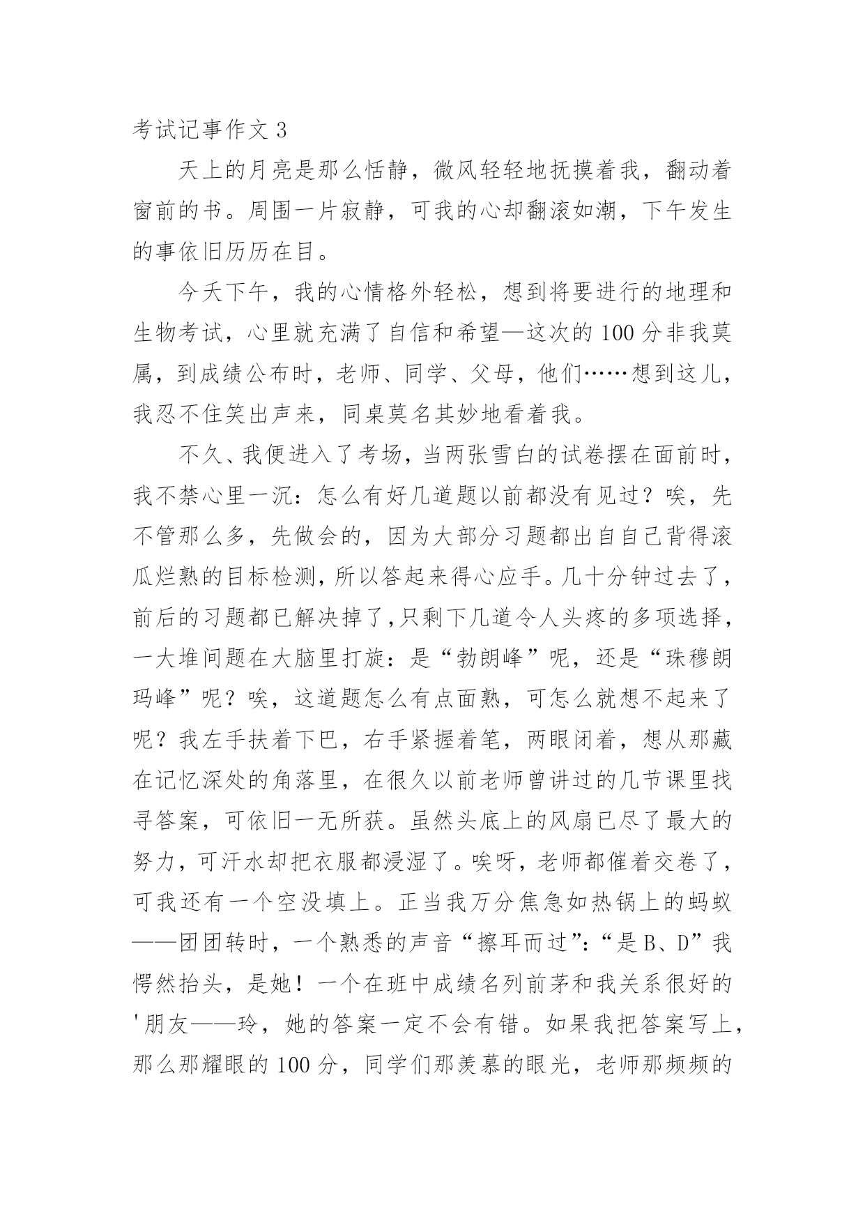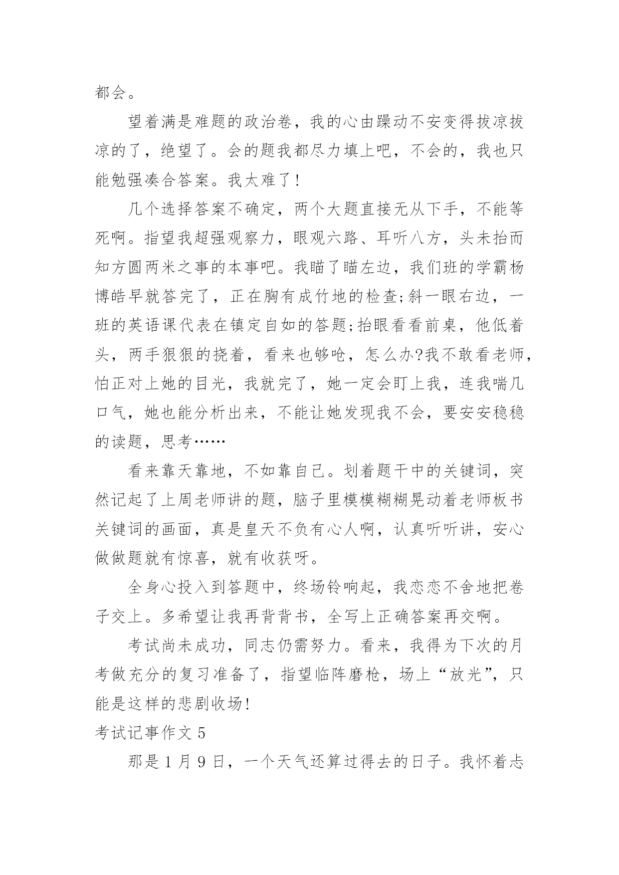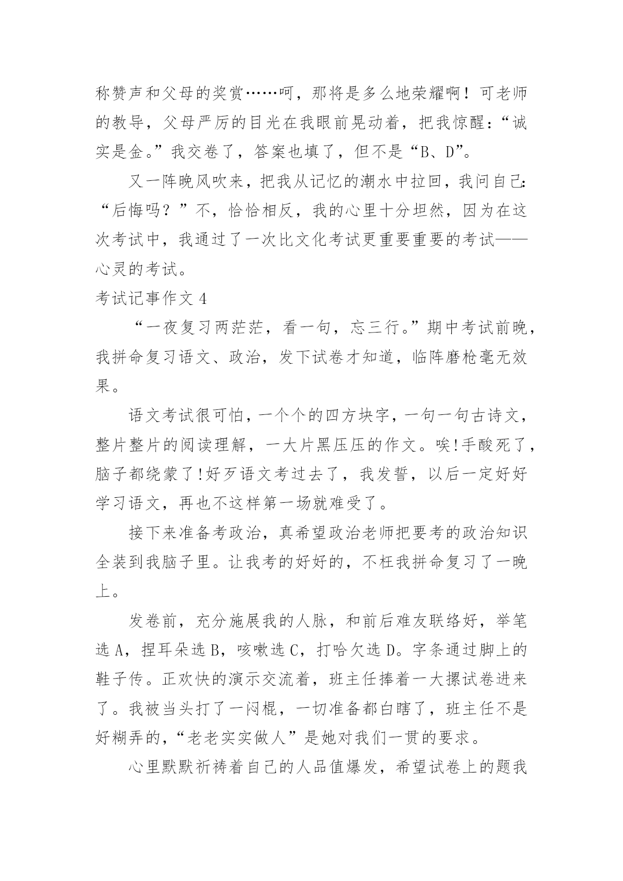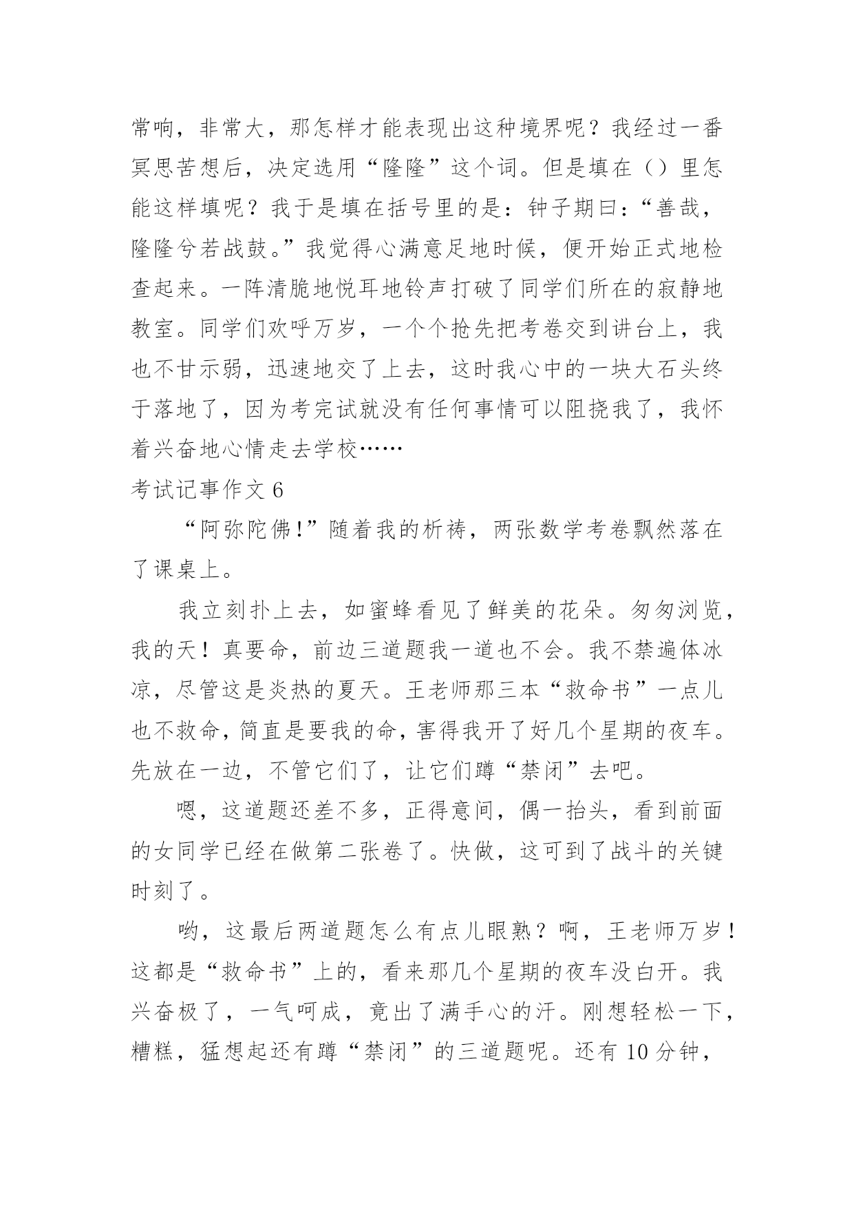 考试记事作文考试记事作文6篇在学习、工作乃至生活中,说到作文,大家肯定都不陌生吧,作文是通过文字来表达一个主题意义的记叙方法。那么一般作文是怎么写的呢?以下是小编为大家整理的考试记事作文,欢迎大家借鉴与参考,希望对大家有所帮助。考试记事作文1前几天是我们的四年级第一学期期末考试,我之前做了充足的准备迎接考试的到来。考试头天晚上,我把老师嘱托带的所有的学习用品都装好,并又复习了一下功课,可我怎么也睡不着,还想着考试的事,并对自己说:“罗瑞一,加油!每次考试都不怯场,这次一定也可以的!”然后才安心睡了觉。第二天早上,“叮零零……”闹钟响了,我赶快穿好衣服,吃完饭,让爸爸送我去学校。在路上,我还摧着爸爸开快一点,经过一段时间,终于到了学校,我跟爸爸说了再见,向教室跑动。一来到教室,就看到有三年级的同学来跟我插班,坐在我旁边的是一位小女孩,看见她我心里还想:她不会问我题吧。随着铃声响起,两位监考老师手拿卷子走上了讲台,等发下卷子之后,就听见了许多人在那里议论,有的说:“这作文这么简单!”有的说:“阅读短文也太难了吧,这怎么做呀!”监考老师生气了,一敲棍子,全班都不敢吭声了。一位老师说:“快写名字快答题,别说话了!”考试开始了,全班同学都不说话了,自己写自己的,我也不例外,可就在这时,我遇到了一个阅读短文题很难,经过反复思考,又想了出来。考完语文又考了英语,该交卷子了,我还真有点不敢交呢!下午,该考数学了,我还是像上午一样认真做题,认真检查,最后铃声一响,我就把卷子交给了监考老师。出了校门,爸爸问我考得怎么样,我自己觉得还差不多,就对爸爸说:“差不多吧!”到返校那一天,我知道了我的成绩,语文考了96。5分,数学考了99分,英语考了100分。我总结了一下这次失分的地方,一是阅读短文不理解,关联调运用不当;二是数学读题不认真。以后我要多读一些书,丰富知识,再多练习一些题,读题要细心,做完了要认真检查。本来很失望,自己语文没考好,但是又一想是用自己的努力换来的,就没有那么失望了,以后我会以本次考试为经验,用实际行动弥补不足,争取下次考试取得好成绩!考试记事作文2每当我看到这几张考卷时,我总会想起二年级的时候。期末考试考完后,老师在公布成绩时,我信心满满的以为我会进前六名。所以当老师从第一名开始宣布到第六名时,我心里想着应该就是我了!没想到老师说:“第六名是某某某”。当我听到我没进前六名的时候,我很难过。因为我跟爸爸约定说:只要我考进前六名,他就会带我出去旅游;但是如果我没有达成,就可能会被处罚!当我一想到要被处罚,我的心里就好害怕。在知道我没能进入前六名后,我整天都心神不宁的。放学的时候,同学向我打招呼,我也都没听到,是她轻轻拍了我的肩膀,我才回过神来。她问我:“怎么了?”我若无其事的说:“没事啊!”,但其实心里很难过,赶快拔腿就跑。回到家以后,我慢慢的写作业;直到晚上我拿家校本给爸爸签名,爸爸问说:“有考进前六名吗?”我低着头说:“没有!”。心里担心着接下来的处罚,没想到爸爸竟用温柔的眼神看着我,然后对我说:“凡事尽力了就好!”爸爸认为:小孩子的分数,并不是很重要的!真正重要的是:不要只是会背答案!他希望我知道、了解的是:这题题目背后的意思是什么?不然,只是知道题目的答案要怎么写,却不知道问题真正的涵义为何?那么,就算答对了,也是没有用啊!因为没有真的学习到“知识”!自从爸爸对我说过那句话之后,让我每次考试都觉得比较没有那么大的压力了!爸爸没处罚我,但我自己想了想,我是不是太在意成绩了?分数与成绩并不是那么的重要!品行与礼仪才是最重要的!因为就算真的考到了第一名,却在遇到认识的人的时候,不会去主动去打招呼;或者是一直在炫耀自己的表现与成绩,而忽略了做人处事要谦虚!这些行为,看在别人的眼中,其实早都已经将我其它所有美好表现的光环都掩盖、消失掉了!考试记事作文3天上的月亮是那么恬静,微风轻轻地抚摸着我,翻动着窗前的书。周围一片寂静,可我的心却翻滚如潮,下午发生的事依旧历历在目。今夭下午,我的心情格外轻松,想到将要进行的地理和生物考试,心里就充满了自信和希望—这次的100分非我莫属,到成绩公布时,老师、同学、父母,他们……想到这儿,我忍不住笑出声来,同桌莫名其妙地看着我。不久、我便进入了考场,当两张雪白的试卷摆在面前时,我不禁心里一沉:怎么有好几道题以前都没有见过?唉,先不管那么多,先做会的,因为大部分习题都出自自己背得滚瓜烂熟的目标检测,所以答起来得心应手。几十分钟过去了,前后的习题都已解决掉了,只剩下几道令人头疼的多项选择,一大堆间题在大脑里打旋:是“勃朗峰”呢,还是“珠穆朗玛峰”呢?唉,这道题怎么有点面熟,可怎么就想不起来了呢?我左手扶着下巴,右手紧握着笔,两眼闭着,想从那藏在记忆深处的角落里,在很久以前老师曾讲过的几节课里找寻答案,可