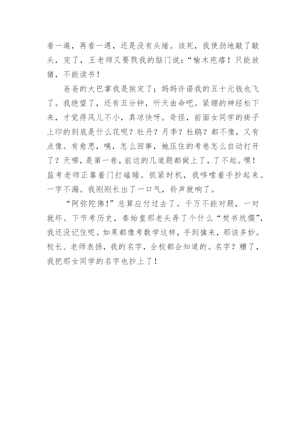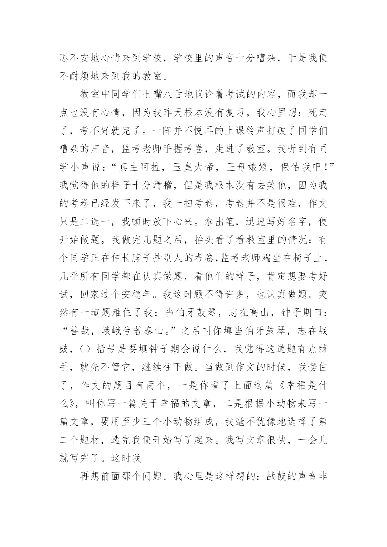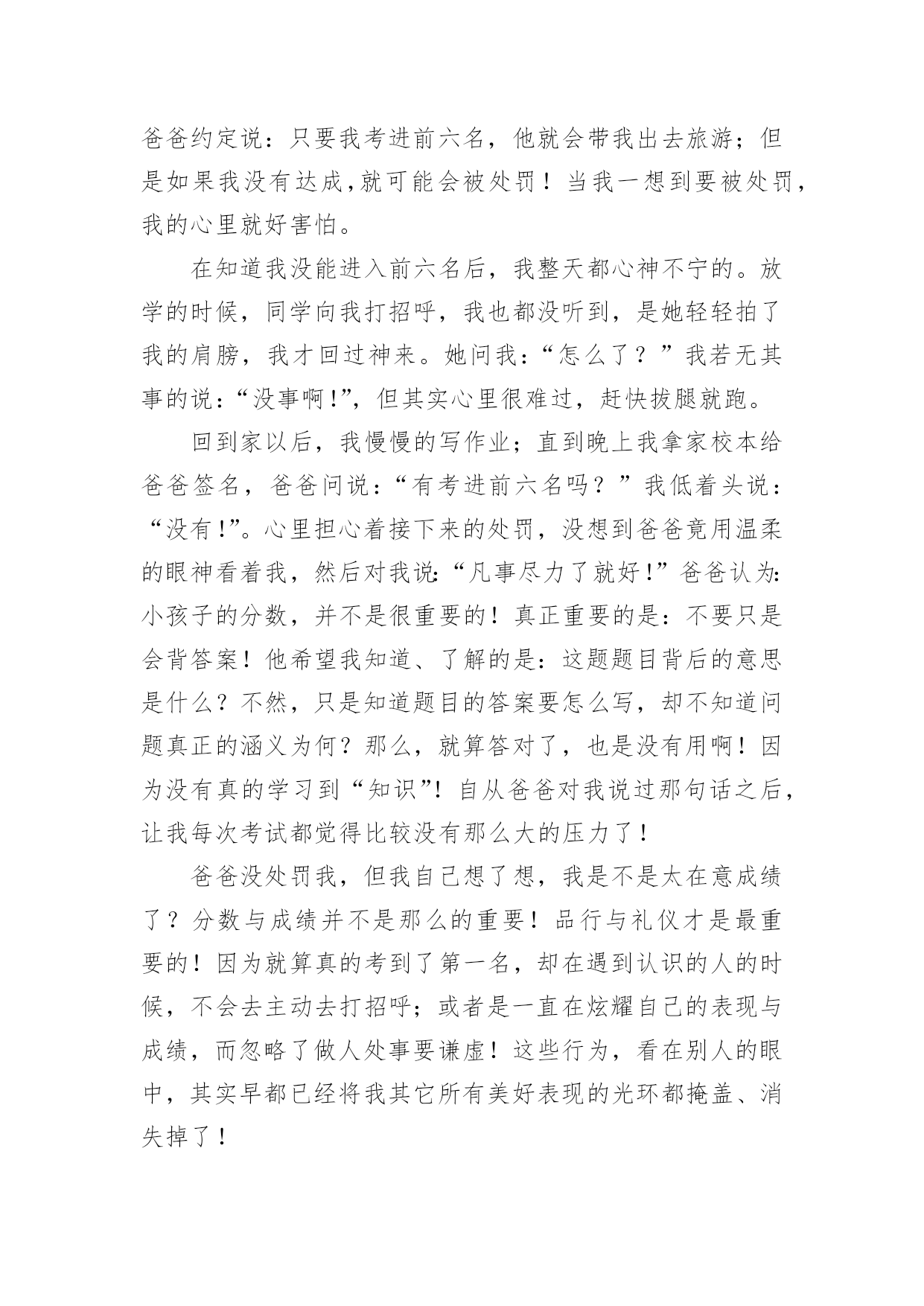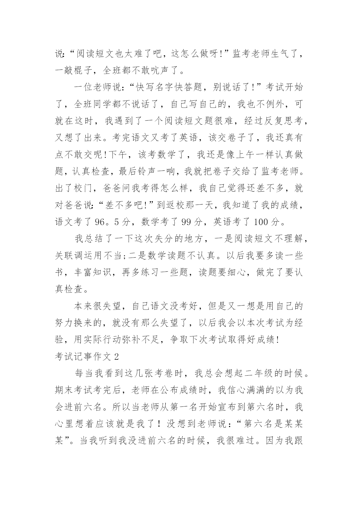 考试记事作文考试记事作文6篇在学习、工作乃至生活中,说到作文,大家肯定都不陌生吧,作文是通过文字来表达一个主题意义的记叙方法。那么一般作文是怎么写的呢?以下是小编为大家整理的考试记事作文,欢迎大家借鉴与参考,希望对大家有所帮助。考试记事作文1前几天是我们的四年级第一学期期末考试,我之前做了充足的准备迎接考试的到来。考试头天晚上,我把老师嘱托带的所有的学习用品都装好,并又复习了一下功课,可我怎么也睡不着,还想着考试的事,并对自己说:“罗瑞一,加油!每次考试都不怯场,这次一定也可以的!”然后才安心睡了觉。第二天早上,“叮零零……”闹钟响了,我赶快穿好衣服,吃完饭,让爸爸送我去学校。在路上,我还摧着爸爸开快一点,经过一段时间,终于到了学校,我跟爸爸说了再见,向教室跑动。一来到教室,就看到有三年级的同学来跟我插班,坐在我旁边的是一位小女孩,看见她我心里还想:她不会问我题吧。随着铃声响起,两位监考老师手拿卷子走上了讲台,等发下卷子之后,就听见了许多人在那里议论,有的说:“这作文这么简单!”有的说:“阅读短文也太难了吧,这怎么做呀!”监考老师生气了,一敲棍子,全班都不敢吭声了。一位老师说:“快写名字快答题,别说话了!”考试开始了,全班同学都不说话了,自己写自己的,我也不例外,可就在这时,我遇到了一个阅读短文题很难,经过反复思考,又想了出来。考完语文又考了英语,该交卷子了,我还真有点不敢交呢!下午,该考数学了,我还是像上午一样认真做题,认真检查,最后铃声一响,我就把卷子交给了监考老师。出了校门,爸爸问我考得怎么样,我自己觉得还差不多,就对爸爸说:“差不多吧!”到返校那一天,我知道了我的成绩,语文考了96。5分,数学考了99分,英语考了100分。我总结了一下这次失分的地方,一是阅读短文不理解,关联调运用不当;二是数学读题不认真。以后我要多读一些书,丰富知识,再多练习一些题,读题要细心,做完了要认真检查。本来很失望,自己语文没考好,但是又一想是用自己的努力换来的,就没有那么失望了,以后我会以本次考试为经验,用实际行动弥补不足,争取下次考试取得好成绩!考试记事作文2每当我看到这几张考卷时,我总会想起二年级的时候。期末考试考完后,老师在公布成绩时,我信心满满的以为我会进前六名。所以当老师从第一名开始宣布到第六名时,我心里想着应该就是我了!没想到老师说:“第六名是某某某”。当我听到我没进前六名的时候,我很难过。因为我跟爸爸约定说:只要我考进前六名,他就会带我出去旅游;但是如果我没有达成,就可能会被处罚!当我一想到要被处罚,我的心里就好害怕。在知道我没能进入前六名后,我整天都心神不宁的。放学的时候,同学向我打招呼,我也都没听到,是她轻轻拍了我的肩膀,我才回过神来。她问我:“怎么了?”我若无其事的说:“没事啊!”,但其实心里很难过,赶快拔腿就跑。回到家以后,我慢慢的写作业;直到晚上我拿家校本给爸爸签名,爸爸问说:“有考进前六名吗?”我低着头说:“没有!”。心里担心着接下来的处罚,没想到爸爸竟用温柔的眼神看着我,然后对我说:“凡事尽力了就好!”爸爸认为:小孩子的分数,并不是很重要的!真正重要的是:不要只是会背答案!他希望我知道、了解的是:这题题目背后的意思是什么?不然,只是知道题目的答案要怎么写,却不知道问题真正的涵义为何?那么,就算答对了,也是没有用啊!因为没有真的学习到“知识”!自从爸爸对我说过那句话之后,让我每次考试都觉得比较没有那么大的压力了!爸爸没处罚我,但我自己想了想,我是不是太在意成绩了?分数与成绩并不是那么的重要!品行与礼仪才是最重要的!因为就算真的考到了第一名,却在遇到认识的人的时候,不会去主动去打招呼;或者是一直在炫耀自己的表现与成绩,而忽略了做人处事要谦虚!这些行为,看在别人的眼中,其实早都已经将我其它所有美好表现的光环都掩盖、消失掉了!考试记事作文3天上的月亮是那么恬静,微风轻轻地抚摸着我,翻动着窗前的书。周围一片寂静,可我的心却翻滚如潮,下午发生的事依旧历历在目。今夭下午,我的心情格外轻松,想到将要进行的地理和生物考试,心里就充满了自信和希望—这次的100分非我莫属,到成绩公布时,老师、同学、父母,他们……想到这儿,我忍不住笑出声来,同桌莫名其妙地看着我。不久、我便进入了考场,当两张雪白的试卷摆在面前时,我不禁心里一沉:怎么有好几道题以前都没有见过?唉,先不管那么多,先做会的,因为大部分习题都出自自己背得滚瓜烂熟的目标检测,所以答起来得心应手。几十分钟过去了,前后的习题都已解决掉了,只剩下几道令人头疼的多项选择,一大堆间题在大脑里打旋:是“勃朗峰”呢,还是“珠穆朗玛峰”呢?唉,这道题怎么有点面熟,可怎么就想不起来了呢?我左手扶着下巴,右手紧握着笔,两眼闭着,想从那藏在记忆深处的角落里,在很久以前老师曾讲过的几节课里找寻答案,可