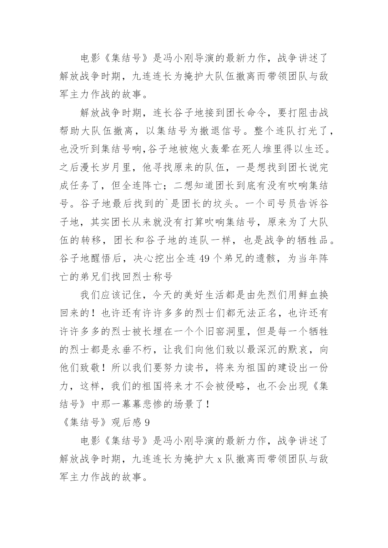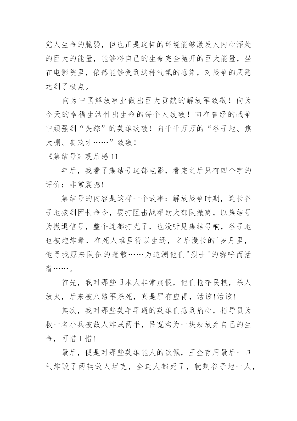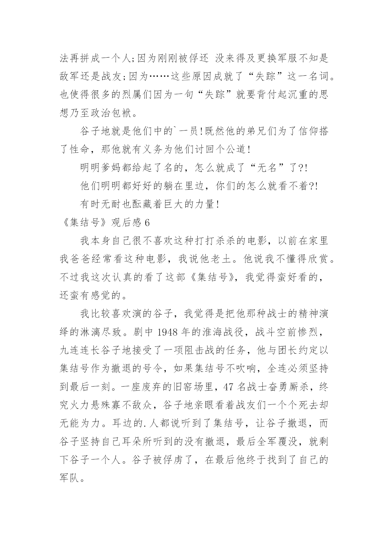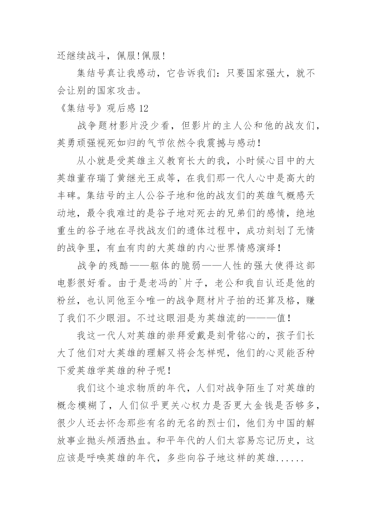 《集结号》观后感《集结号》观后感合集15篇当看完一部作品后,相信大家一定领会了不少东西,不妨坐下来好好写写观后感吧。观后感你想好怎么写了吗?以下是小编精心整理的《集结号》观后感,仅供参考,希望能够帮助到大家。《集结号》观后感1我看了《集结号》这部电影,看完之后只有四个字的评价:非常震撼!《集结号》的`内容是这样一个故事:解放战争时期,连长谷子地接到团长命令,要打阻击战帮助大部队撤离,以集结号为撤退信号,整个连都打光了,也没听见集结号响,谷子地也被炮炸晕,在死人堆里得以生还,之后漫长的岁月里,他寻找原来队伍的遗涵…为追溯他们"烈士"的称呼而活着…….首先,我对那些日本人非常痛恨,他们抢夺民粮,杀人放火,后来被八路军杀死,真是罪有应得,活该!活该!其次,我对那些英年早逝的英雄们感到痛心,指导员为救一名小兵被敌人炸成两半,吕宽沟为一块表放弃自己的生命,可惜!可惜!最后,便是对那些英雄能人的钦佩,王金存用最后一口气炸毁了两辆敌人坦克,全连人都死了,就剩谷子地一人,还继续战斗,佩服!佩服!《集结号》真让我感动,它告诉我们:只要国家强大,就不会让别的国家攻击。《集结号》观后感2前不久,一条短信在手机、网络上广泛传播:看了《色戒》,发现女人靠不住;看了《投名状》,发现兄弟靠不住;看了《集结号》,发现组织更靠不住。“组织靠不住”,然也。《集结号》点出了这一秘密,但它实际上也是人尽皆知的。在《集结号》一片中,印象比较深刻的“组织”有二,一明一暗。一处是汶河县政府的干事来找谷子地,让后者“对组织提供真实的情况”,所讲的'话语几乎每一句都在影射谷子地是个叛徒,亦或是一个有着不良记录的俘虏。倘若是个普通人,也受不了如此侮辱,更何况是一个铁骨铮铮的硬汉和英雄呢?结果,谷子地大发雷霆,尔后,气急败坏的“组织”口不择言地将最高职务不过连长的他定性为“军阀”。第二处“组织”是暗的,但却是“组织靠不住”所指的那一“组织”,也就是刘泽水团长所代表的“组织”。抛开其他一切不说,这个组织确实是有愧于谷子地和战死的九连战士的,影片也安排了当年的司号员小梁子向谷子地下跪。其实还有一处更隐蔽的组织。小梁子后来提到,时任副师长的刘泽水在朝鲜战场担负阻击任务直至牺牲。当年曾是他人靠不住“组织”的刘副师长,后来也遇到了类似的“组织”。这一情节的设置带有文学作品中常见的因果报应色彩。《集结号》观后感3过年后,我看了《集结号》这部电影,看完之后只有四个字的评价:非常震撼!《集结号》的内容是这样一个故事:解放战争时期,连长谷子地接到团长命令,要打阻击战帮助大部队撤离,以集结号为撤退信号,整个连都打光了,也没听见集结号响,谷子地也被炮炸晕,在死人堆里得以生还,之后漫长的岁月里,他寻找原来队伍的遗骸……为追溯他们"烈士"的称呼而活着……。首先,我对那些日本人非常痛恨,他们抢夺民粮,杀人放火,后来被八路军杀死,真是罪有应得,活该!活该!其次,我对那些英年早逝的.英雄们感到痛心,指导员为救一名小兵被敌人炸成两半,吕宽沟为一块表放弃自己的生命,可惜!可惜!最后,便是对那些英雄能人的钦佩,王金存用最后一口气炸毁了两辆敌人坦克,全连人都死了,就剩谷子地一人,还继续战斗,佩服!佩服!《集结号》真让我感动,它告诉我们:只要国家强大,就不会让别的国家攻击。《集结号》观后感41948年冬天,淮海战役。解放军九连连长谷子地接到团长命令,要打一场阻击战掩护大部队撤离,听到集结号就可以撤退。谷子地带领47名战士战斗,伤亡惨重。但是集结号并没有吹响,47名战士全部阵亡,谷子地被炮弹轰晕,倒在死人堆里,得以生还。进入和平年代后,这47名战士被定为“失踪”。谷子地“千里走单骑”地追寻真相,过程艰辛、催人泪下。最终,谷子地找到了47具遗骸,47个亡灵被追认为烈士……宏大的战争场面和感人至深的故事情节,真实地表现出生命在战争面前的脆弱,更表现出每一个牺牲者的伟大。“战争是残酷的,生命是脆弱的。《集结号》的故事演绎了爱国主义的精神,影片中那么多年轻鲜活的`生命倒下时,观众还叫不出他们的名字,可他们用自己的‘牺牲’,让观众记住了这部名叫《集结号》的电影。《集结号》向社会呐喊,为先烈招魂,为牺牲者讨回荣誉。记住那些该记住的,珍惜那些该珍惜的,这就是《集结号》带给我们最大的意义。”《集结号》观后感5前几天看了集结号后其实没想法,因为我并没有记住什么。不是冯导的问题,是因为之前我看了一部叫《牺牲》的电视电影。让我很感动。同样是张涵宇主演的。但在《牺牲》里他只是个旁白,真正的主角是为了“失踪”的战友寻找名份的老兵。真的很辛苦。让我感动的是当那些牺牲的英雄们回家的时候,家里人,族里人,乡亲们对他们的尊敬和爱戴!他们能回家了,一定也能安息了!在每一次战斗中都会有人牺牲,因为被断壁残垣、废墟所掩盖无法再找寻到遗体;因为被重武器所伤肢离