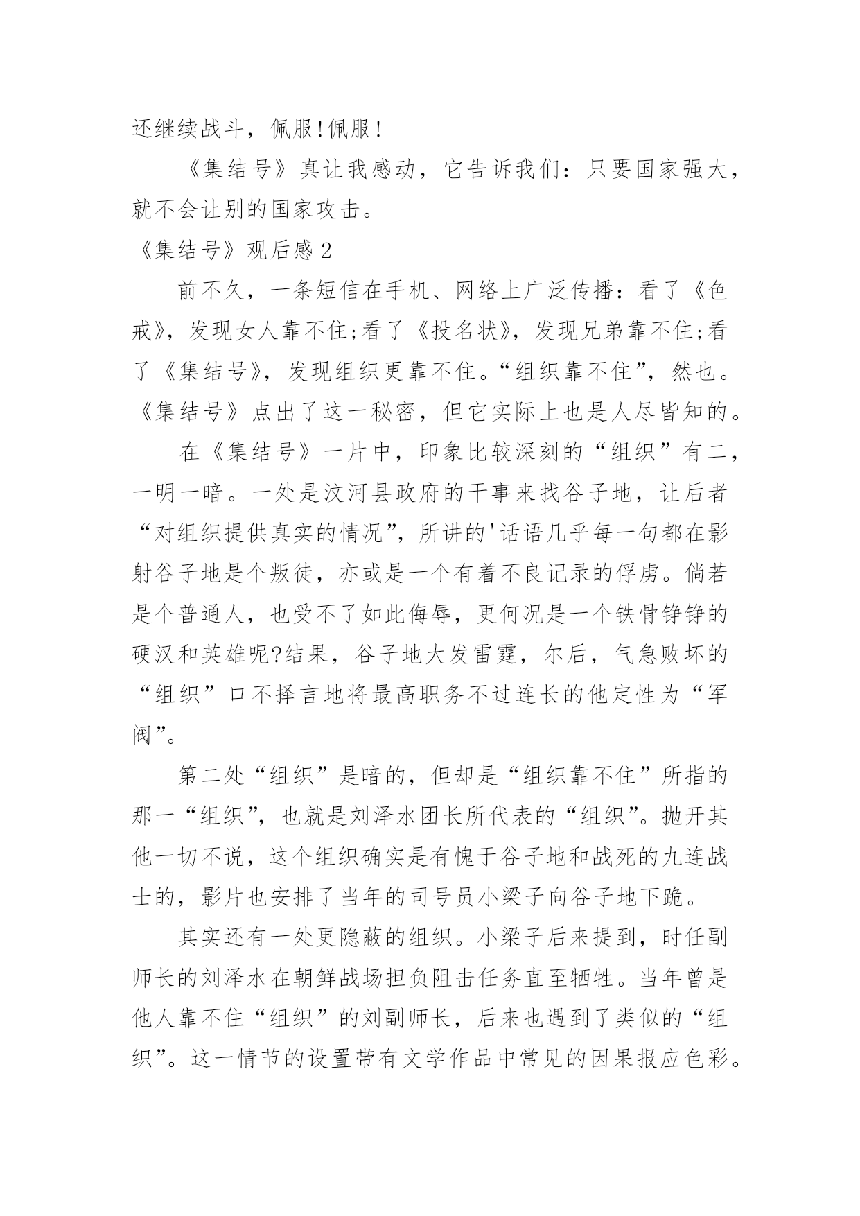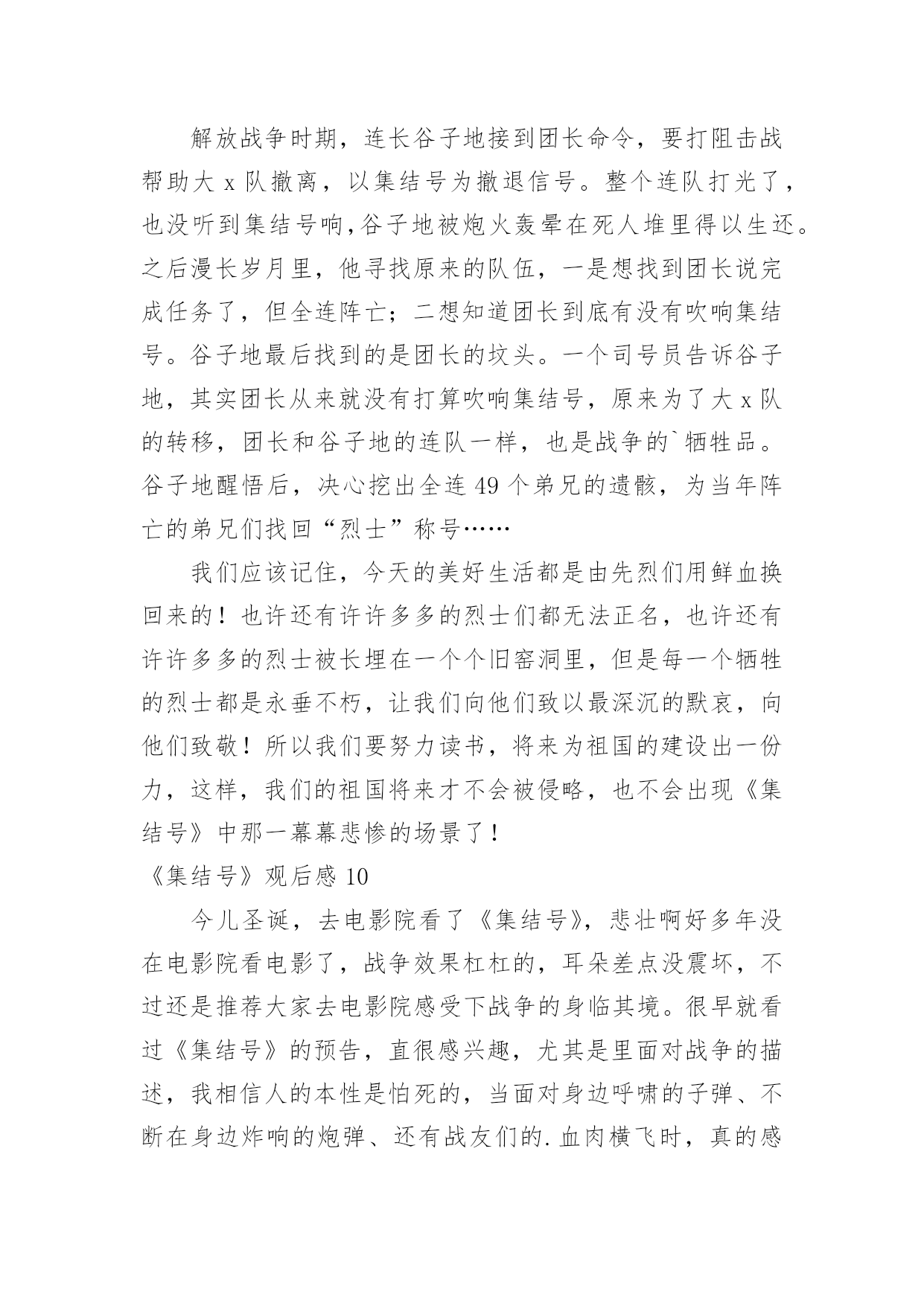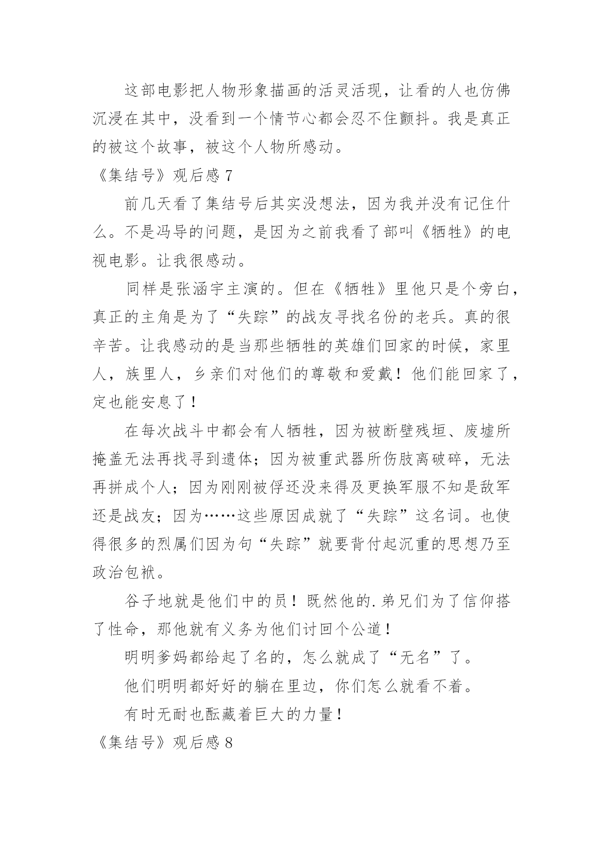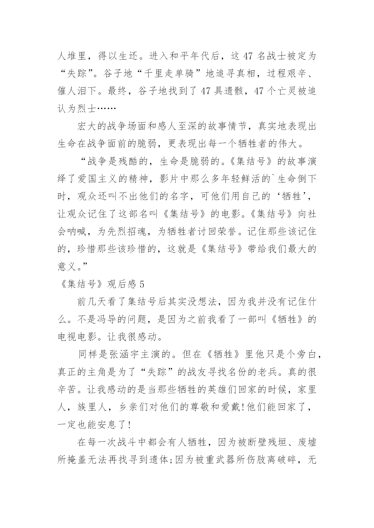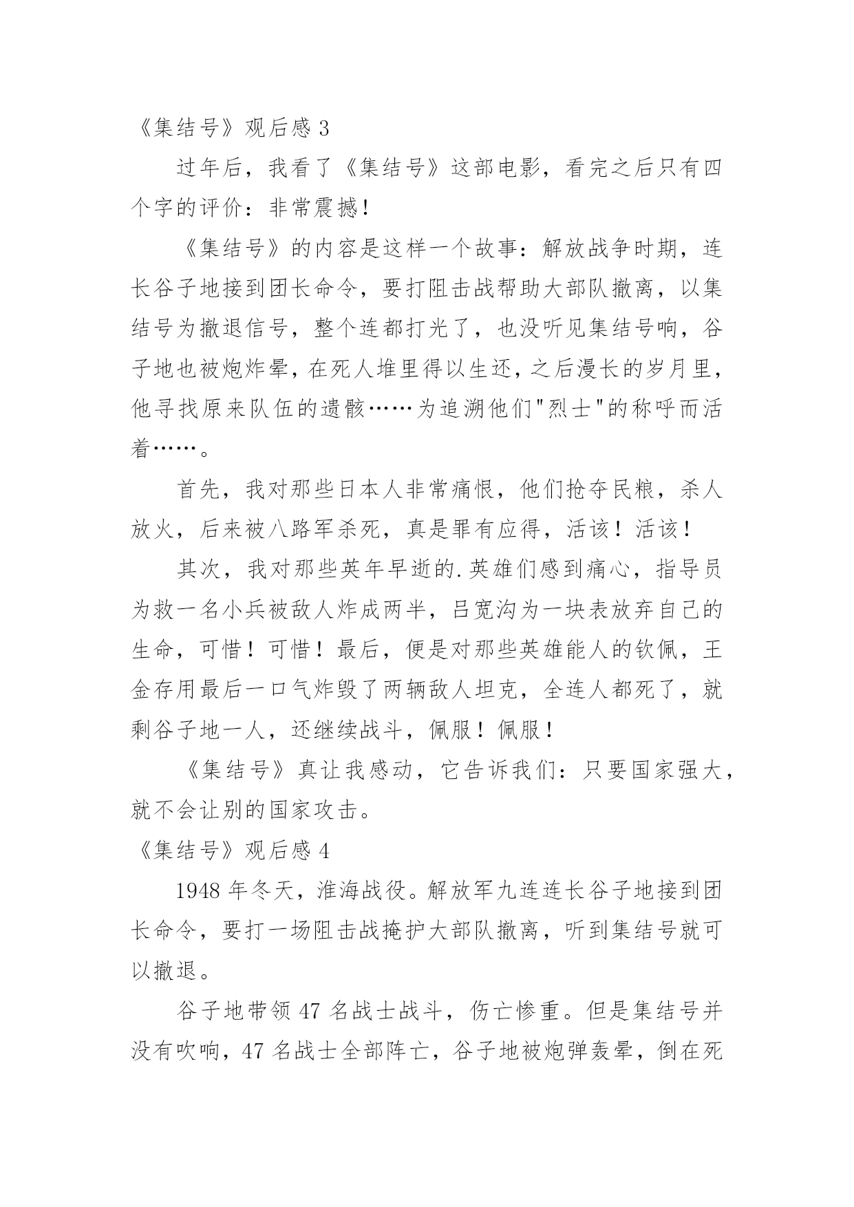 《集结号》观后感《集结号》观后感合集15篇当看完一部作品后,相信大家一定领会了不少东西,不妨坐下来好好写写观后感吧。观后感你想好怎么写了吗?以下是小编精心整理的《集结号》观后感,仅供参考,希望能够帮助到大家。《集结号》观后感1我看了《集结号》这部电影,看完之后只有四个字的评价:非常震撼!《集结号》的`内容是这样一个故事:解放战争时期,连长谷子地接到团长命令,要打阻击战帮助大部队撤离,以集结号为撤退信号,整个连都打光了,也没听见集结号响,谷子地也被炮炸晕,在死人堆里得以生还,之后漫长的岁月里,他寻找原来队伍的遗涵…为追溯他们"烈士"的称呼而活着…….首先,我对那些日本人非常痛恨,他们抢夺民粮,杀人放火,后来被八路军杀死,真是罪有应得,活该!活该!其次,我对那些英年早逝的英雄们感到痛心,指导员为救一名小兵被敌人炸成两半,吕宽沟为一块表放弃自己的生命,可惜!可惜!最后,便是对那些英雄能人的钦佩,王金存用最后一口气炸毁了两辆敌人坦克,全连人都死了,就剩谷子地一人,还继续战斗,佩服!佩服!《集结号》真让我感动,它告诉我们:只要国家强大,就不会让别的国家攻击。《集结号》观后感2前不久,一条短信在手机、网络上广泛传播:看了《色戒》,发现女人靠不住;看了《投名状》,发现兄弟靠不住;看了《集结号》,发现组织更靠不住。“组织靠不住”,然也。《集结号》点出了这一秘密,但它实际上也是人尽皆知的。在《集结号》一片中,印象比较深刻的“组织”有二,一明一暗。一处是汶河县政府的干事来找谷子地,让后者“对组织提供真实的情况”,所讲的'话语几乎每一句都在影射谷子地是个叛徒,亦或是一个有着不良记录的俘虏。倘若是个普通人,也受不了如此侮辱,更何况是一个铁骨铮铮的硬汉和英雄呢?结果,谷子地大发雷霆,尔后,气急败坏的“组织”口不择言地将最高职务不过连长的他定性为“军阀”。第二处“组织”是暗的,但却是“组织靠不住”所指的那一“组织”,也就是刘泽水团长所代表的“组织”。抛开其他一切不说,这个组织确实是有愧于谷子地和战死的九连战士的,影片也安排了当年的司号员小梁子向谷子地下跪。其实还有一处更隐蔽的组织。小梁子后来提到,时任副师长的刘泽水在朝鲜战场担负阻击任务直至牺牲。当年曾是他人靠不住“组织”的刘副师长,后来也遇到了类似的“组织”。这一情节的设置带有文学作品中常见的因果报应色彩。《集结号》观后感3过年后,我看了《集结号》这部电影,看完之后只有四个字的评价:非常震撼!《集结号》的内容是这样一个故事:解放战争时期,连长谷子地接到团长命令,要打阻击战帮助大部队撤离,以集结号为撤退信号,整个连都打光了,也没听见集结号响,谷子地也被炮炸晕,在死人堆里得以生还,之后漫长的岁月里,他寻找原来队伍的遗骸……为追溯他们"烈士"的称呼而活着……。首先,我对那些日本人非常痛恨,他们抢夺民粮,杀人放火,后来被八路军杀死,真是罪有应得,活该!活该!其次,我对那些英年早逝的.英雄们感到痛心,指导员为救一名小兵被敌人炸成两半,吕宽沟为一块表放弃自己的生命,可惜!可惜!最后,便是对那些英雄能人的钦佩,王金存用最后一口气炸毁了两辆敌人坦克,全连人都死了,就剩谷子地一人,还继续战斗,佩服!佩服!《集结号》真让我感动,它告诉我们:只要国家强大,就不会让别的国家攻击。《集结号》观后感41948年冬天,淮海战役。解放军九连连长谷子地接到团长命令,要打一场阻击战掩护大部队撤离,听到集结号就可以撤退。谷子地带领47名战士战斗,伤亡惨重。但是集结号并没有吹响,47名战士全部阵亡,谷子地被炮弹轰晕,倒在死人堆里,得以生还。进入和平年代后,这47名战士被定为“失踪”。谷子地“千里走单骑”地追寻真相,过程艰辛、催人泪下。最终,谷子地找到了47具遗骸,47个亡灵被追认为烈士……宏大的战争场面和感人至深的故事情节,真实地表现出生命在战争面前的脆弱,更表现出每一个牺牲者的伟大。“战争是残酷的,生命是脆弱的。《集结号》的故事演绎了爱国主义的精神,影片中那么多年轻鲜活的`生命倒下时,观众还叫不出他们的名字,可他们用自己的‘牺牲’,让观众记住了这部名叫《集结号》的电影。《集结号》向社会呐喊,为先烈招魂,为牺牲者讨回荣誉。记住那些该记住的,珍惜那些该珍惜的,这就是《集结号》带给我们最大的意义。”《集结号》观后感5前几天看了集结号后其实没想法,因为我并没有记住什么。不是冯导的问题,是因为之前我看了一部叫《牺牲》的电视电影。让我很感动。同样是张涵宇主演的。但在《牺牲》里他只是个旁白,真正的主角是为了“失踪”的战友寻找名份的老兵。真的很辛苦。让我感动的是当那些牺牲的英雄们回家的时候,家里人,族里人,乡亲们对他们的尊敬和爱戴!他们能回家了,一定也能安息了!在每一次战斗中都会有人牺牲,因为被断壁残垣、废墟所掩盖无法再找寻到遗体;因为被重武器所伤肢离