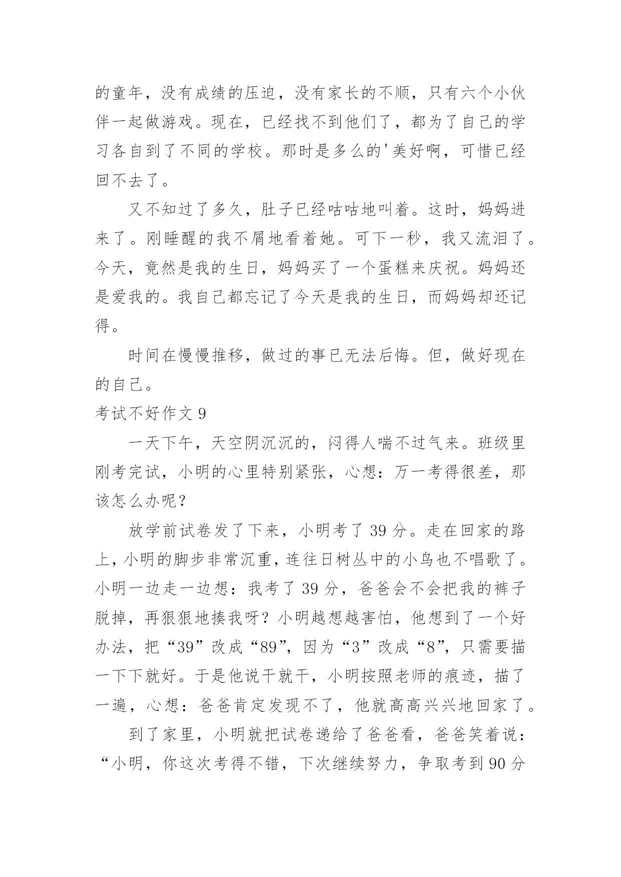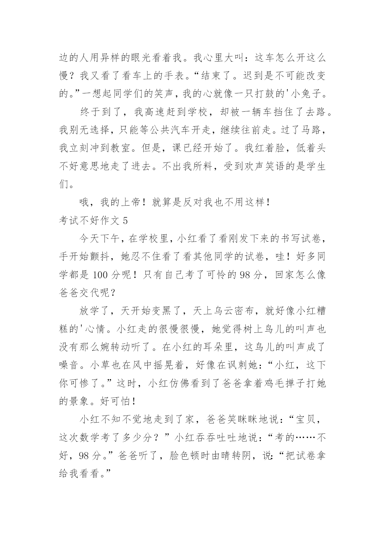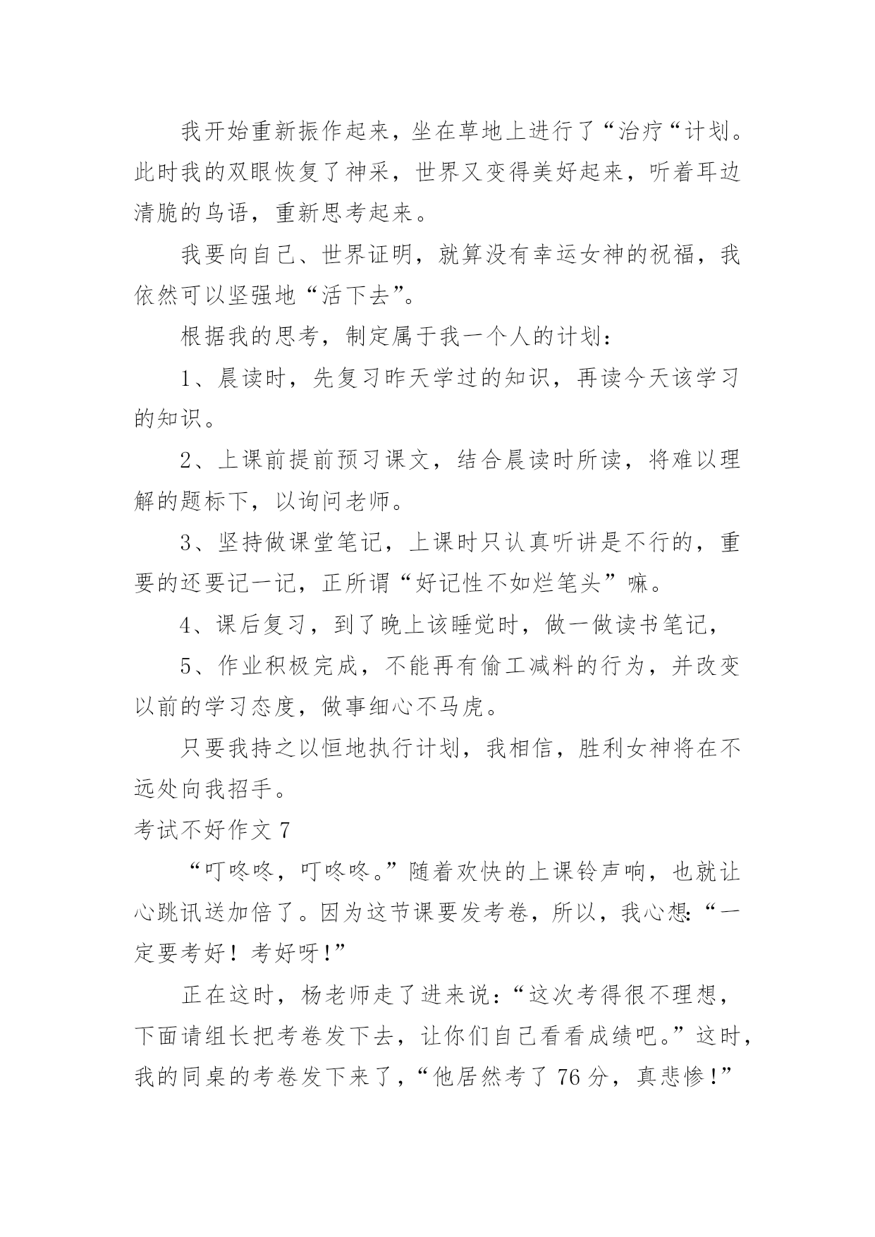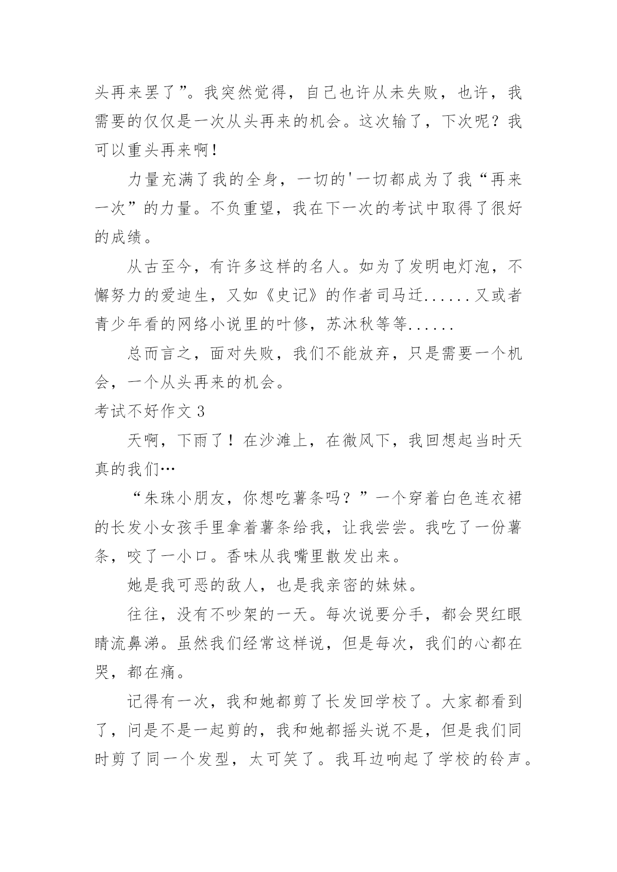 考试不好作文考试不好作文11篇在我们平凡的日常里,大家都不可避免地会接触到作文吧,作文是人们把记忆中所存储的有关知识、经验和思想用书面形式表达出来的记叙方式。还是对作文一筹莫展吗?下面是小编帮大家整理的考试不好作文,仅供参考,欢迎大家阅读。考试不好作文1每个人都有令自己难忘的第一次,可能是第一次登山,第一次做饭,也可能是第一次收礼物。但令我难忘的第一次却是不及格。那天上午,我的心情格外好,看看天,天是那么柔和自然;看看树,树是那么苗条优雅;再看看同学,同学是那么友善和蔼。外出活动回来以后,发现老师站在桌子前,手里捧着一大摞考卷,不说一句话。我心想:“肯定是老师为了我们考得这么好而说不出话了吧?但是,这种想象很明显是错的。老师阴沉着脸,开始读我们的成绩:“小豪,76分;小史,82分……”我心里美滋滋地想:原来我的成绩这么高呀,90分都没念到我的名字!我越想越开心。“小卢,94分;小单,94分;小瑞,98分……”听到这,我还以为自己得了100分呢,比刚才更高兴。“及格以上,结束。”说到这里,老师瞪了我一眼,皱了皱眉,“最让我痛心的'是小郭,连及格都不到,35分!”什么?我才35分?怎么会这样?这句话像一记重锤砸在了我的心上,像一颗子弹射在了我的胸膛。我脸上火辣辣的,那温度就像能把鸡蛋煮熟一样。周围的人盯着我,老师也伤心地望着我,我不敢与同学和老师的目光相撞了。顿时感觉天黑了,树枯了,人没了。但我不想被落下,所以,上课我不敢再溜号了;下课不敢再疯玩了;自习课也不敢再浪费了,因为我知道我已经不能再无知了。所以,我为成功积累了经验。终于,我在一次英语考试中得到了第二名的好成绩。考试不好作文2“人生从未失败,只是从头再来罢了。”这是我从书上看来的话,有很多人把它当做激励自己的话。但我看来,不仅如此,它更像一位亲密的好朋友。它曾陪伴我走过了多少个暗淡无光的日子,在多少个失落的时刻,在多少个不尽人意的地方,在多少个伤心的时候,它习惯性的安慰我,给予我温暖。最深刻的一次是在考试完发试卷的时候。那次我考得非常不好,是我考得最差、最失败的一次。大片的红圈与减分的字样清清楚楚地刻在试卷上??那个样子,我仍记得,那么清晰,刺得我双眼生疼。父母没说什么,同学也仅仅是惊讶。我却觉得自己是彻彻底底的失败。就在这时,我看到了那句话??“人生从未失败,只是从头再来罢了”。我突然觉得,自己也许从未失败,也许,我需要的仅仅是一次从头再来的机会。这次输了,下次呢?我可以重头再来啊!力量充满了我的全身,一切的'一切都成为了我“再来一次”的力量。不负重望,我在下一次的考试中取得了很好的成绩。从古至今,有许多这样的名人。如为了发明电灯泡,不懈努力的爱迪生,又如《史记》的作者司马迁......又或者青少年看的网络小说里的叶修,苏沐秋等等......总而言之,面对失败,我们不能放弃,只是需要一个机会,一个从头再来的机会。考试不好作文3天啊,下雨了!在沙滩上,在微风下,我回想起当时天真的我们…“朱珠小朋友,你想吃薯条吗?”一个穿着白色连衣裙的长发小女孩手里拿着薯条给我,让我尝尝。我吃了一份薯条,咬了一小口。香味从我嘴里散发出来。她是我可恶的敌人,也是我亲密的妹妹。往往,没有不吵架的一天。每次说要分手,都会哭红眼睛流鼻涕。虽然我们经常这样说,但是每次,我们的心都在哭,都在痛。记得有一次,我和她都剪了长发回学校了。大家都看到了,问是不是一起剪的,我和她都摇头说不是,但是我们同时剪了同一个发型,太可笑了。我耳边响起了学校的铃声。我和她对视了一眼,都笑了。人们还说我们就像一对真正的姐妹。虽然经常打架吵架。但是他们都哭着笑着.随着我们的成长,每个人都逐渐有了自己的'想法。每个人都意识到不可能有一辈子的朋友和友谊。在这个被淘汰的社会里,只有一辈子的敌人,只有短暂的友谊。我真的很想回去。在过去,我们不会忽视彼此,也不会忽视彼此。但是,你变了!你问我怎么还是一脸傻相。为什么不改变?因为不想改变,所以想保持当时的友谊。让我们回到童年,好吗?即使我知道时间回不去了,我还是想回去!考试不好作文4今天早上,最糟糕的事情发生在我身上——迟到。说起来,一切都得从昨晚开始。晚上,我发现我的手表停在7点钟。我给我妈看了之后,我妈说:“表坏了,我得拿去修。”我把手表放在床前,以免忘记。第二天,我睡眼惺忪地看着手表。“哦,还早!”我对自己说。我刚要睡一会儿,突然想起“手表坏了”,就冲出卧室“啊!不好!”我匆匆吃了几顿早餐,就赶去车站了。“为什么还没来?"我焦虑地看着旁边商店里的手表。来了!我三步两步就冲上去了。“哎呀,要迟到了!”我急得大叫。旁边的人用异样的眼光看着我。我心里大叫:这车怎么开这么慢?我又看了看车上的手表。“结束了。迟到是不可能改变的。”一想起同学们的笑声,我的心就像一只打鼓的'小兔子。终于到了,