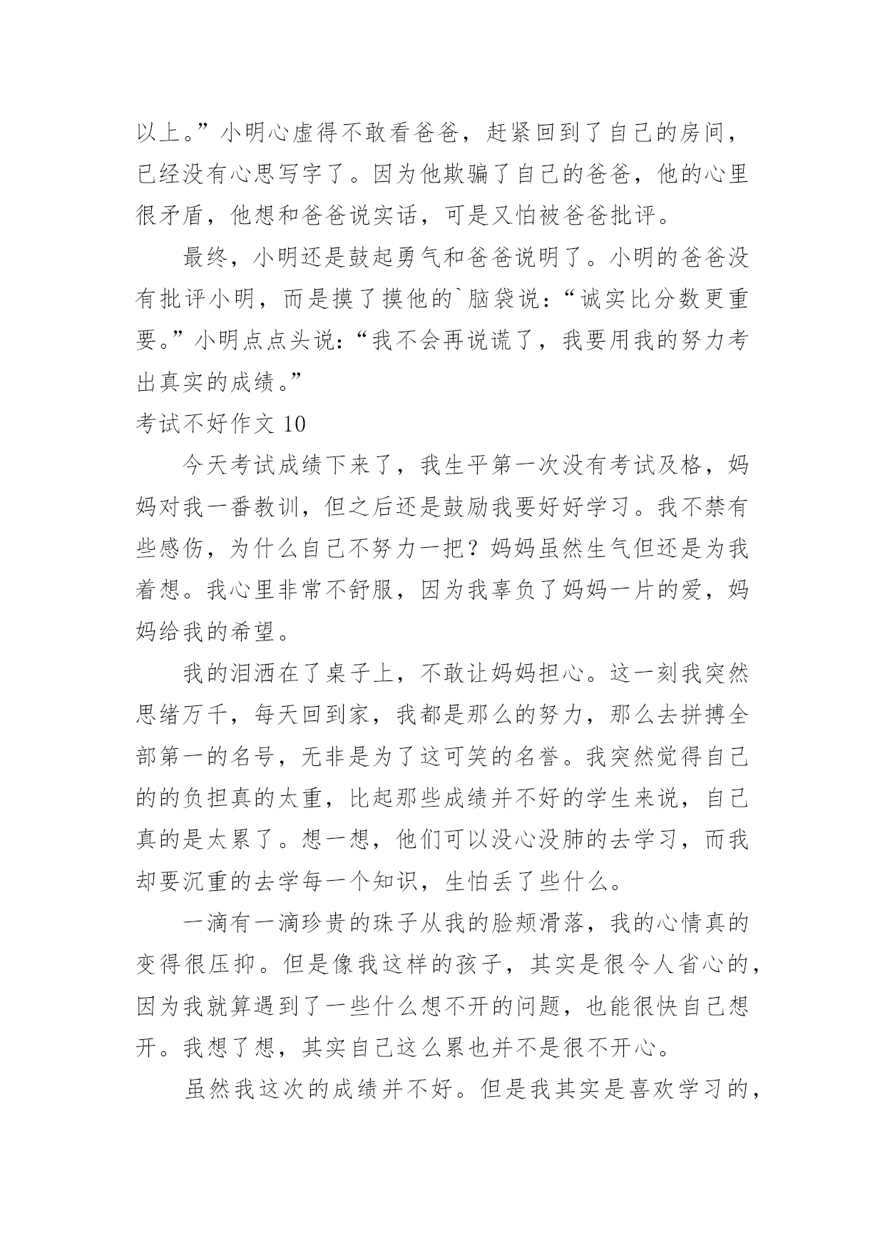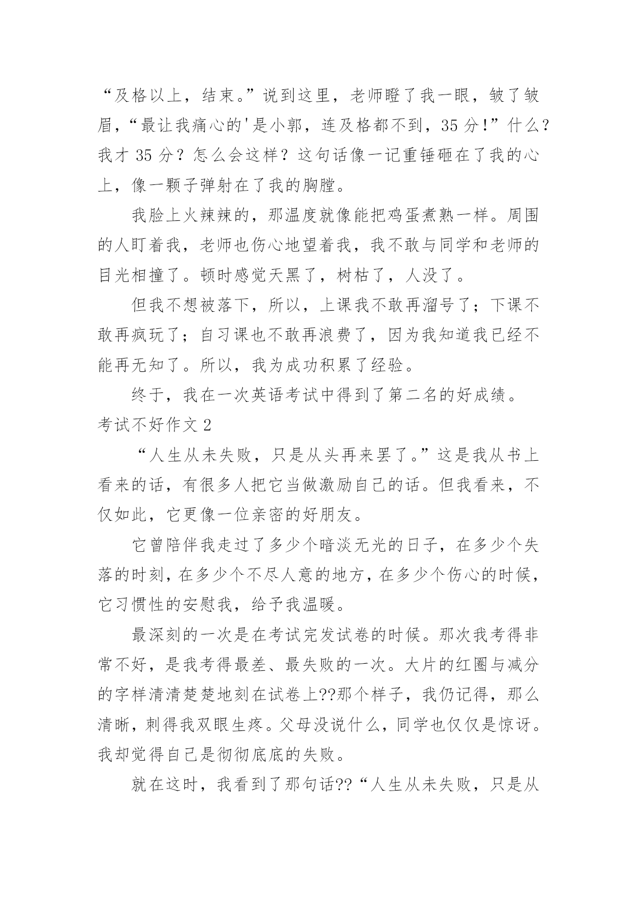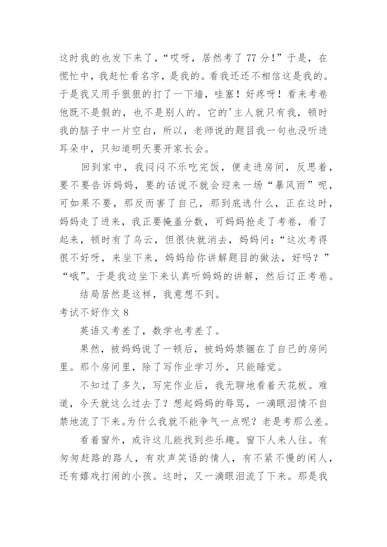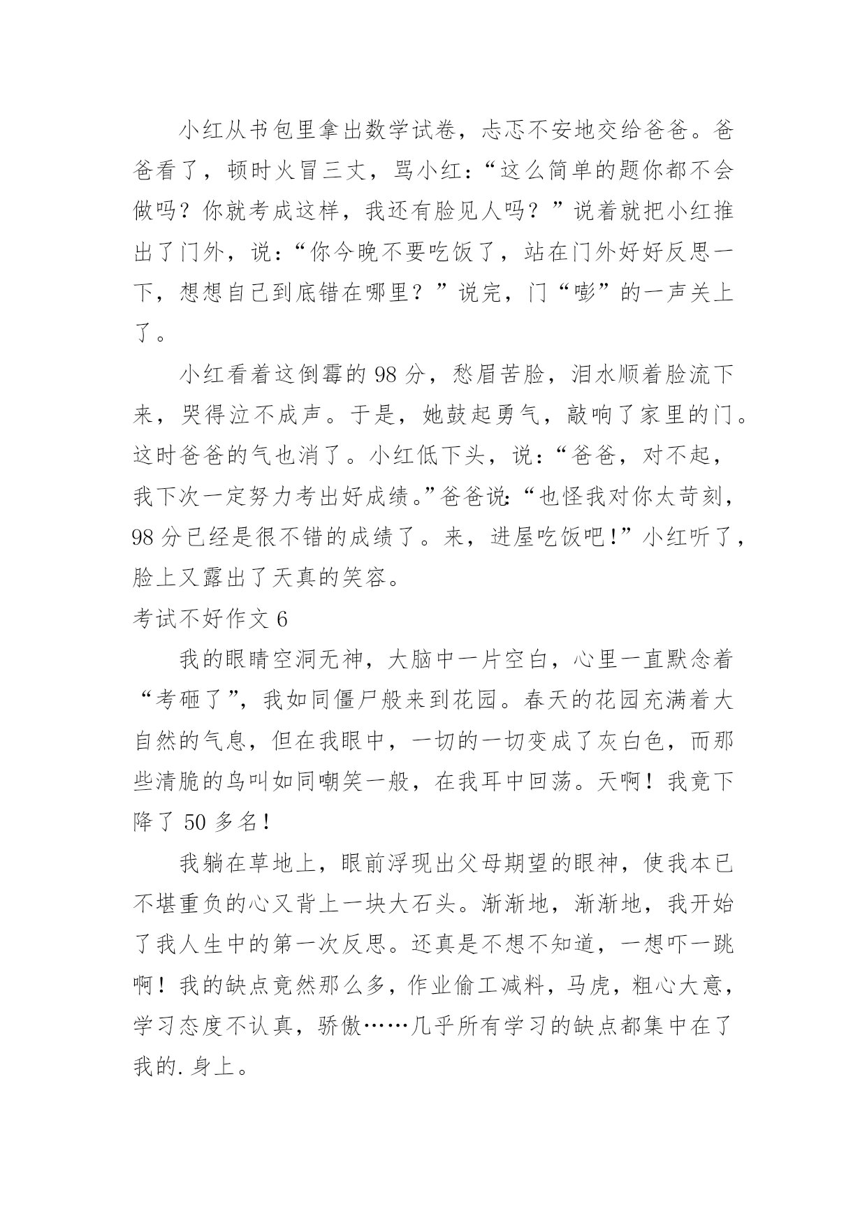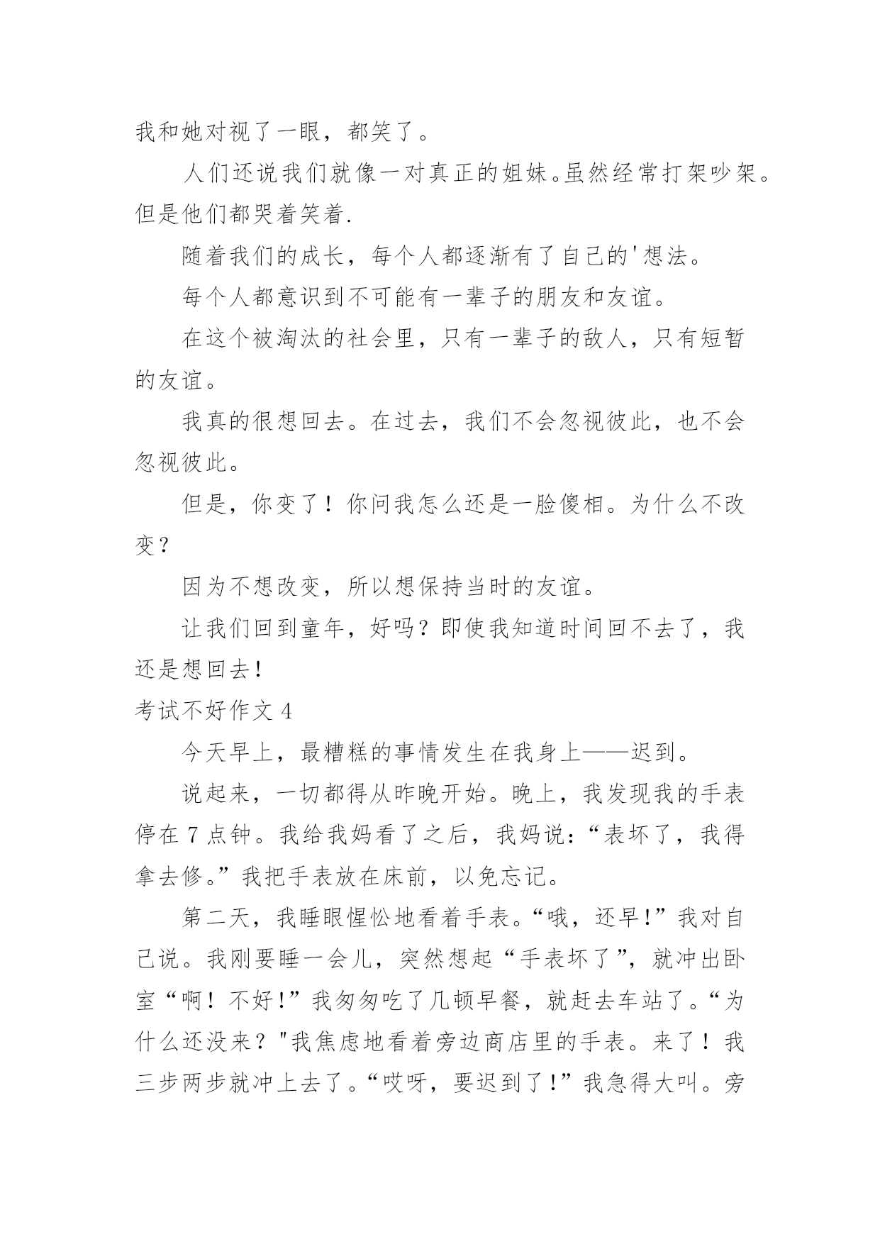 考试不好作文考试不好作文11篇在我们平凡的日常里,大家都不可避免地会接触到作文吧,作文是人们把记忆中所存储的有关知识、经验和思想用书面形式表达出来的记叙方式。还是对作文一筹莫展吗?下面是小编帮大家整理的考试不好作文,仅供参考,欢迎大家阅读。考试不好作文1每个人都有令自己难忘的第一次,可能是第一次登山,第一次做饭,也可能是第一次收礼物。但令我难忘的第一次却是不及格。那天上午,我的心情格外好,看看天,天是那么柔和自然;看看树,树是那么苗条优雅;再看看同学,同学是那么友善和蔼。外出活动回来以后,发现老师站在桌子前,手里捧着一大摞考卷,不说一句话。我心想:“肯定是老师为了我们考得这么好而说不出话了吧?但是,这种想象很明显是错的。老师阴沉着脸,开始读我们的成绩:“小豪,76分;小史,82分……”我心里美滋滋地想:原来我的成绩这么高呀,90分都没念到我的名字!我越想越开心。“小卢,94分;小单,94分;小瑞,98分……”听到这,我还以为自己得了100分呢,比刚才更高兴。“及格以上,结束。”说到这里,老师瞪了我一眼,皱了皱眉,“最让我痛心的'是小郭,连及格都不到,35分!”什么?我才35分?怎么会这样?这句话像一记重锤砸在了我的心上,像一颗子弹射在了我的胸膛。我脸上火辣辣的,那温度就像能把鸡蛋煮熟一样。周围的人盯着我,老师也伤心地望着我,我不敢与同学和老师的目光相撞了。顿时感觉天黑了,树枯了,人没了。但我不想被落下,所以,上课我不敢再溜号了;下课不敢再疯玩了;自习课也不敢再浪费了,因为我知道我已经不能再无知了。所以,我为成功积累了经验。终于,我在一次英语考试中得到了第二名的好成绩。考试不好作文2“人生从未失败,只是从头再来罢了。”这是我从书上看来的话,有很多人把它当做激励自己的话。但我看来,不仅如此,它更像一位亲密的好朋友。它曾陪伴我走过了多少个暗淡无光的日子,在多少个失落的时刻,在多少个不尽人意的地方,在多少个伤心的时候,它习惯性的安慰我,给予我温暖。最深刻的一次是在考试完发试卷的时候。那次我考得非常不好,是我考得最差、最失败的一次。大片的红圈与减分的字样清清楚楚地刻在试卷上??那个样子,我仍记得,那么清晰,刺得我双眼生疼。父母没说什么,同学也仅仅是惊讶。我却觉得自己是彻彻底底的失败。就在这时,我看到了那句话??“人生从未失败,只是从头再来罢了”。我突然觉得,自己也许从未失败,也许,我需要的仅仅是一次从头再来的机会。这次输了,下次呢?我可以重头再来啊!力量充满了我的全身,一切的'一切都成为了我“再来一次”的力量。不负重望,我在下一次的考试中取得了很好的成绩。从古至今,有许多这样的名人。如为了发明电灯泡,不懈努力的爱迪生,又如《史记》的作者司马迁......又或者青少年看的网络小说里的叶修,苏沐秋等等......总而言之,面对失败,我们不能放弃,只是需要一个机会,一个从头再来的机会。考试不好作文3天啊,下雨了!在沙滩上,在微风下,我回想起当时天真的我们…“朱珠小朋友,你想吃薯条吗?”一个穿着白色连衣裙的长发小女孩手里拿着薯条给我,让我尝尝。我吃了一份薯条,咬了一小口。香味从我嘴里散发出来。她是我可恶的敌人,也是我亲密的妹妹。往往,没有不吵架的一天。每次说要分手,都会哭红眼睛流鼻涕。虽然我们经常这样说,但是每次,我们的心都在哭,都在痛。记得有一次,我和她都剪了长发回学校了。大家都看到了,问是不是一起剪的,我和她都摇头说不是,但是我们同时剪了同一个发型,太可笑了。我耳边响起了学校的铃声。我和她对视了一眼,都笑了。人们还说我们就像一对真正的姐妹。虽然经常打架吵架。但是他们都哭着笑着.随着我们的成长,每个人都逐渐有了自己的'想法。每个人都意识到不可能有一辈子的朋友和友谊。在这个被淘汰的社会里,只有一辈子的敌人,只有短暂的友谊。我真的很想回去。在过去,我们不会忽视彼此,也不会忽视彼此。但是,你变了!你问我怎么还是一脸傻相。为什么不改变?因为不想改变,所以想保持当时的友谊。让我们回到童年,好吗?即使我知道时间回不去了,我还是想回去!考试不好作文4今天早上,最糟糕的事情发生在我身上——迟到。说起来,一切都得从昨晚开始。晚上,我发现我的手表停在7点钟。我给我妈看了之后,我妈说:“表坏了,我得拿去修。”我把手表放在床前,以免忘记。第二天,我睡眼惺忪地看着手表。“哦,还早!”我对自己说。我刚要睡一会儿,突然想起“手表坏了”,就冲出卧室“啊!不好!”我匆匆吃了几顿早餐,就赶去车站了。“为什么还没来?"我焦虑地看着旁边商店里的手表。来了!我三步两步就冲上去了。“哎呀,要迟到了!”我急得大叫。旁边的人用异样的眼光看着我。我心里大叫:这车怎么开这么慢?我又看了看车上的手表。“结束了。迟到是不可能改变的。”一想起同学们的笑声,我的心就像一只打鼓的'小兔子。终于到了,