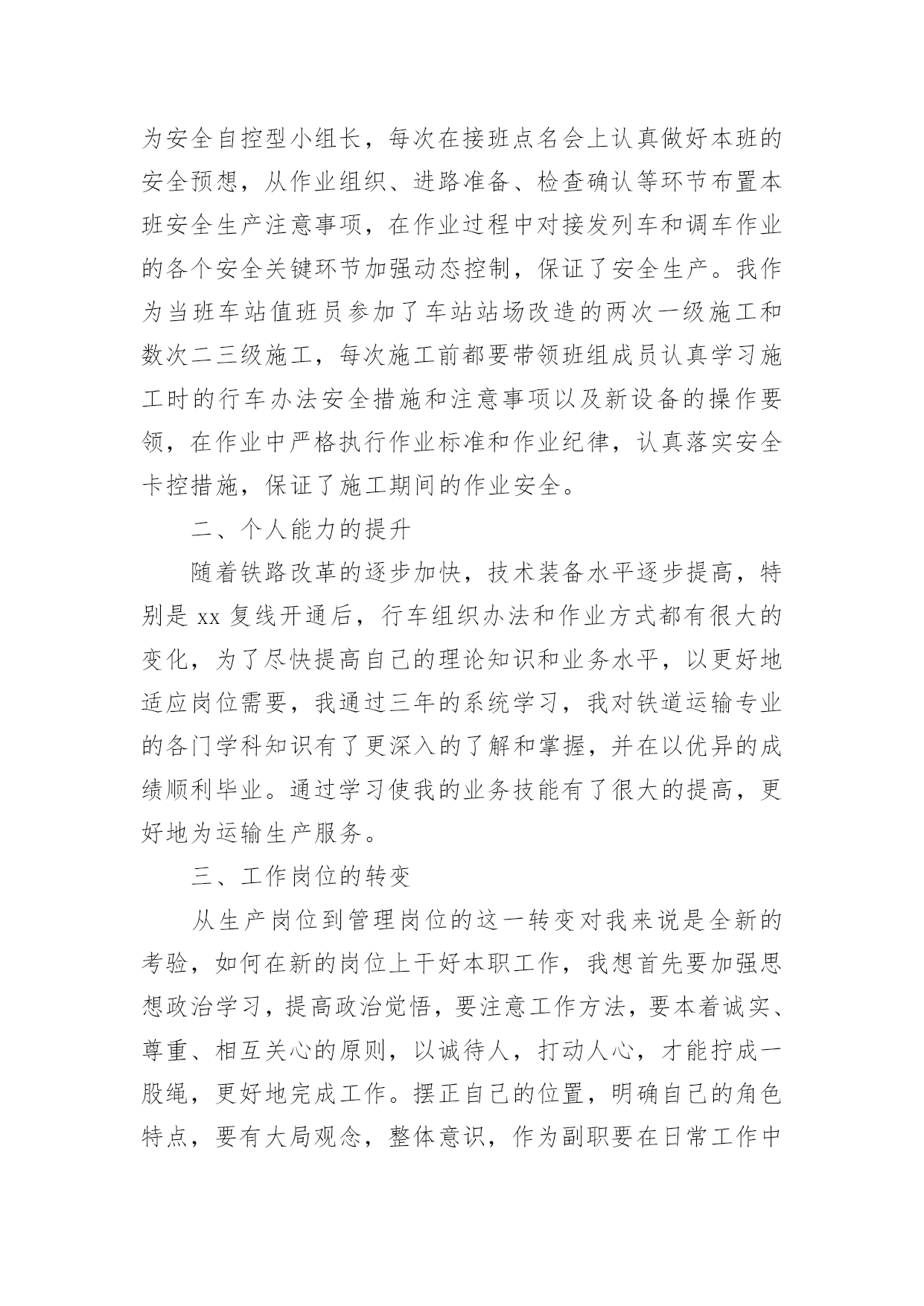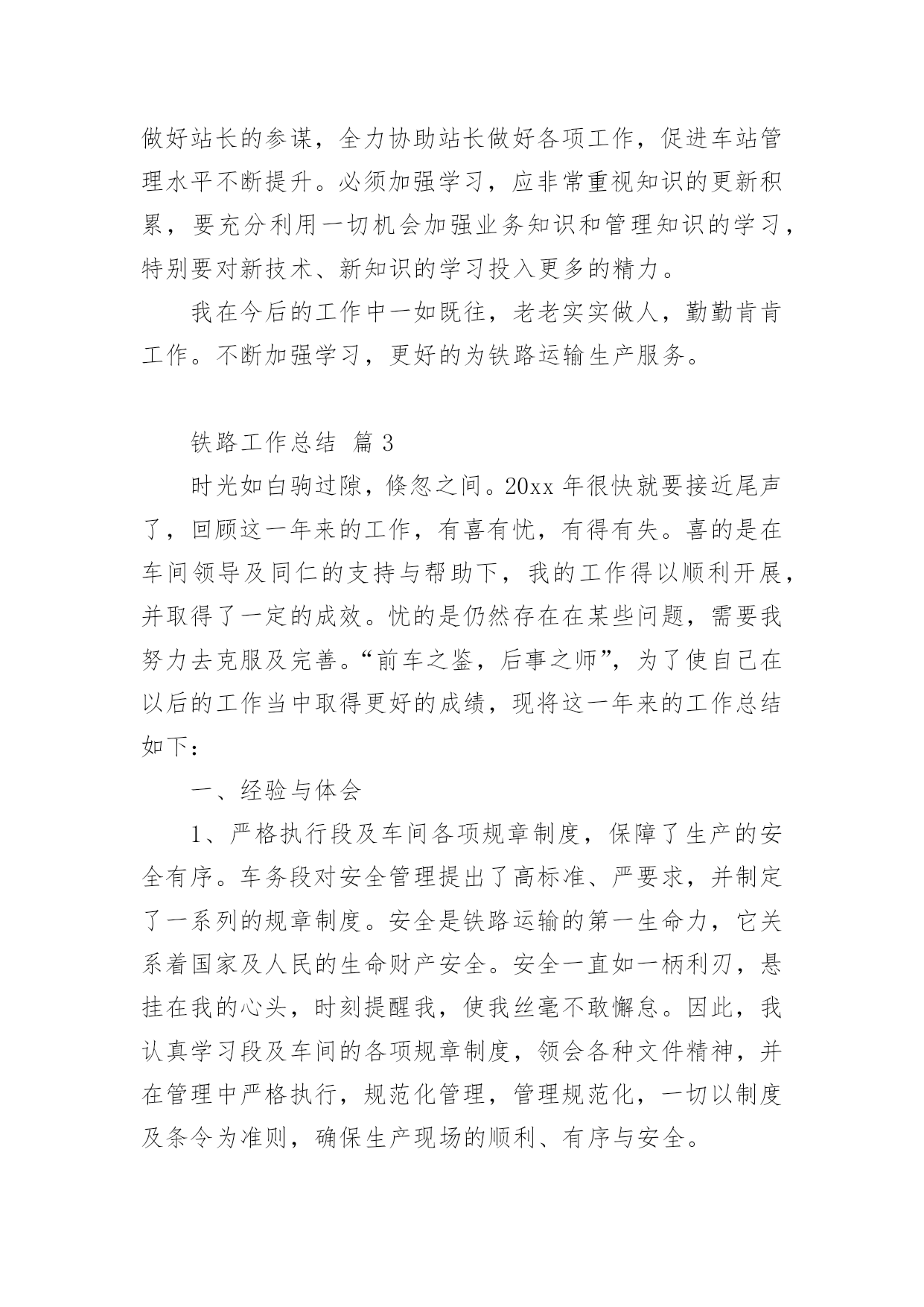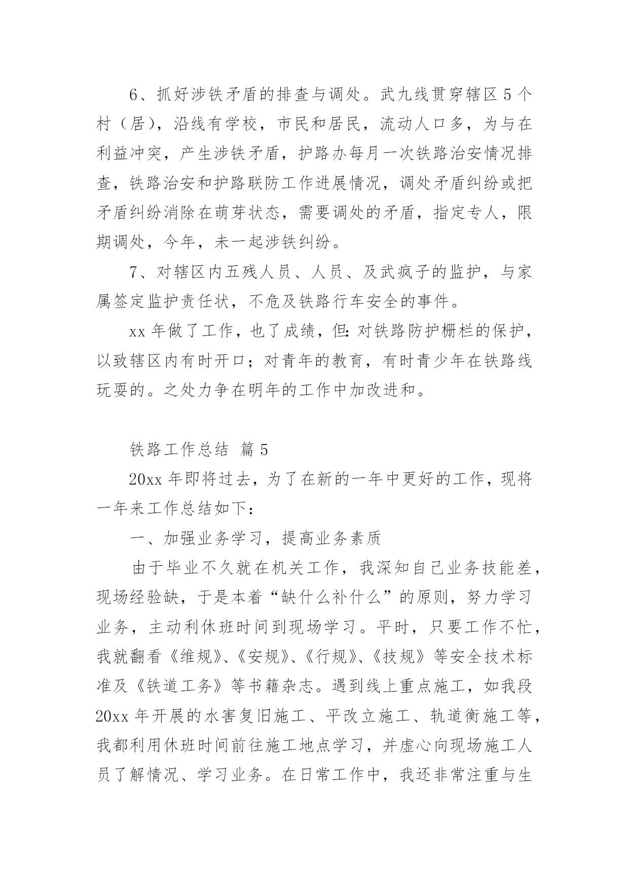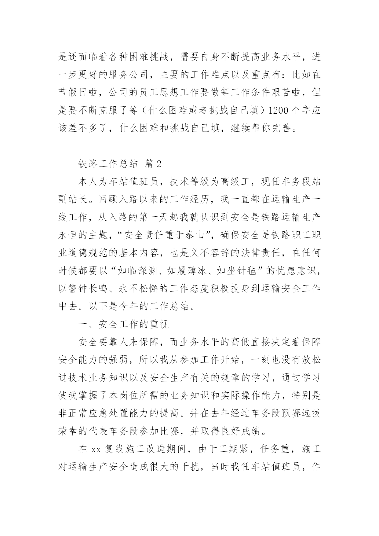 铁路工作总结铁路工作总结(精选10篇)不经意间,工作已经告一段落,这段时间以来的工作,收获了不少成绩,是时候仔细的写一份工作总结了。那么一般工作总结是怎么写的呢?下面是小编整理的铁路工作总结(精选10篇),仅供参考,欢迎大家阅读。铁路工作总结篇1从20xx年开始,我荣幸进入铁路集团公司工作,在公司的领导下,同事的关心下,我认真履行工作职责,完成公司下达的各项工作任务,为了更好的总结过去的经验,为了明年更好的开展工作,思路更加清晰,目标更加明确,紧紧围绕公司的要求,现就我工作三年以来做工作总结如下:一、按照公司的要求,完成上级下达的各项工作任务。从20xx年进入公司以来,我认真完成上级下达的各项工作任务,努力学习,并积累经验,作为一名铁路探伤工,我倍感荣欣,因为我认为铁路行业是中国伟大的事业,虽然我在基层工作,但是我时刻不忘记自己的光荣使命,注重质量,矜矜业业,到现在为止,经历过十年的风风雨雨,虽然有些艰辛,但是看着自己的成绩,还有得到公司上级的信任和肯定,我已经满足了,在往后的日子里,我更加努力奋斗,为公司创造更多的业绩。二、注重积累经验,加强自身技能学习,并培养身边的新员工,向管理方向迈进,并提高管理水平,精细化管理,更好的完成业绩。平日就注重自己素质的提高,加强学习以及经验积累,并通过各种培训会,将技能传授给每一个新员工,看着自己的徒弟一个个变成师傅,心里别提多高兴,他们在工作中也非常的上进,肯干,不怕苦,不怕累,这是我最有成就感的地方,当然,我们还要加强管控力度,完善管理薄弱环节,加强班组长的教育培训,充分发挥员工的积极性,在工作安排上,要合理还要饱满,要平衡还要高效,避免员工产生惰性思维,消除员工的消极方面因素,对于个别带头煽动消极情绪的员工要坚决处理。三、在过去的几年中,取得了不错的成绩,这是我自身不断努力的结果,更是公司领导培养的结果从xx年至今,通过自己的不断努力,终于取得了一定的成绩,所谓功夫不负有心人,也得到领导的肯定和关心,先后在xx年升任公司的探伤班长,由于成绩突出,xx年升任探伤工长,并于xx年做过铁路团支部书记,而且还在xx念获取过xx奖(自己填),当然这些成绩的取得除了离不开自己的努力,也离不开公司领导的培养,我们要知恩图报,也要在今后的工作中,再接再厉,不辜负公司的期望,带领下面的员工共同奋斗,为公司作出更大的贡献。四、今后工作的努力方向,继续围绕公司的目标,进一步加强自身学习,更好的完成公司交给我的任务。从本人进入铁路集团公司以来,虽然有很大的提高,但是还面临着各种困难挑战,需要自身不断提高业务水平,进一步更好的服务公司,主要的工作难点以及重点有:比如在节假日啦,公司的员工思想工作要做等工作条件艰苦啦,但是要不断克服了等(什么困难或者挑战自己填)1200个字应该差不多了,什么困难和挑战自己填,继续帮你完善。铁路工作总结篇2本人为车站值班员,技术等级为高级工,现任车务段站副站长。回顾入路以来的工作经历,我一直都在运输生产一线工作,从入路的第一天起我就认识到安全是铁路运输生产永恒的主题,“安全责任重于泰山”,确保安全是铁路职工职业道德规范的基本内容,也是义不容辞的法律责任,在任何时候都要以“如临深渊、如履薄冰、如坐针毡”的忧患意识,以警钟长鸣、永不松懈的工作态度积极投身到运输安全工作中去。以下是今年的工作总结。一、安全工作的重视安全要靠人来保障,而业务水平的高低直接决定着保障安全能力的强弱,所以我从参加工作开始,一刻也没有放松过技术业务知识以及安全生产有关的规章的学习,通过学习使我掌握了本岗位所需的业务知识和实际操作能力,特别是非正常应急处置能力的提高。并在去年经过车务段预赛选拔荣幸的代表车务段参加比赛,并取得良好成绩。在xx复线施工改造期间,由于工期紧,任务重,施工对运输生产安全造成很大的干扰,当时我任车站值班员,作为安全自控型小组长,每次在接班点名会上认真做好本班的安全预想,从作业组织、进路准备、检查确认等环节布置本班安全生产注意事项,在作业过程中对接发列车和调车作业的各个安全关键环节加强动态控制,保证了安全生产。我作为当班车站值班员参加了车站站场改造的两次一级施工和数次二三级施工,每次施工前都要带领班组成员认真学习施工时的行车办法安全措施和注意事项以及新设备的操作要领,在作业中严格执行作业标准和作业纪律,认真落实安全卡控措施,保证了施工期间的作业安全。二、个人能力的提升随着铁路改革的逐步加快,技术装备水平逐步提高,特别是xx复线开通后,行车组织办法和作业方式都有很大的变化,为了尽快提高自己的理论知识和业务水平,以更好地适应岗位需要,我通过三年的系统学习,我对铁道运输专业的各门学科知识有了更深入的了解和掌握,并在以优异的成绩顺利毕业。通过学习使我的业务技能有了很大的提高,更好地为运输生产服务