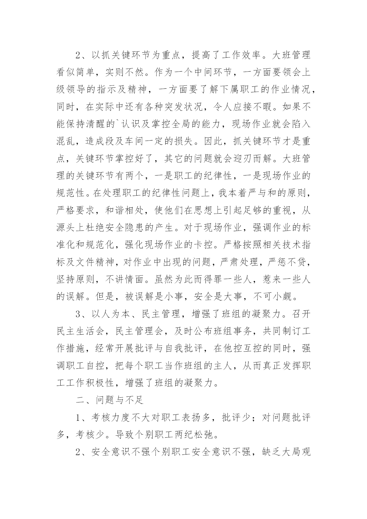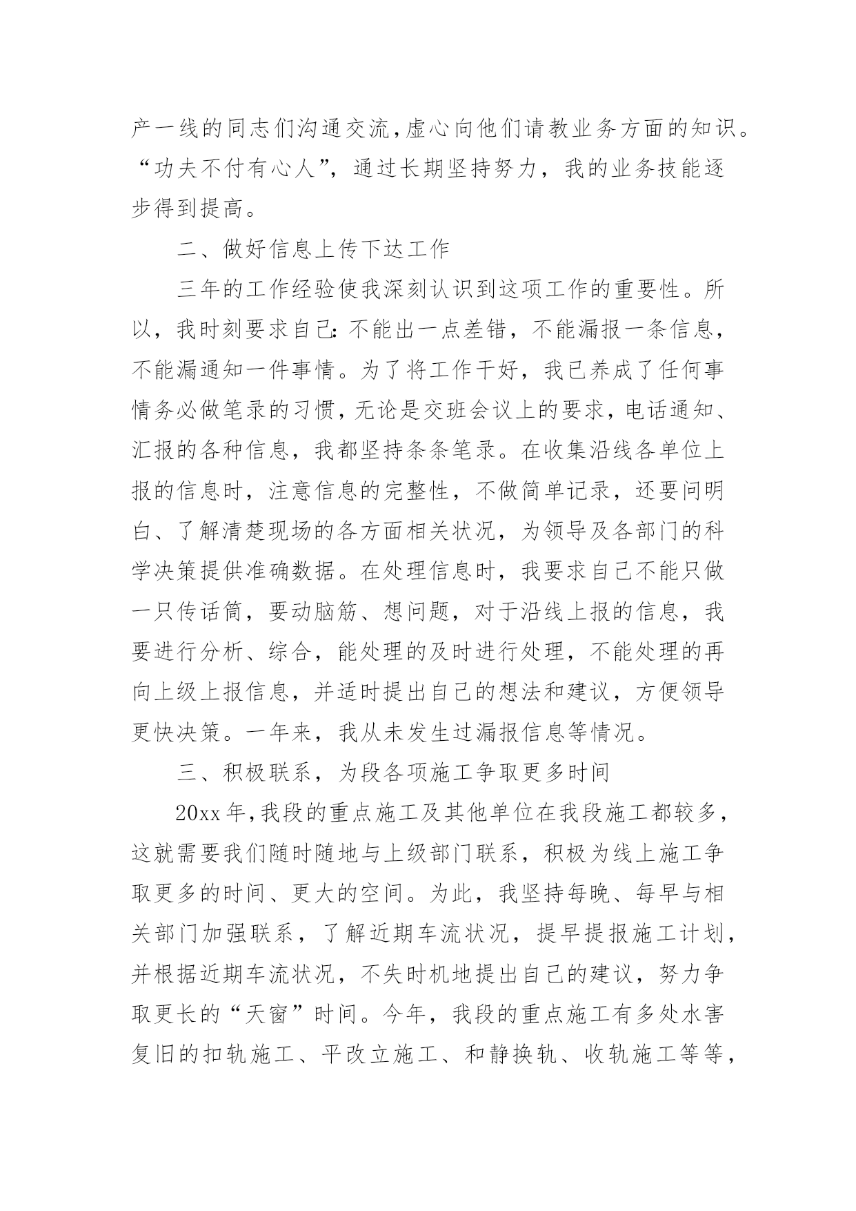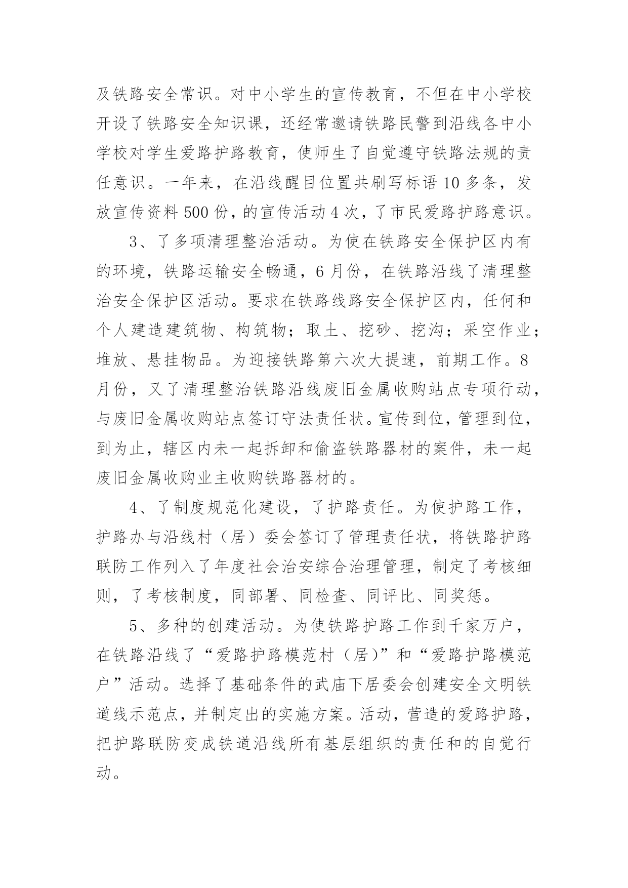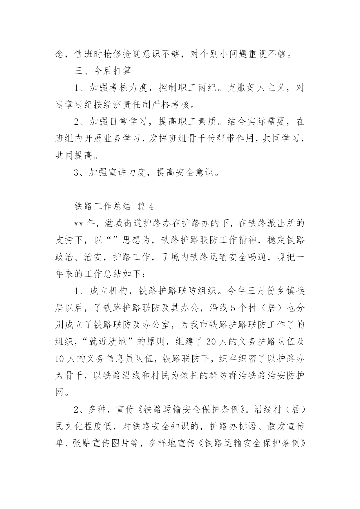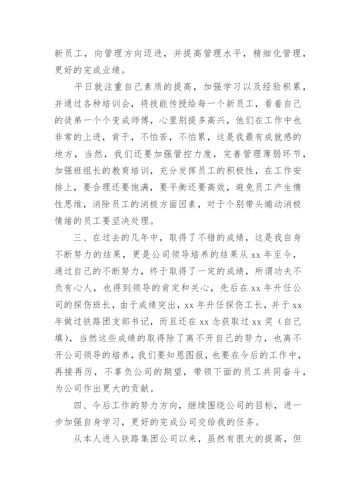 铁路工作总结铁路工作总结(精选10篇)不经意间,工作已经告一段落,这段时间以来的工作,收获了不少成绩,是时候仔细的写一份工作总结了。那么一般工作总结是怎么写的呢?下面是小编整理的铁路工作总结(精选10篇),仅供参考,欢迎大家阅读。铁路工作总结篇1从20xx年开始,我荣幸进入铁路集团公司工作,在公司的领导下,同事的关心下,我认真履行工作职责,完成公司下达的各项工作任务,为了更好的总结过去的经验,为了明年更好的开展工作,思路更加清晰,目标更加明确,紧紧围绕公司的要求,现就我工作三年以来做工作总结如下:一、按照公司的要求,完成上级下达的各项工作任务。从20xx年进入公司以来,我认真完成上级下达的各项工作任务,努力学习,并积累经验,作为一名铁路探伤工,我倍感荣欣,因为我认为铁路行业是中国伟大的事业,虽然我在基层工作,但是我时刻不忘记自己的光荣使命,注重质量,矜矜业业,到现在为止,经历过十年的风风雨雨,虽然有些艰辛,但是看着自己的成绩,还有得到公司上级的信任和肯定,我已经满足了,在往后的日子里,我更加努力奋斗,为公司创造更多的业绩。二、注重积累经验,加强自身技能学习,并培养身边的新员工,向管理方向迈进,并提高管理水平,精细化管理,更好的完成业绩。平日就注重自己素质的提高,加强学习以及经验积累,并通过各种培训会,将技能传授给每一个新员工,看着自己的徒弟一个个变成师傅,心里别提多高兴,他们在工作中也非常的上进,肯干,不怕苦,不怕累,这是我最有成就感的地方,当然,我们还要加强管控力度,完善管理薄弱环节,加强班组长的教育培训,充分发挥员工的积极性,在工作安排上,要合理还要饱满,要平衡还要高效,避免员工产生惰性思维,消除员工的消极方面因素,对于个别带头煽动消极情绪的员工要坚决处理。三、在过去的几年中,取得了不错的成绩,这是我自身不断努力的结果,更是公司领导培养的结果从xx年至今,通过自己的不断努力,终于取得了一定的成绩,所谓功夫不负有心人,也得到领导的肯定和关心,先后在xx年升任公司的探伤班长,由于成绩突出,xx年升任探伤工长,并于xx年做过铁路团支部书记,而且还在xx念获取过xx奖(自己填),当然这些成绩的取得除了离不开自己的努力,也离不开公司领导的培养,我们要知恩图报,也要在今后的工作中,再接再厉,不辜负公司的期望,带领下面的员工共同奋斗,为公司作出更大的贡献。四、今后工作的努力方向,继续围绕公司的目标,进一步加强自身学习,更好的完成公司交给我的任务。从本人进入铁路集团公司以来,虽然有很大的提高,但是还面临着各种困难挑战,需要自身不断提高业务水平,进一步更好的服务公司,主要的工作难点以及重点有:比如在节假日啦,公司的员工思想工作要做等工作条件艰苦啦,但是要不断克服了等(什么困难或者挑战自己填)1200个字应该差不多了,什么困难和挑战自己填,继续帮你完善。铁路工作总结篇2本人为车站值班员,技术等级为高级工,现任车务段站副站长。回顾入路以来的工作经历,我一直都在运输生产一线工作,从入路的第一天起我就认识到安全是铁路运输生产永恒的主题,“安全责任重于泰山”,确保安全是铁路职工职业道德规范的基本内容,也是义不容辞的法律责任,在任何时候都要以“如临深渊、如履薄冰、如坐针毡”的忧患意识,以警钟长鸣、永不松懈的工作态度积极投身到运输安全工作中去。以下是今年的工作总结。一、安全工作的重视安全要靠人来保障,而业务水平的高低直接决定着保障安全能力的强弱,所以我从参加工作开始,一刻也没有放松过技术业务知识以及安全生产有关的规章的学习,通过学习使我掌握了本岗位所需的业务知识和实际操作能力,特别是非正常应急处置能力的提高。并在去年经过车务段预赛选拔荣幸的代表车务段参加比赛,并取得良好成绩。在xx复线施工改造期间,由于工期紧,任务重,施工对运输生产安全造成很大的干扰,当时我任车站值班员,作为安全自控型小组长,每次在接班点名会上认真做好本班的安全预想,从作业组织、进路准备、检查确认等环节布置本班安全生产注意事项,在作业过程中对接发列车和调车作业的各个安全关键环节加强动态控制,保证了安全生产。我作为当班车站值班员参加了车站站场改造的两次一级施工和数次二三级施工,每次施工前都要带领班组成员认真学习施工时的行车办法安全措施和注意事项以及新设备的操作要领,在作业中严格执行作业标准和作业纪律,认真落实安全卡控措施,保证了施工期间的作业安全。二、个人能力的提升随着铁路改革的逐步加快,技术装备水平逐步提高,特别是xx复线开通后,行车组织办法和作业方式都有很大的变化,为了尽快提高自己的理论知识和业务水平,以更好地适应岗位需要,我通过三年的系统学习,我对铁道运输专业的各门学科知识有了更深入的了解和掌握,并在以优异的成绩顺利毕业。通过学习使我的业务技能有了很大的提高,更好地为运输生产服务