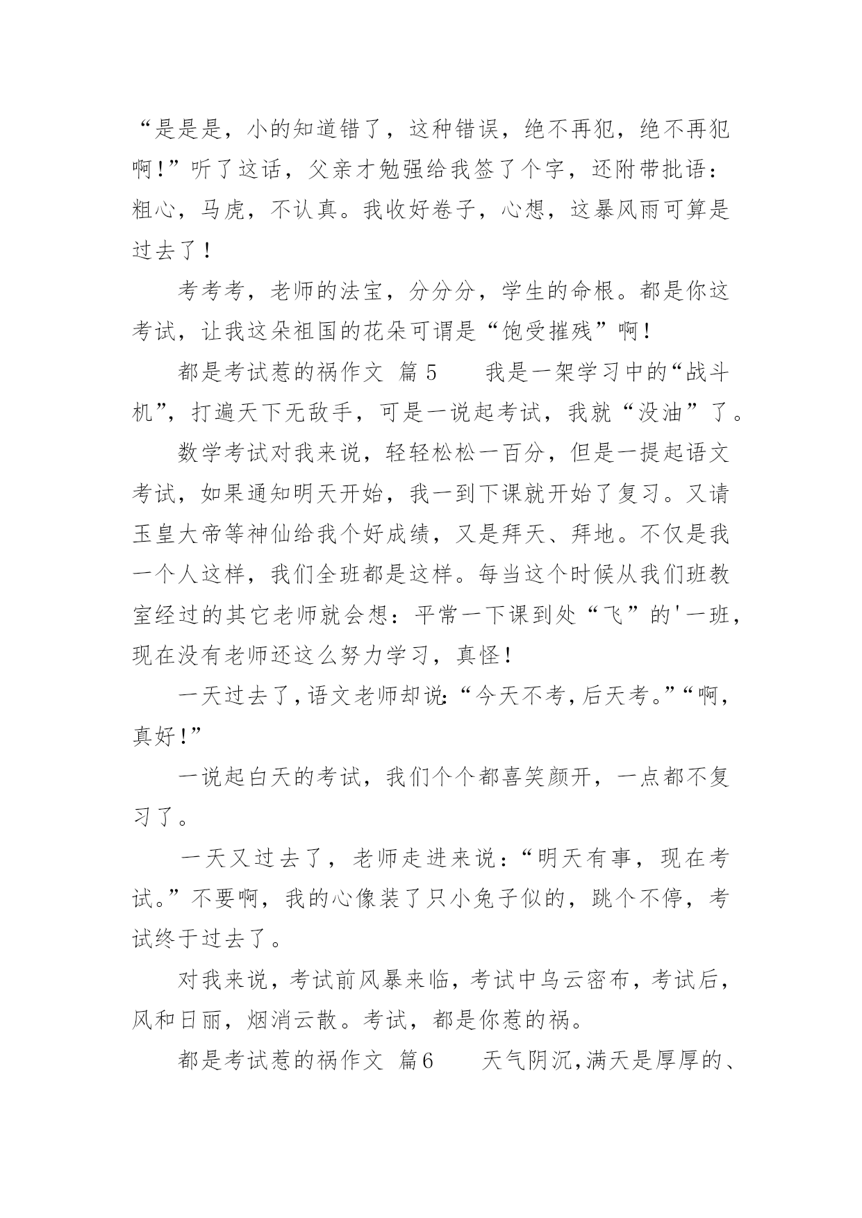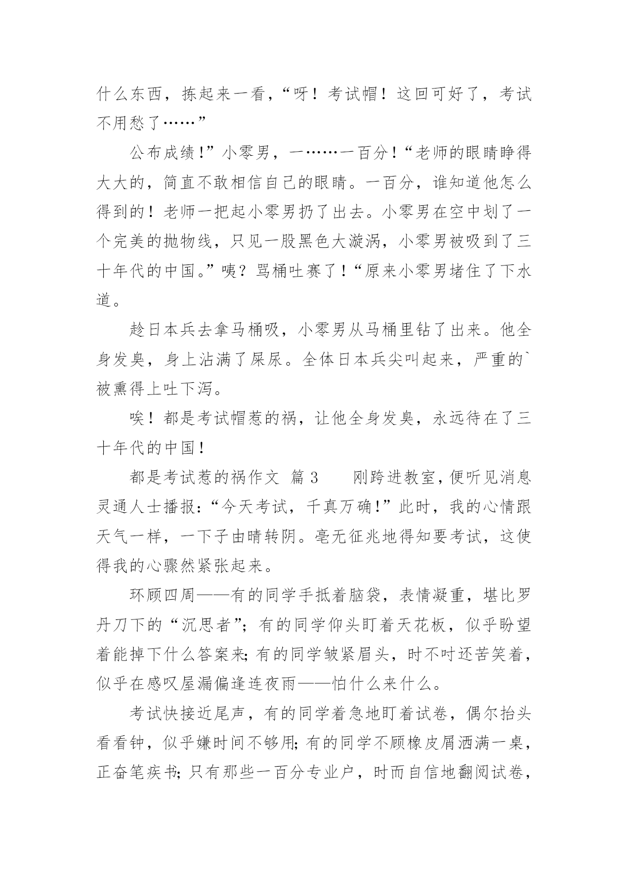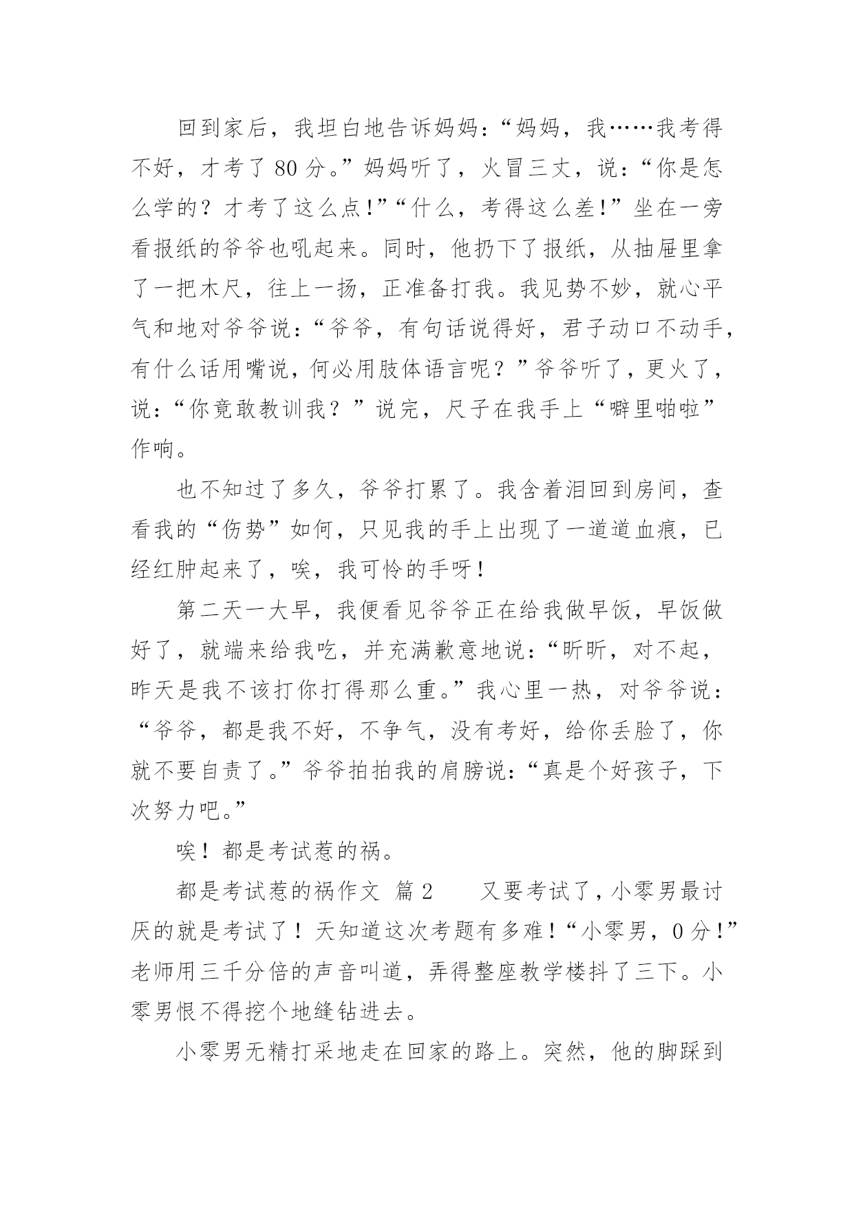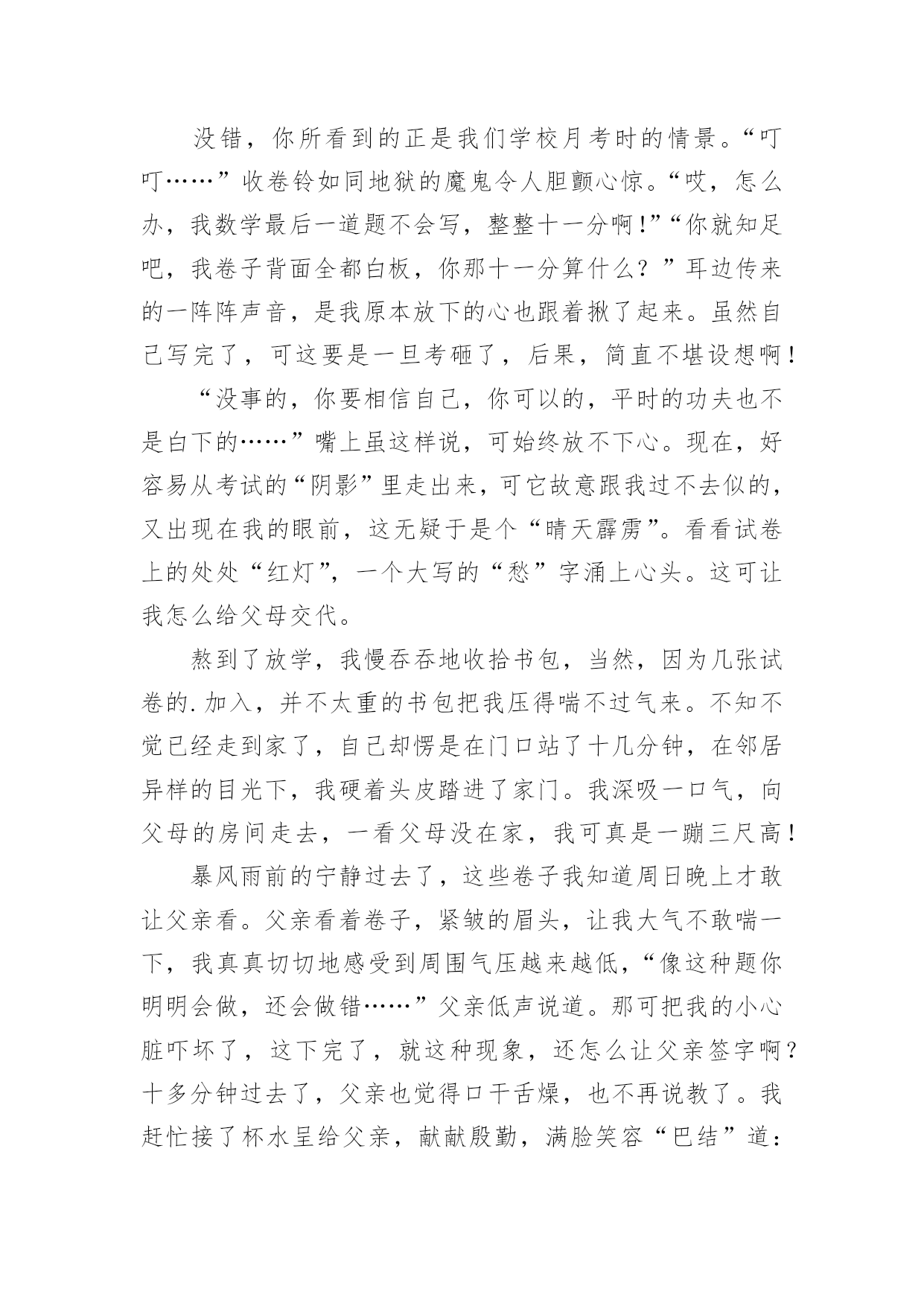 都是考试惹的祸作文都是考试惹的祸作文(通用15篇)在日常学习、工作抑或是生活中,大家或多或少都会接触过作文吧,作文是经过人的思想考虑和语言组织,通过文字来表达一个主题意义的记叙方法。怎么写作文才能避免踩雷呢?下面是小编为大家收集的都是考试惹的祸作文,欢迎大家分享。都是考试惹的祸作文篇1“考考考,老师的法宝;分分分,学生的命根。”这句话不知道是哪位人士说的,但在我看来,它却有一定的道理,因为前几天我就有了这样的遭遇。前几天数学测试结束后,我感觉不太好,所以直到第二天也是提心吊胆,早上就该报分数了,可听广播里说,今天广播操过后,三、四年级要去看电影。我松了一口气,心想早上应该不报成绩吧。可是,一回到教室,我就听见数学老师对语文老师说:“让我来报一下分数吧。”语文老师想都没想就答应了。我心想,完了,要报考试分数了。还没等我继续往下想,就看见数学老师捧着一堆试卷走上讲台,说:“这次考试你们考得很差,最高分才92分。”开始报分数了,我的心怦怦直跳。突然,数学老师报到我的成绩,我心里一惊:呀!不好,才考了80分。怎么办?数学老师还说回家试卷一定要签字。我的内心万分难过,时回家还要装出一副无忧无虑的`样子。回到家后,我坦白地告诉妈妈:“妈妈,我……我考得不好,才考了80分。”妈妈听了,火冒三丈,说:“你是怎么学的?才考了这么点!”“什么,考得这么差!”坐在一旁看报纸的爷爷也吼起来。同时,他扔下了报纸,从抽屉里拿了一把木尺,往上一扬,正准备打我。我见势不妙,就心平气和地对爷爷说:“爷爷,有句话说得好,君子动口不动手,有什么话用嘴说,何必用肢体语言呢?”爷爷听了,更火了,说:“你竟敢教训我?”说完,尺子在我手上“噼里啪啦”作响。也不知过了多久,爷爷打累了。我含着泪回到房间,查看我的“伤势”如何,只见我的手上出现了一道道血痕,已经红肿起来了,唉,我可怜的手呀!第二天一大早,我便看见爷爷正在给我做早饭,早饭做好了,就端来给我吃,并充满歉意地说:“昕昕,对不起,昨天是我不该打你打得那么重。”我心里一热,对爷爷说:“爷爷,都是我不好,不争气,没有考好,给你丢脸了,你就不要自责了。”爷爷拍拍我的肩膀说:“真是个好孩子,下次努力吧。”唉!都是考试惹的祸。都是考试惹的祸作文篇2又要考试了,小零男最讨厌的就是考试了!天知道这次考题有多难!“小零男,0分!”老师用三千分倍的声音叫道,弄得整座教学楼抖了三下。小零男恨不得挖个地缝钻进去。小零男无精打采地走在回家的路上。突然,他的脚踩到什么东西,拣起来一看,“呀!考试帽!这回可好了,考试不用愁了……”公布成绩!”小零男,一……一百分!“老师的眼睛睁得大大的,简直不敢相信自己的眼睛。一百分,谁知道他怎么得到的!老师一把起小零男扔了出去。小零男在空中划了一个完美的抛物线,只见一股黑色大漩涡,小零男被吸到了三十年代的中国。”咦?骂桶吐赛了!“原来小零男堵住了下水道。趁日本兵去拿马桶吸,小零男从马桶里钻了出来。他全身发臭,身上沾满了屎尿。全体日本兵尖叫起来,严重的`被熏得上吐下泻。唉!都是考试帽惹的祸,让他全身发臭,永远待在了三十年代的中国!都是考试惹的祸作文篇3刚跨进教室,便听见消息灵通人士播报:“今天考试,千真万确!”此时,我的心情跟天气一样,一下子由晴转阴。亳无征兆地得知要考试,这使得我的心骤然紧张起来。环顾四周——有的同学手抵着脑袋,表情凝重,堪比罗丹刀下的“沉思者”;有的同学仰头盯着天花板,似乎盼望着能掉下什么答案来;有的同学皱紧眉头,时不吋还苦笑着,似乎在感叹屋漏偏逢连夜雨——怕什么来什么。考试快接近尾声,有的同学着急地盯着试卷,偶尔抬头看看钟,似乎嫌时间不够用;有的同学不顾橡皮屑洒满一桌,正奋笔疾书;只有那些一百分专业户,时而自信地翻阅试卷,时而悠闲地摆弄着手头的水笔……提笔、疾书、交卷。在偌大的教室里,窃窃私语声像波浪一样翻滚着,此起彼伏,嘈嘈切切。同学们接头接耳,四处打听别人的分数。“八十六”鲜红数字,如同一阵猛烈的阳光灼得我的眼睛一阵模糊。我敞开手掌极力掩盖那个数字,不过,还是被八卦的前桌偷看了过去。前桌就像突然捡到了宝似的,脸上洋益着灿烂的'笑容,当然,还交织着幸灾乐祸的神情。她兴奋地跑开座位,在四周极力“宣扬”着那刺眼的分数。那个神情仿佛一把锐利的刀子,在我身上某个脆弱的部位不轻不重地剎了一下,一股涩涩的疼在身上蔓延开来。我想制止他,但喉咙里堵着破绵烂絮,想喊却又挤不出声来。我悻悻地放下了手,“你——怎么啦?”同桌察觉出了我的异样,我仰起头,把眼泪憋住,克制住了一点情绪,说道:“没,没什么,只是——我想,下次一定要考好一点。”和煦的阳光透过窗户,斑斑点点地落在我身上,多么美好的一个早上,而我却像根木头,毫无感觉。“下节课还考试!”不知谁又抛出了这么一枚定时炸弹,在一时之间,教室里的叹息声此起彼伏。